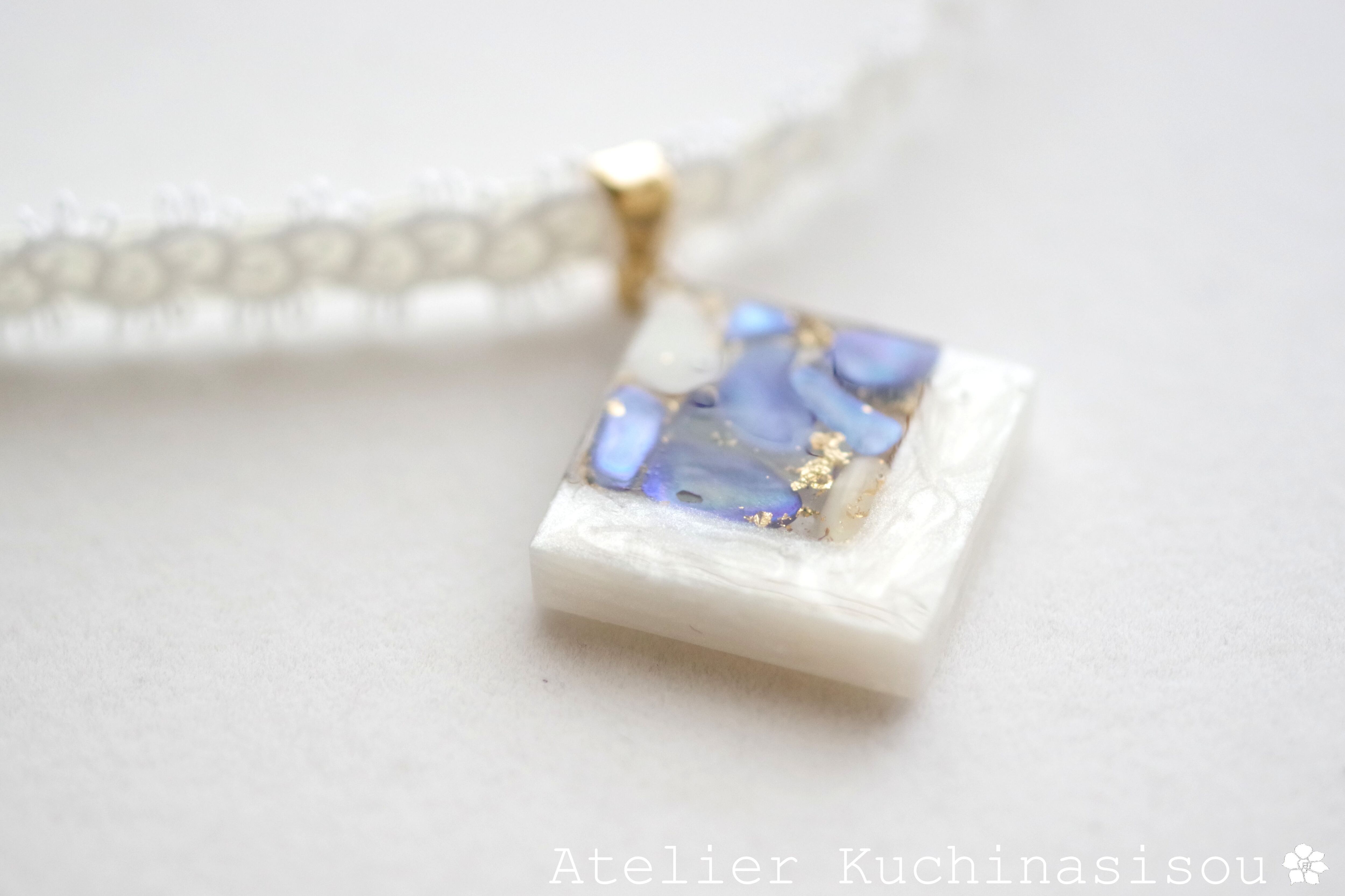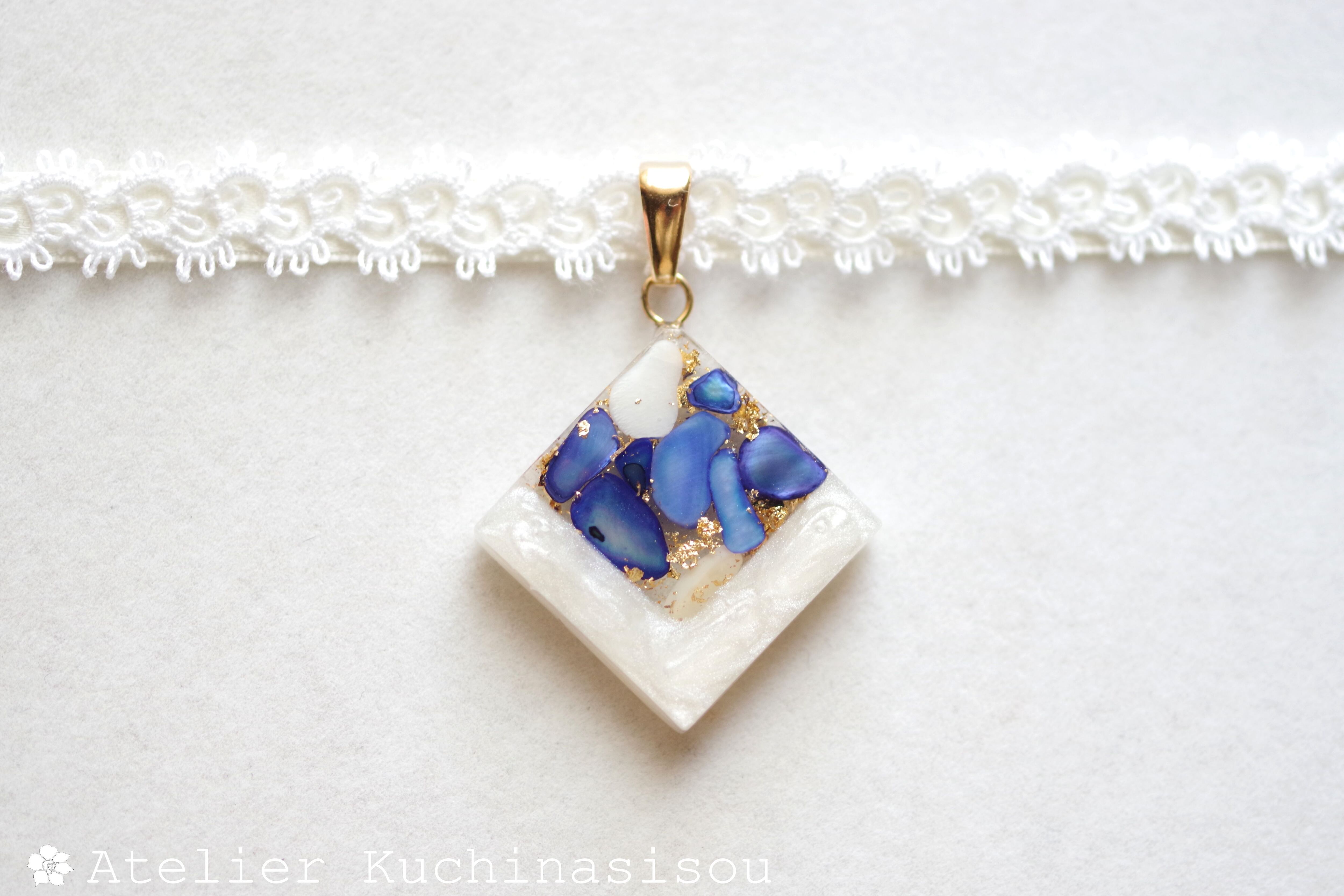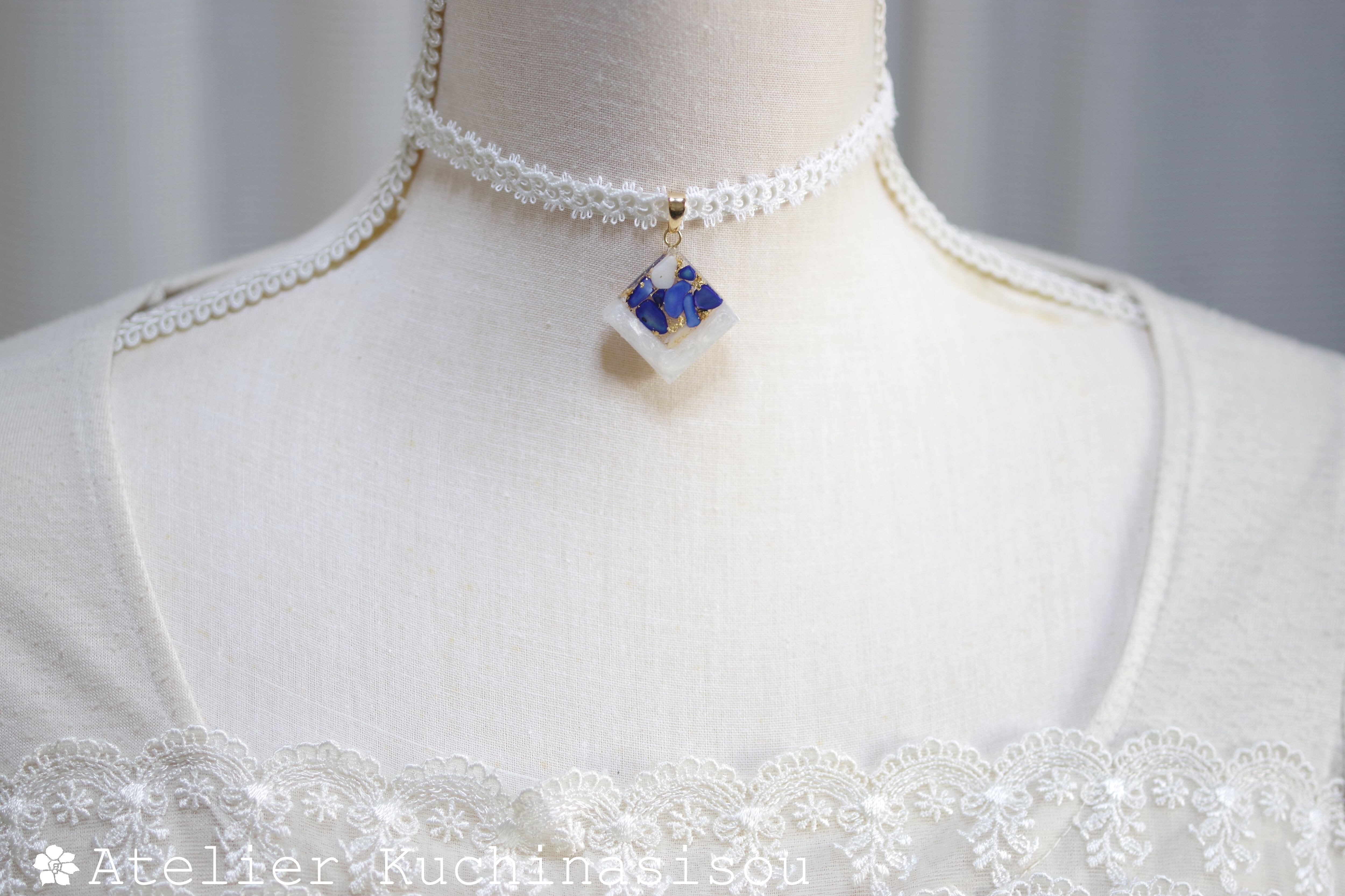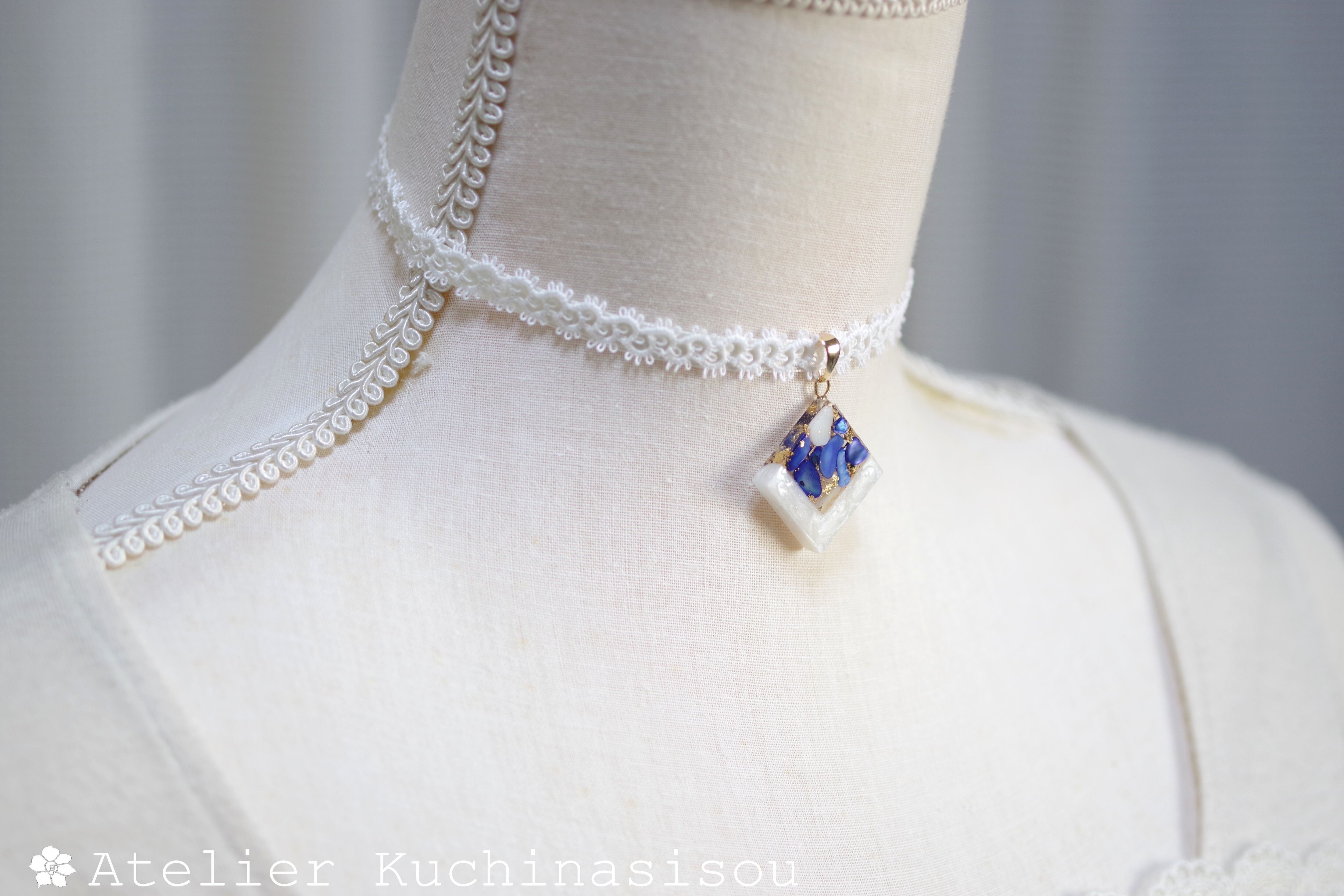 ホワイトシェルと鮮やかなコバルトブルーに着色されたシェルを沈め、光沢のあるホワイトで囲ったレジンを、サテンリボンにタティングレースで装飾を施したチョーカーに仕上げました。