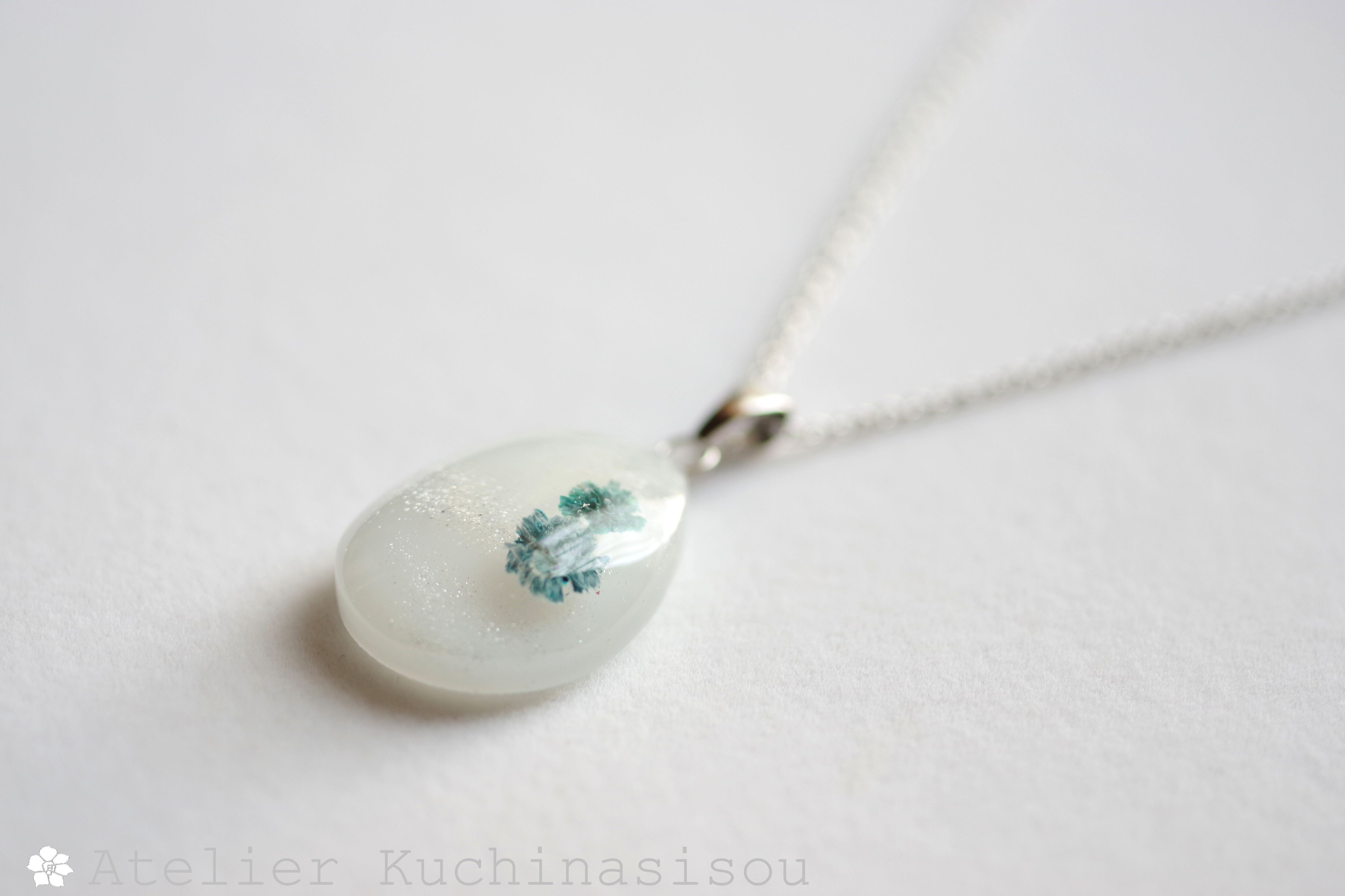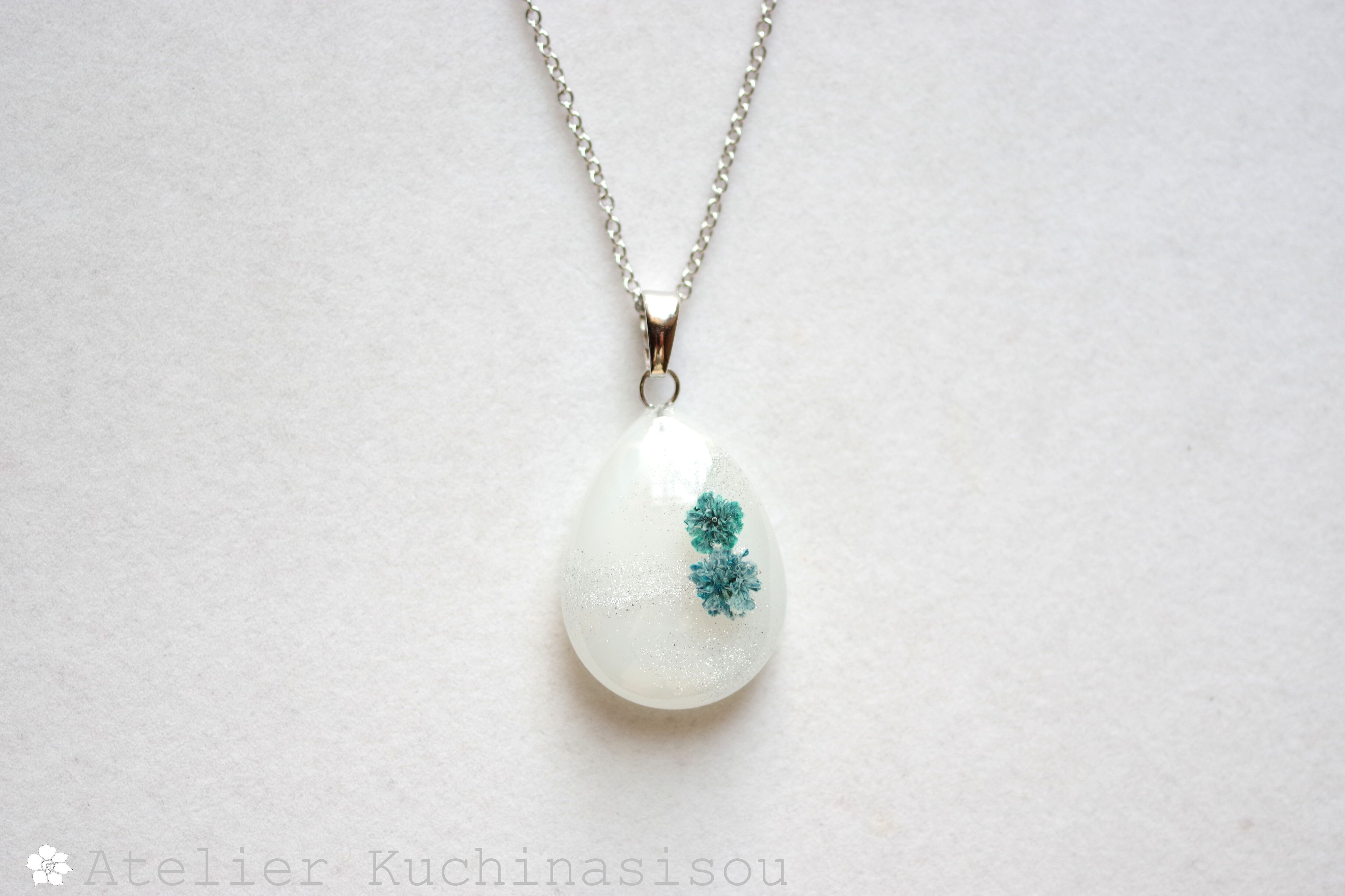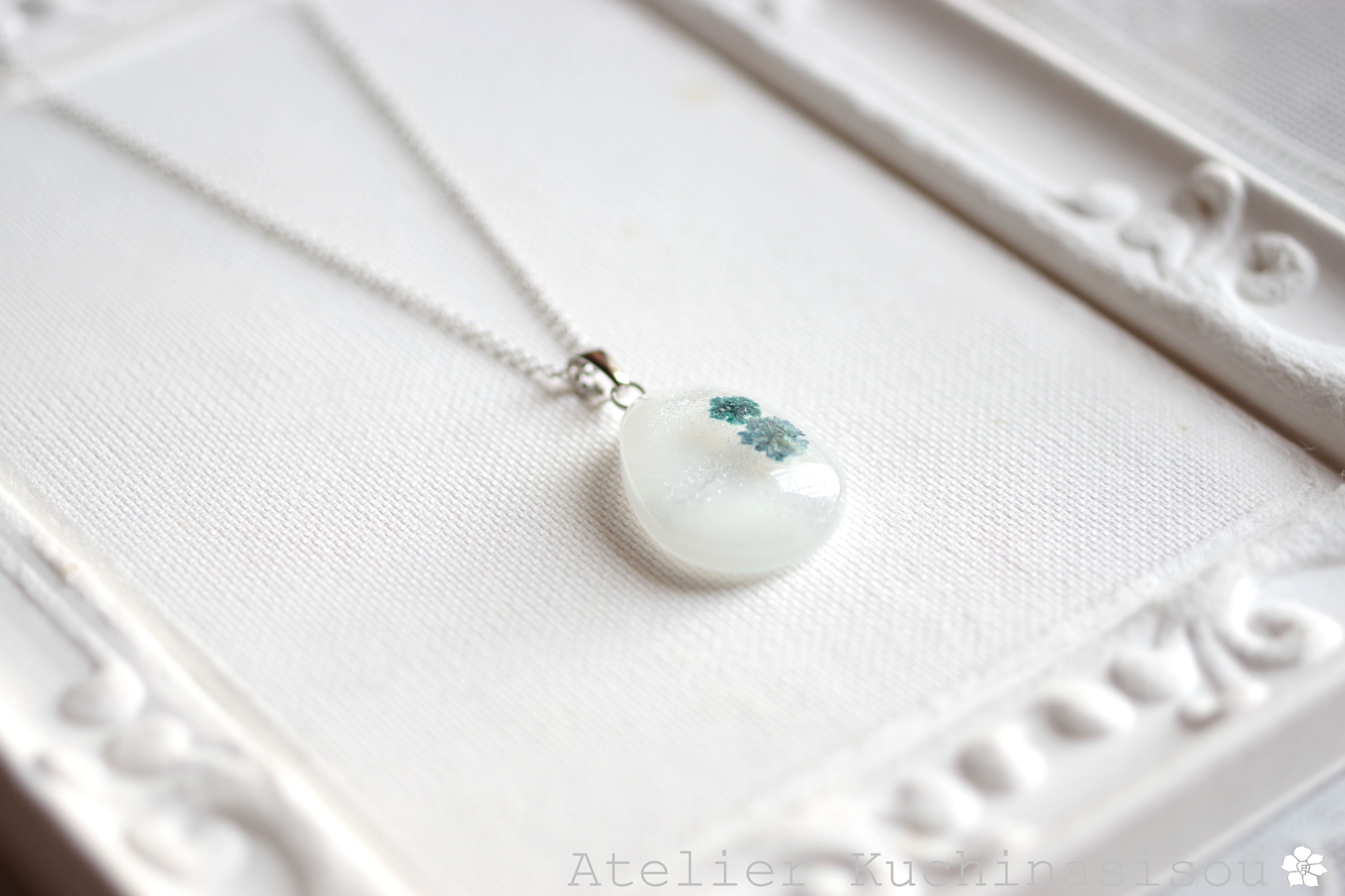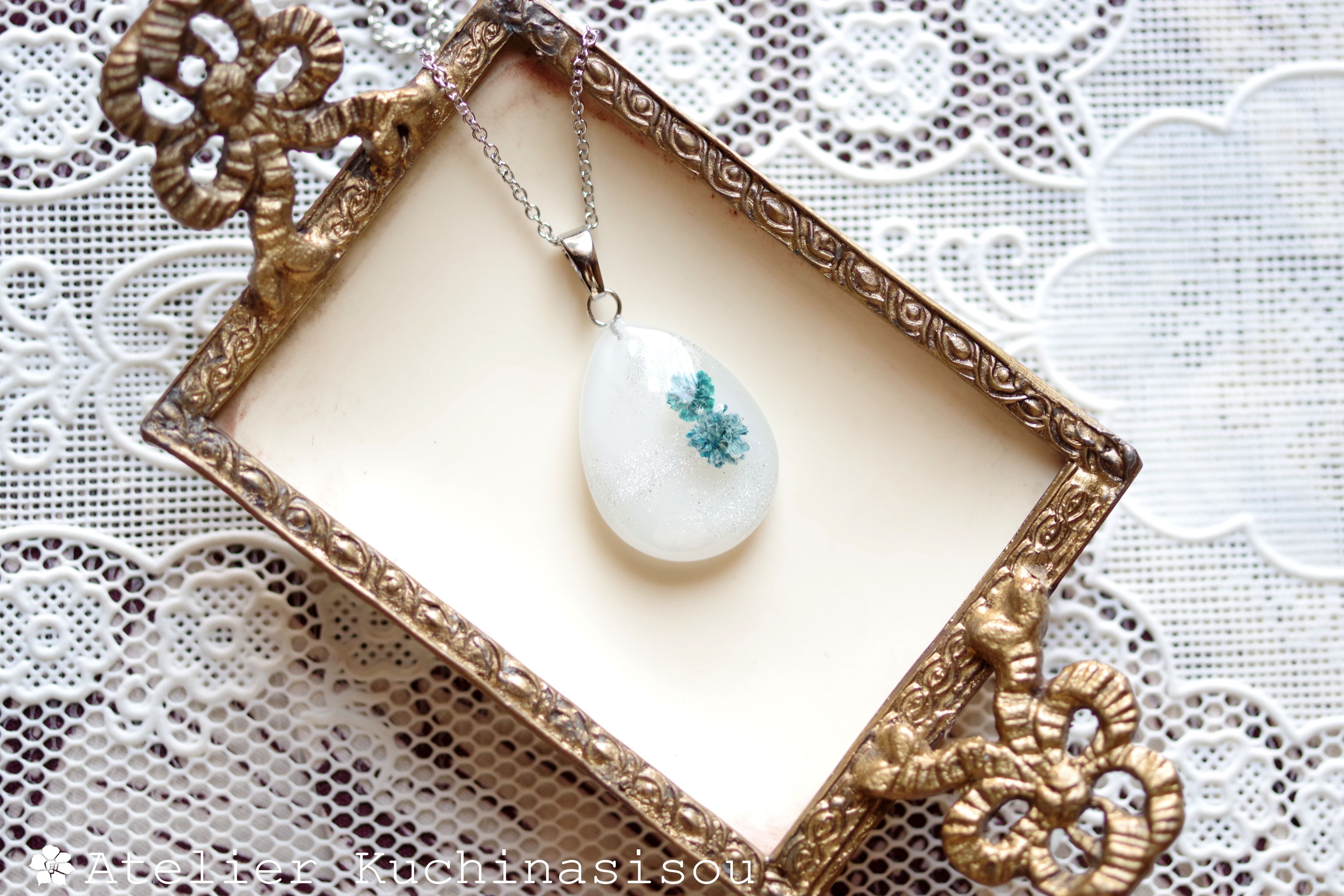 レジンアート ドロップペンダント〈白雪と花〉