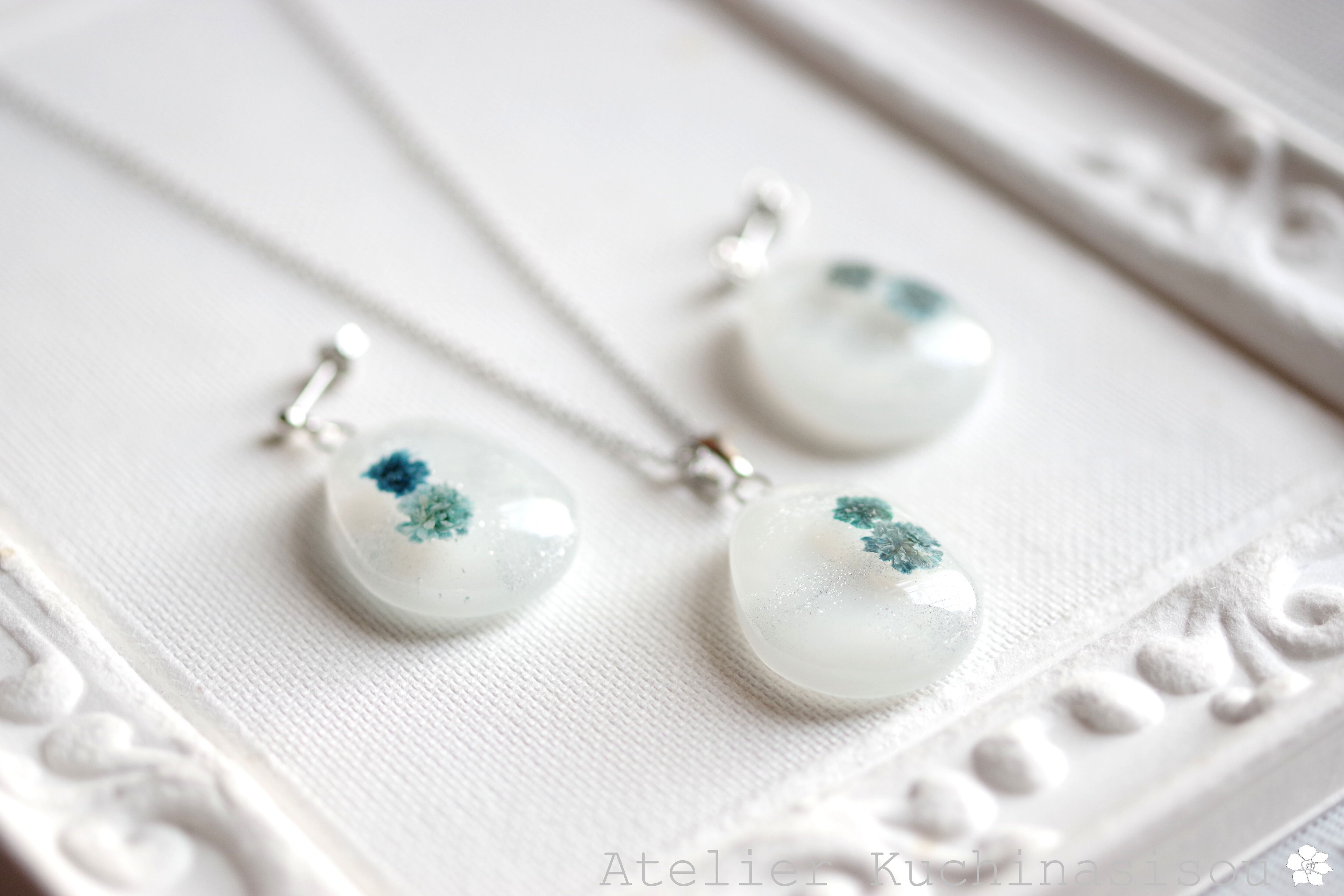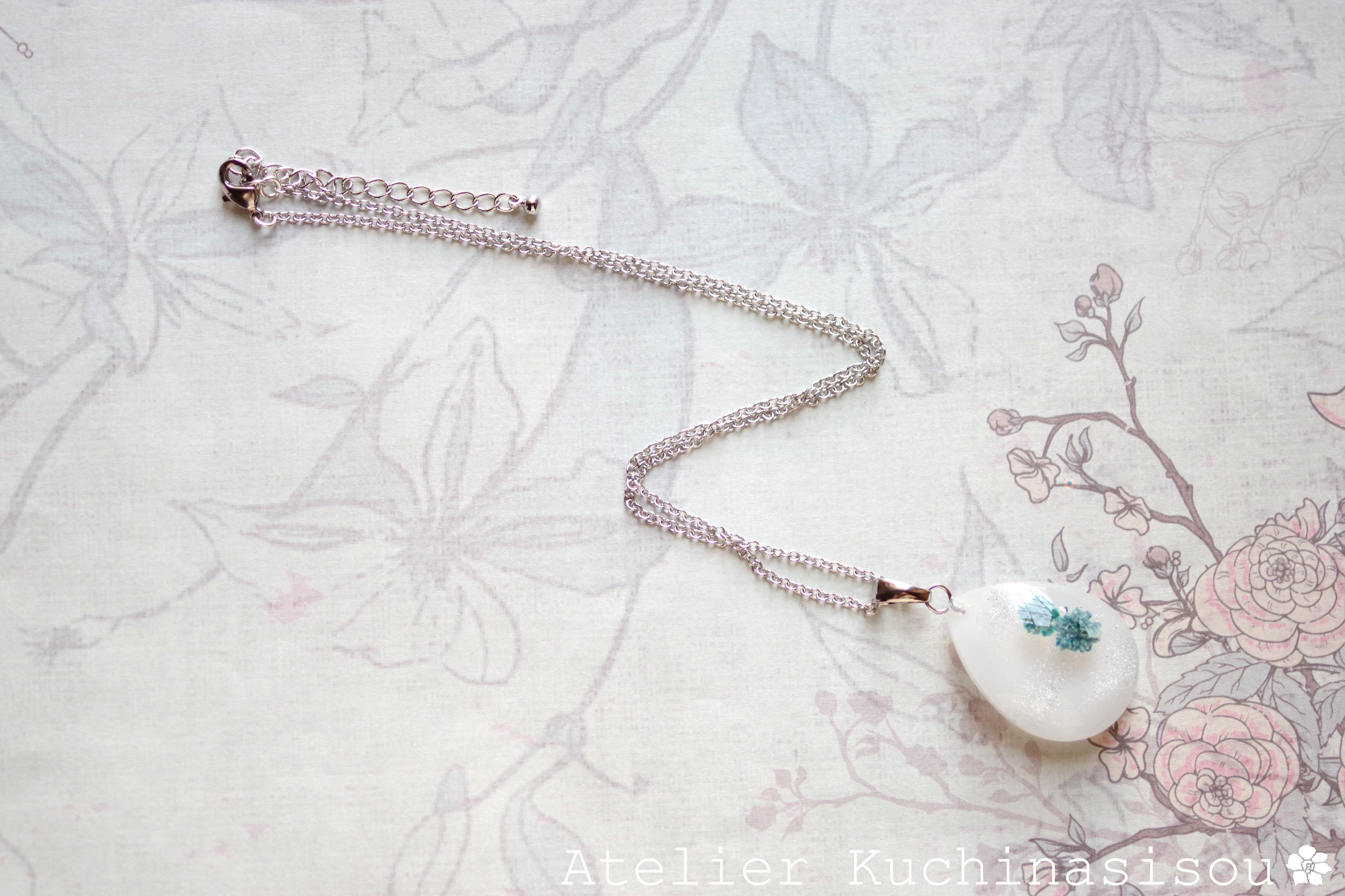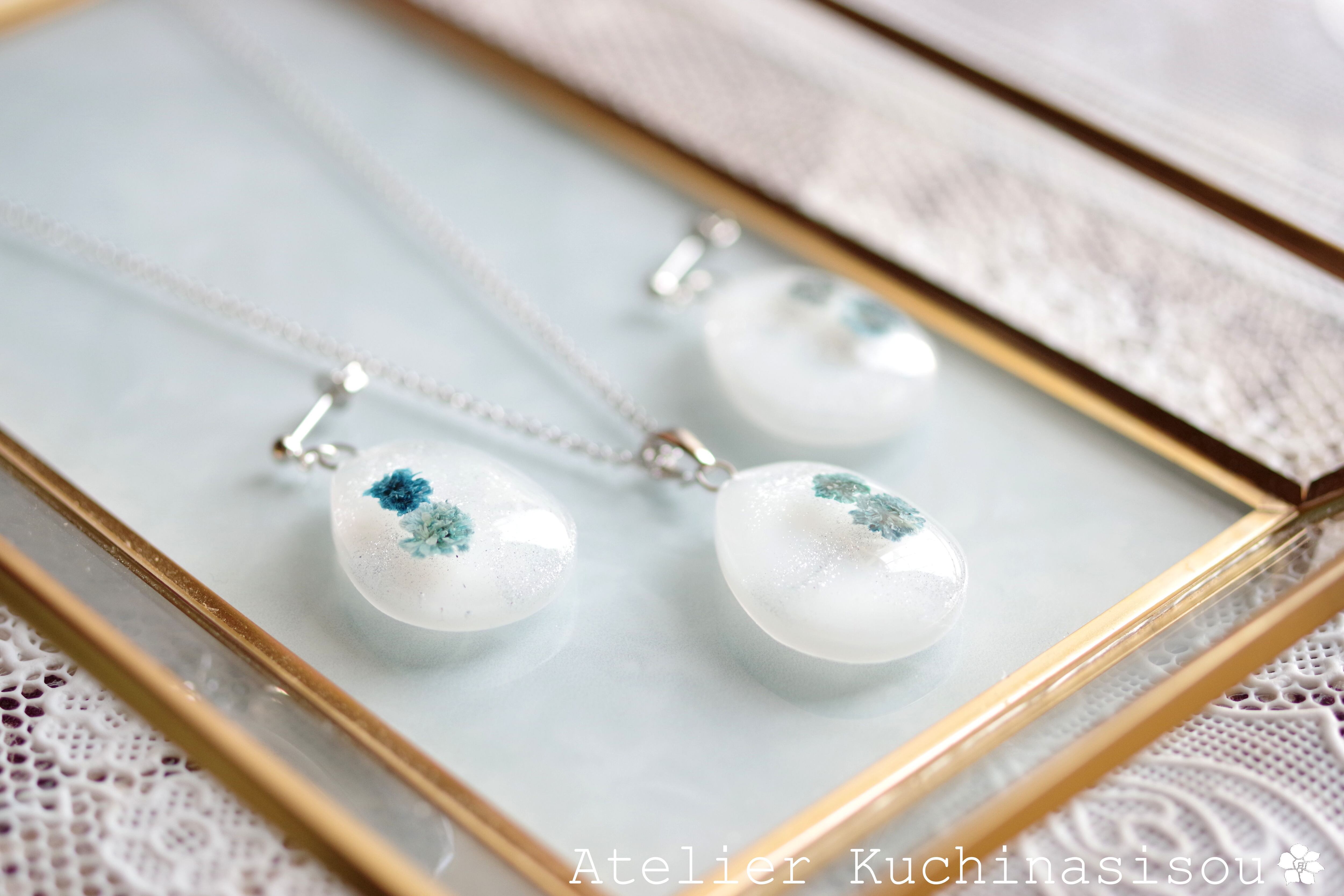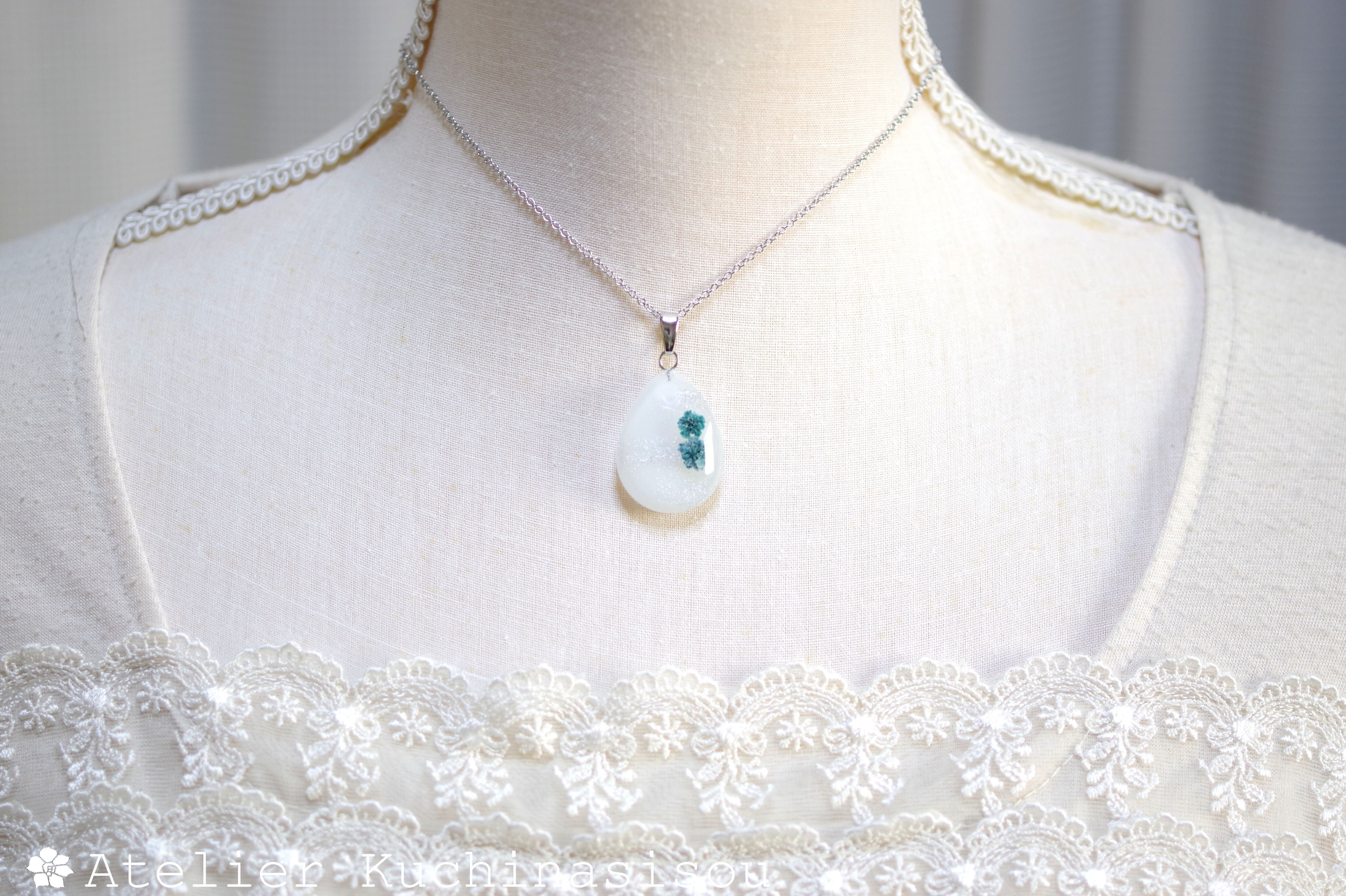 レジンアート ドロップペンダント〈白雪と花〉