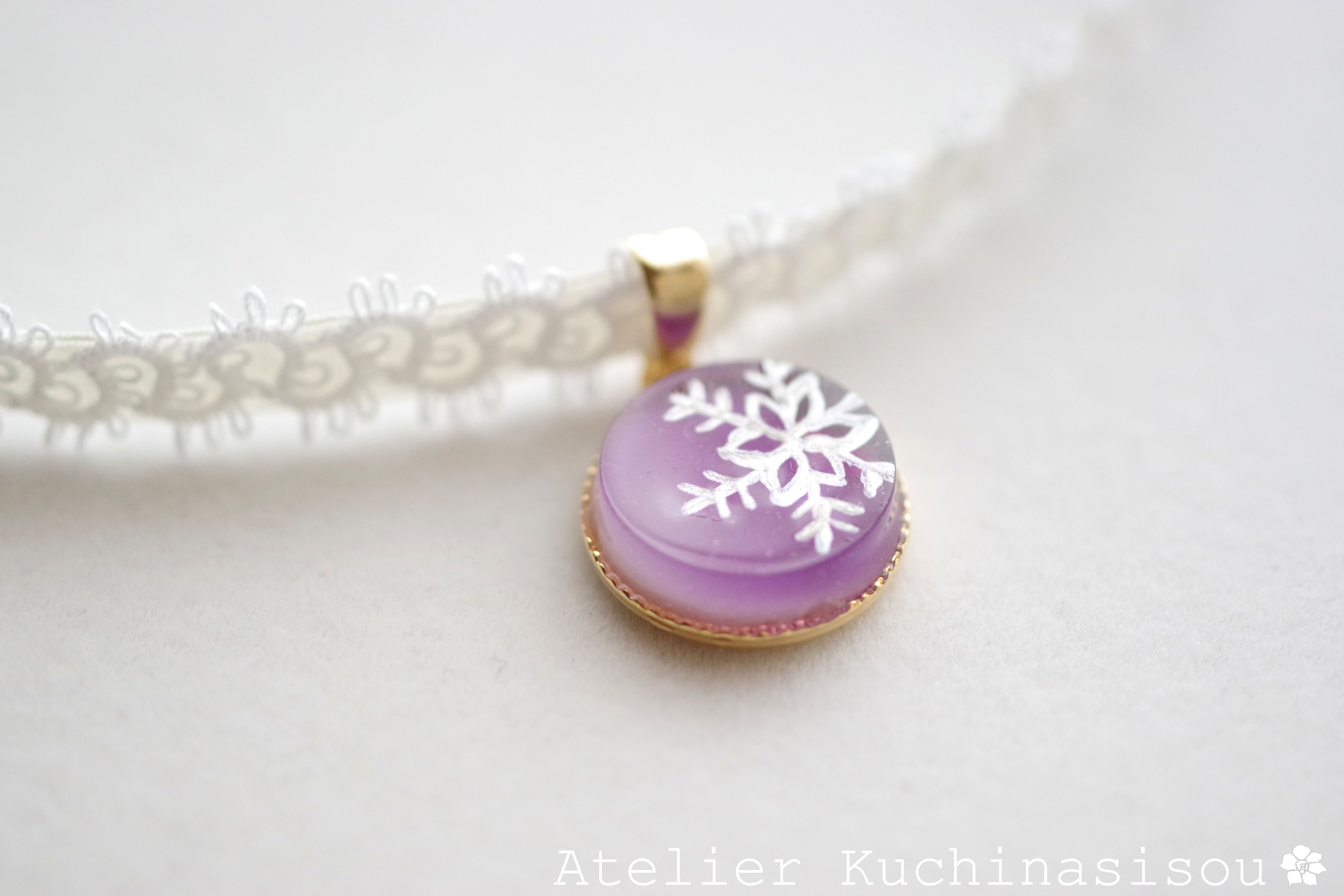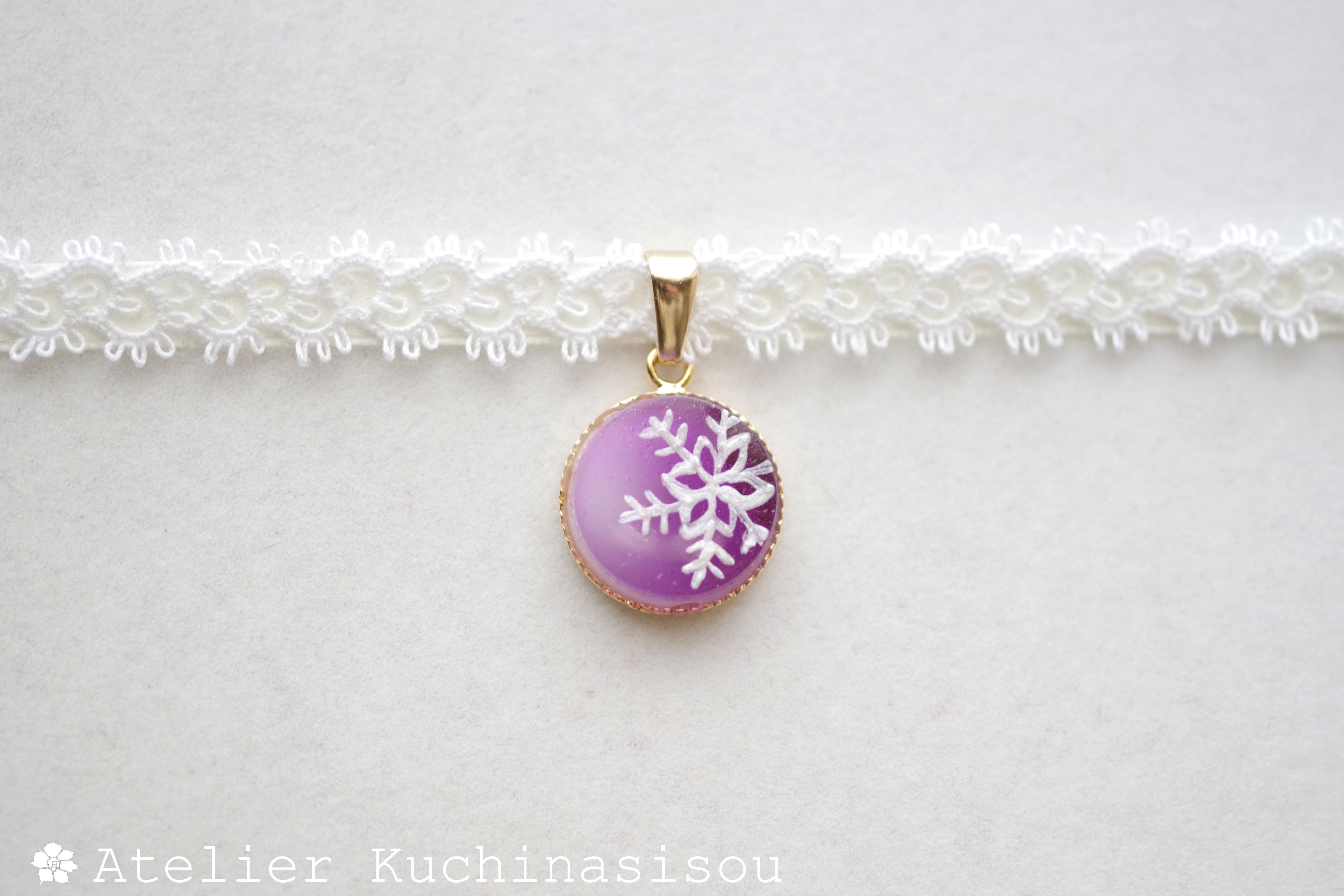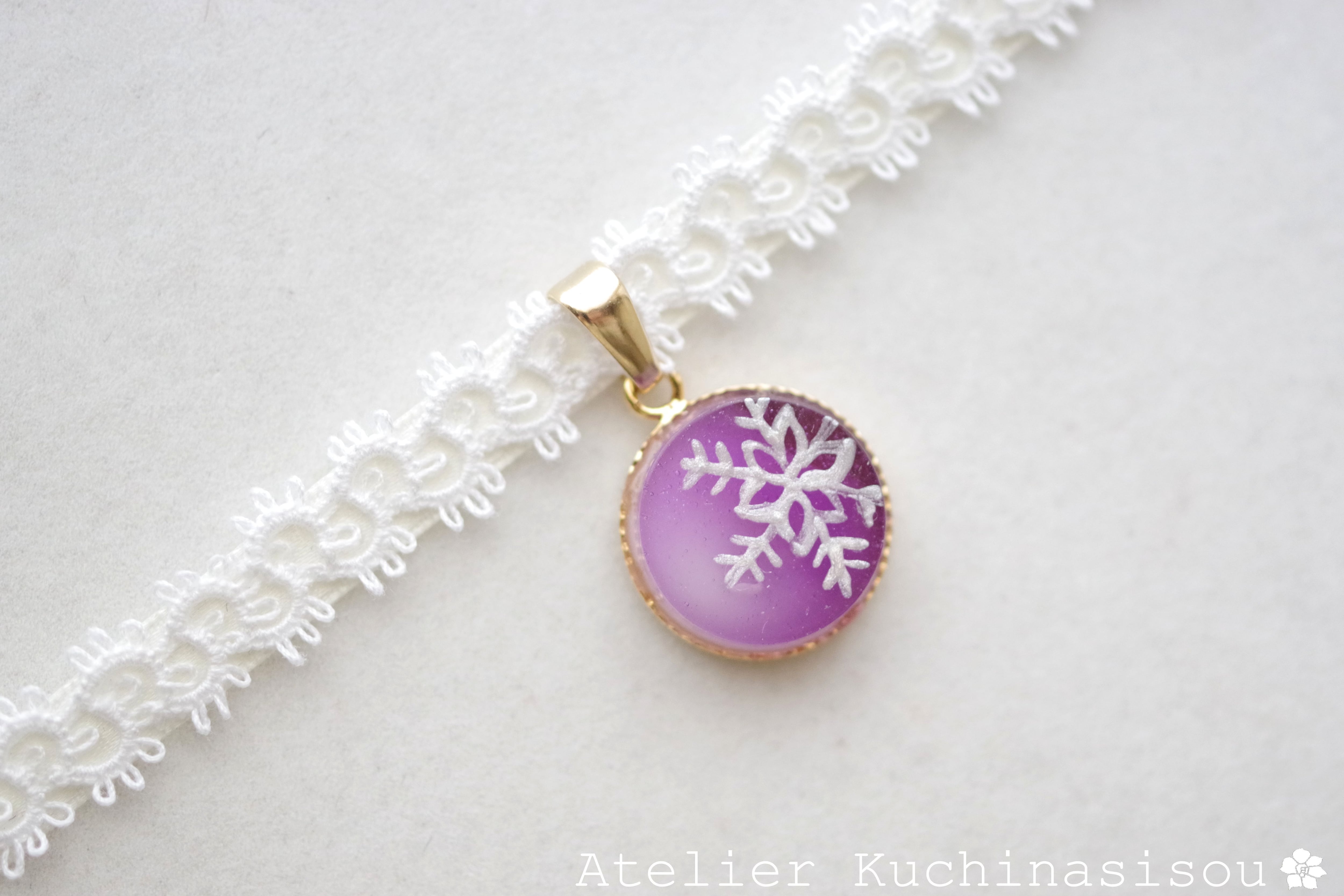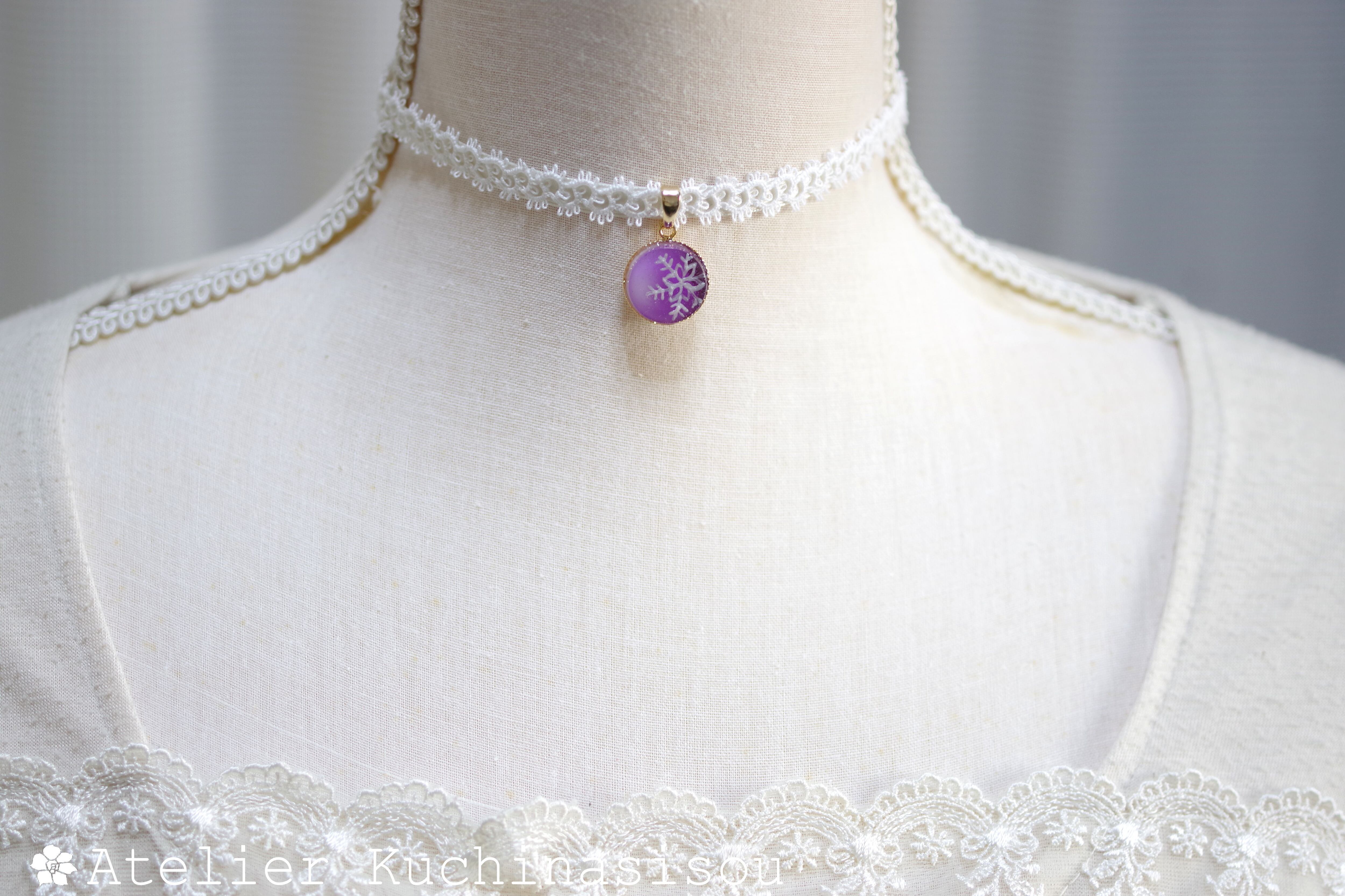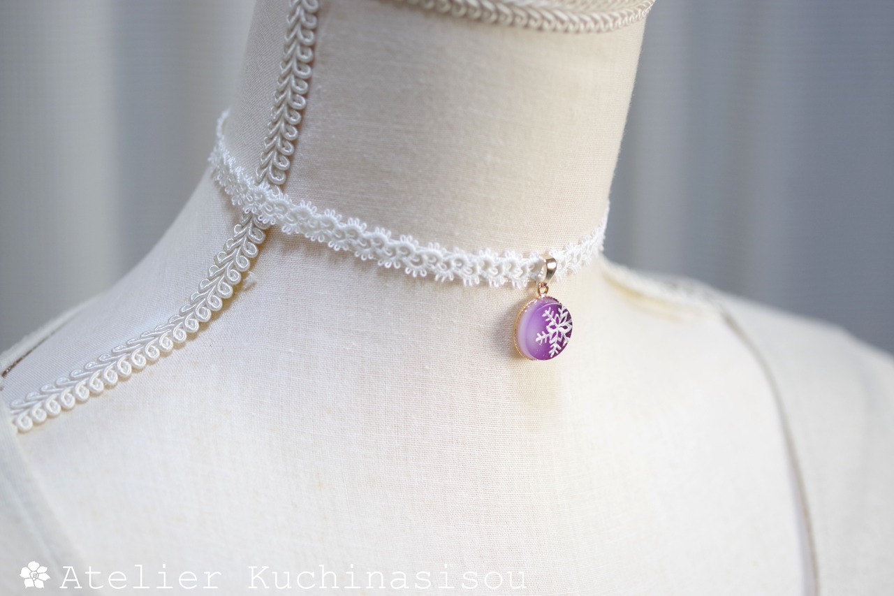鮮やかなパープルのグラデーションにパールホワイトの雪の結晶が映えるレジンを、サテンリボンにタティングレースで装飾を施したチョーカーに仕上げました。