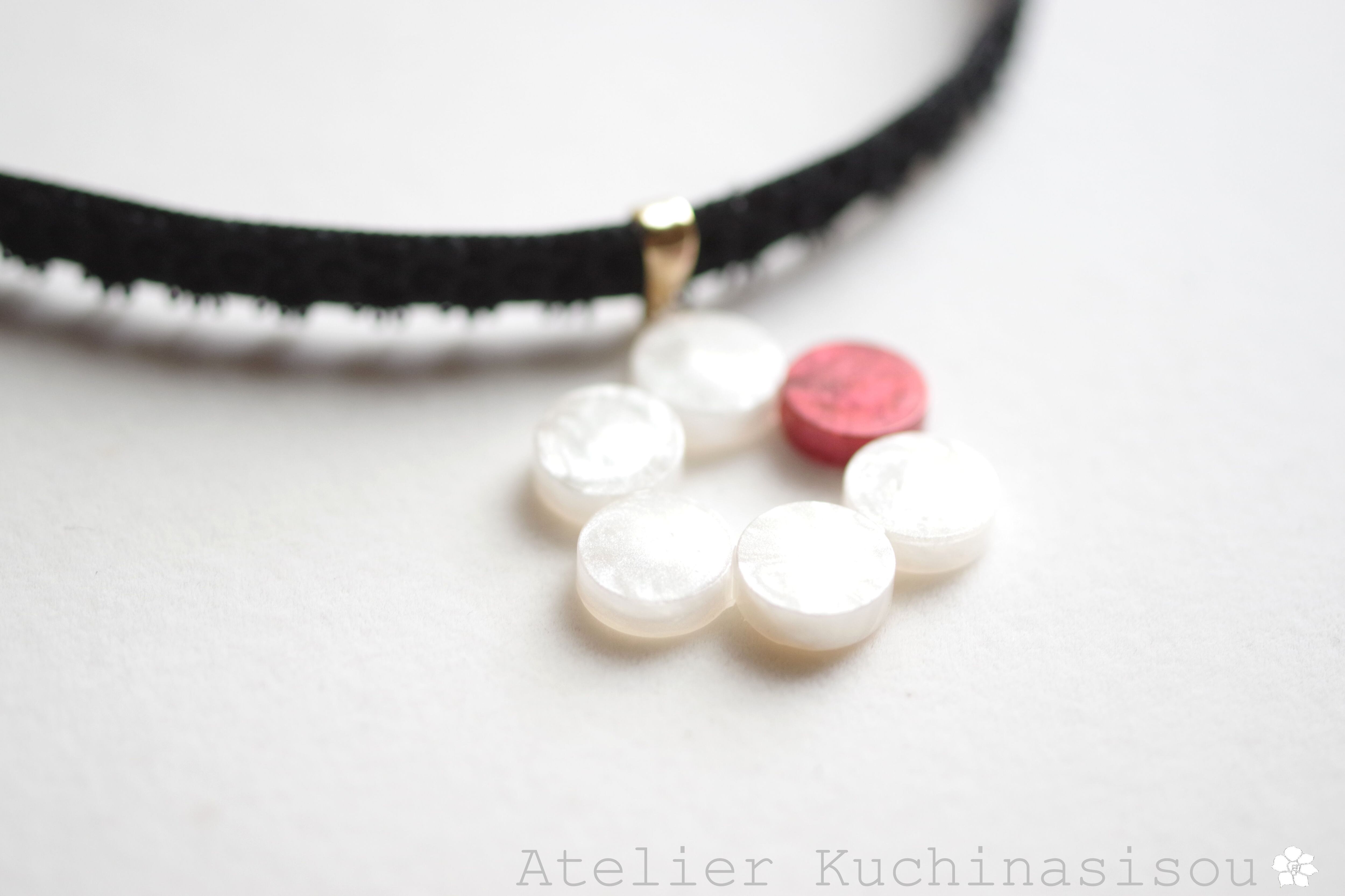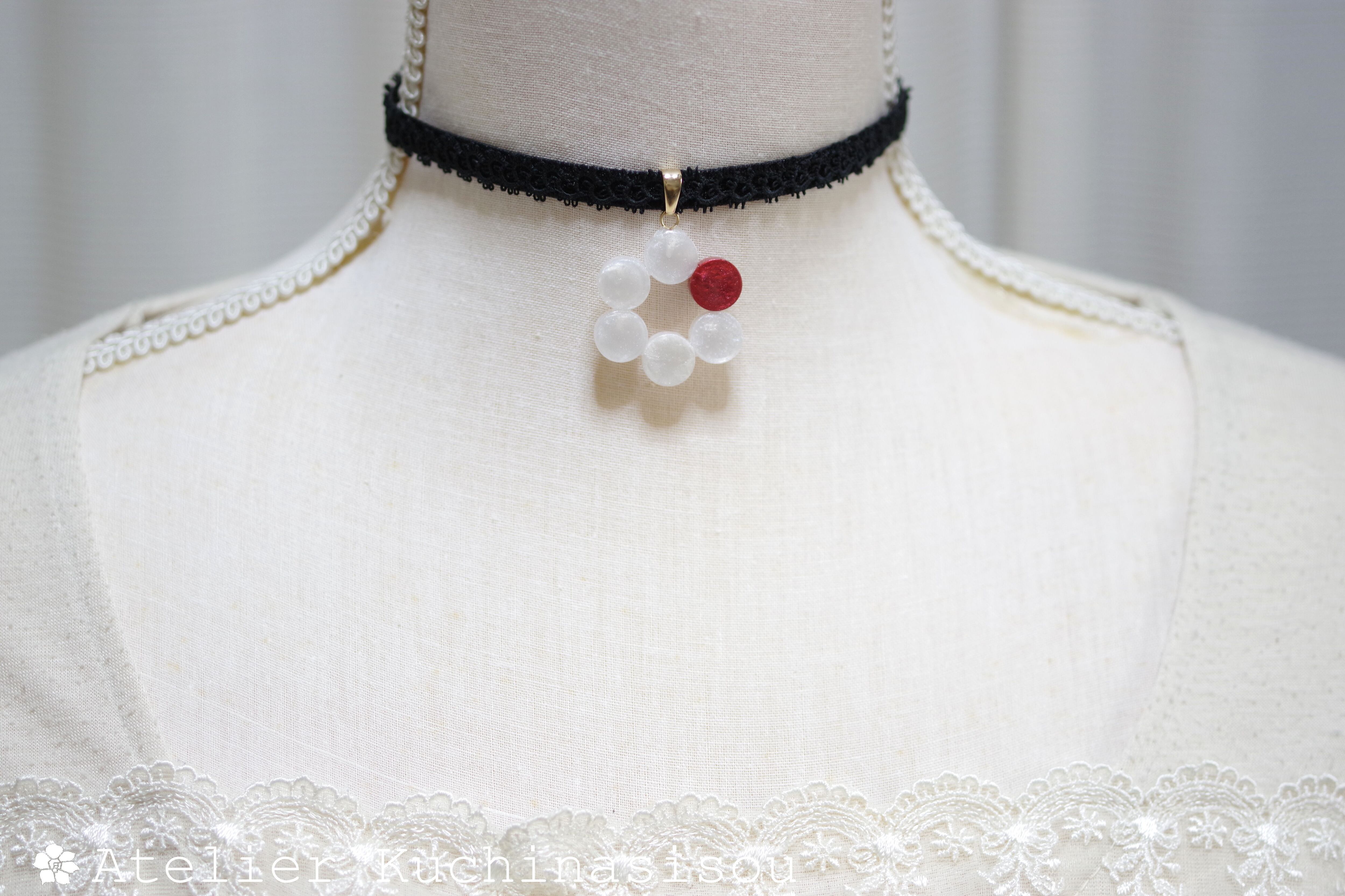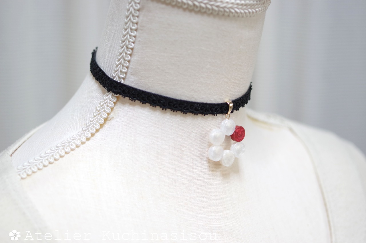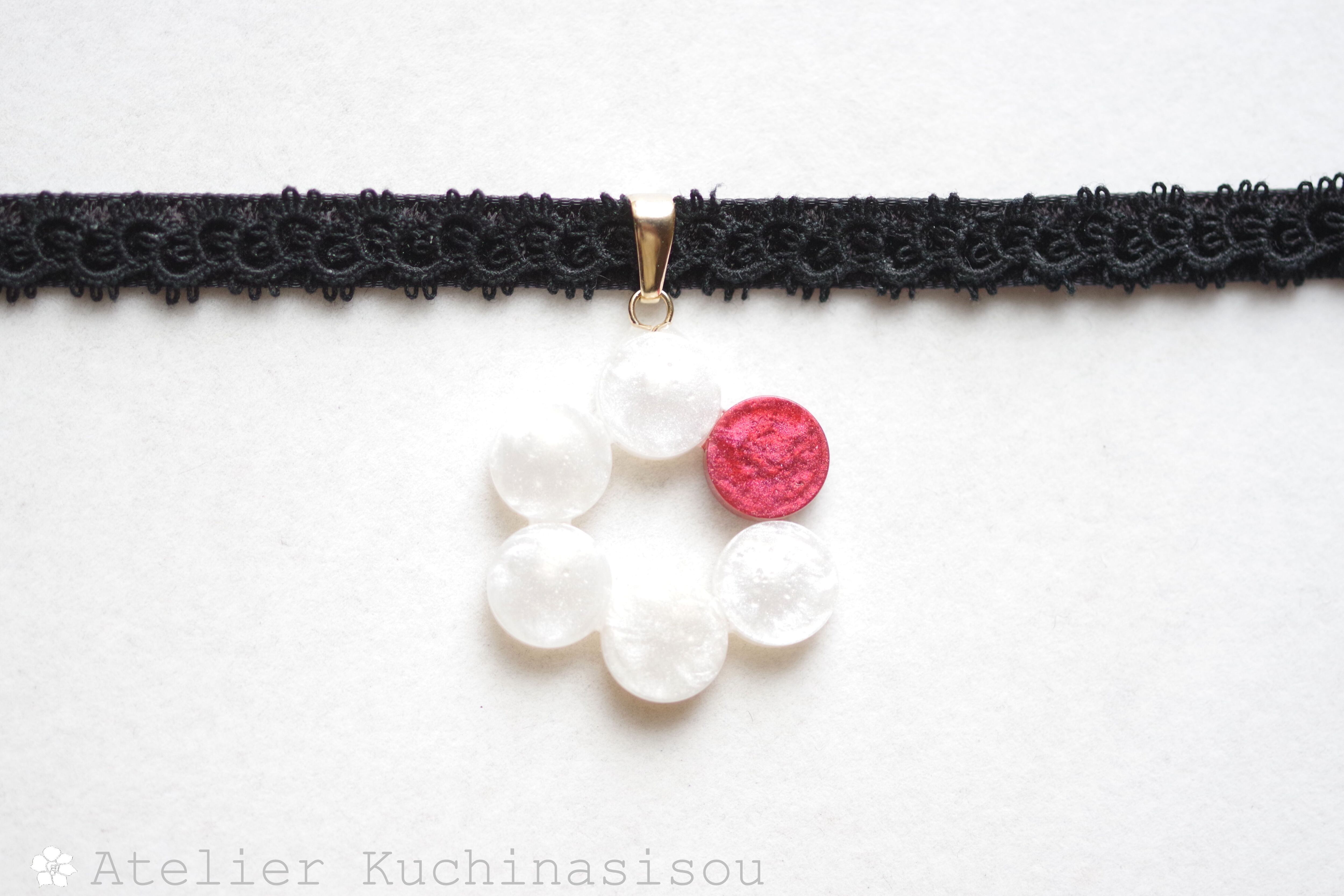 一色だけ違う差し色の赤が椿の花のようなレジンを、ベルベットリボンにタティングレースで装飾を施したチョーカーに仕上げました。