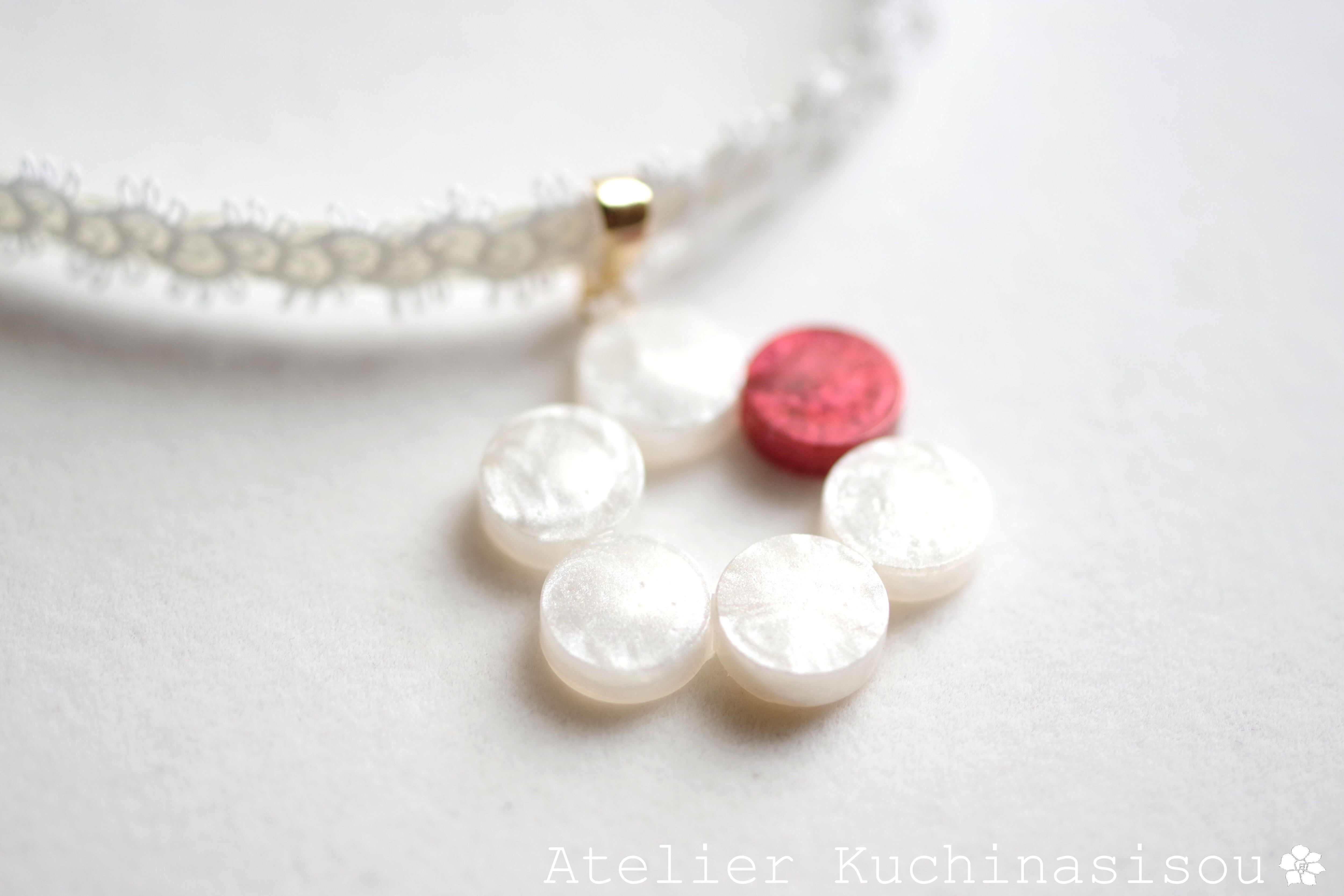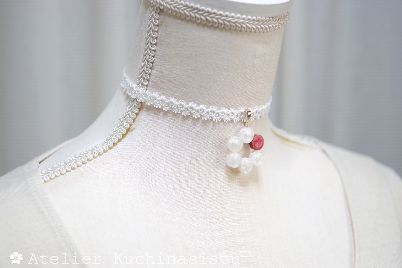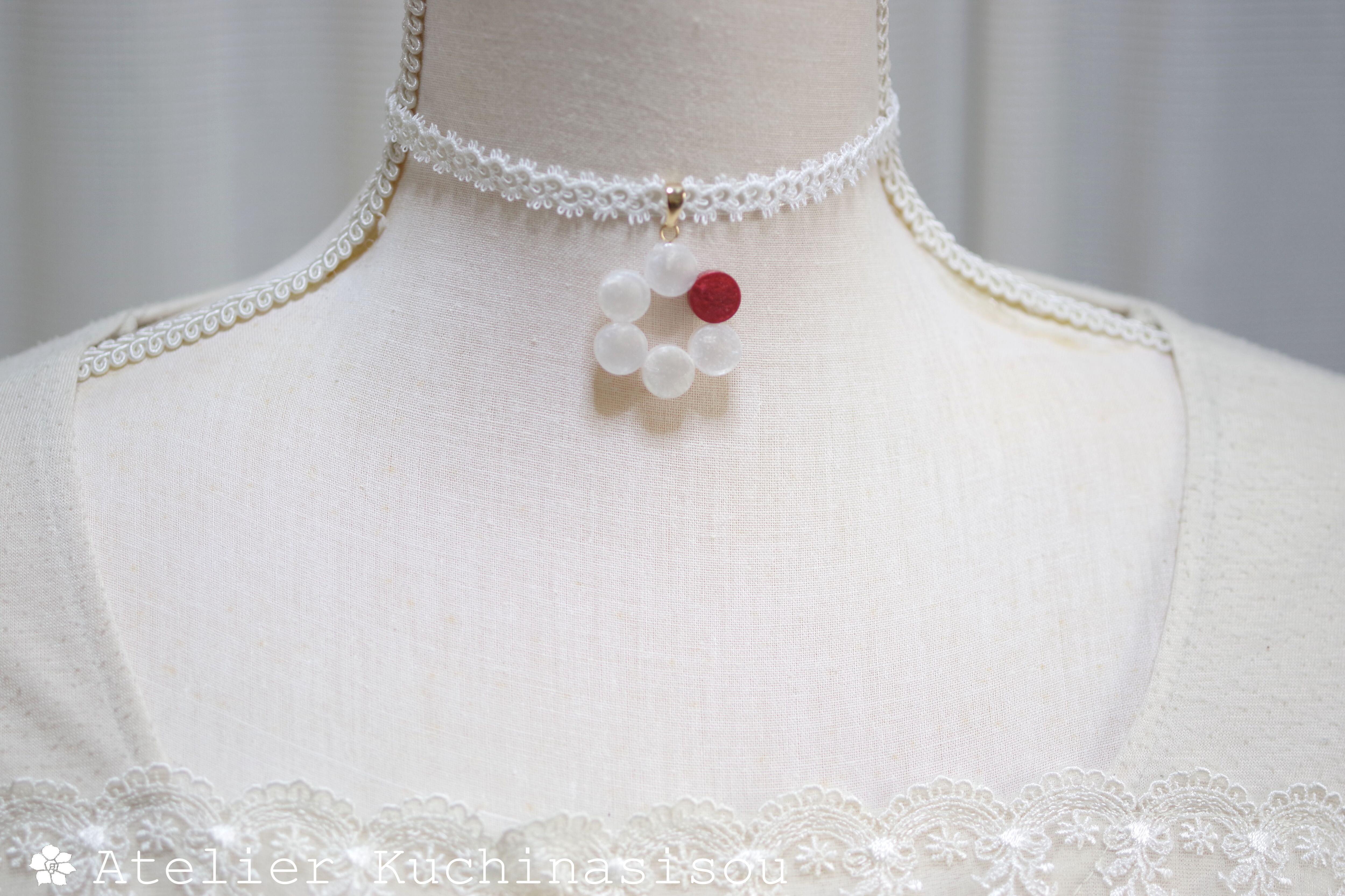 一色だけ違う差し色の赤が椿の花のようなレジンを、サテンリボンにタティングレースで装飾を施したチョーカーに仕上げました。