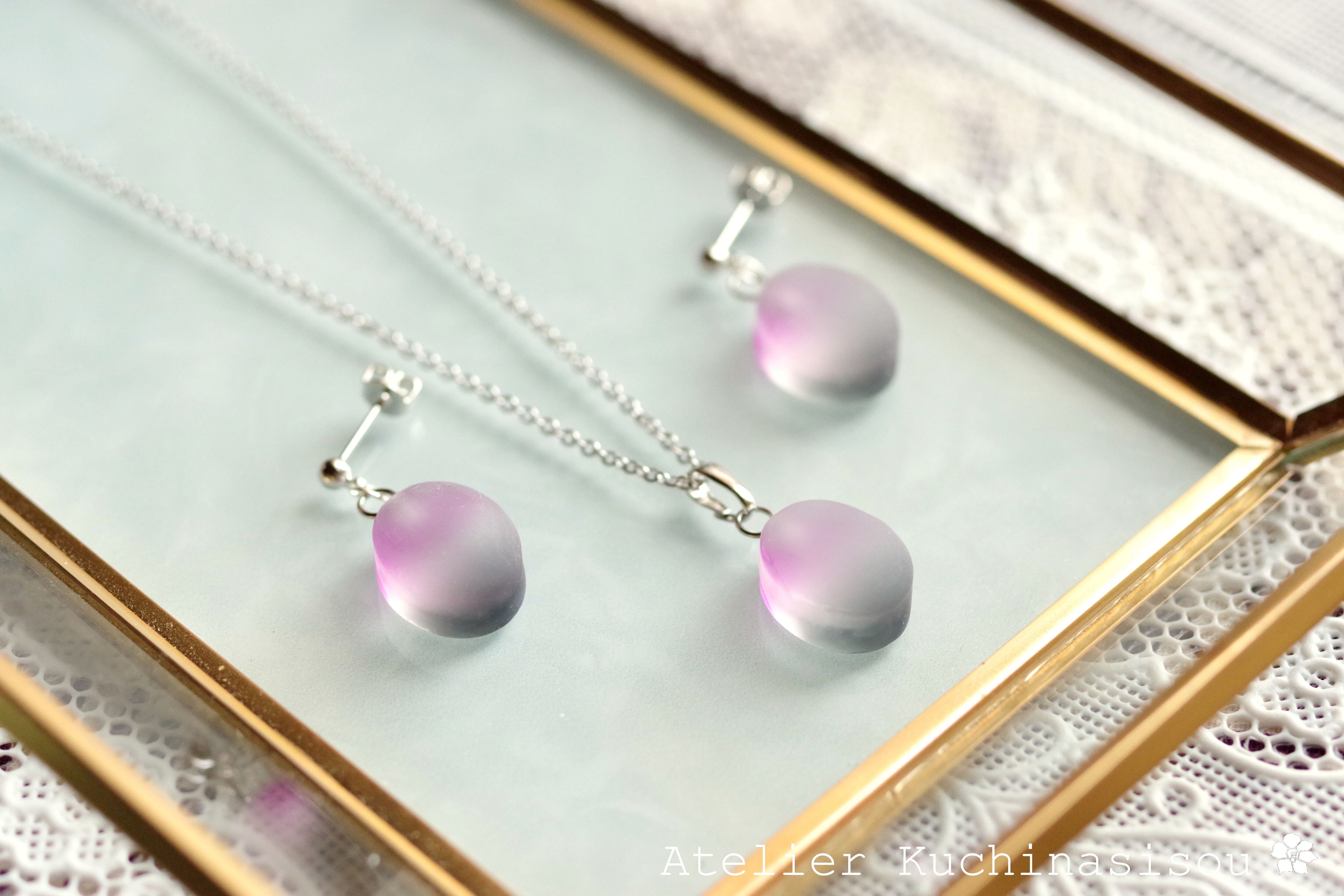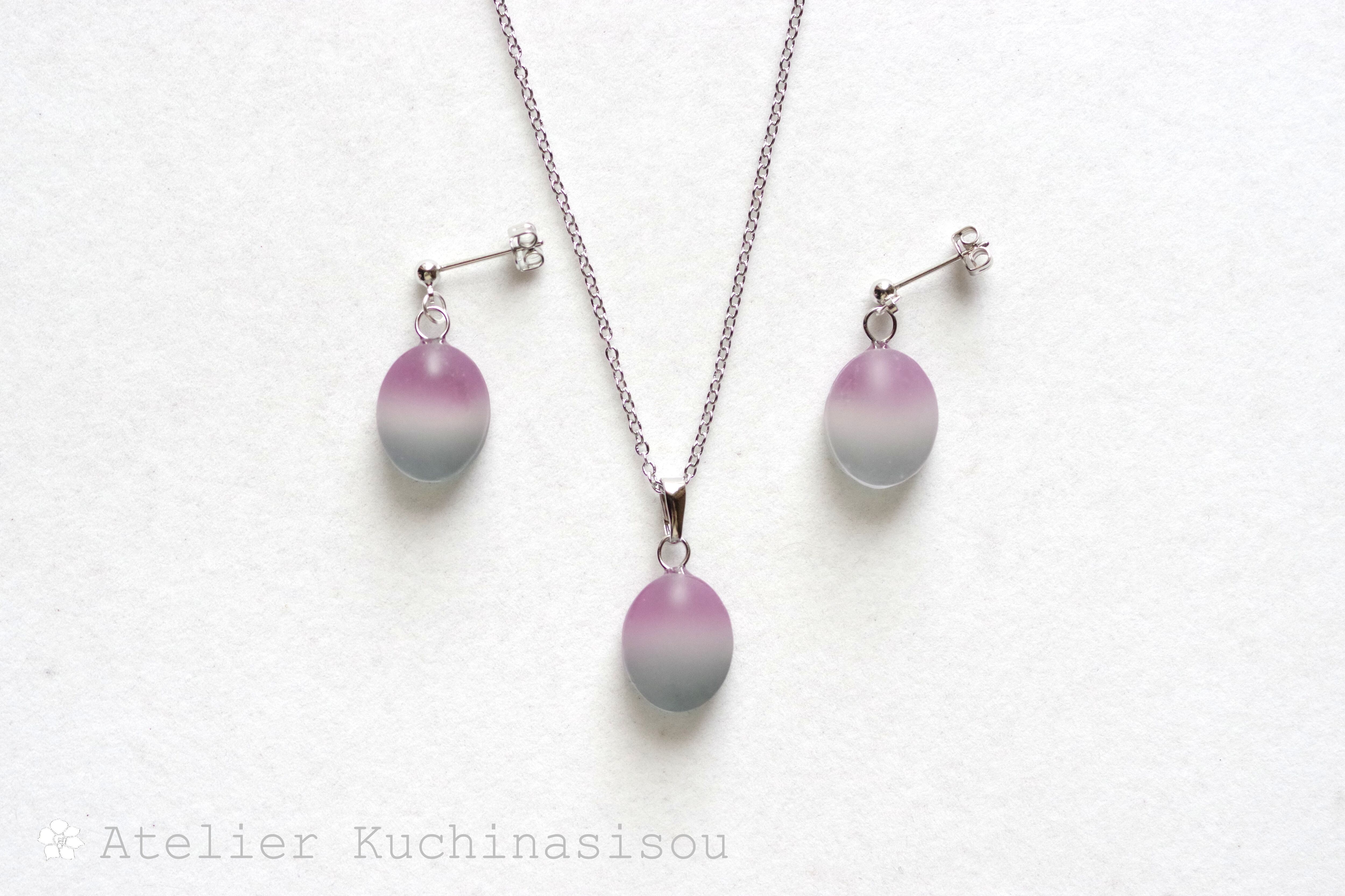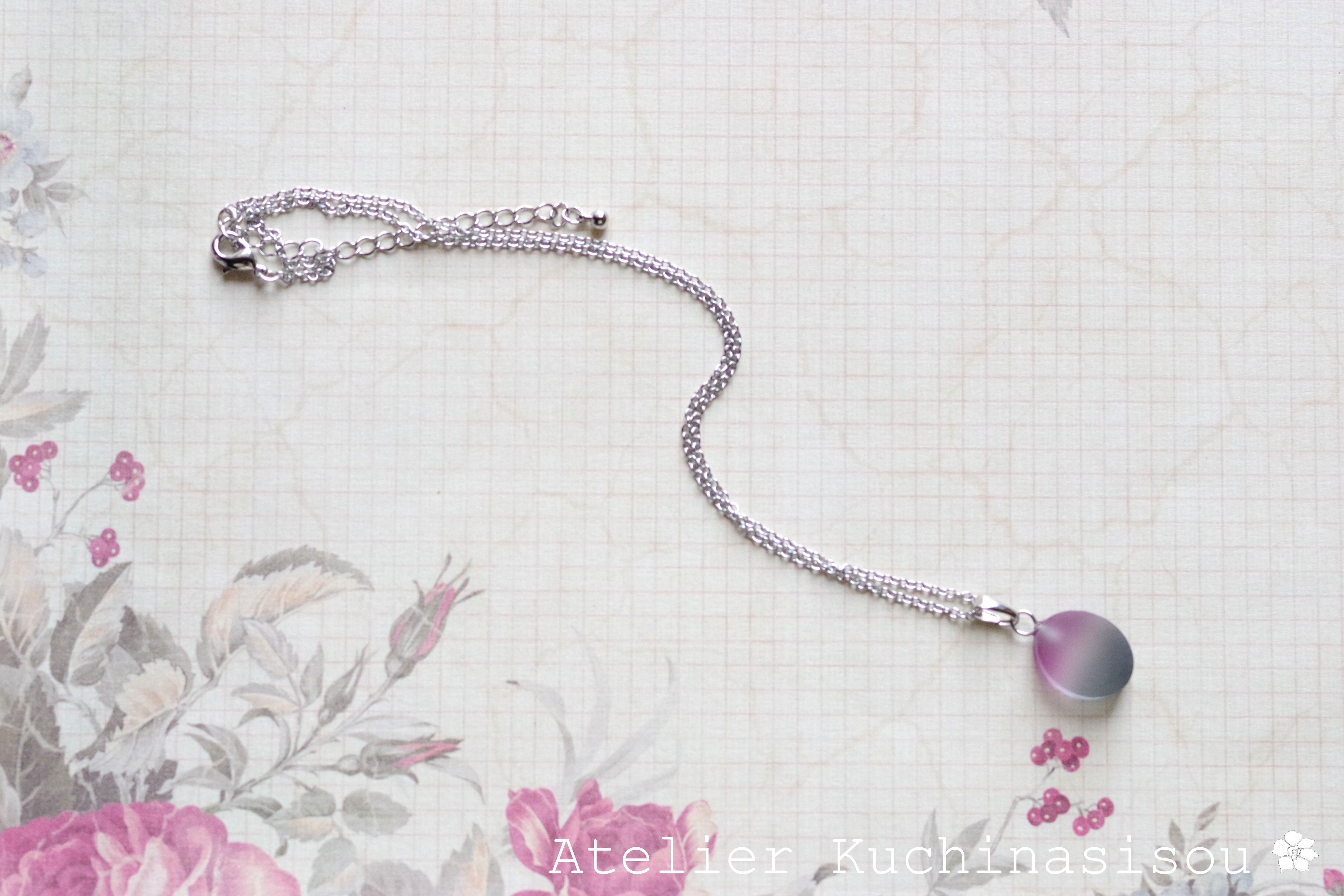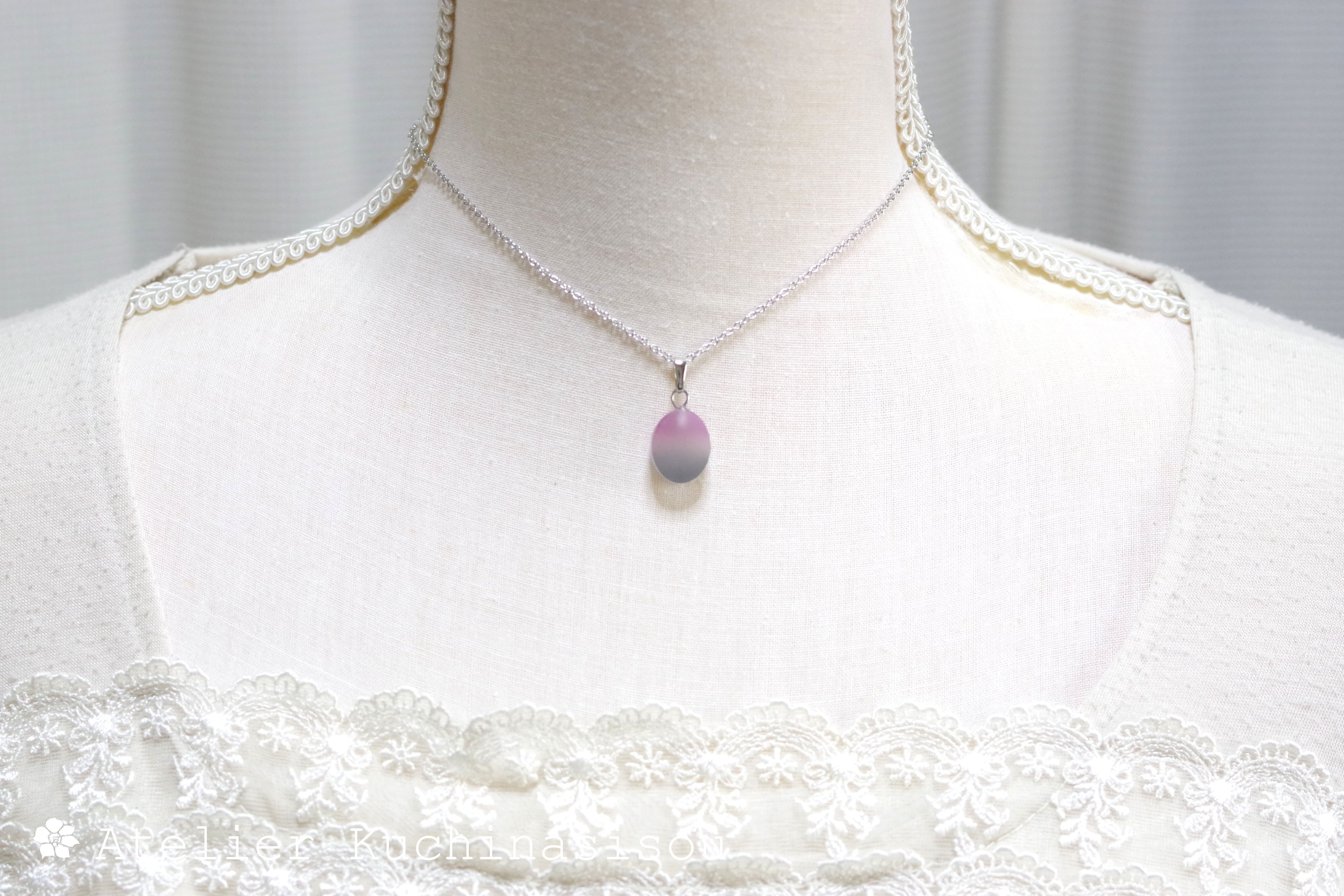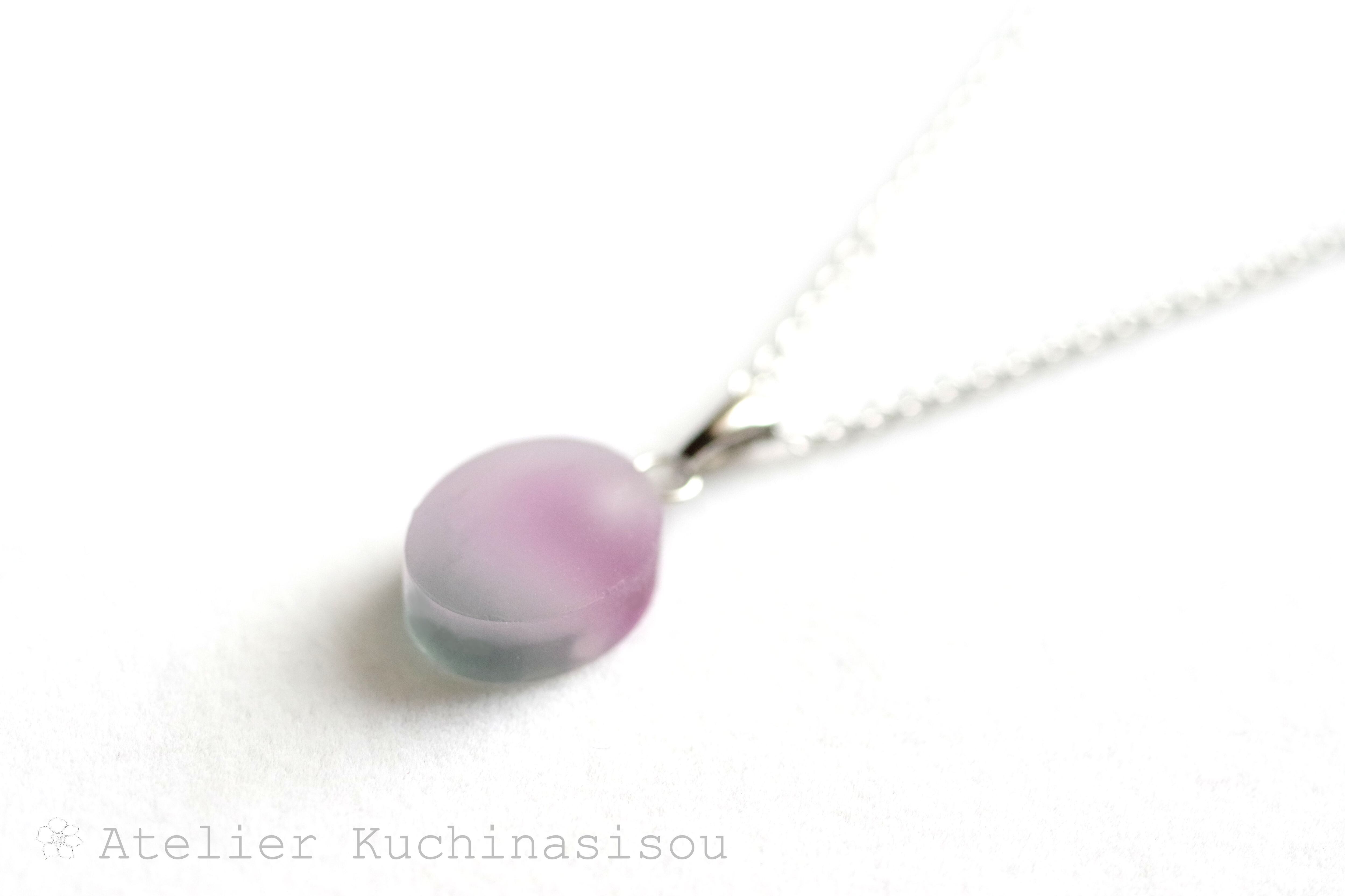 すりガラスのような柔らかな風合いと、そこからほのかに覗く落ち着いたグレーと紫が美しいペンダント。