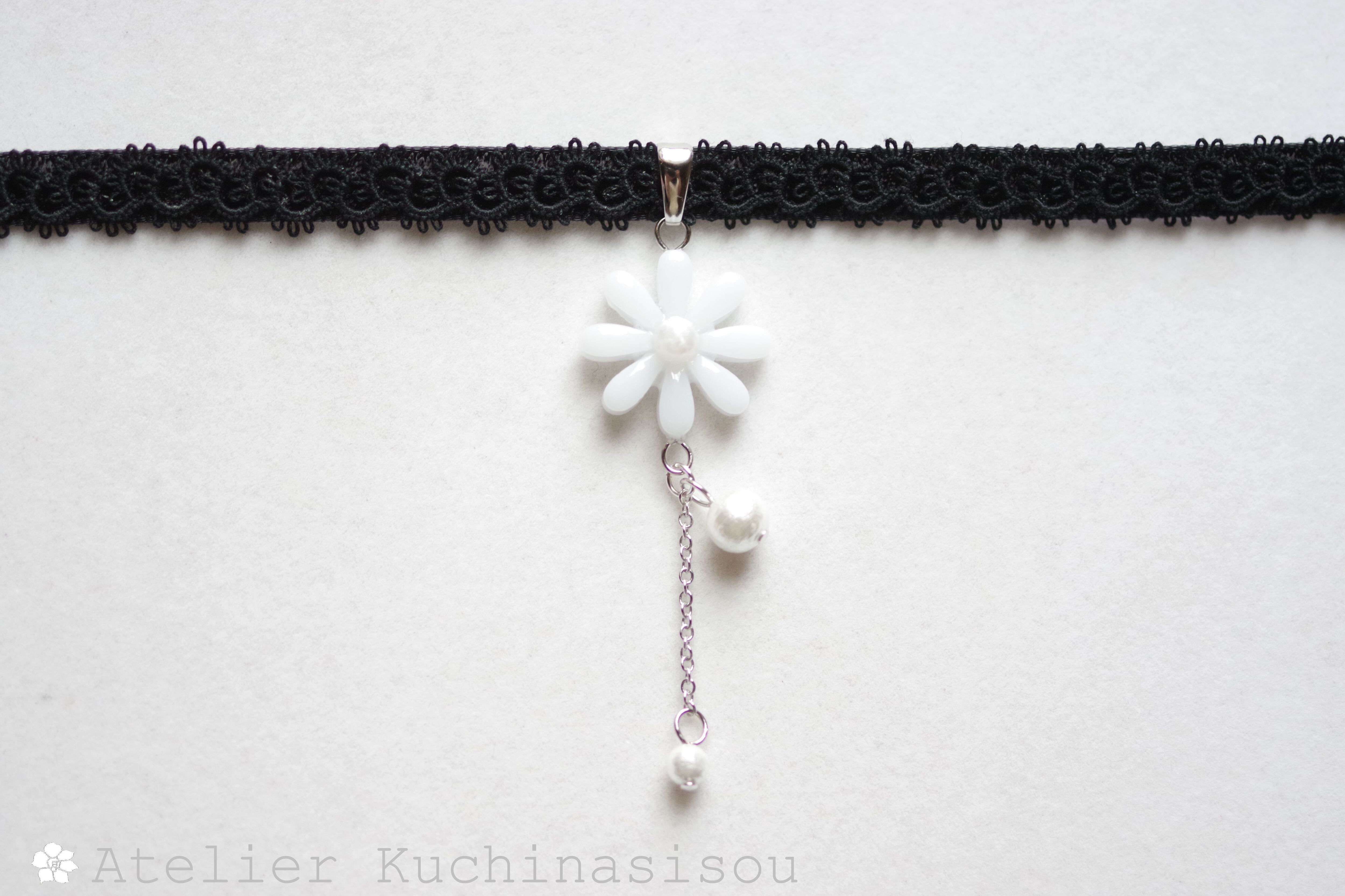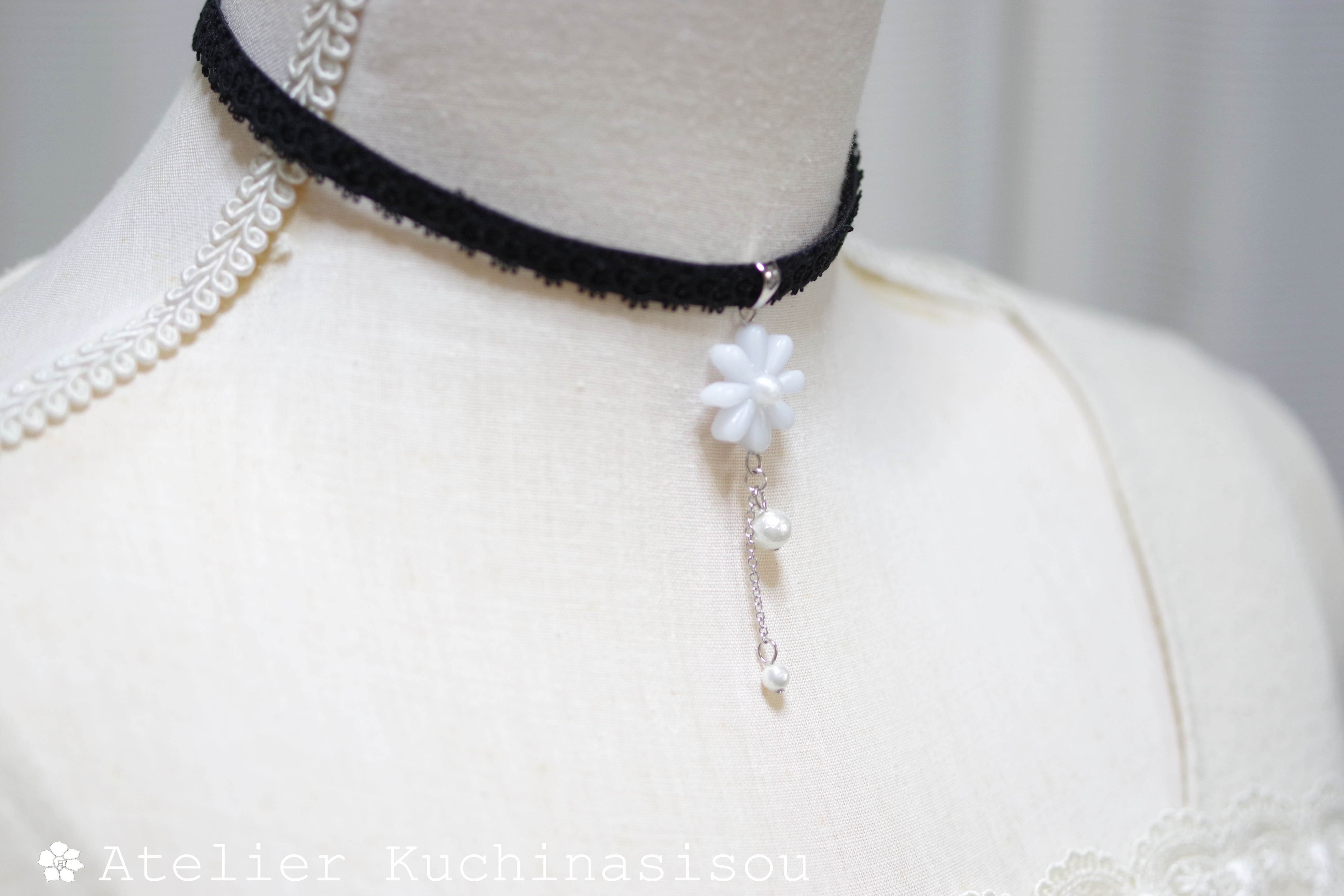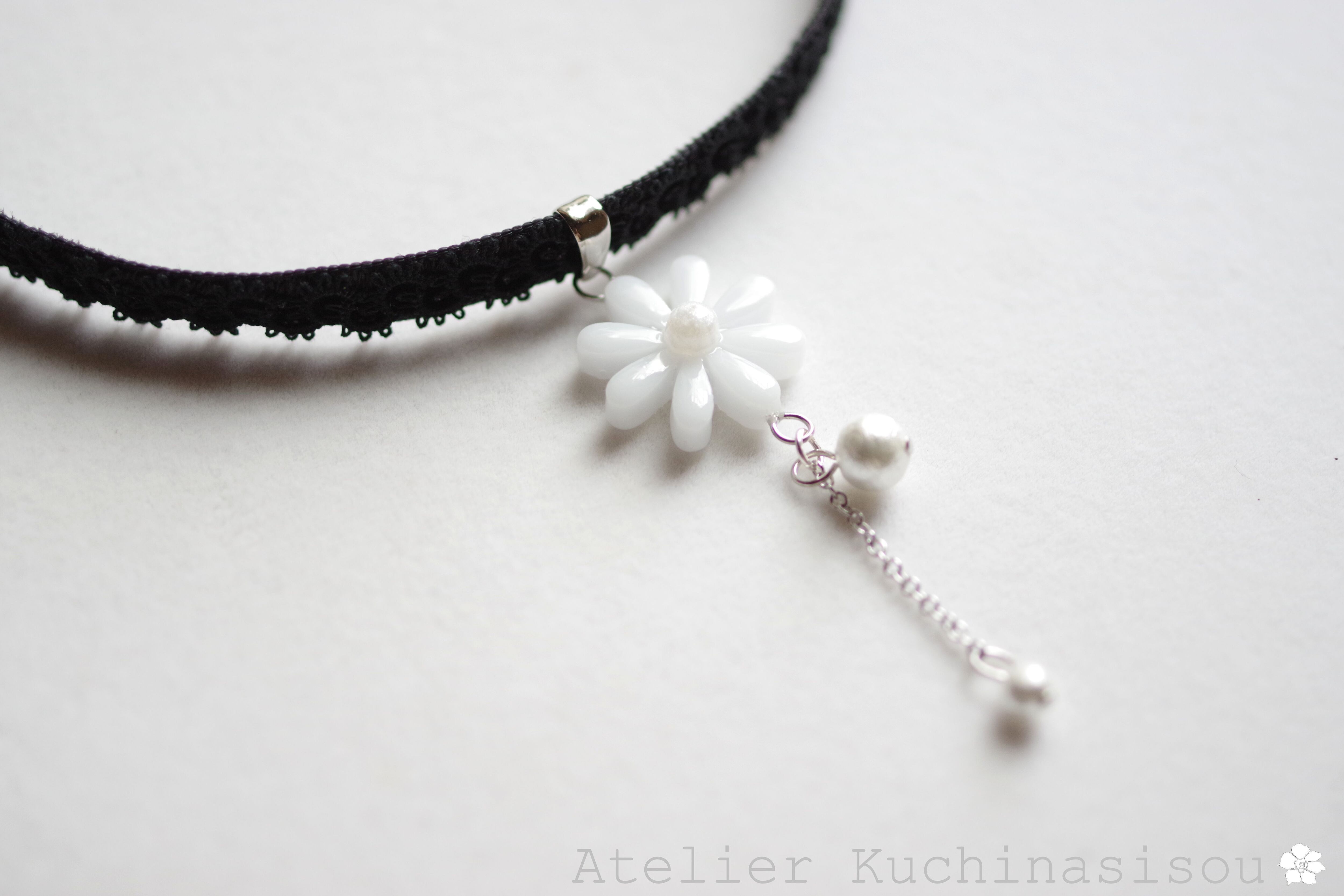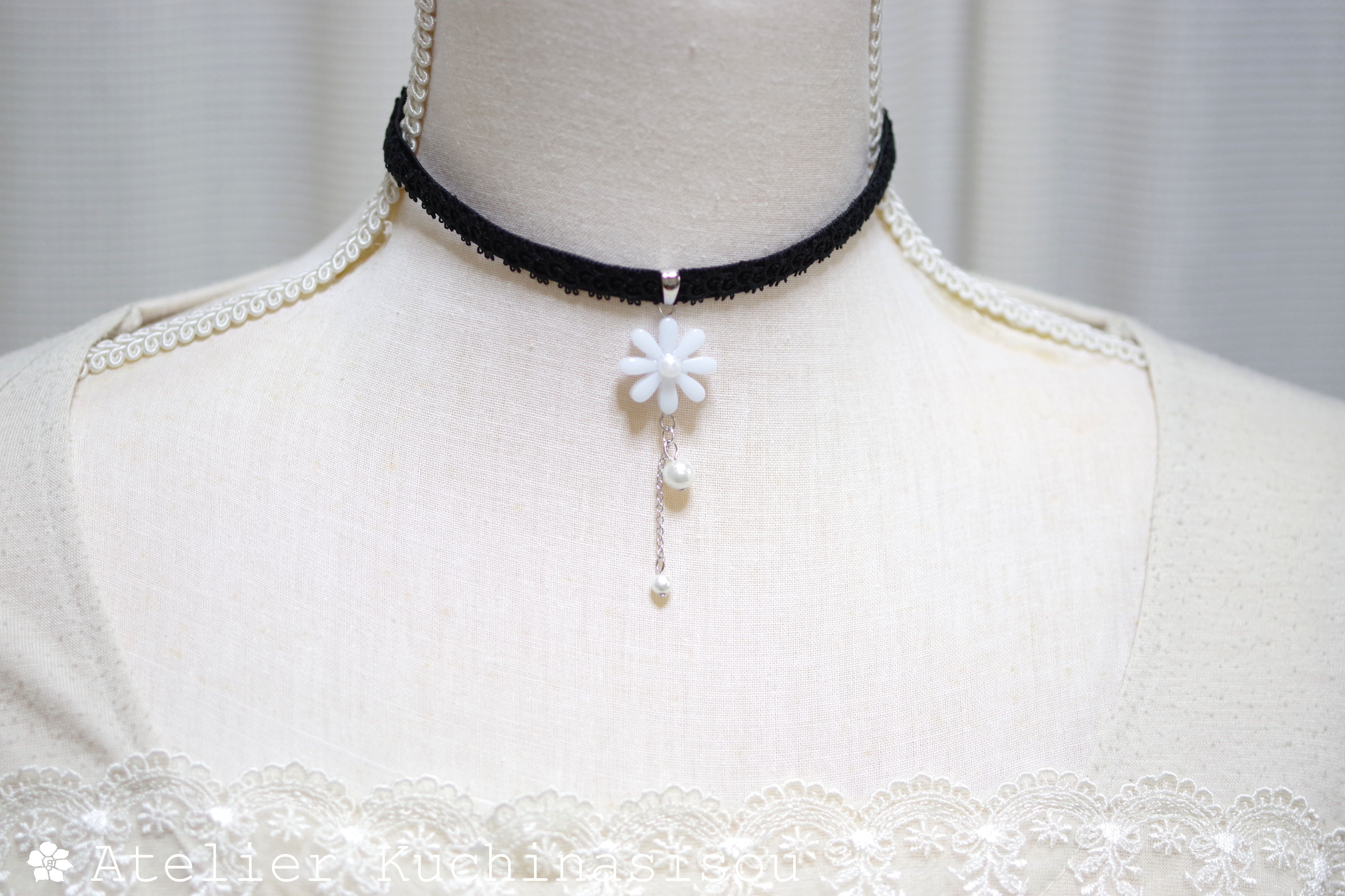 中心の花芯とコットンパールの光沢のある輝きが上品なチョーカー。