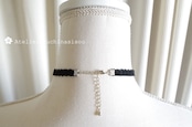 淡い淡い、どこまでも仄かでほとんど白と区別がつかないようなレジンの水色のお花を、ベルベットリボンにタティングレースで装飾を施したチョーカーに仕上げました。