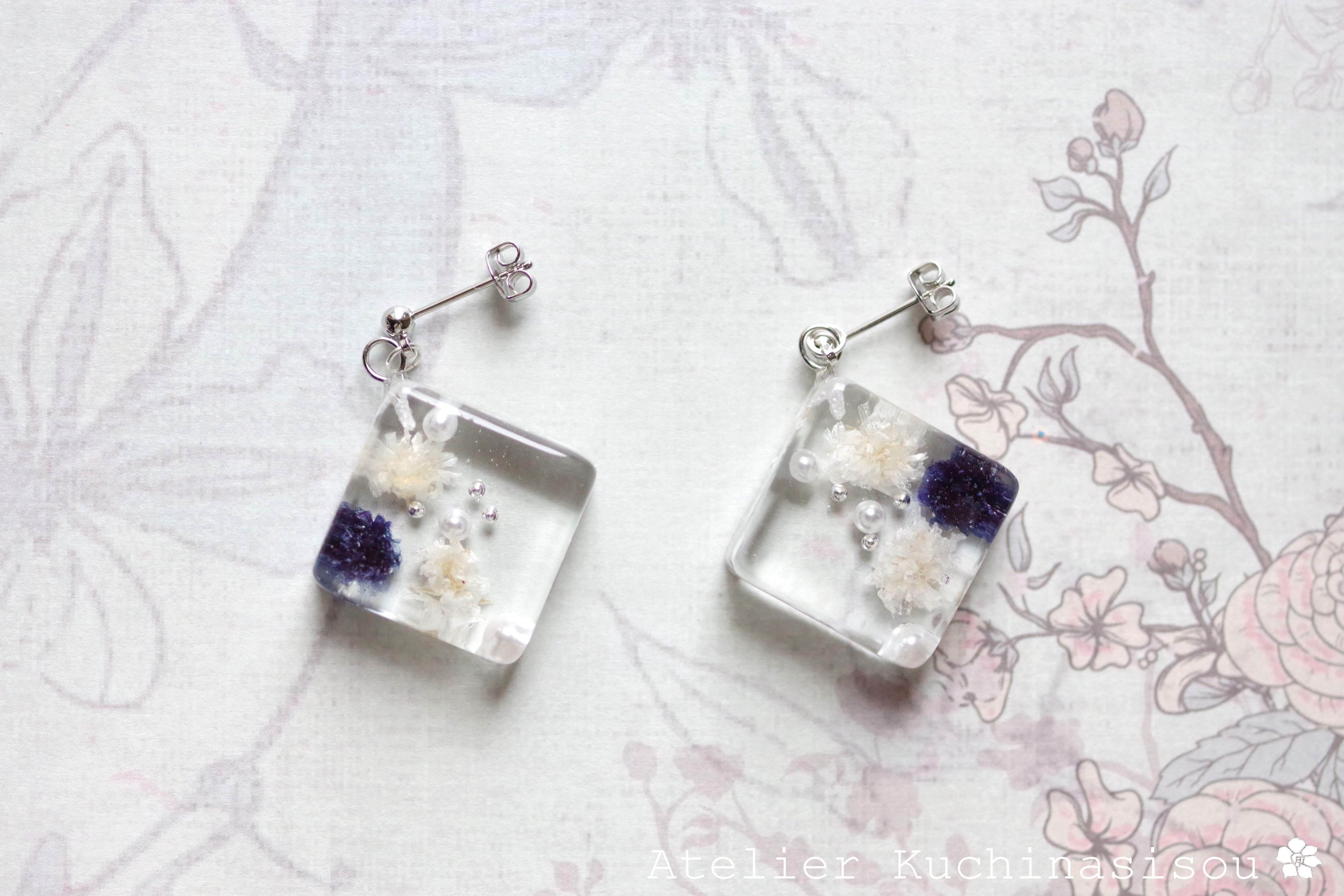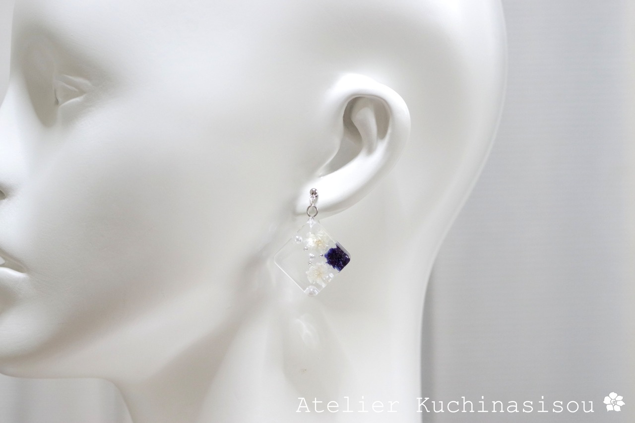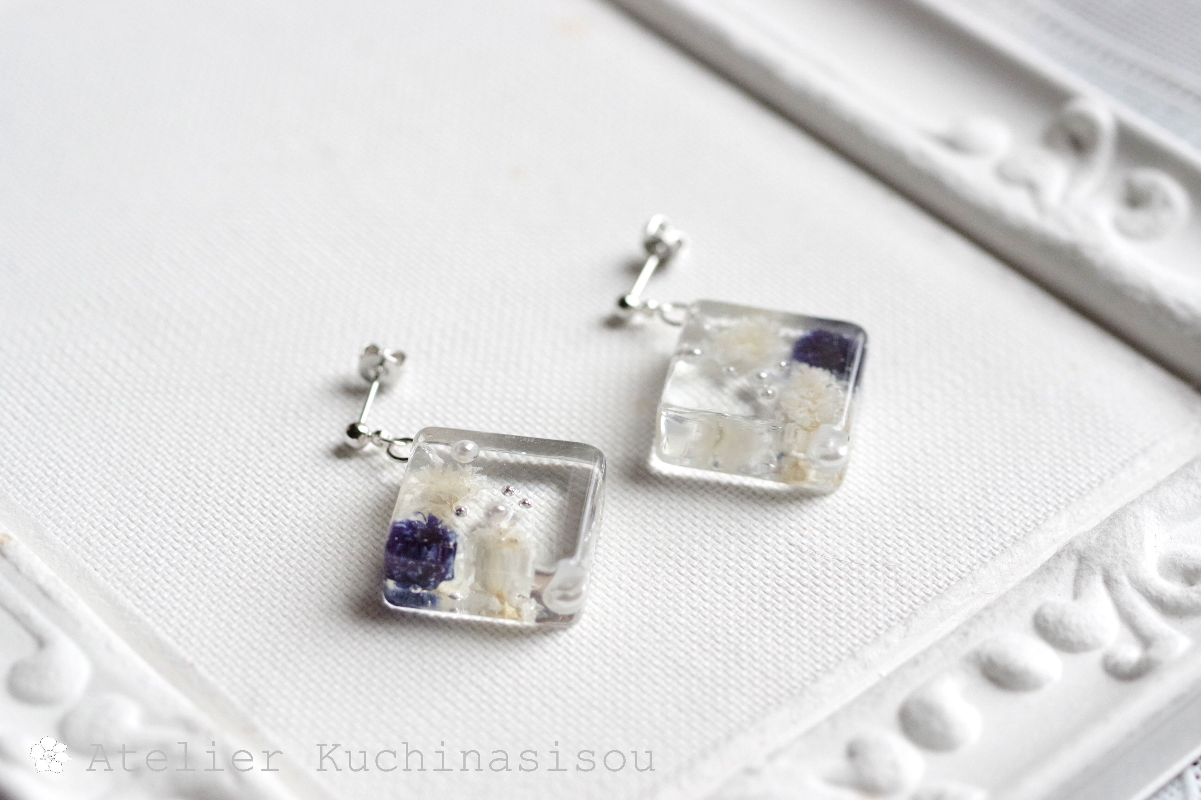 四角いレジンにコバルトブルーとオフホワイトのお花、パール、ブリオンを沈めたピアス。