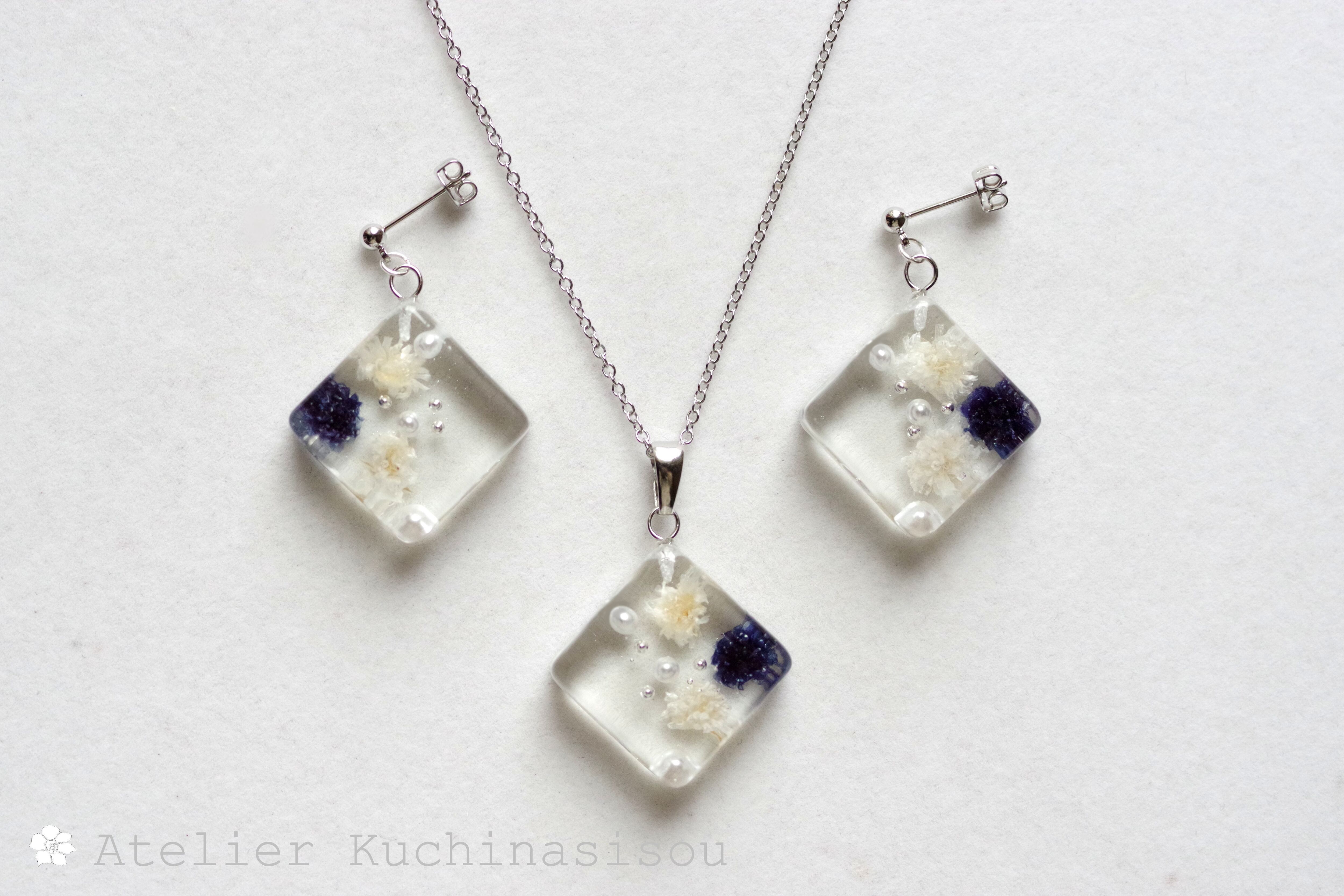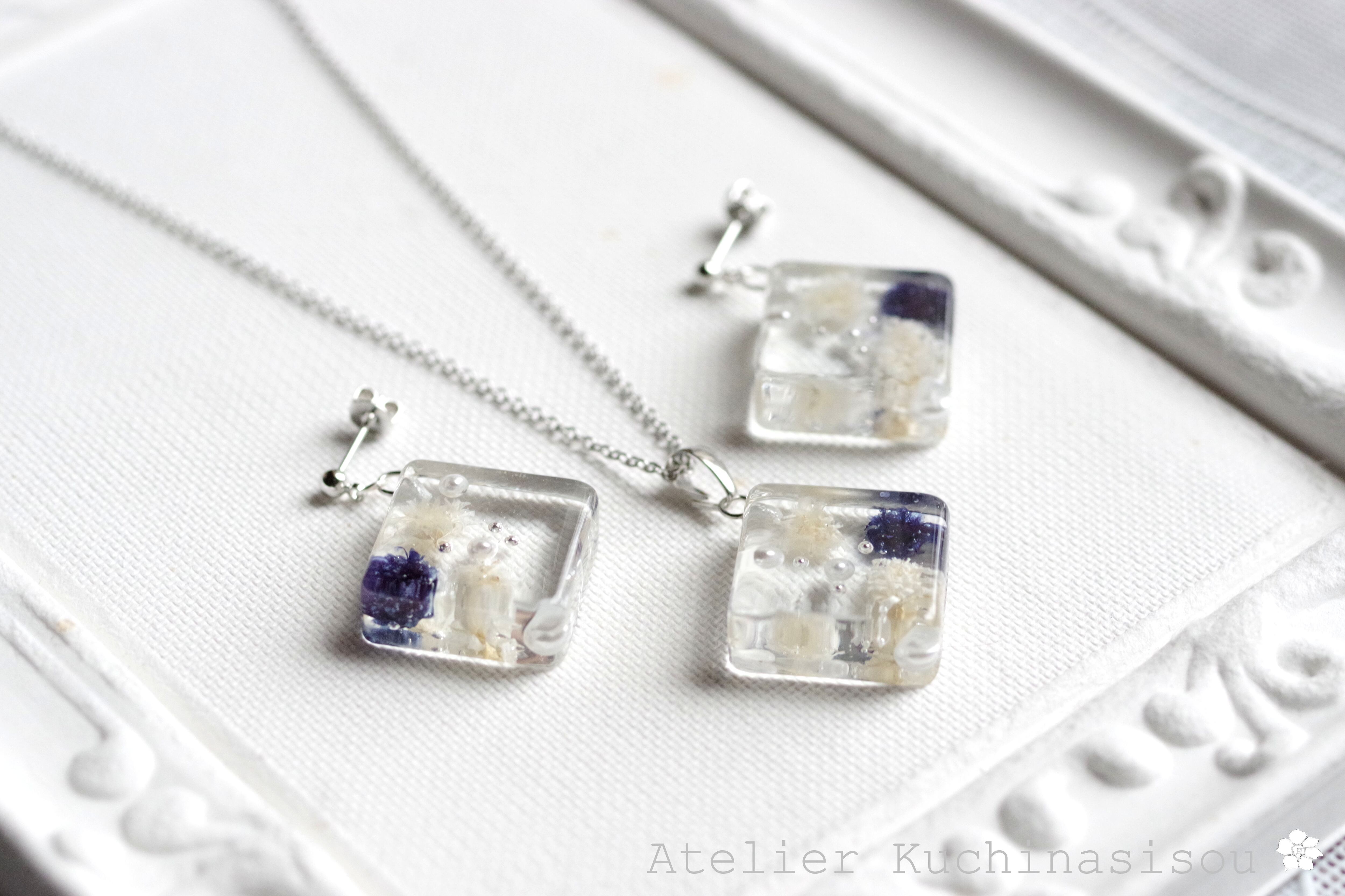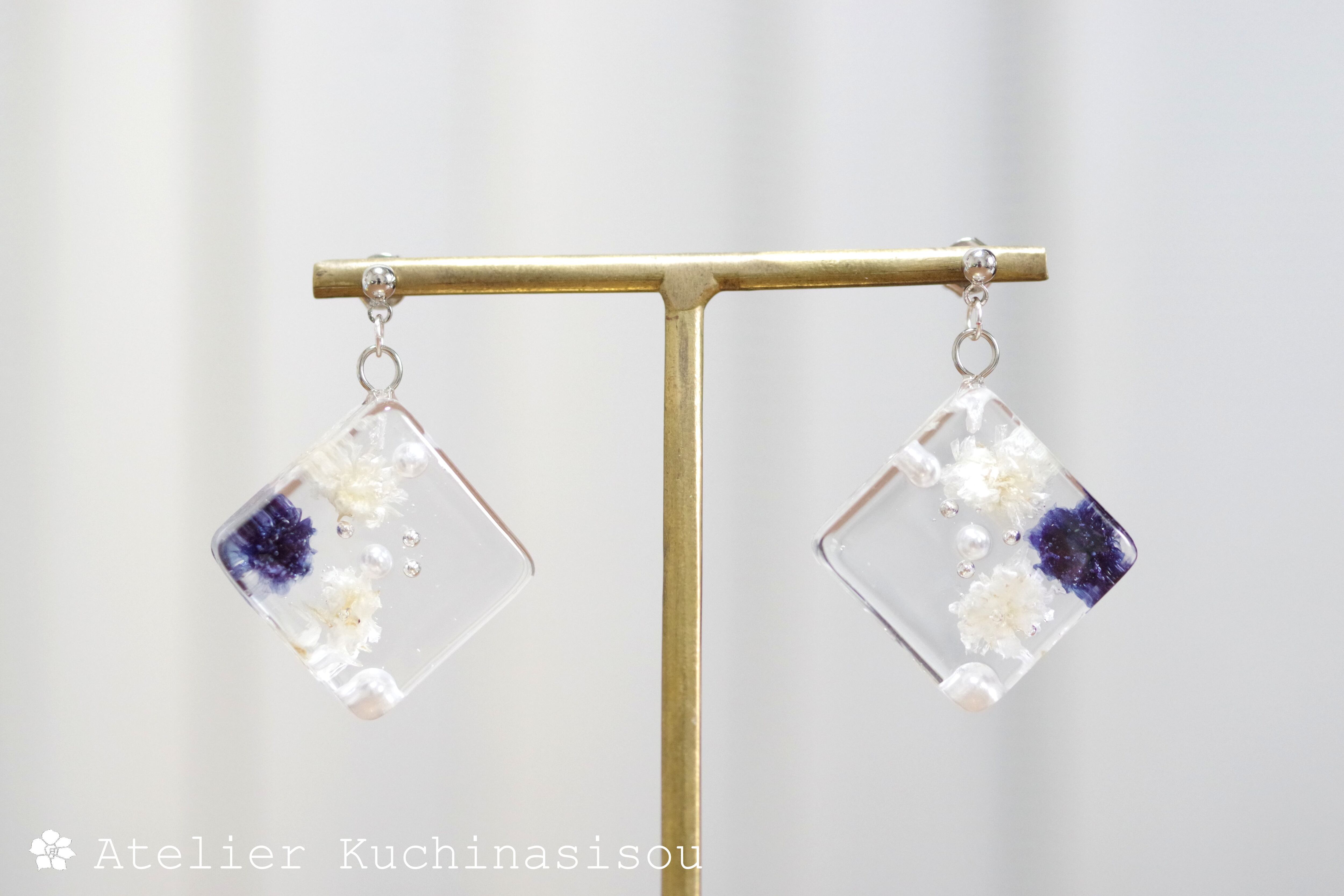 四角いレジンにコバルトブルーとオフホワイトのお花、パール、ブリオンを沈めたピアス。