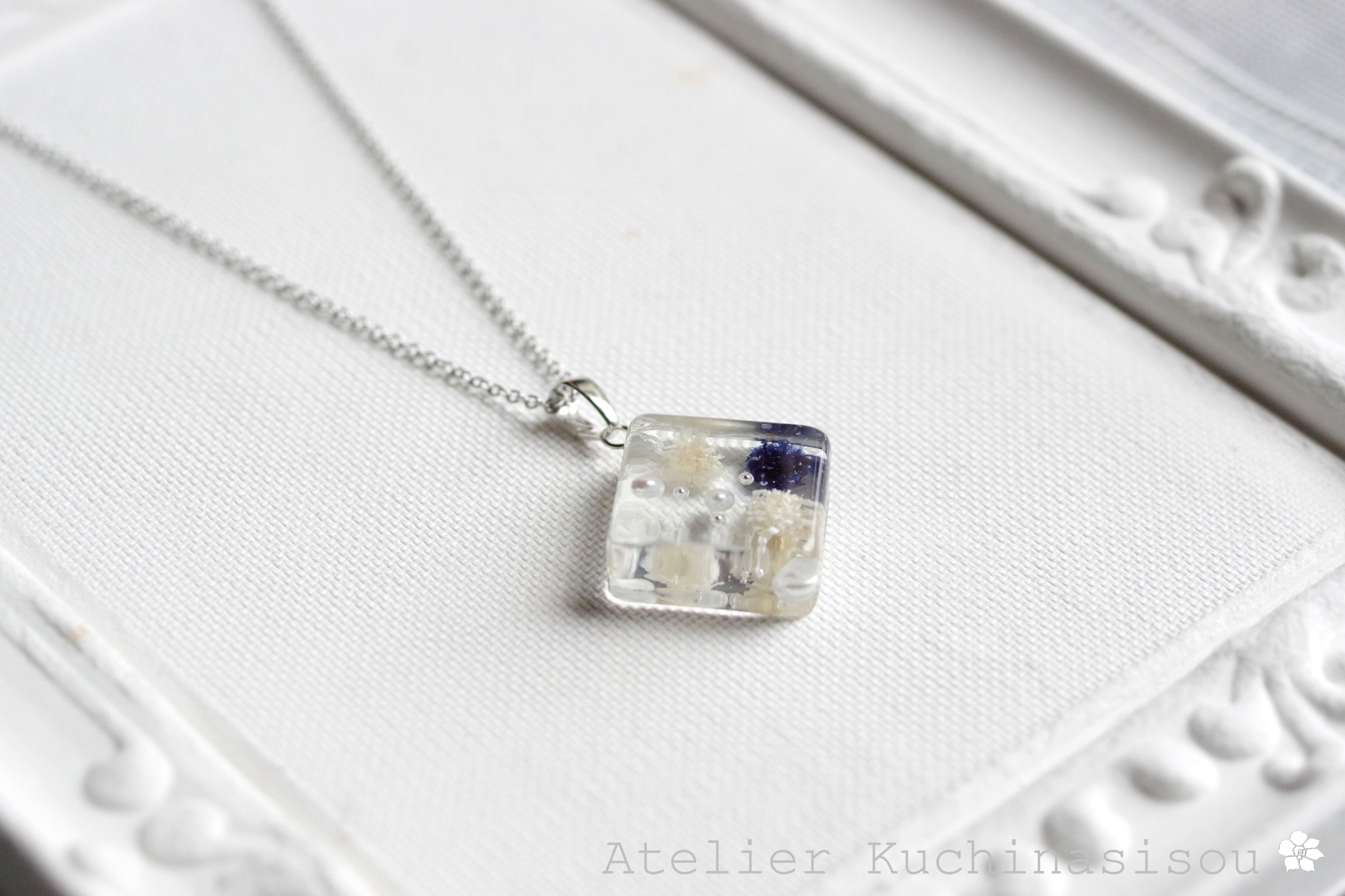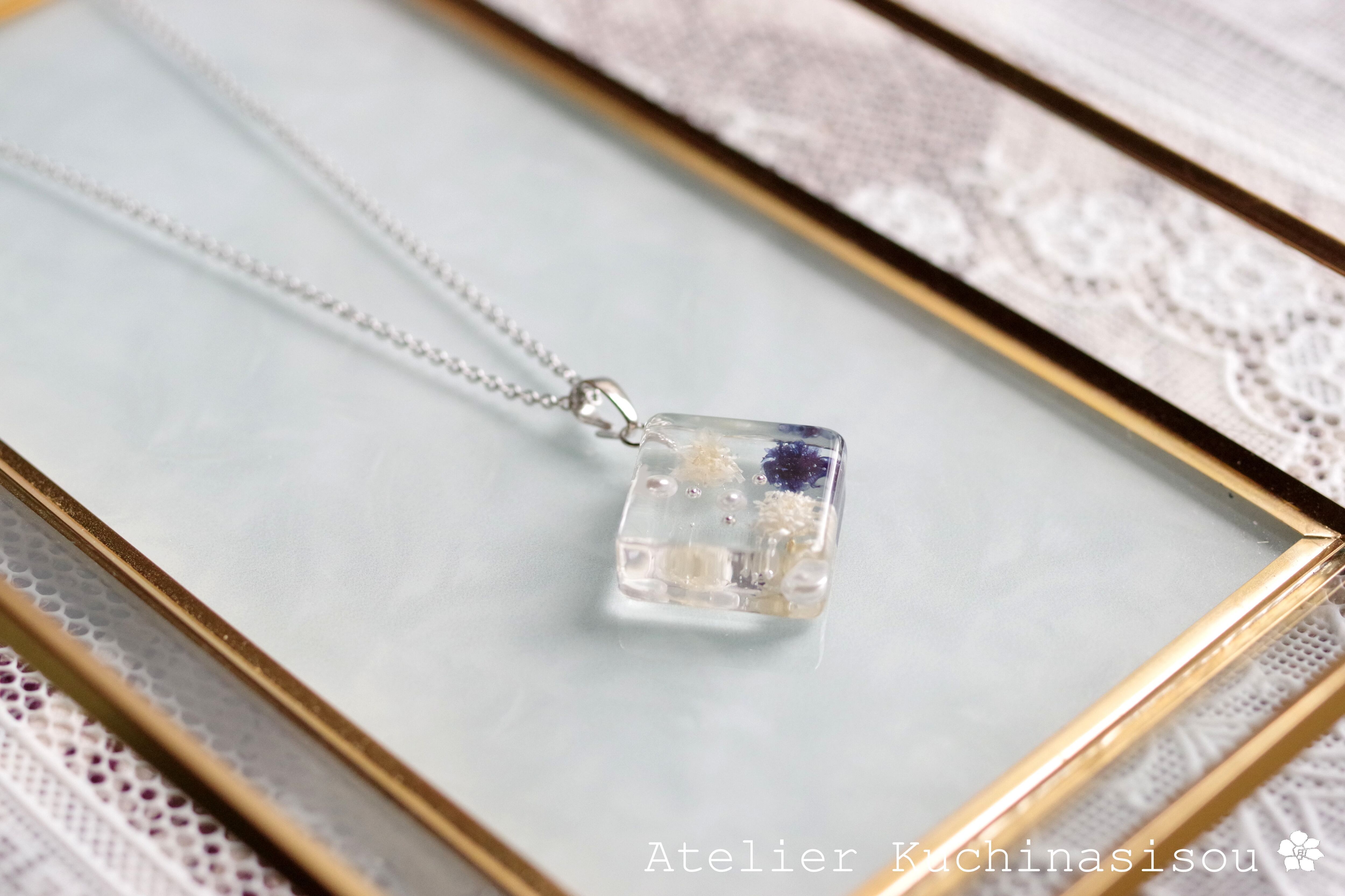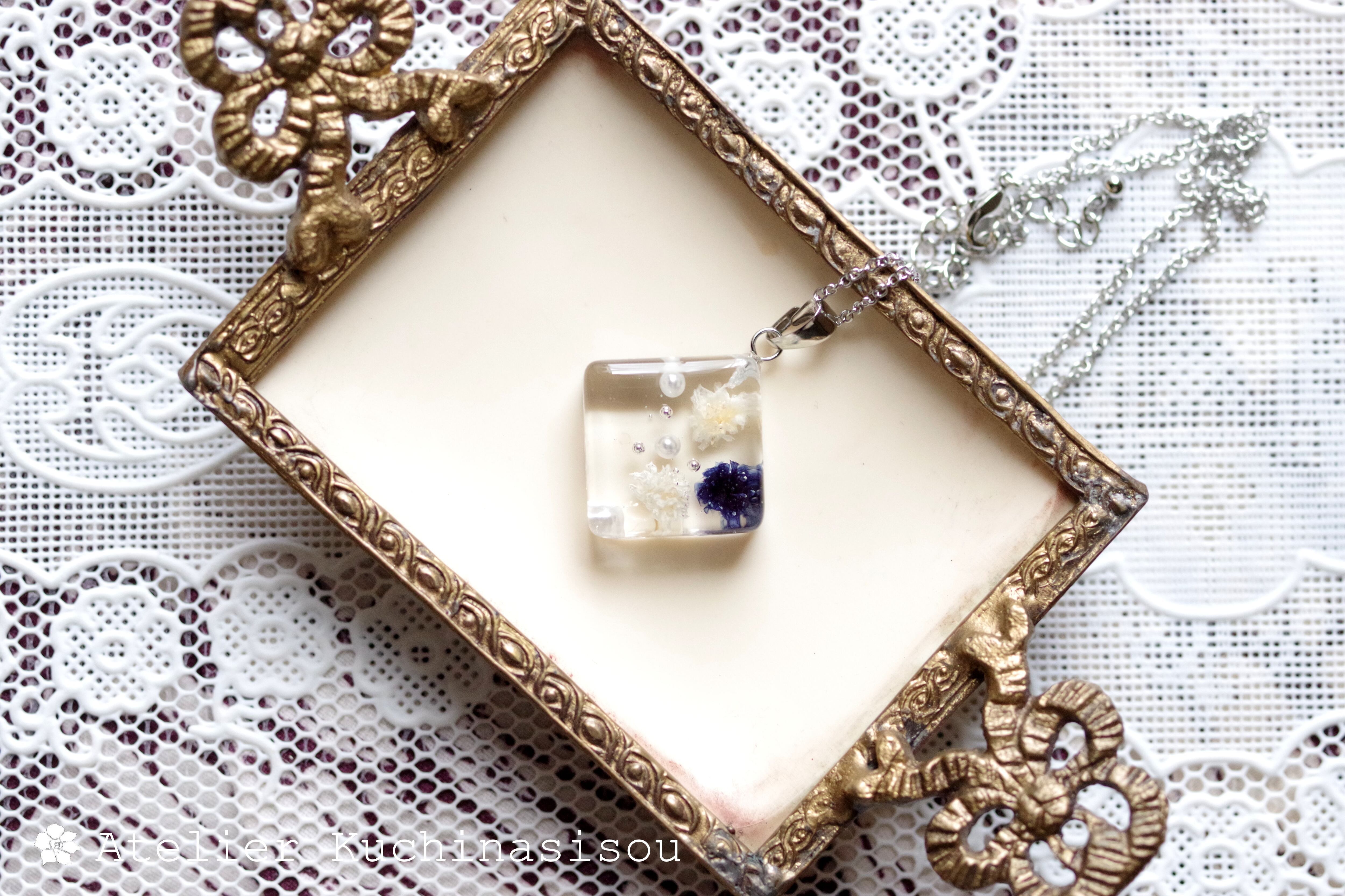 四角いレジンにコバルトブルーとオフホワイトのお花、パール、ブリオンを沈めたペンダント。