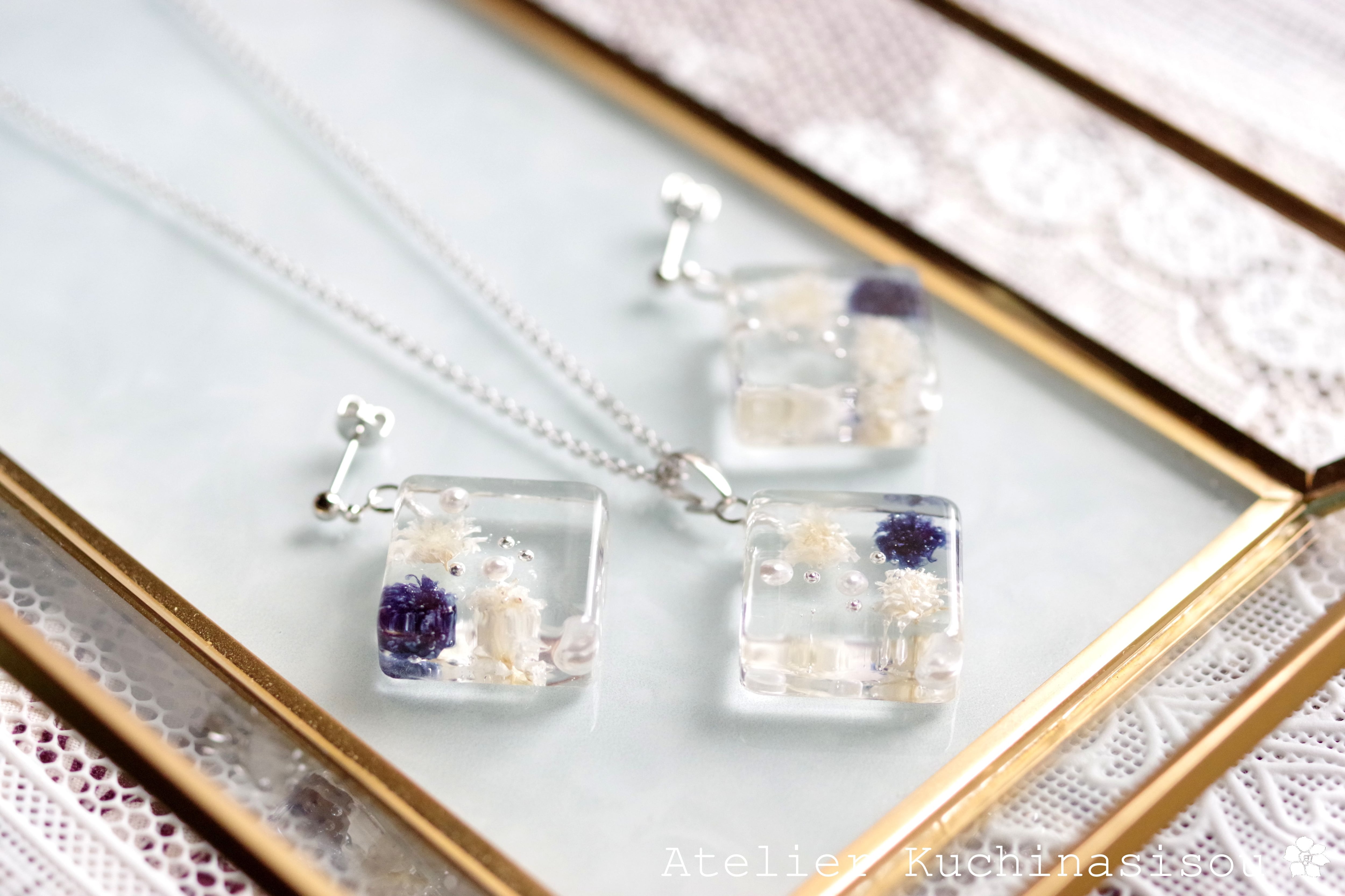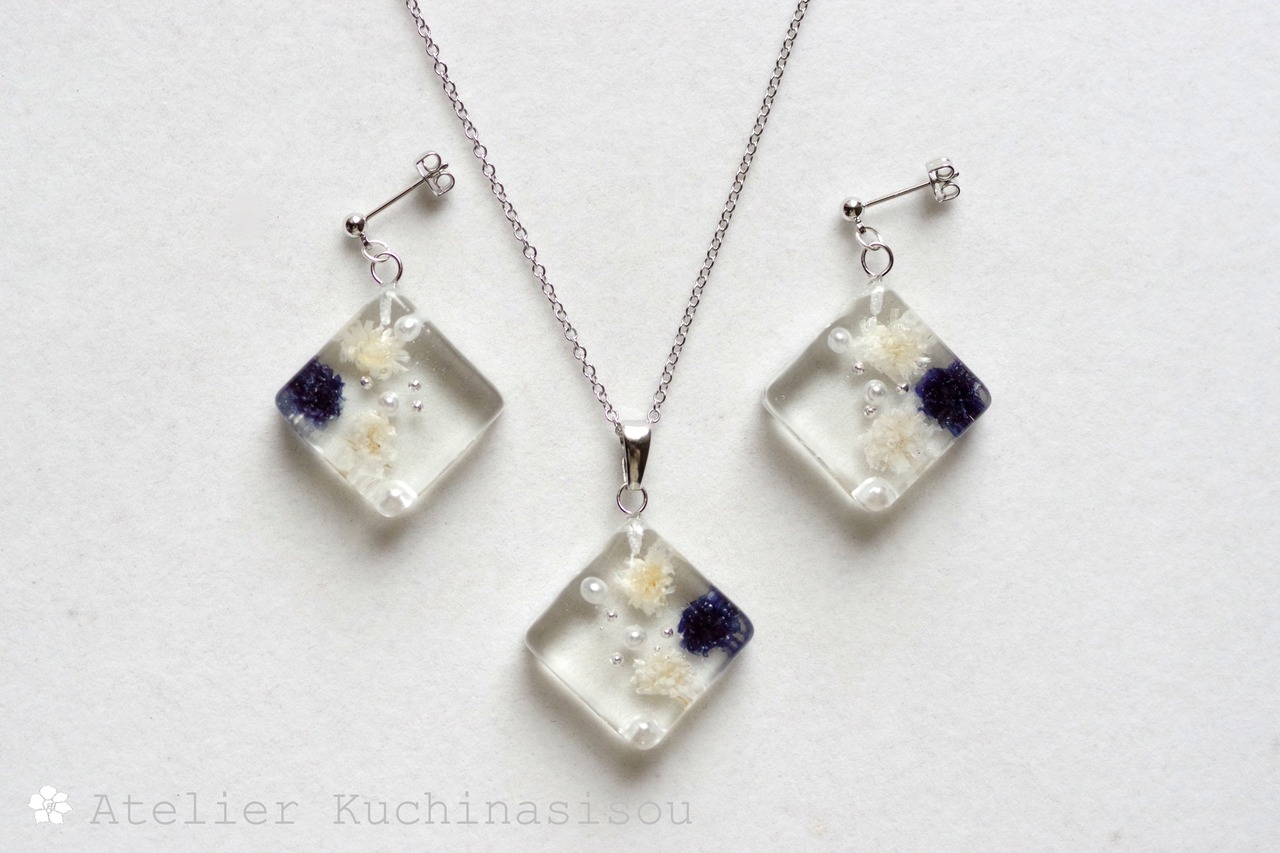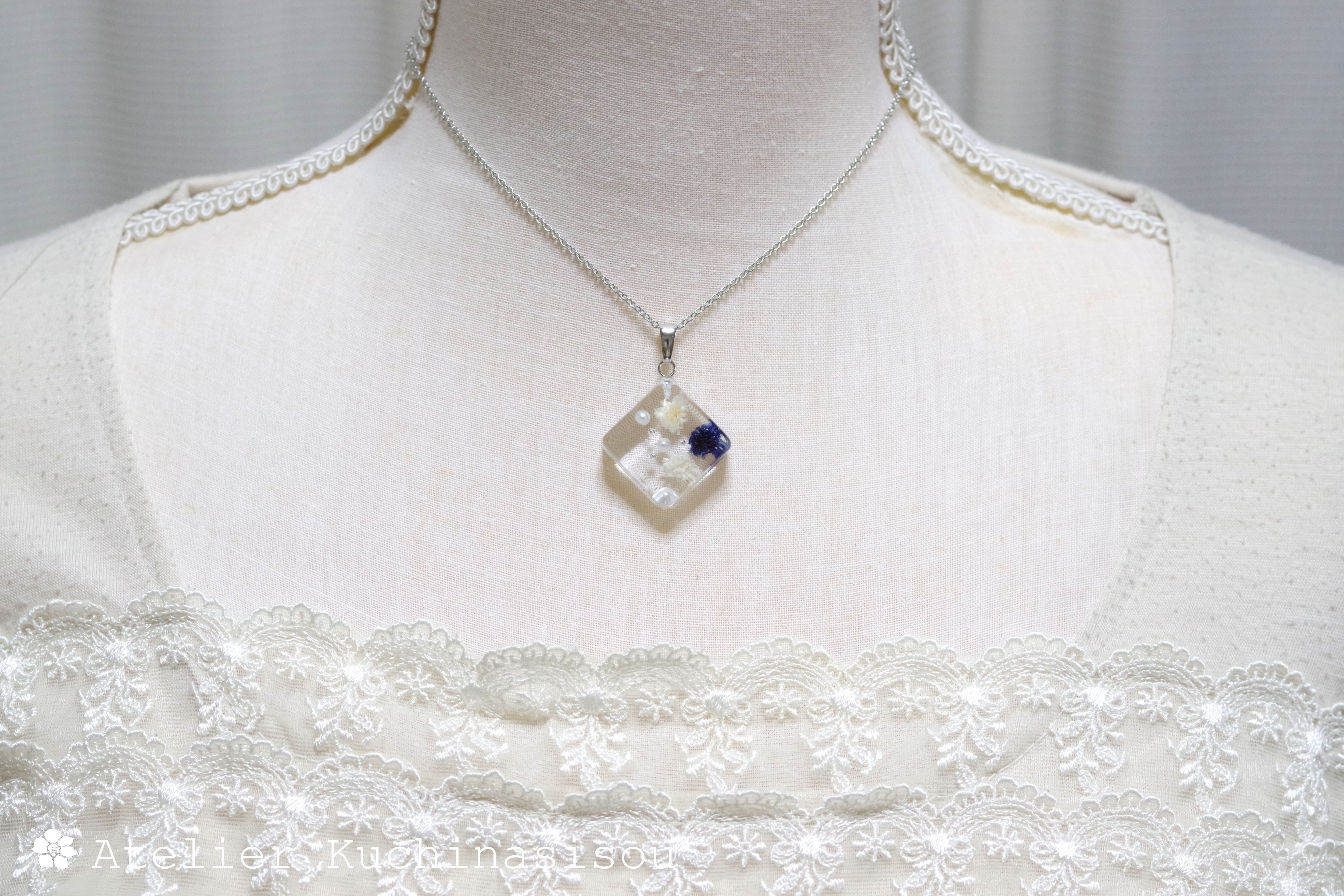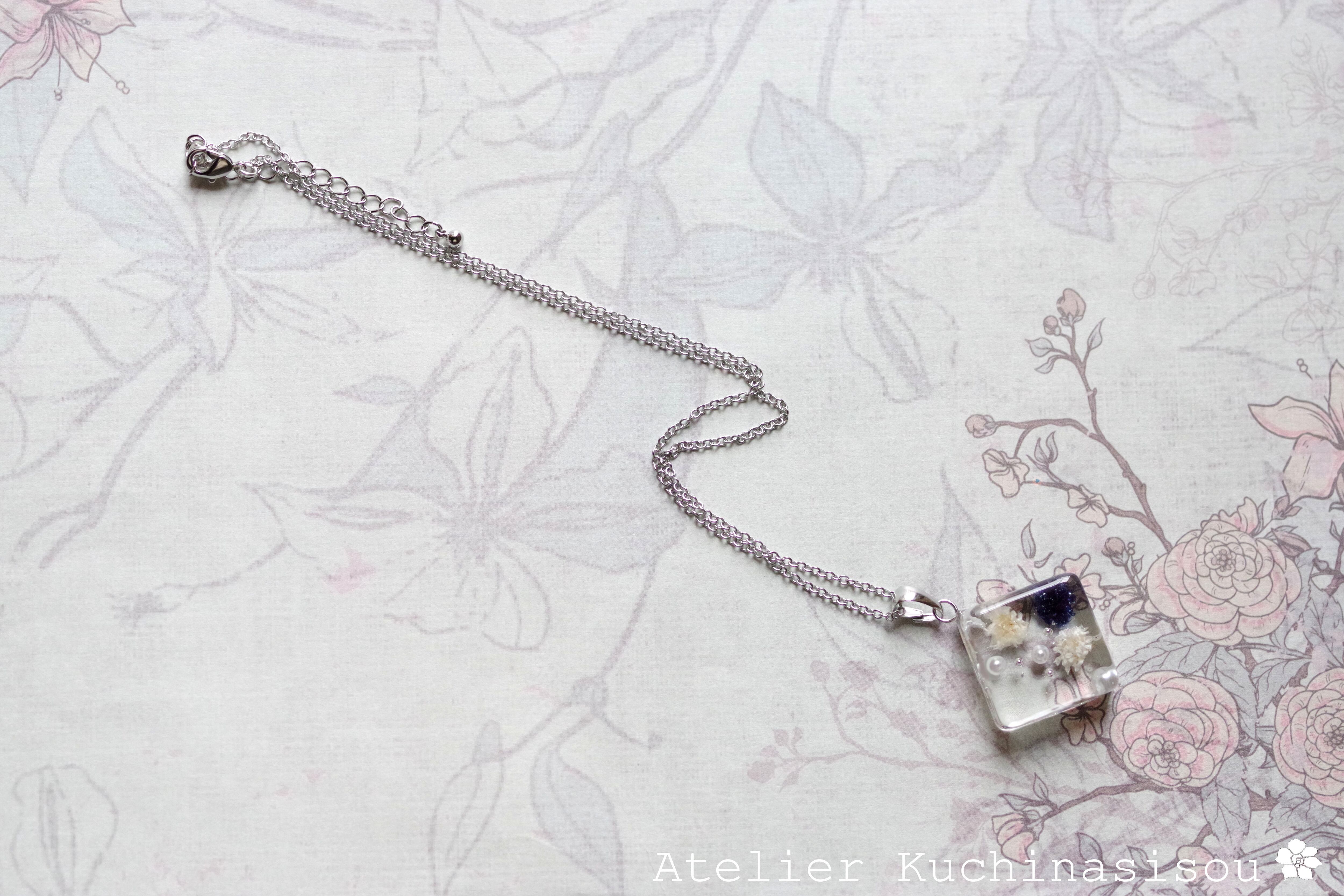 四角いレジンにコバルトブルーとオフホワイトのお花、パール、ブリオンを沈めたペンダント。