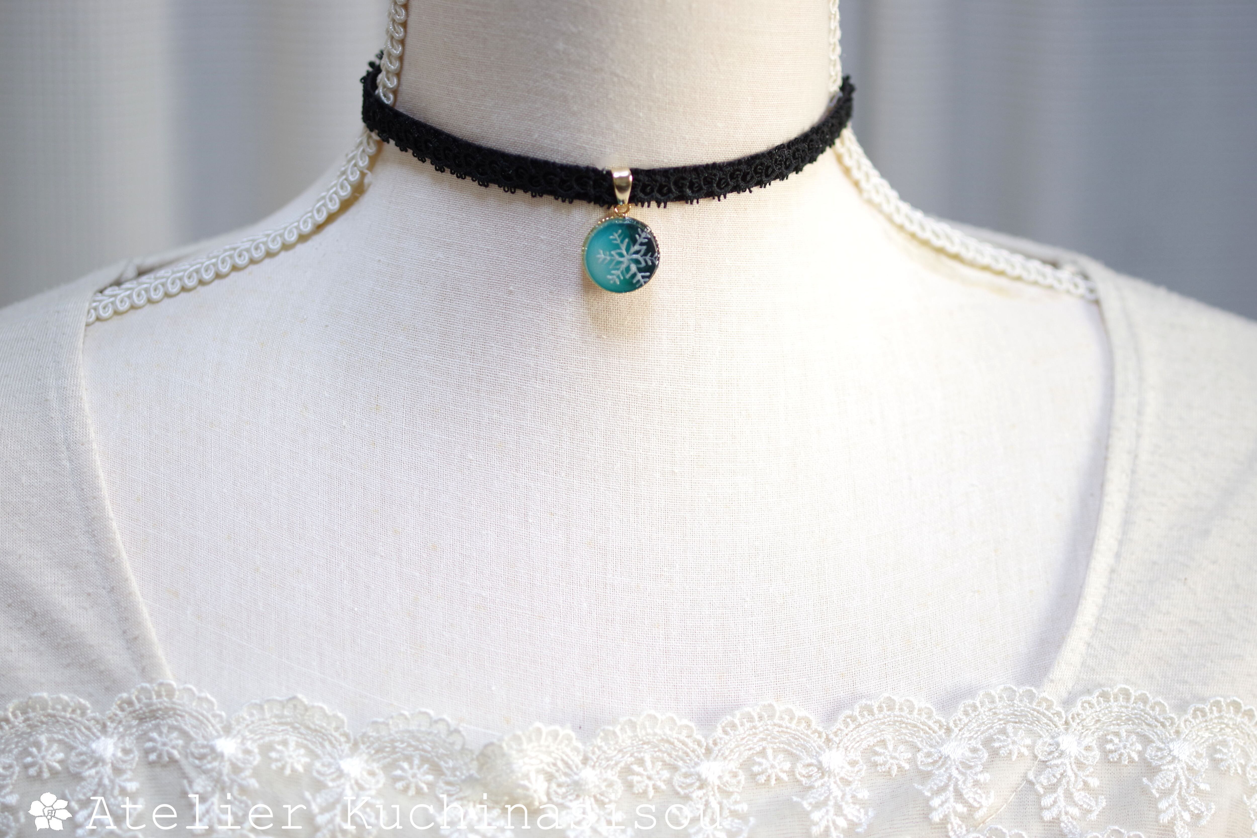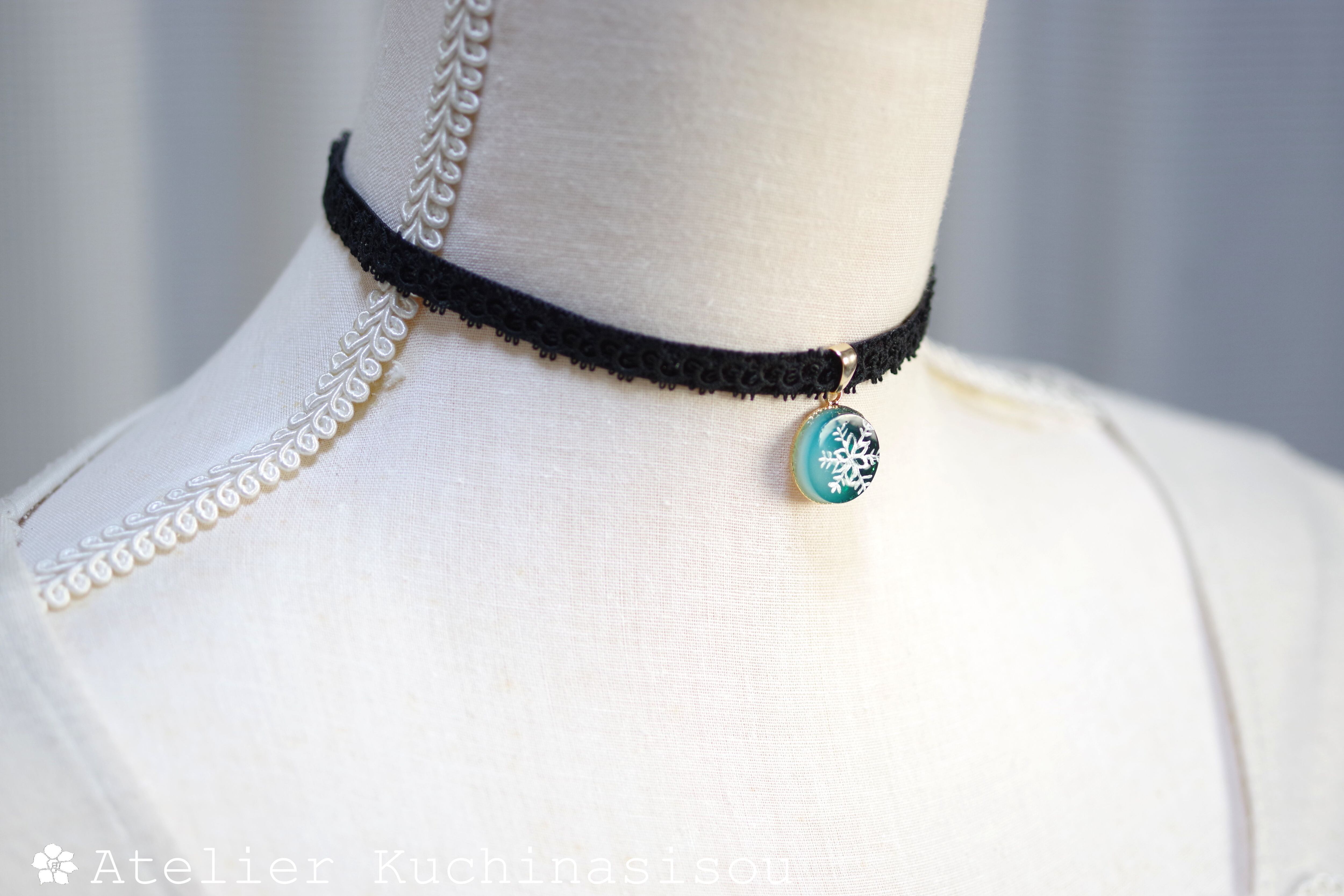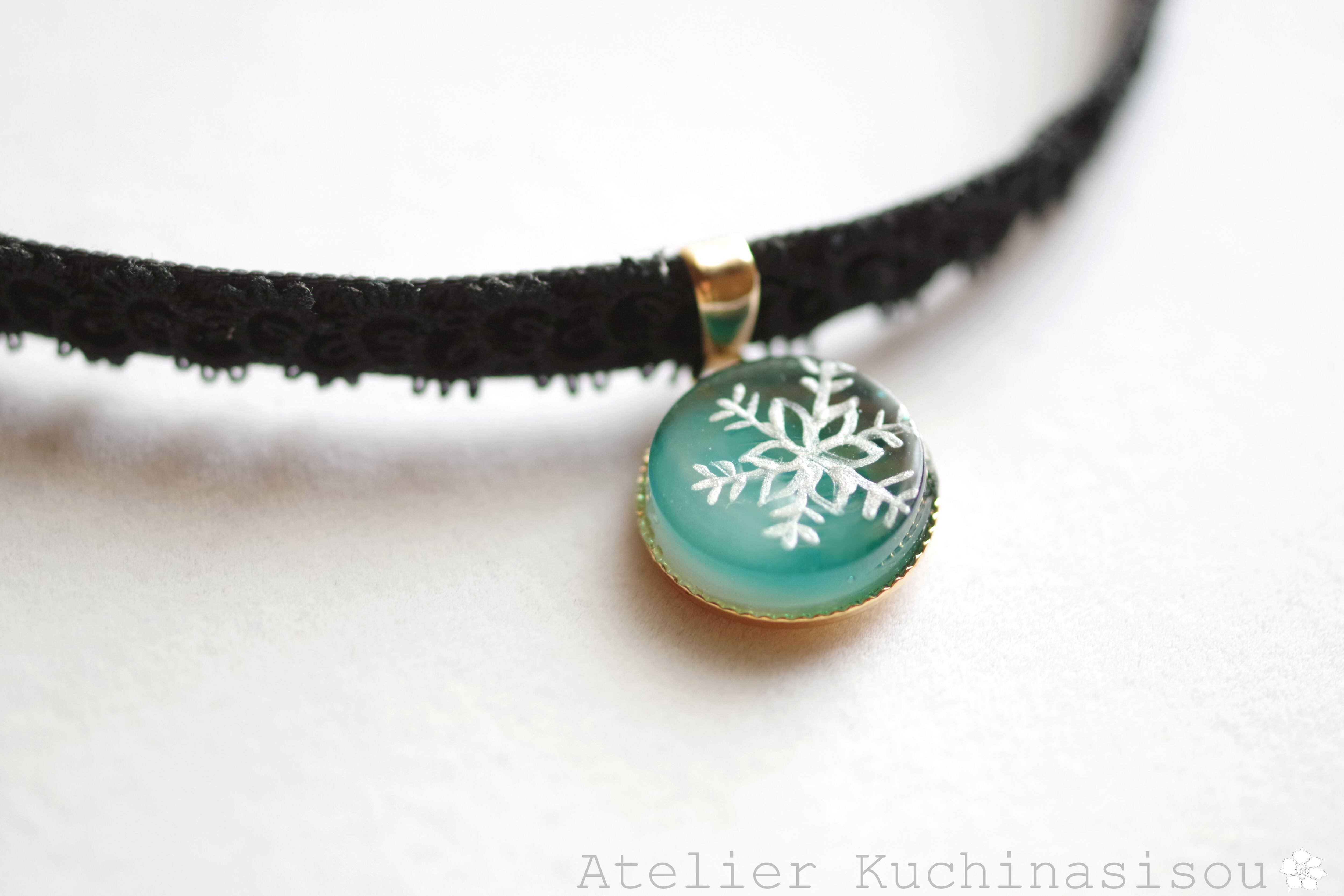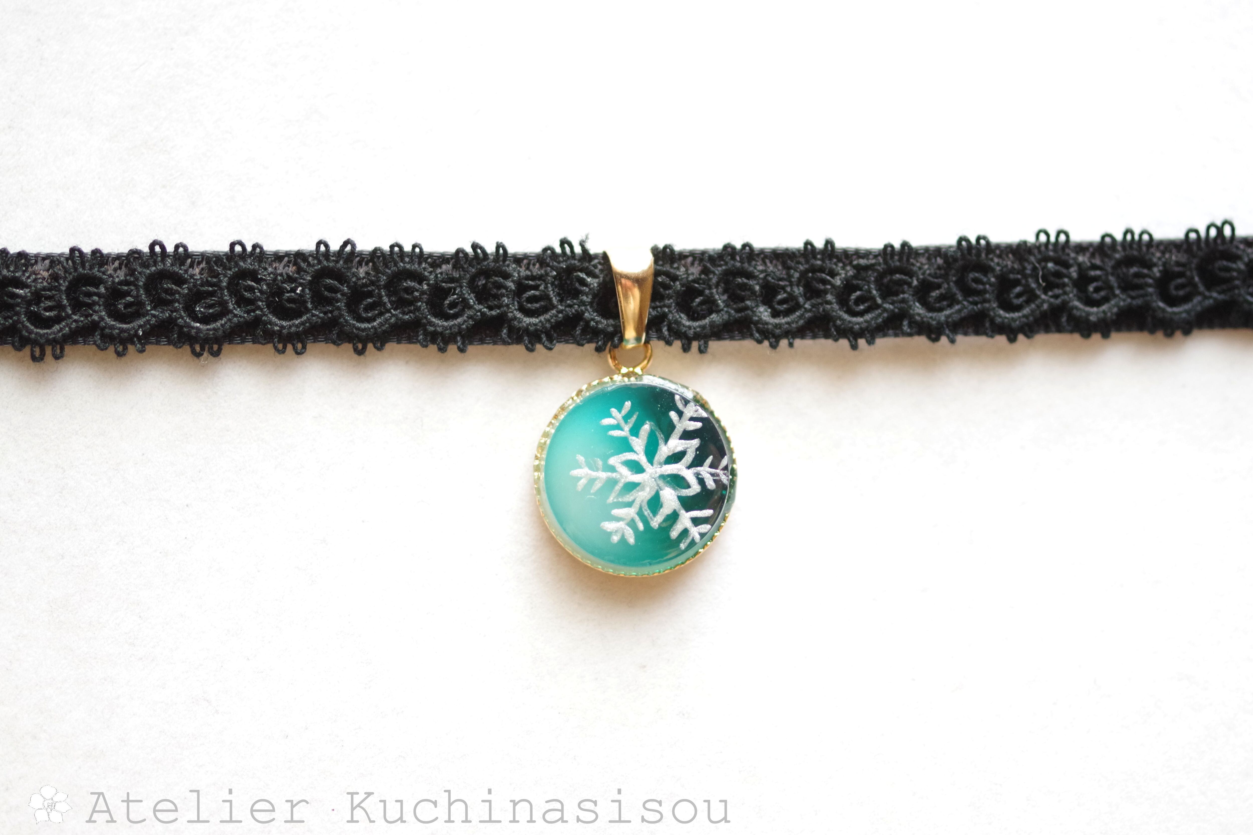 鮮やかなグリーンのグラデーションにパールホワイトの雪の結晶が映えるレジンを、ベルベットリボンにタティングレースで装飾を施したチョーカーに仕上げました。