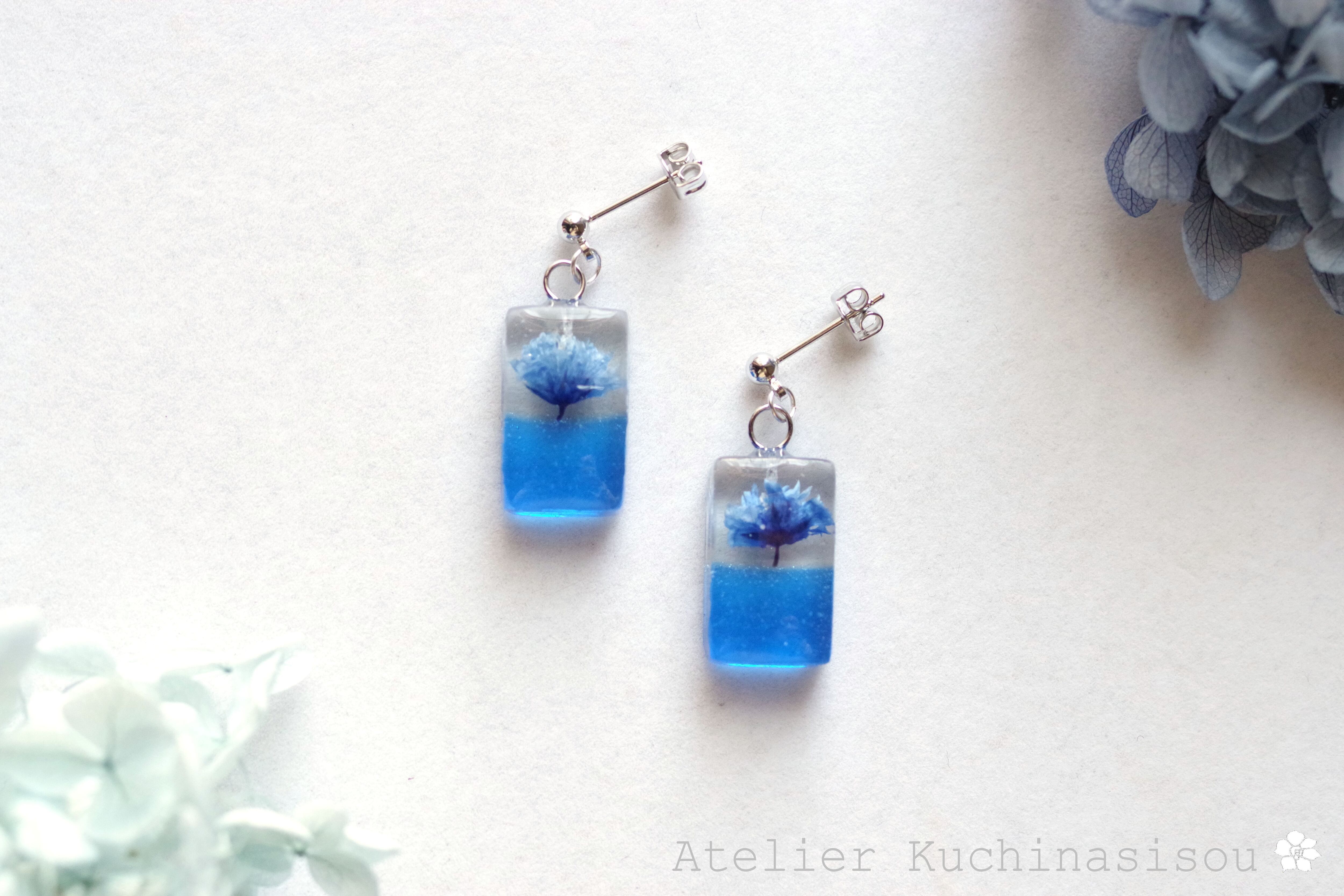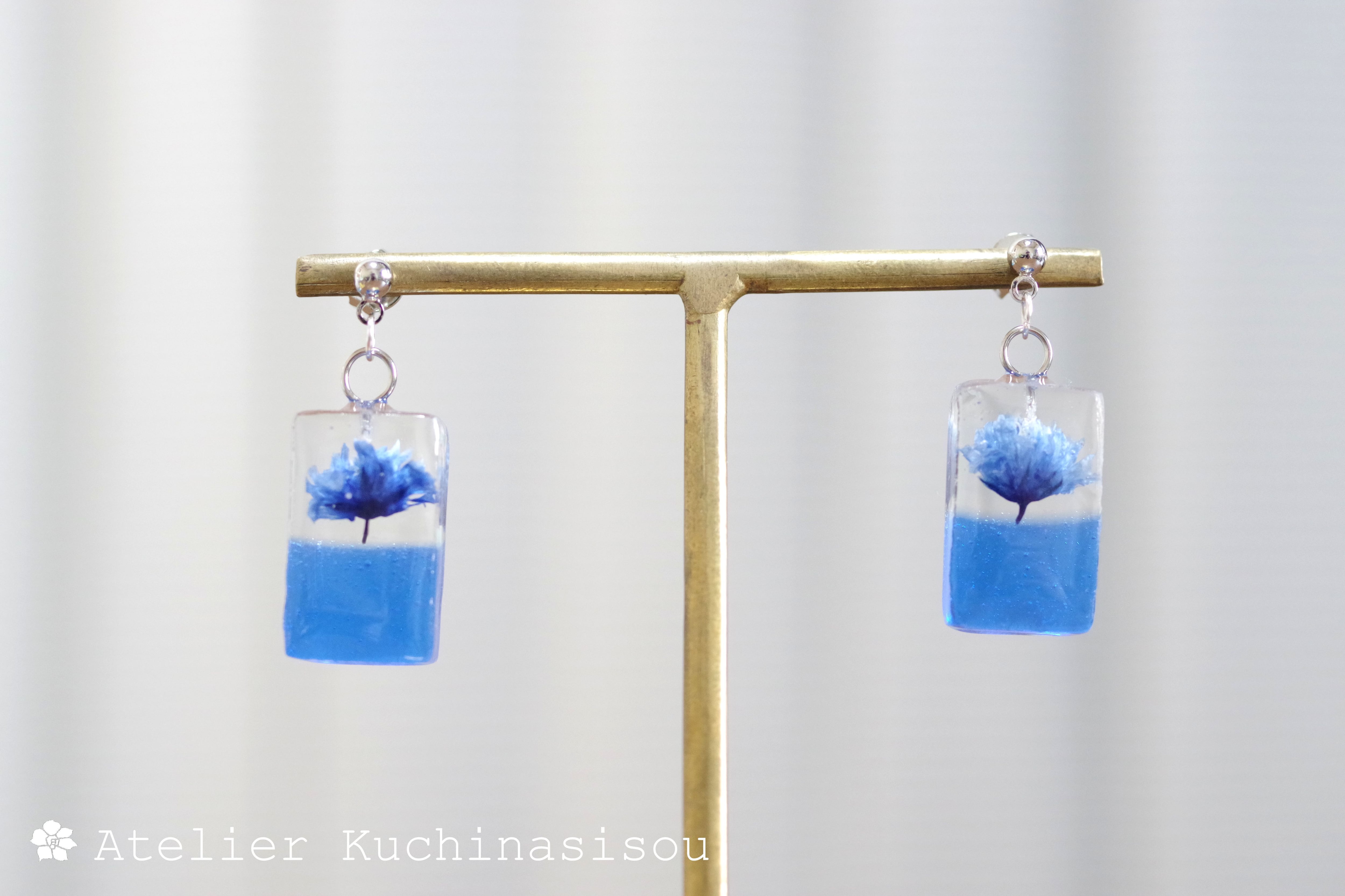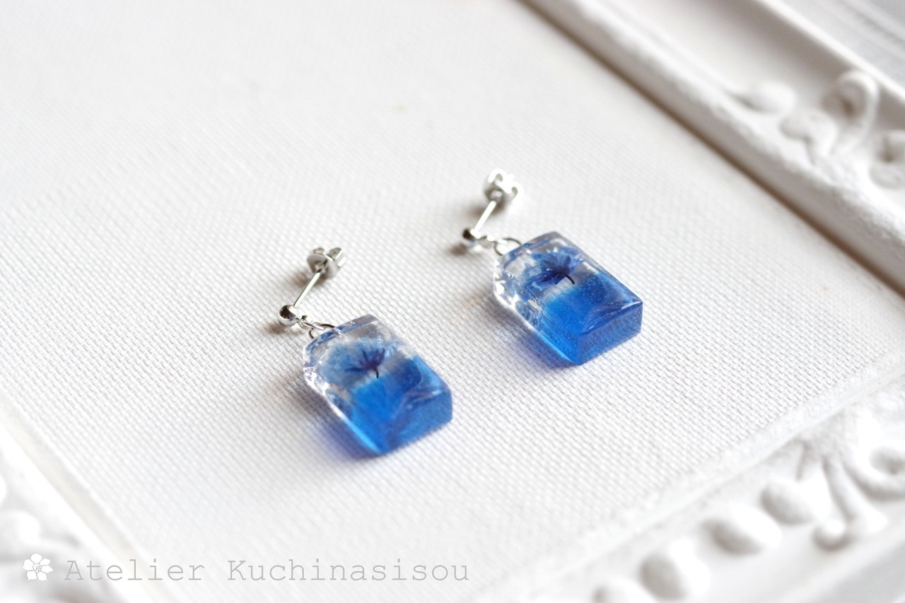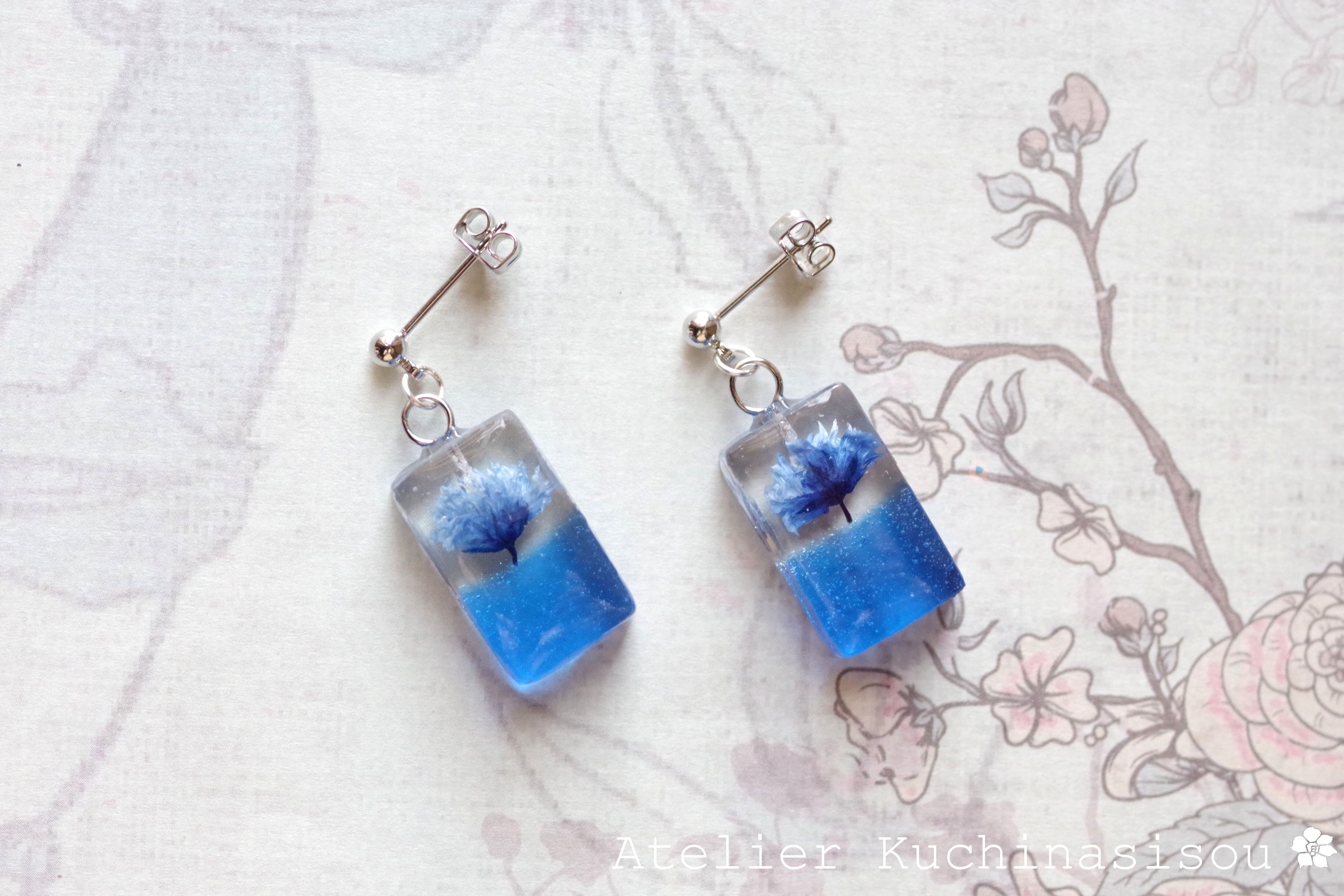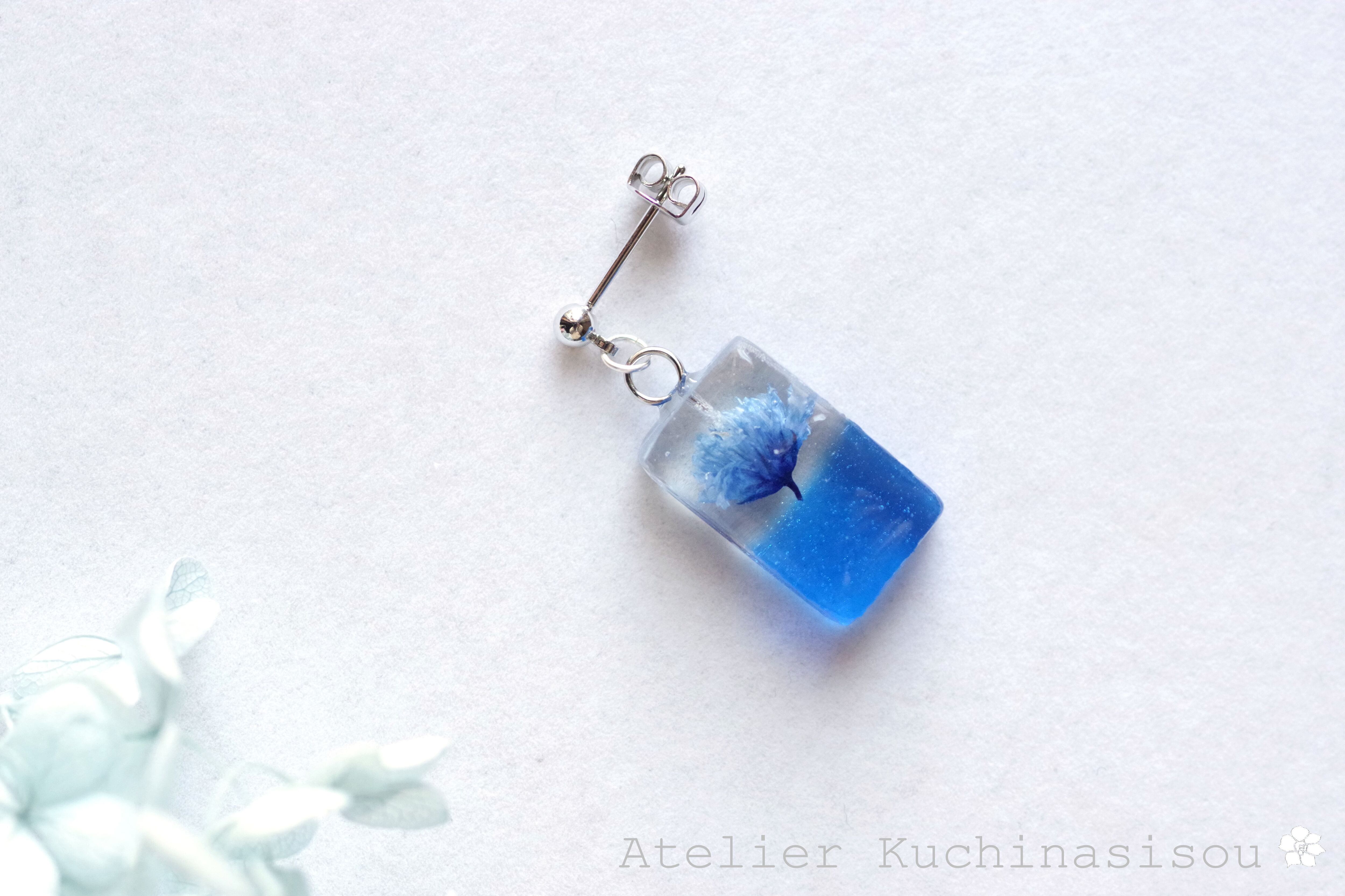 レジンアート 長方形のピアス〈一輪の花・ブルー〉