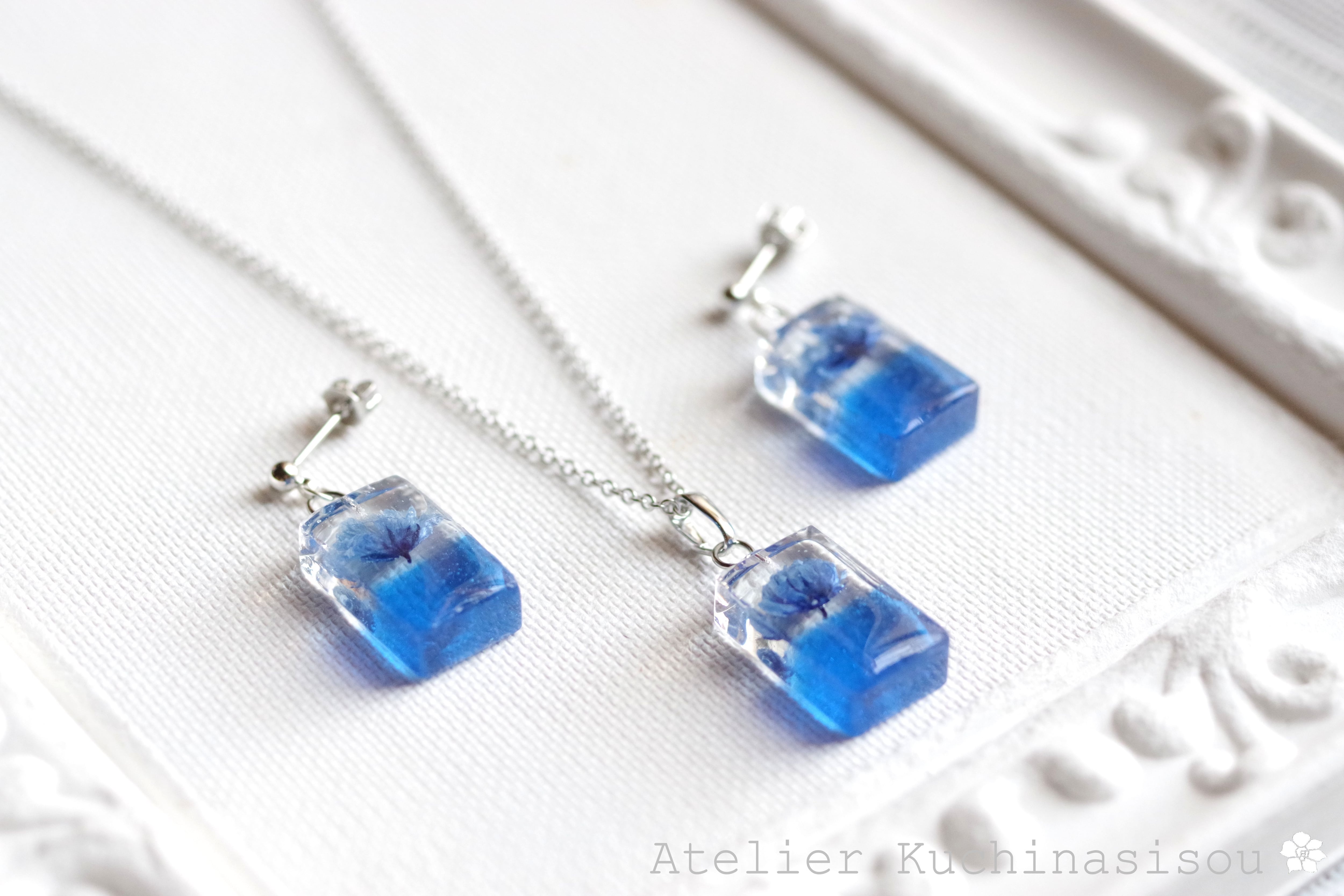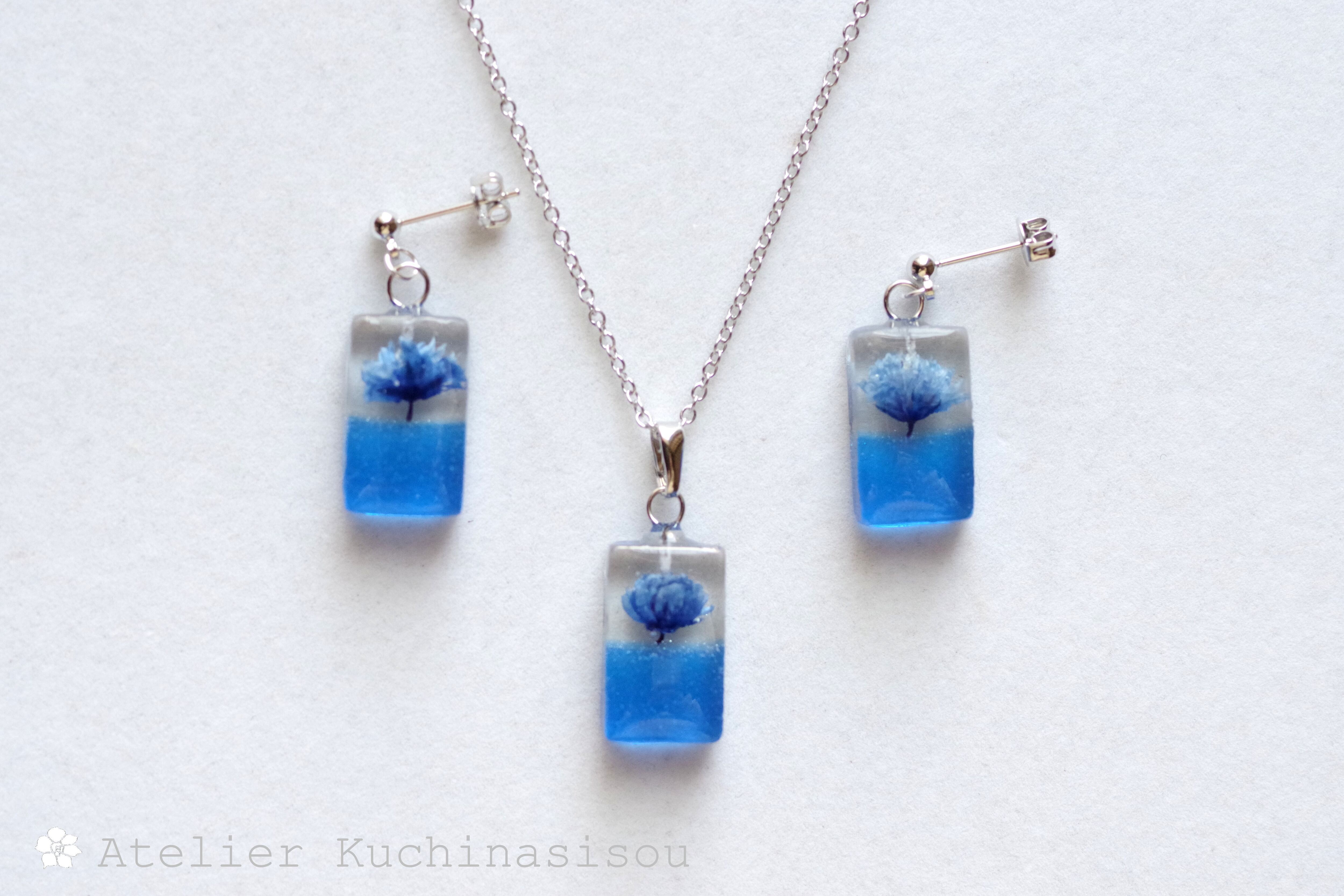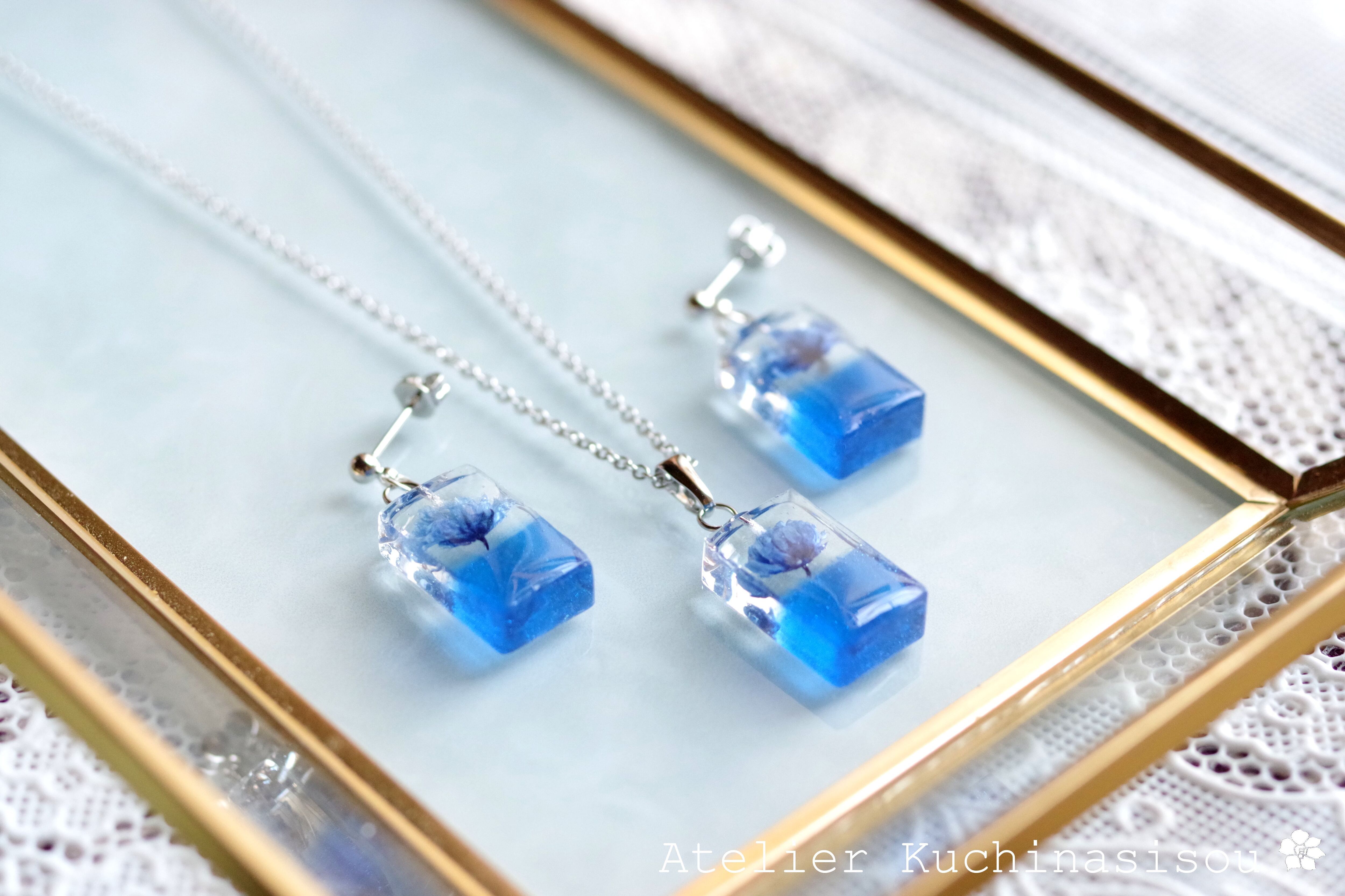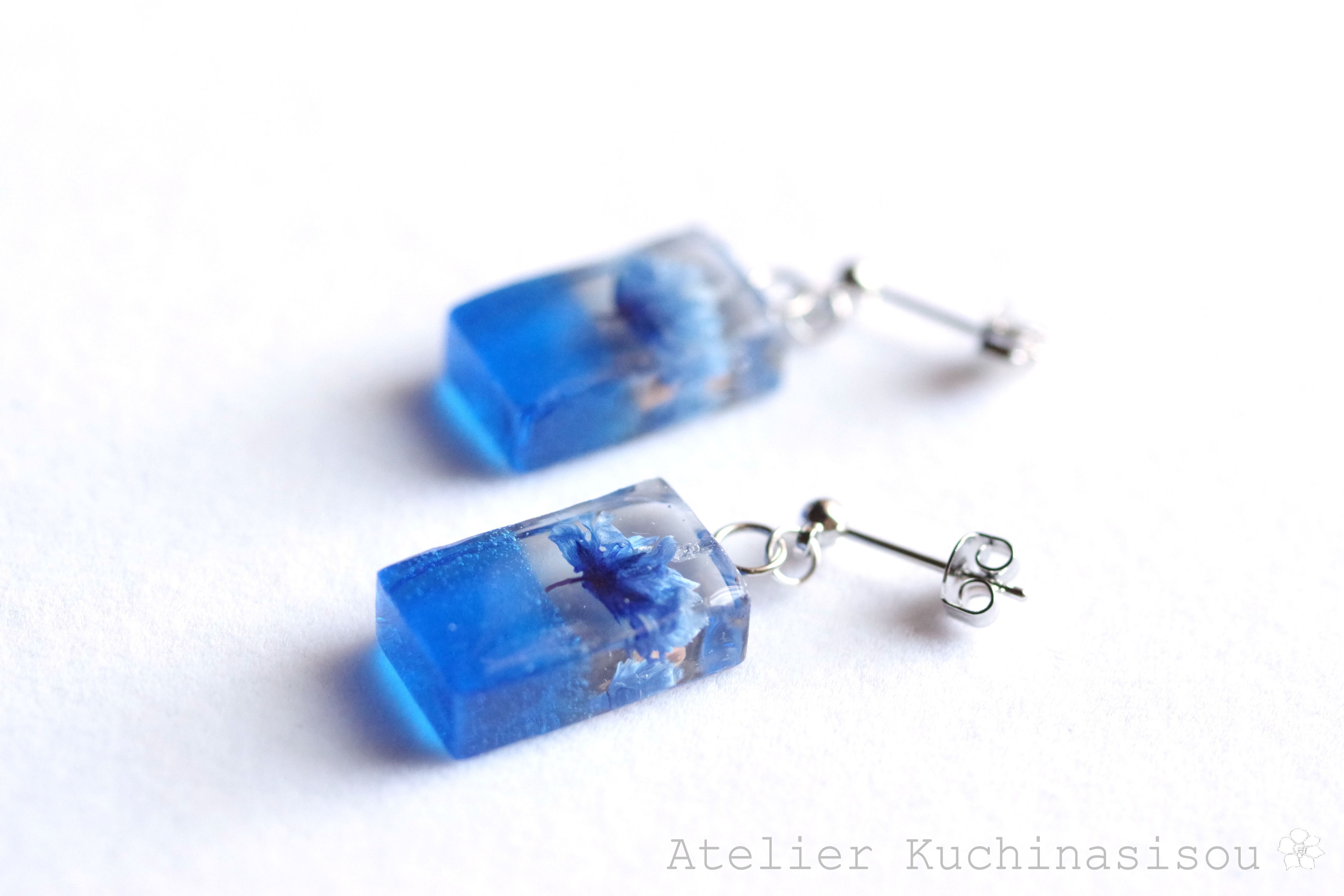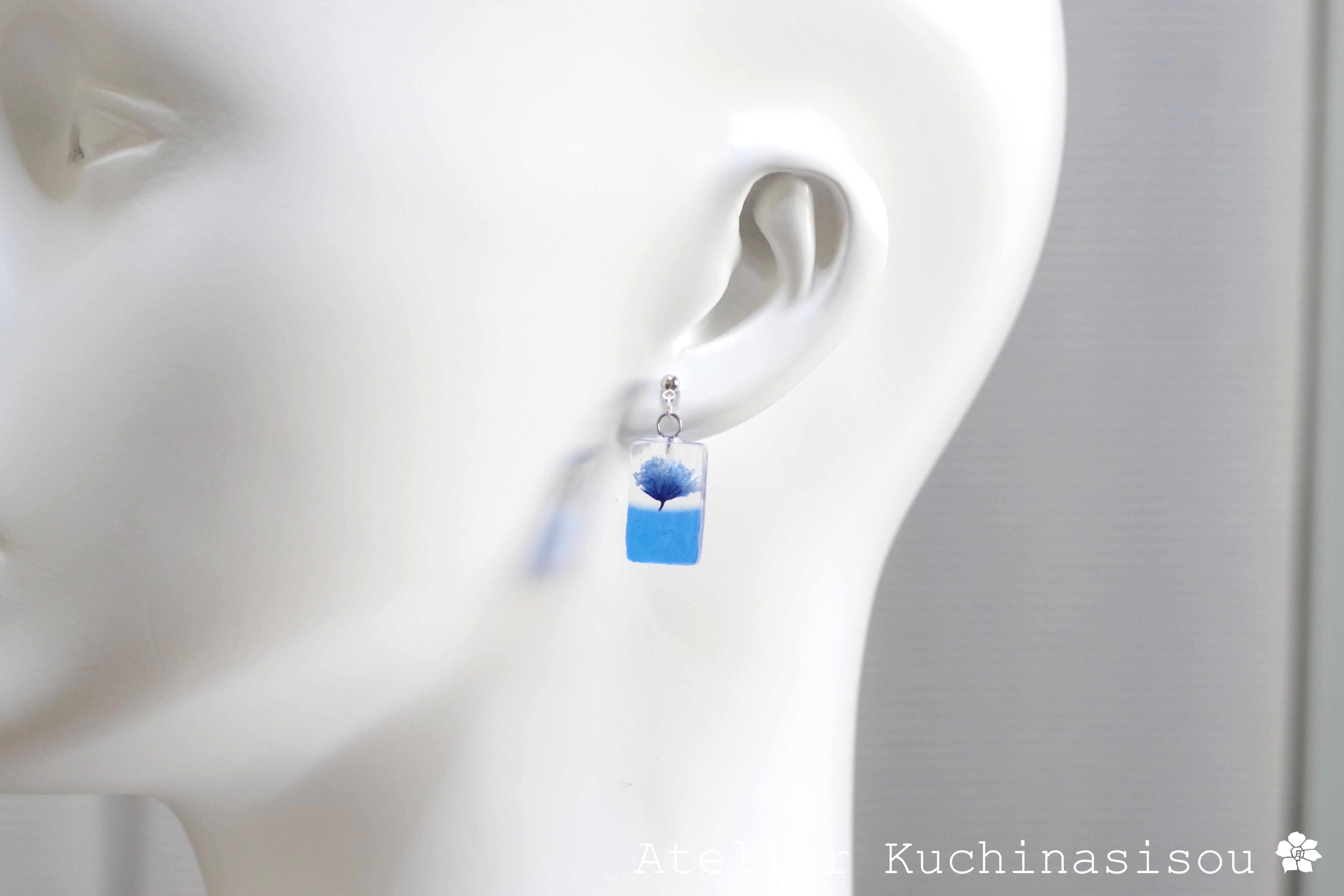 レジンアート 長方形のピアス〈一輪の花・ブルー〉