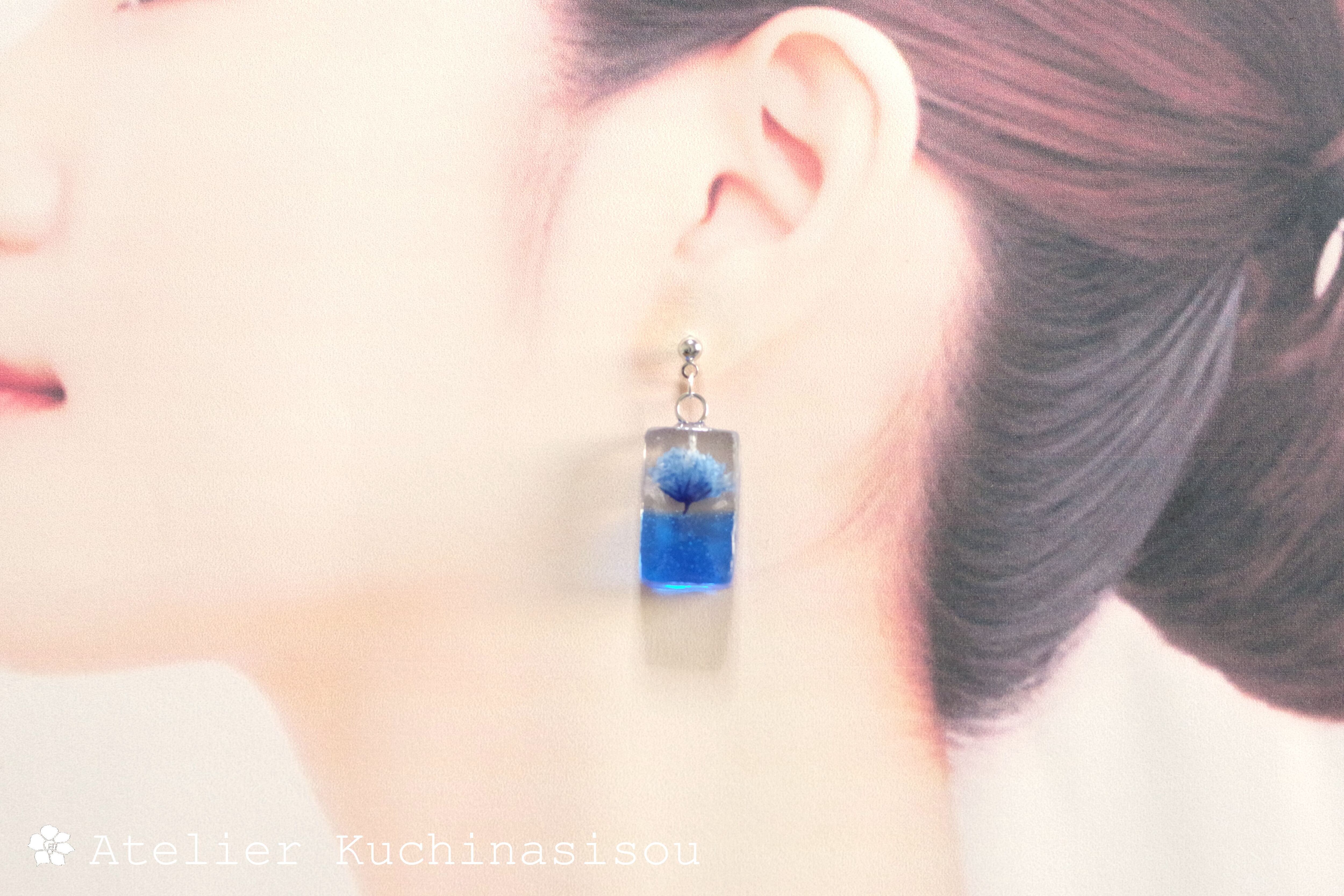 青色の海から青色の花が咲いているような、シンプルながらも可憐さのあるピアス。
