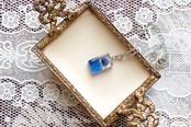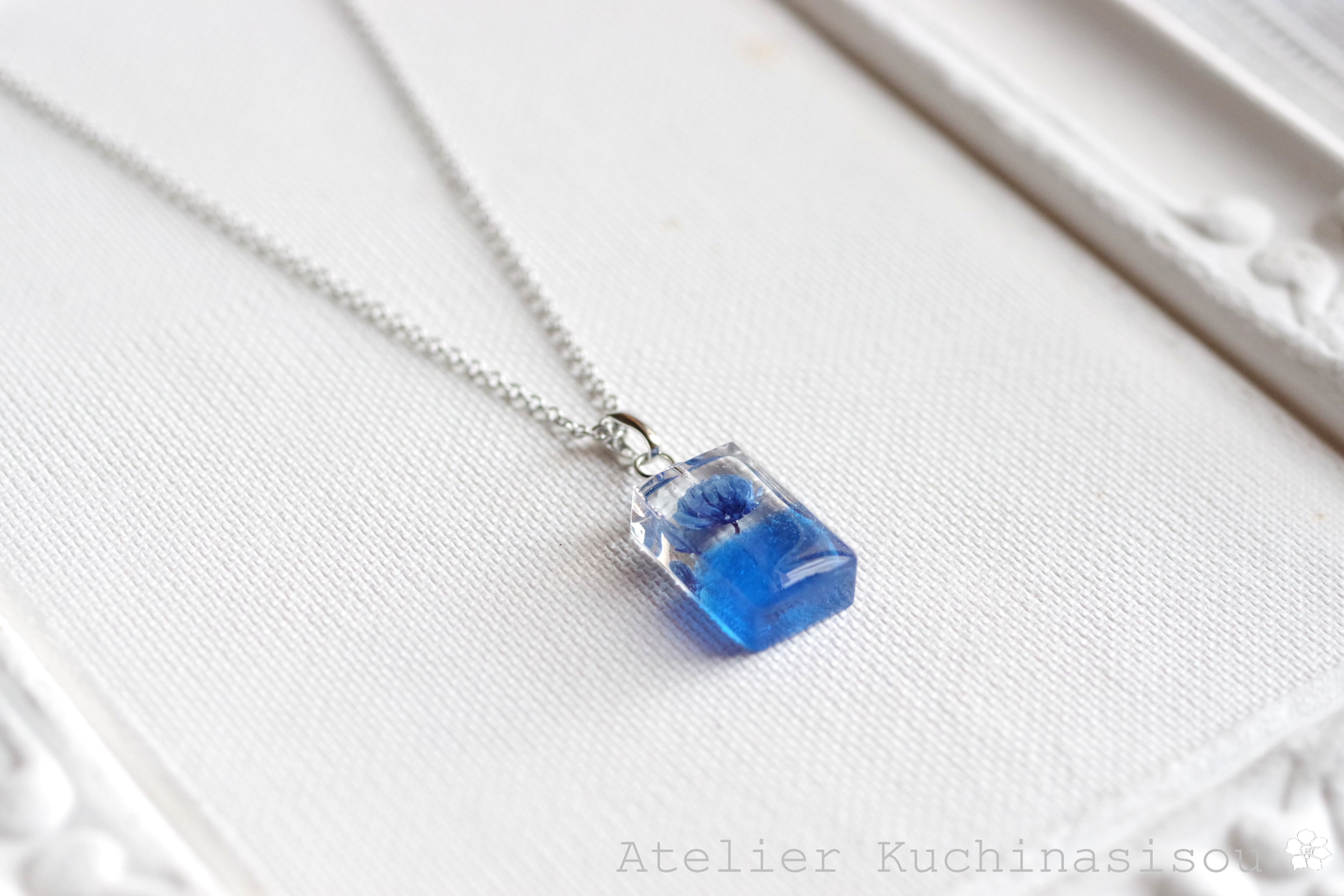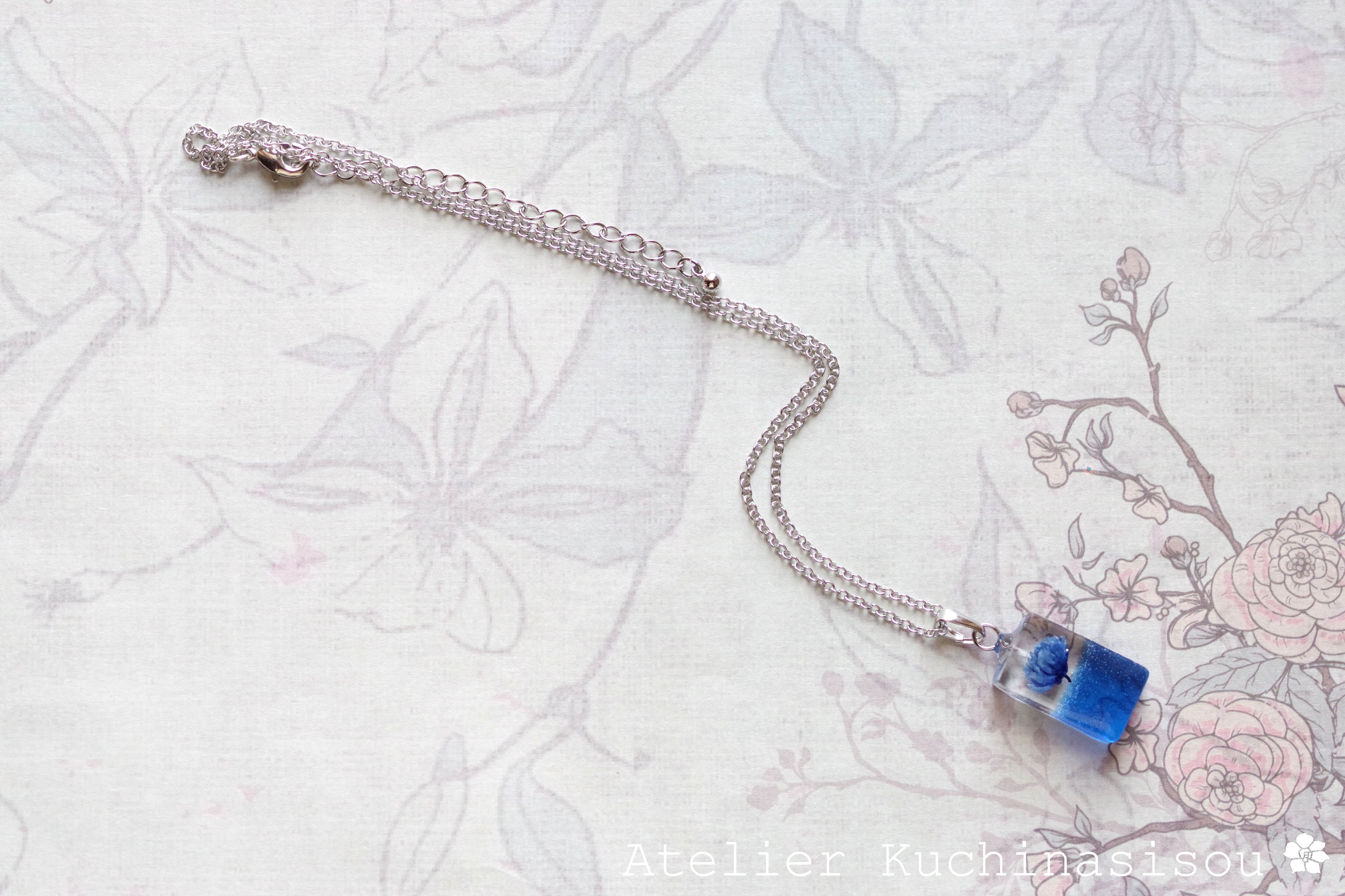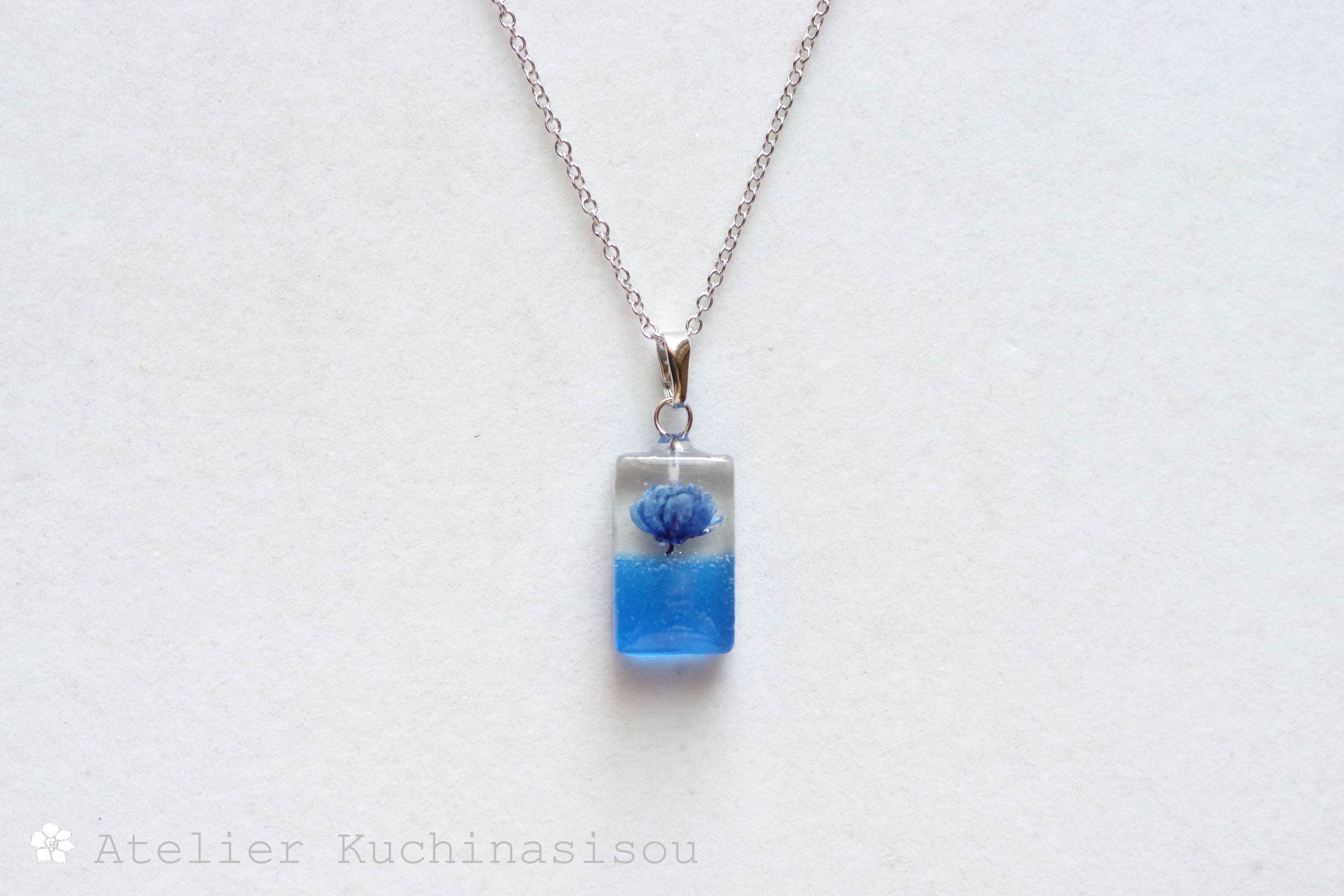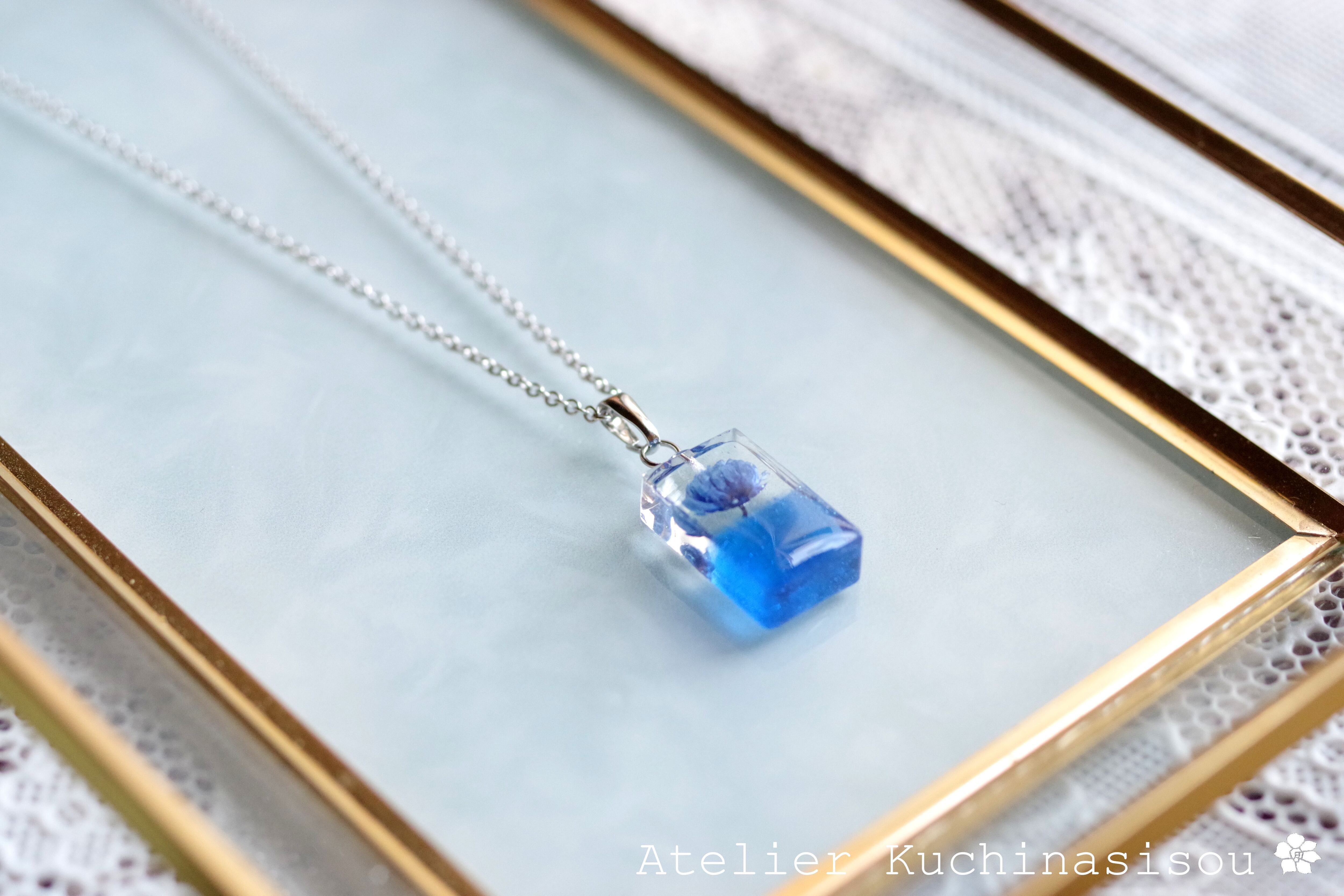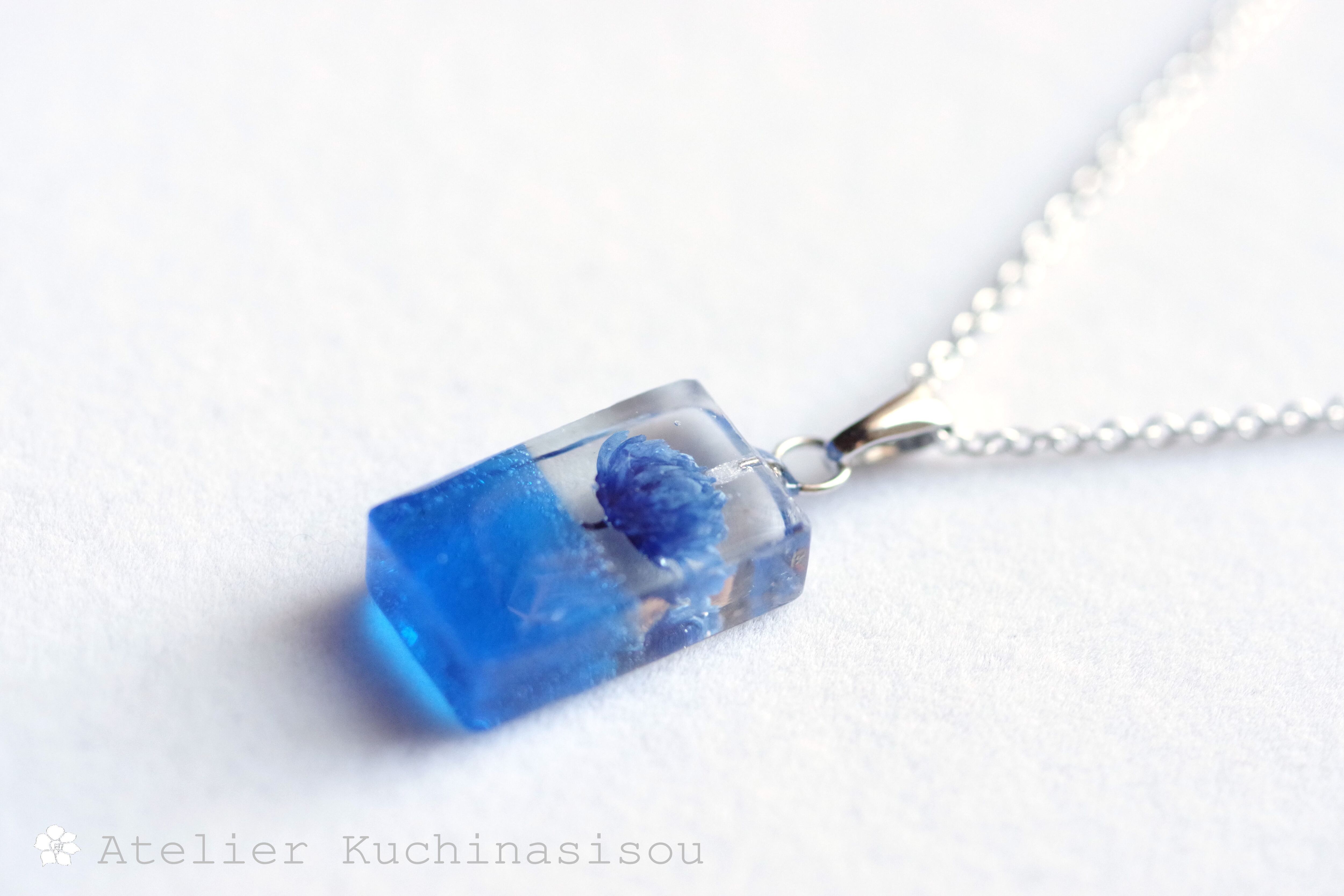 レジンアート 長方形のペンダント〈一輪の花・ブルー〉