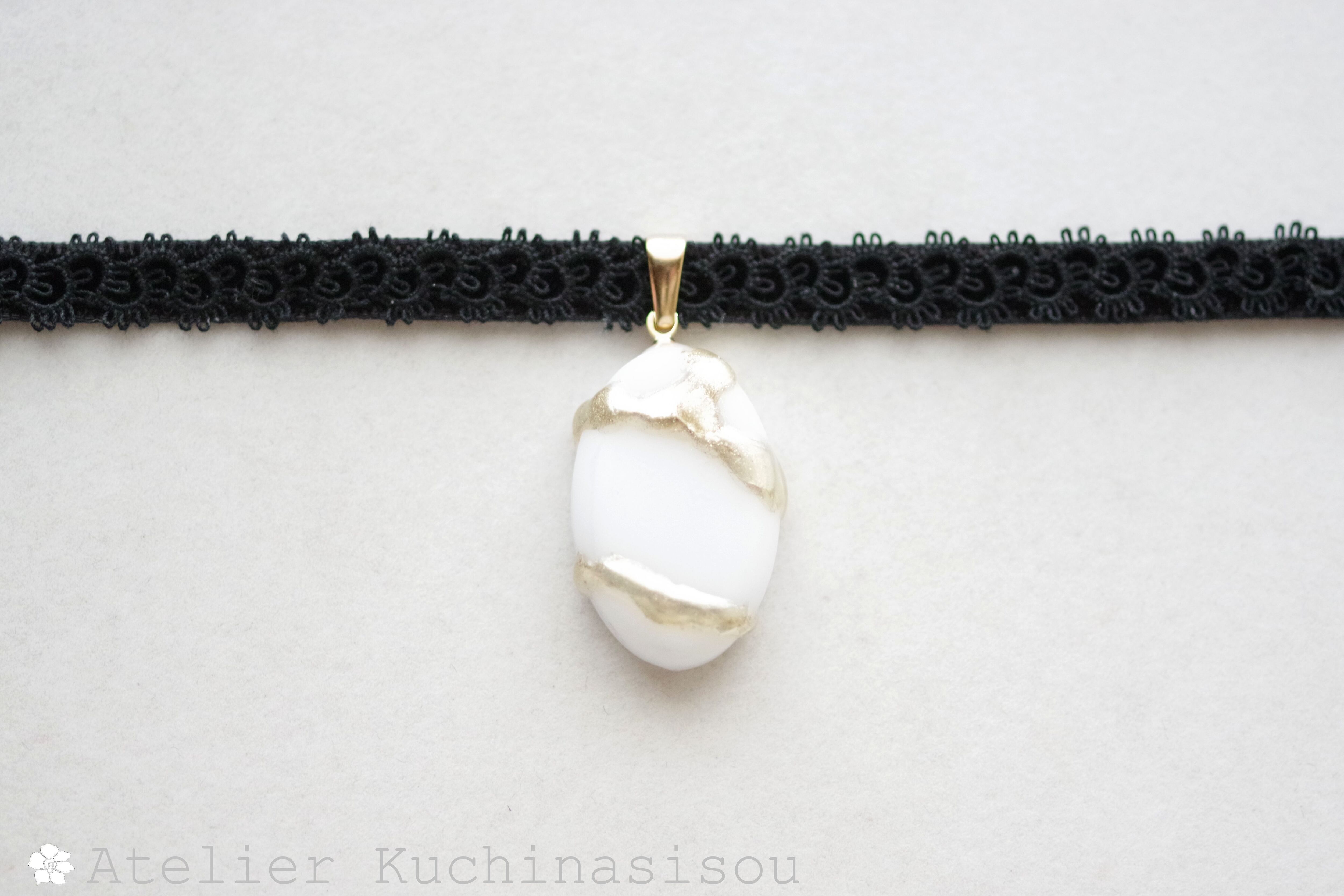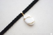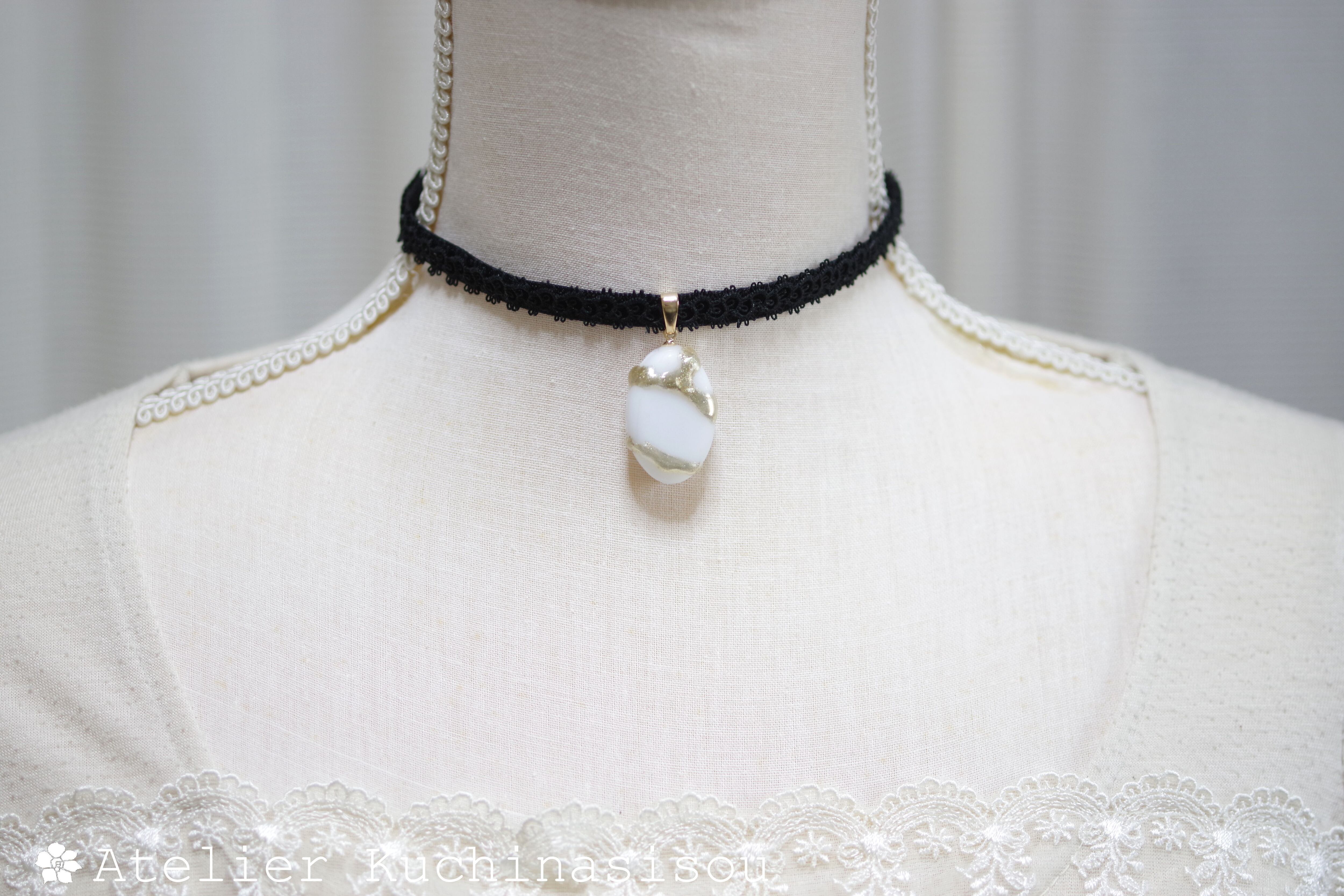 アールヌーヴォー風の曲線を描く楕円のレジンを、ベルベットリボンにタティングレースで装飾を施したチョーカーに仕上げました。