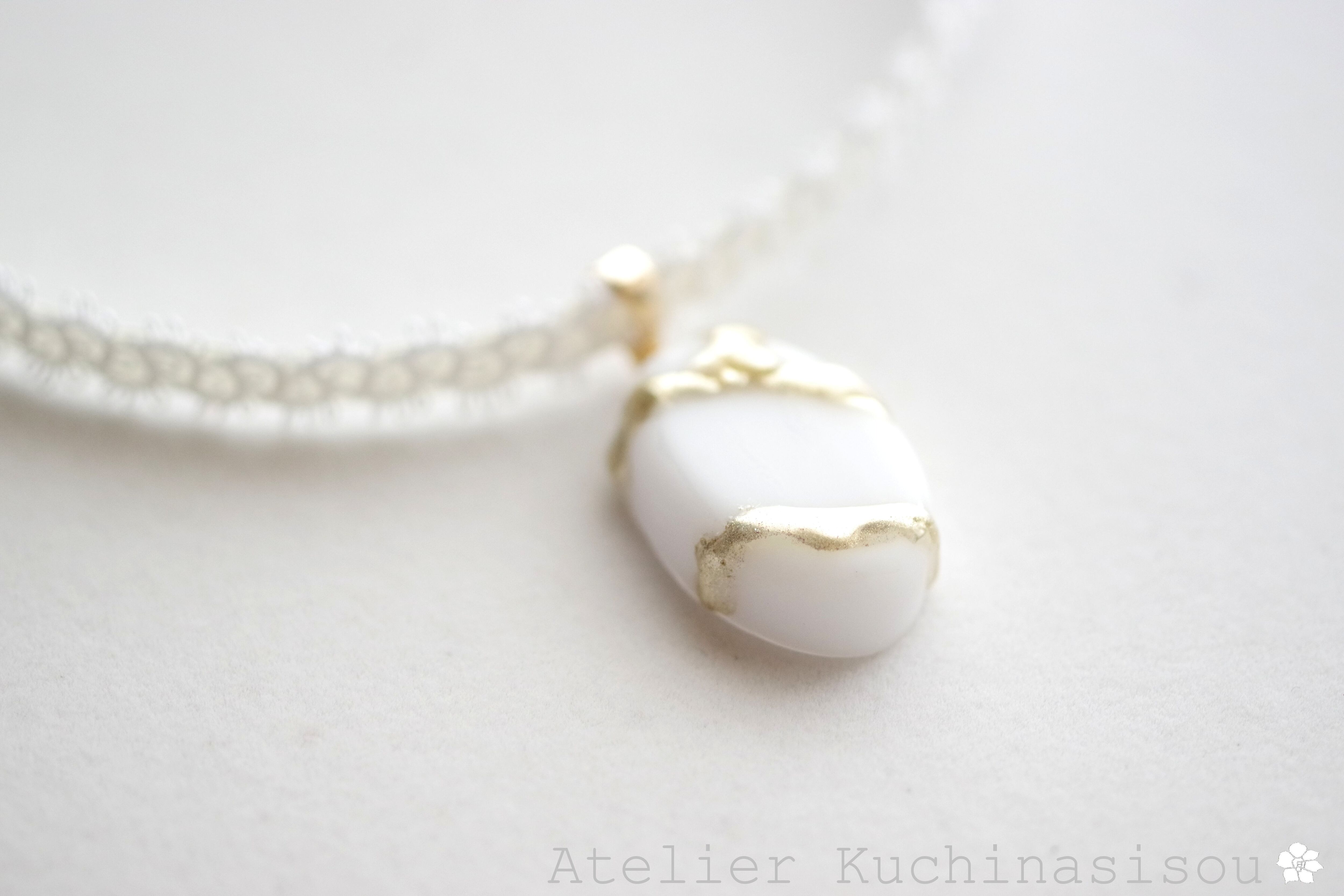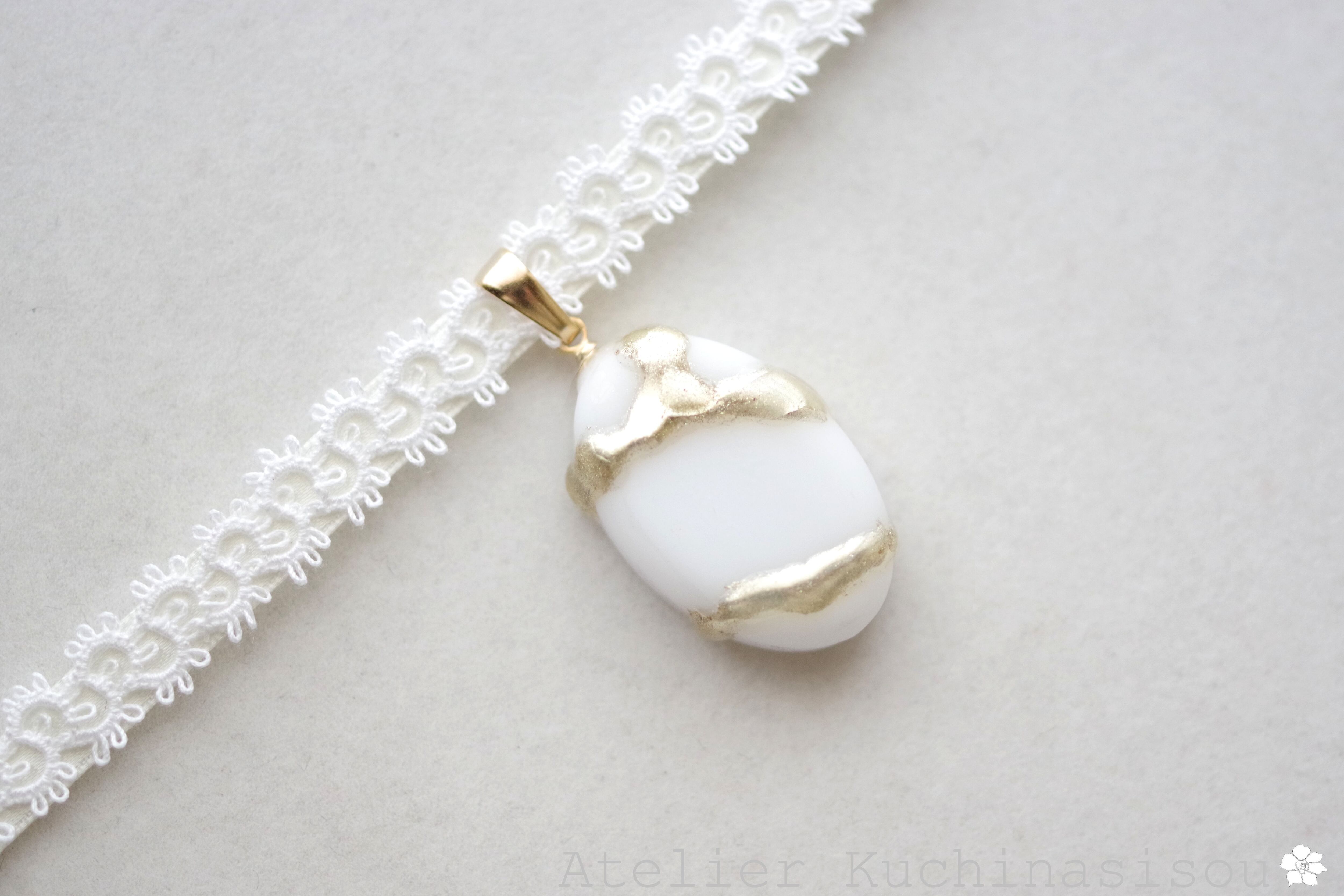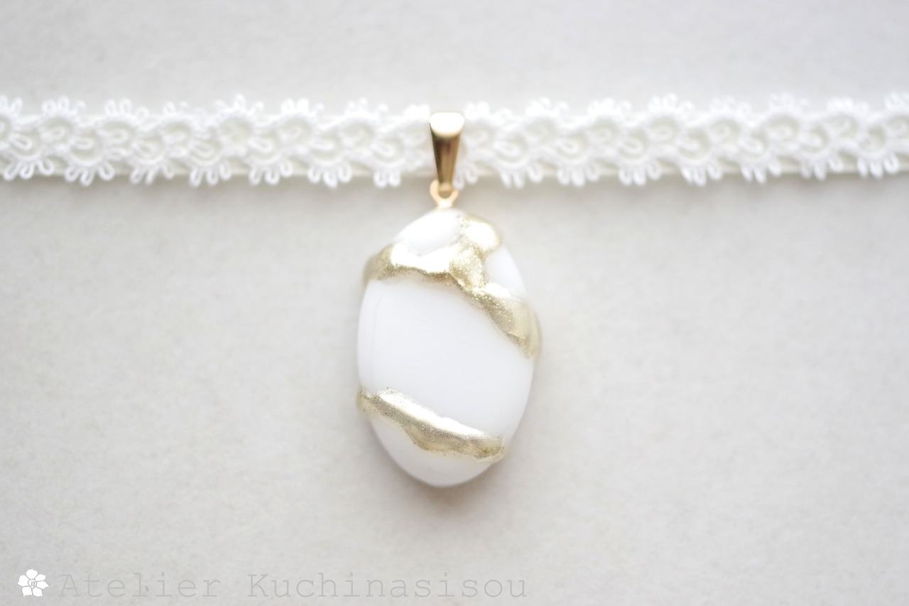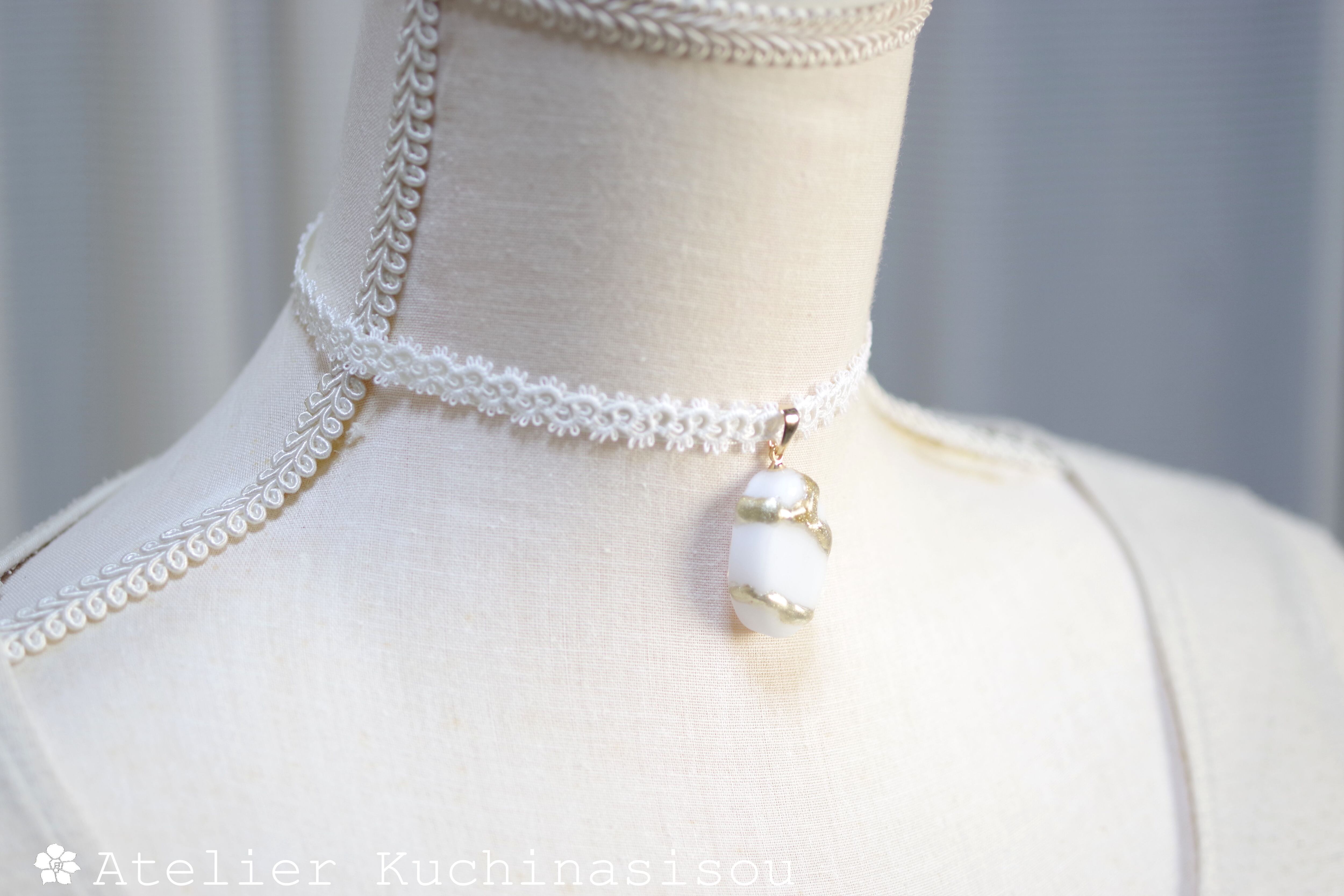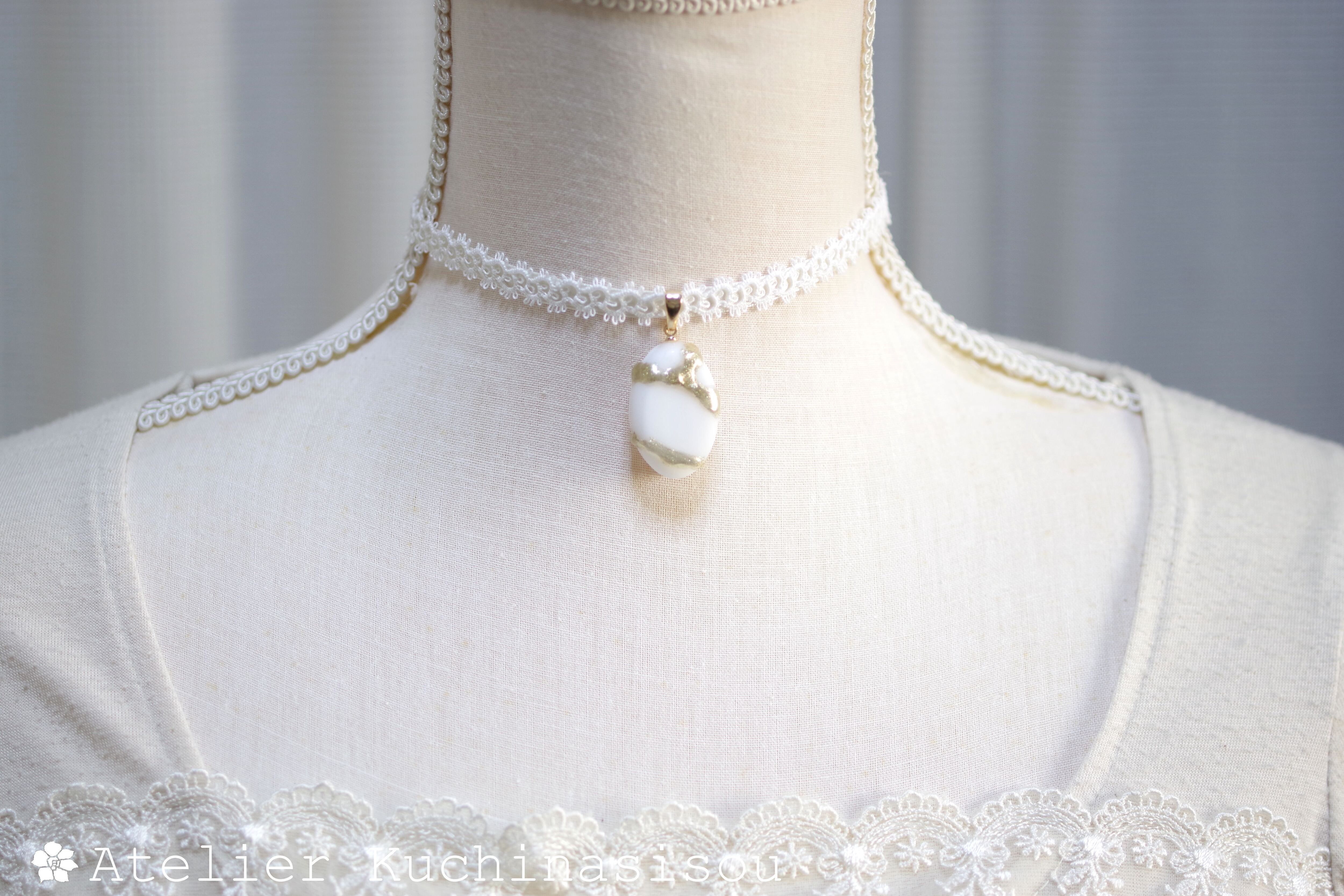アールヌーヴォー風の曲線を描く楕円のレジンを、サテンリボンにタティングレースで装飾を施したチョーカーに仕上げました。