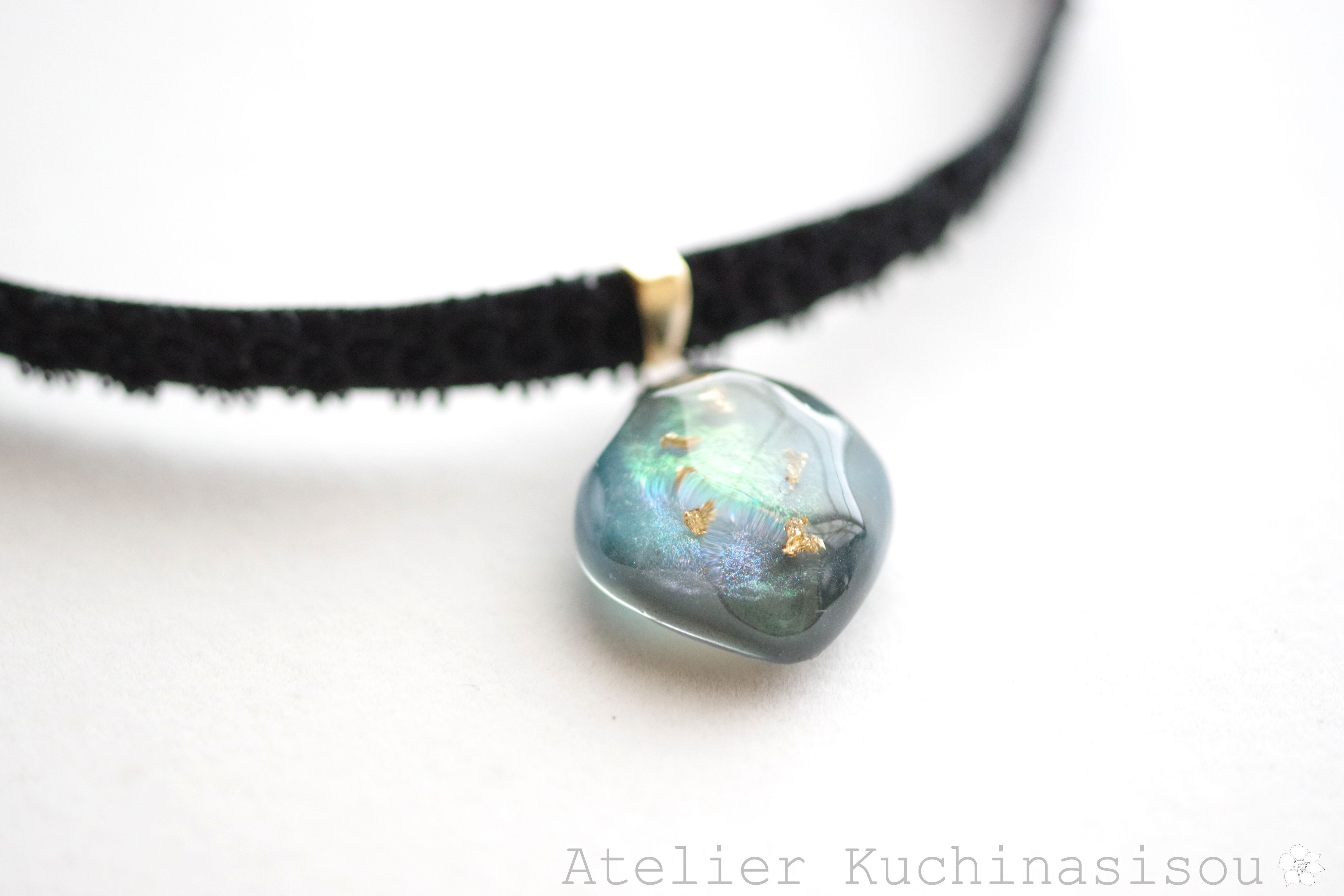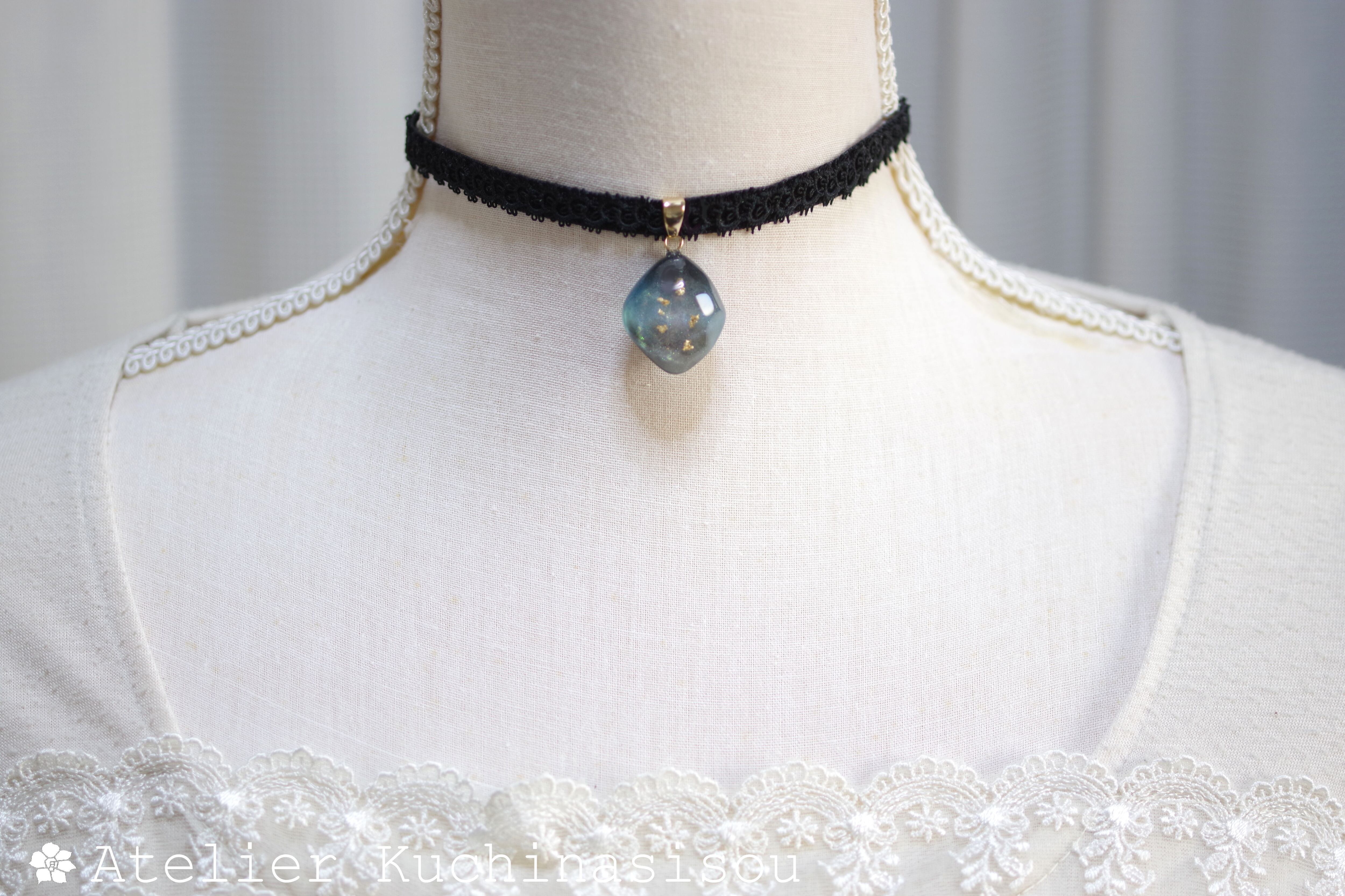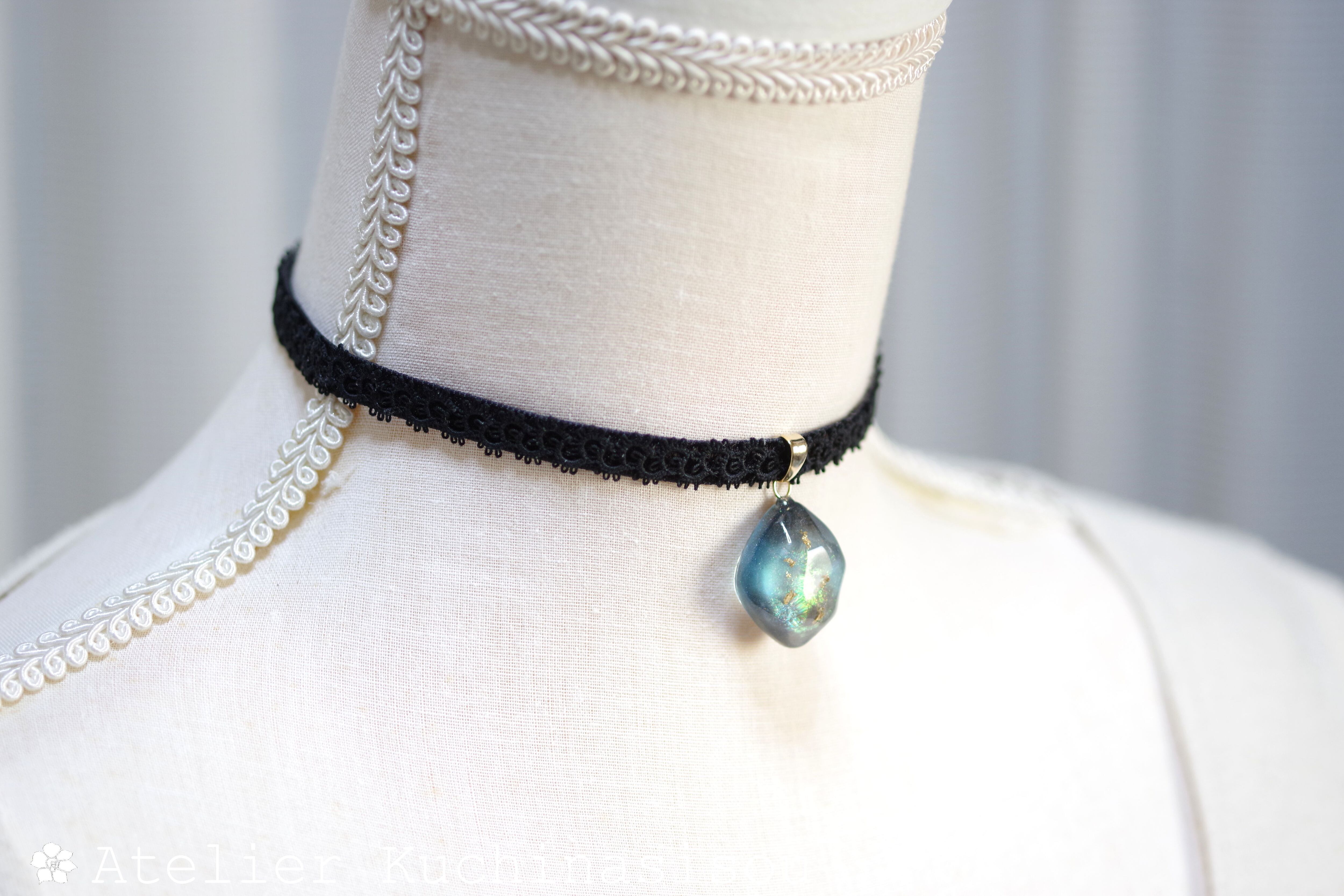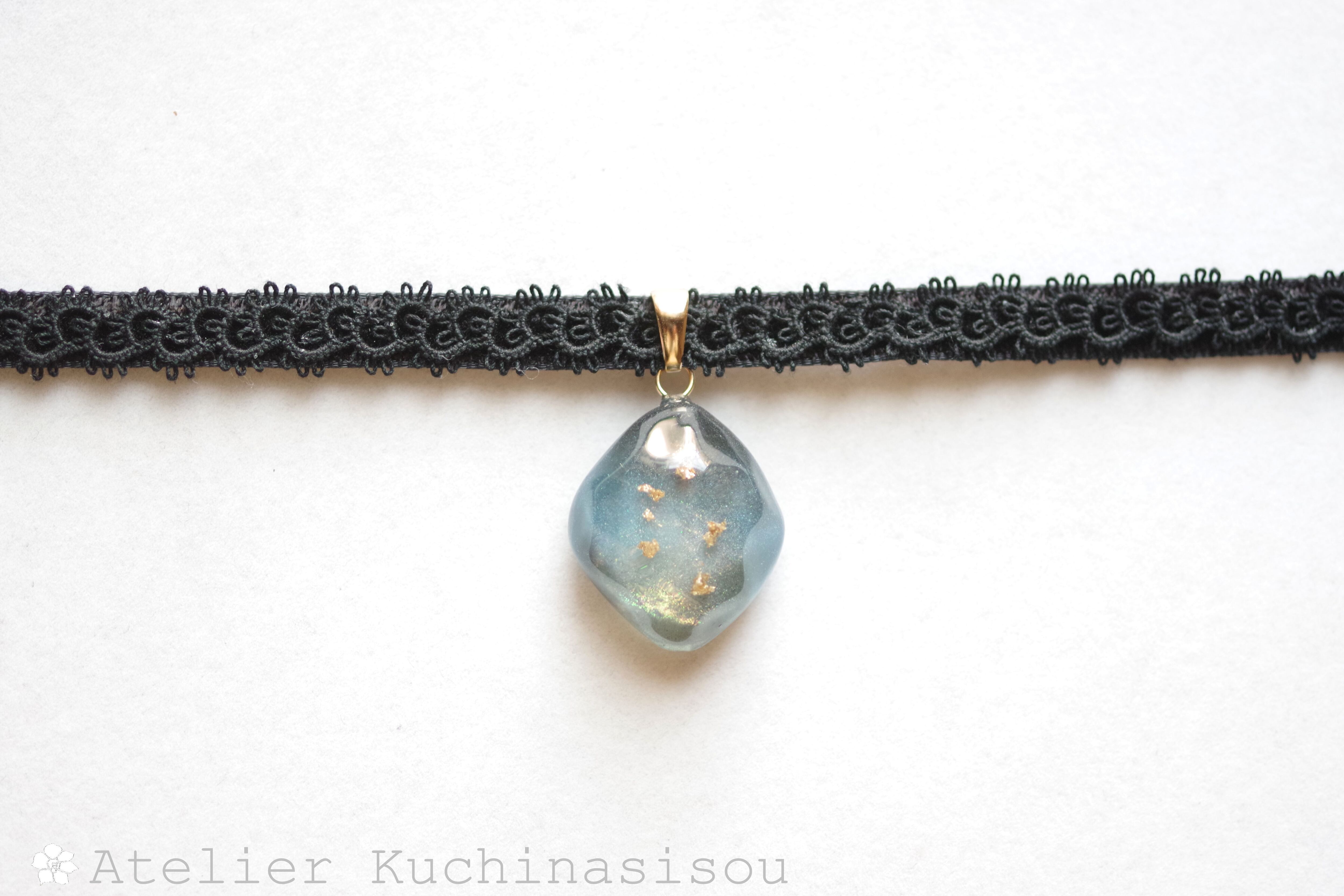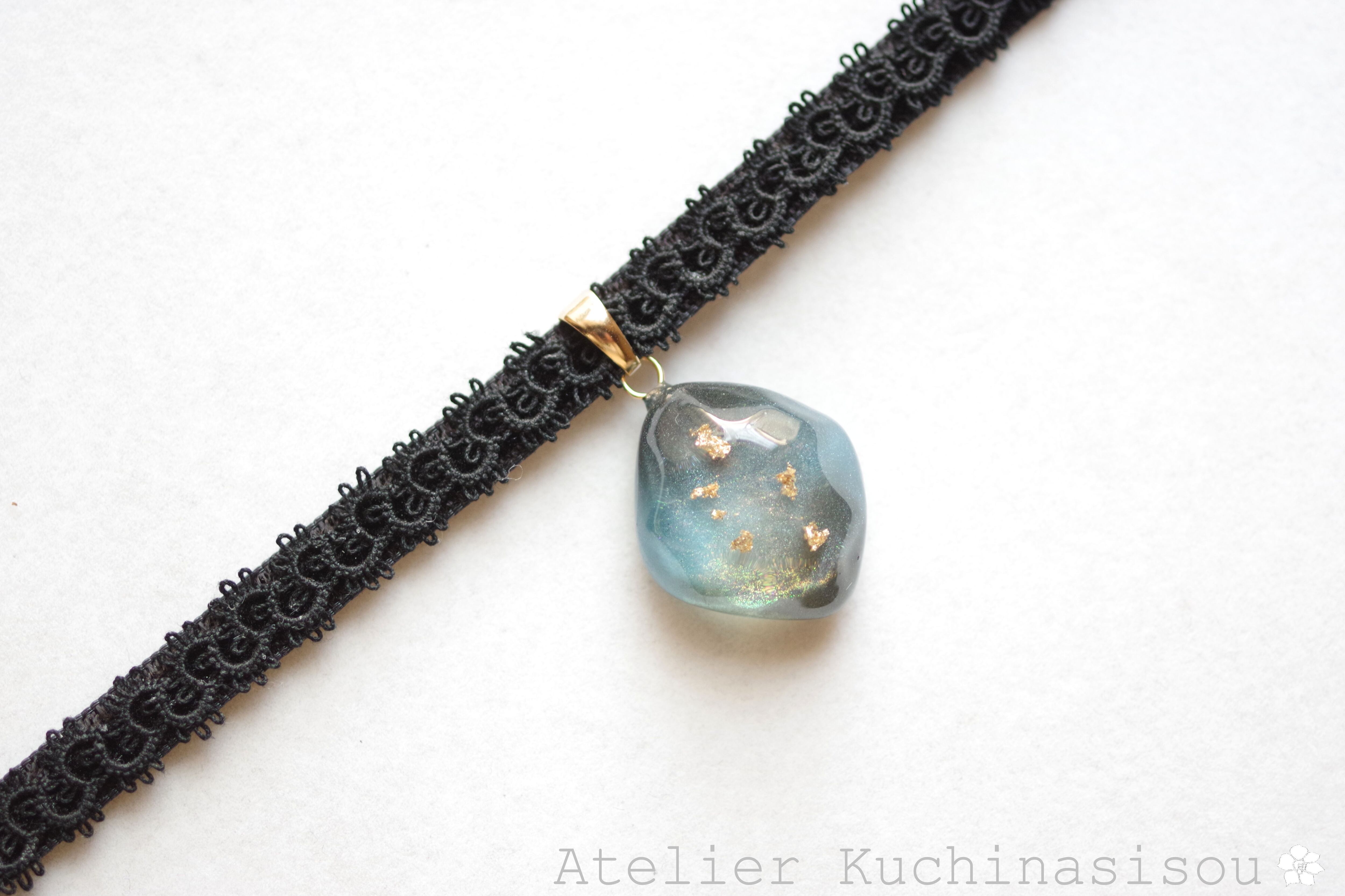 黒と青と散りばめた金箔、そして角度を変えるたび煌めくオレンジ色の光沢が美しいレジンを、ベルベットリボンにタティングレースで装飾を施したチョーカーに仕上げました。