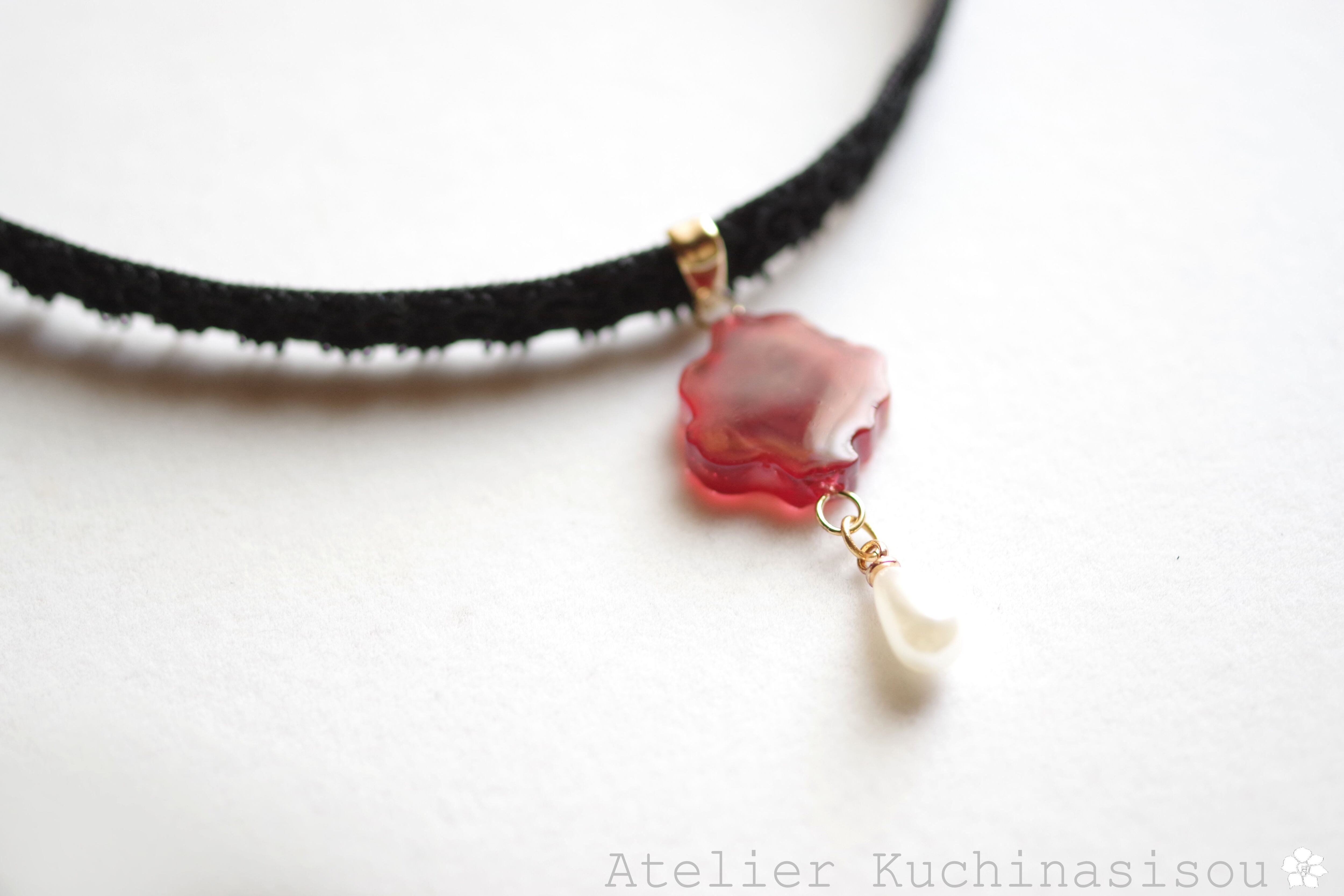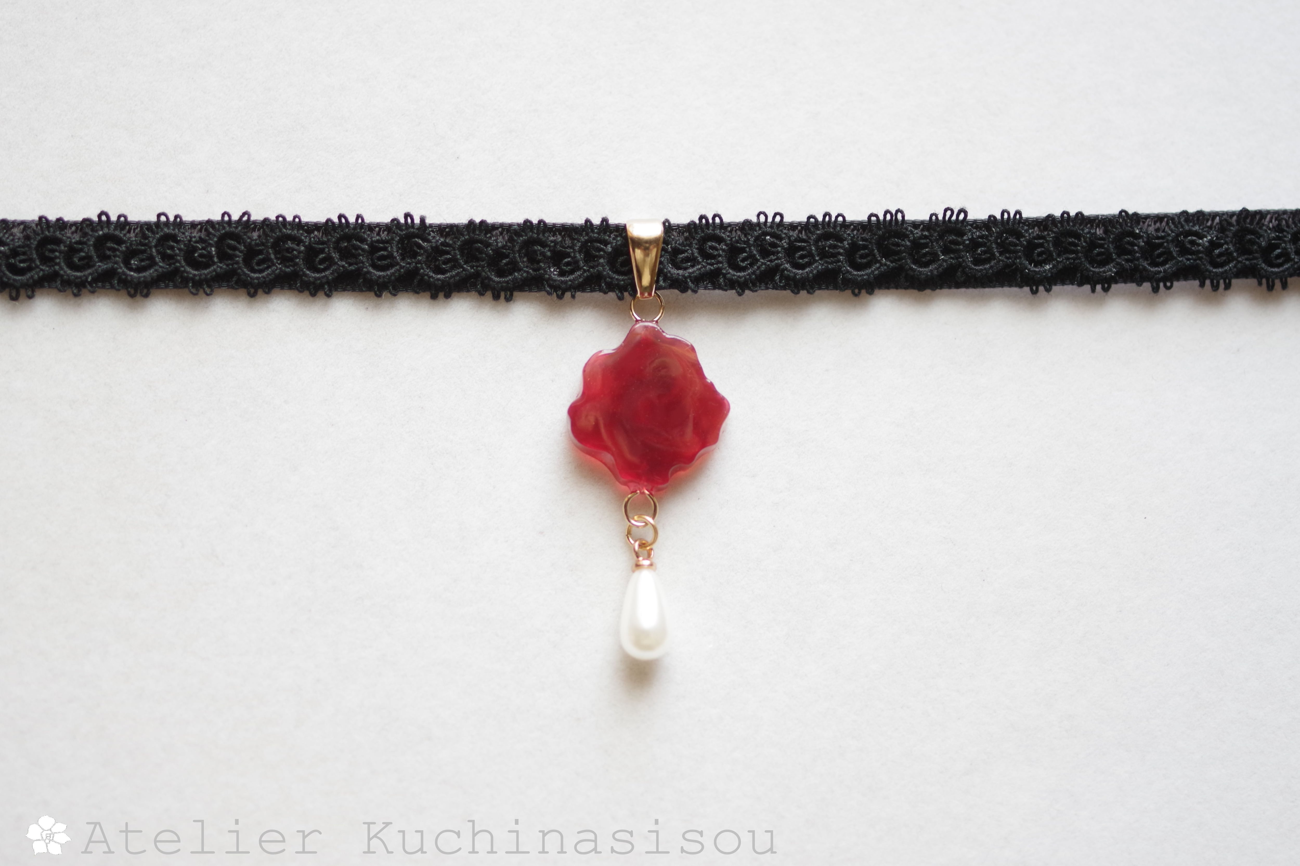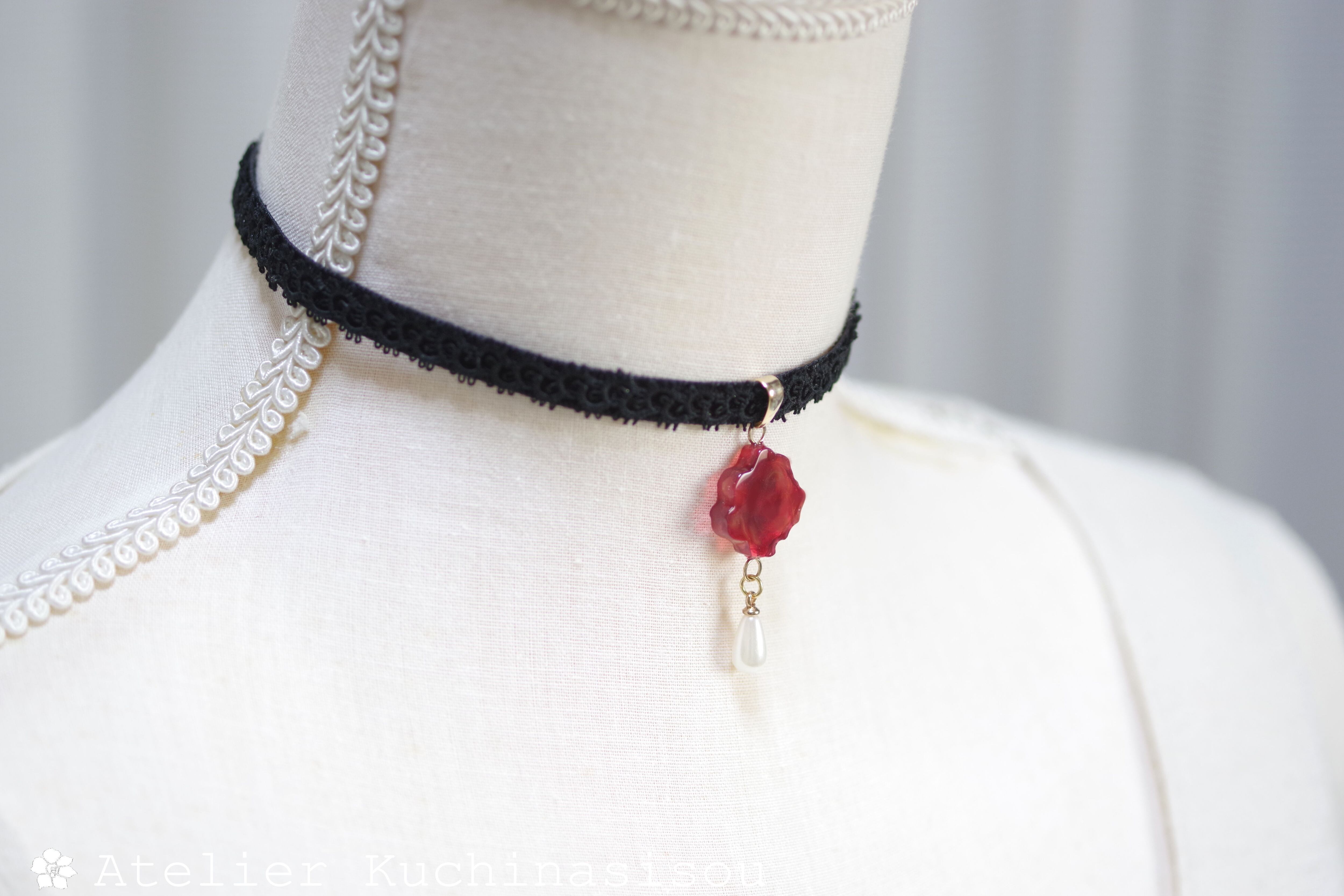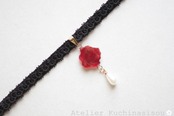 数種類の赤をマーブルしたべっこうのような複雑な模様が美しい凹凸プレートのレジンを、ベルベットリボンにタティングレースで装飾を施したチョーカーに仕上げました。