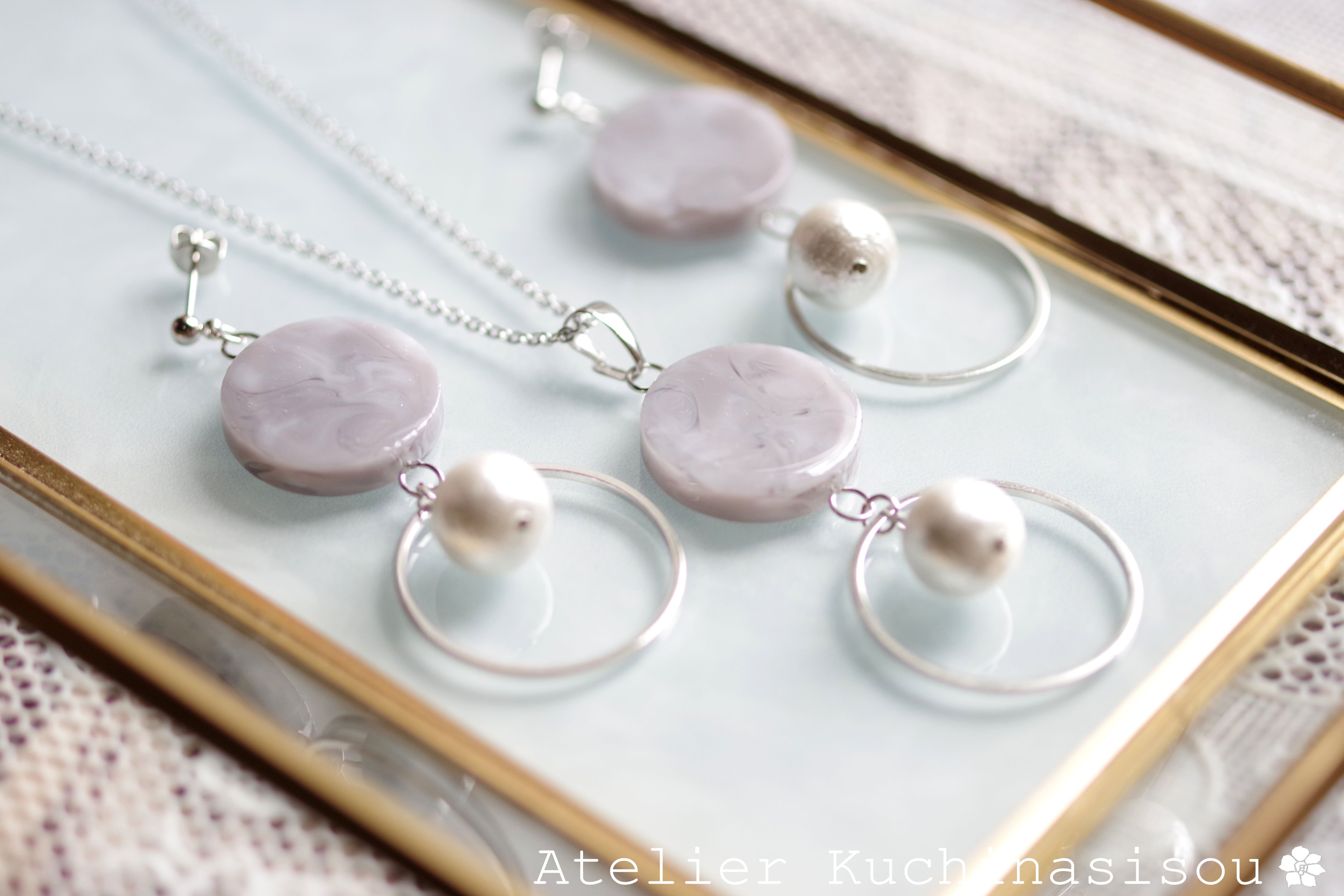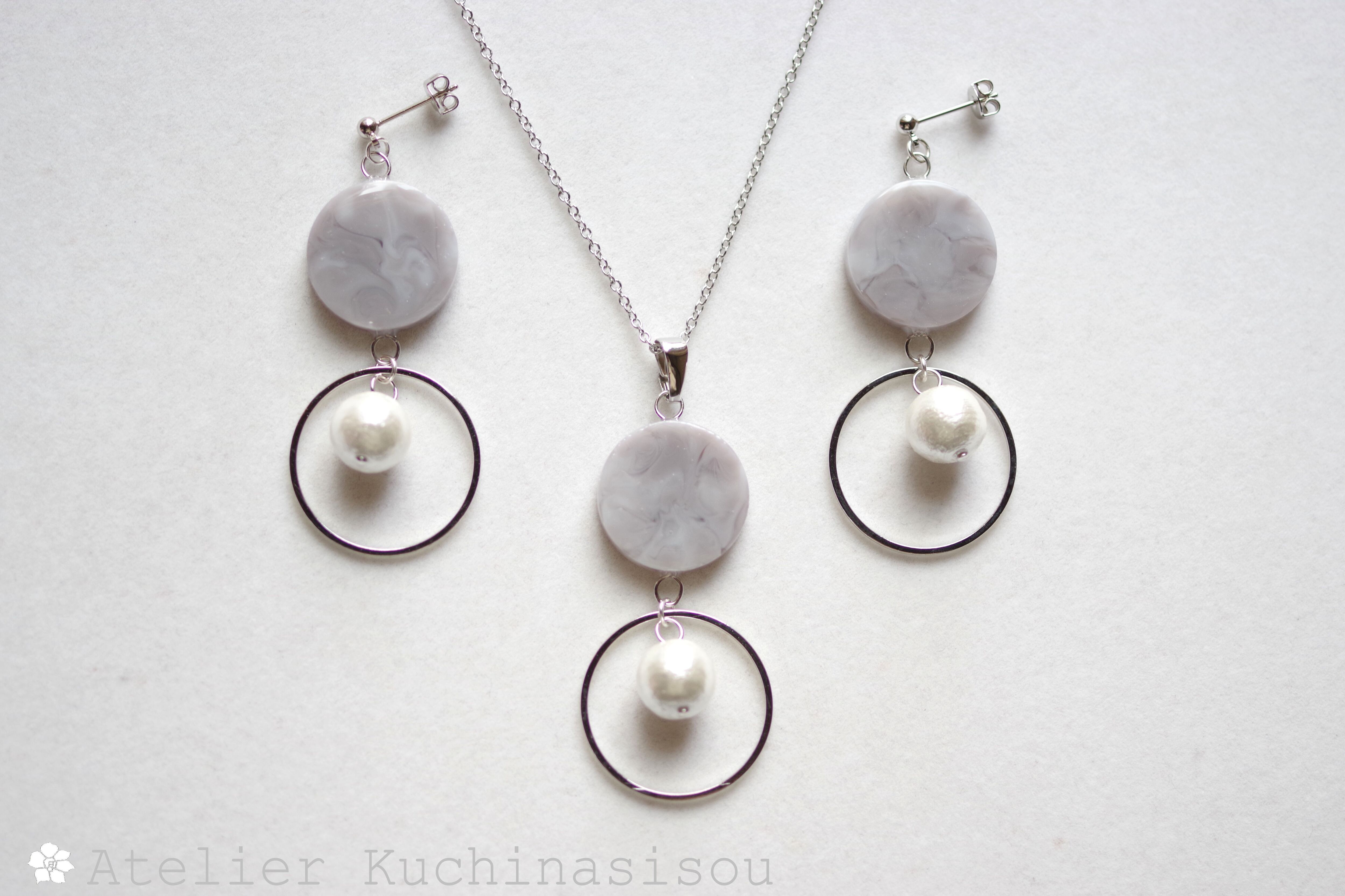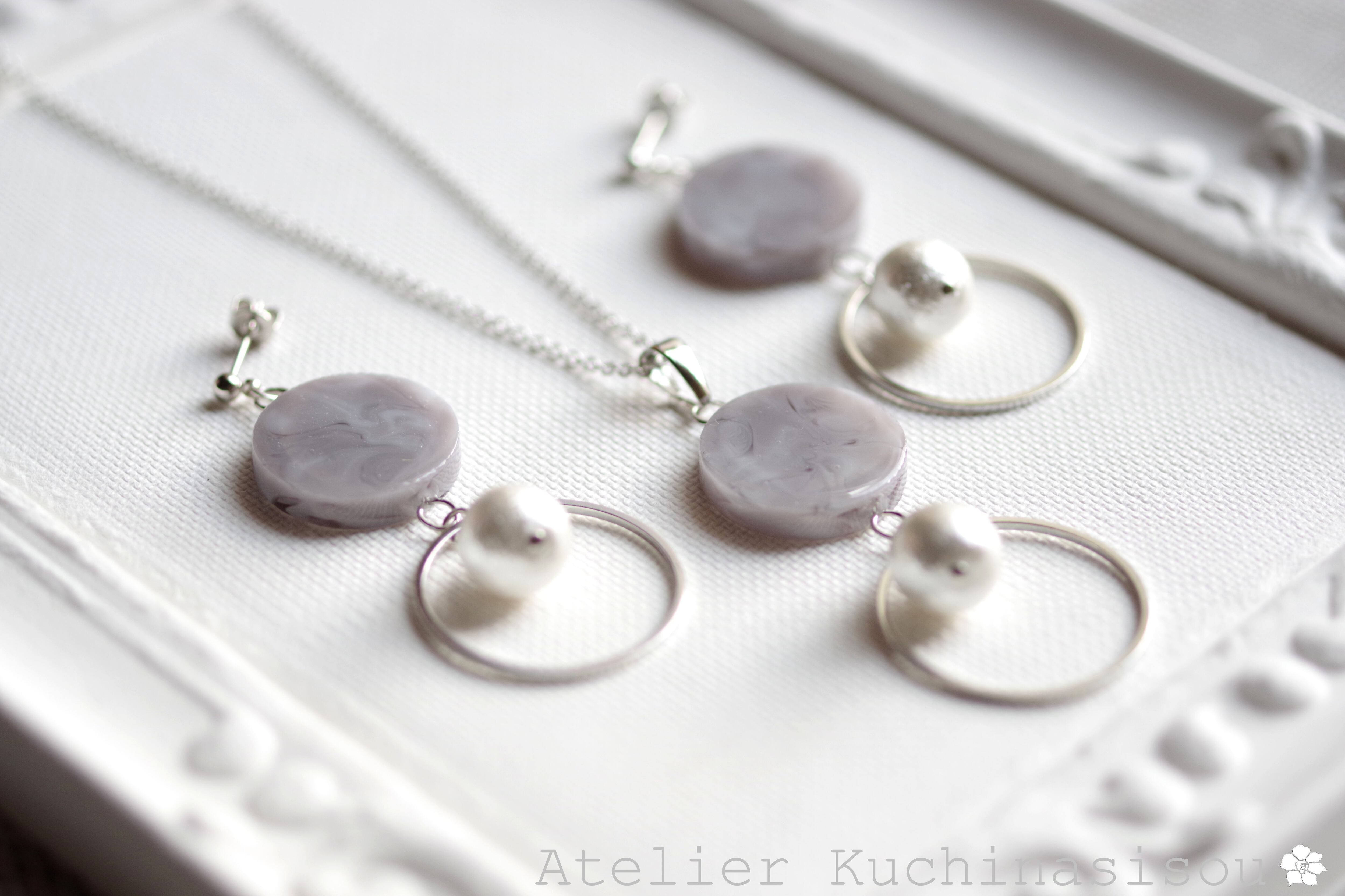 レジンのグレーのマーブル模様が美しく、コットンパールとリングが優雅さを添えています。