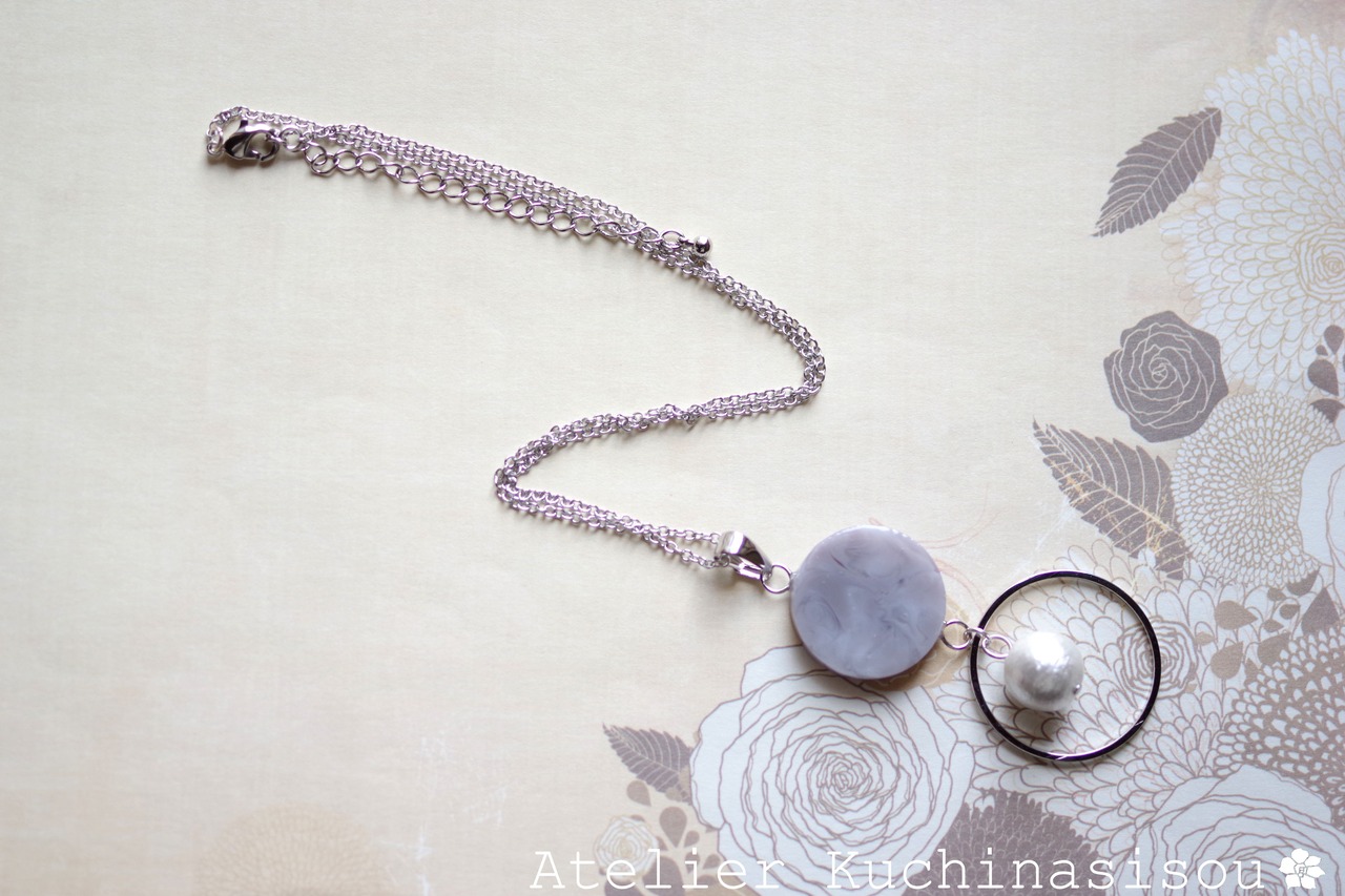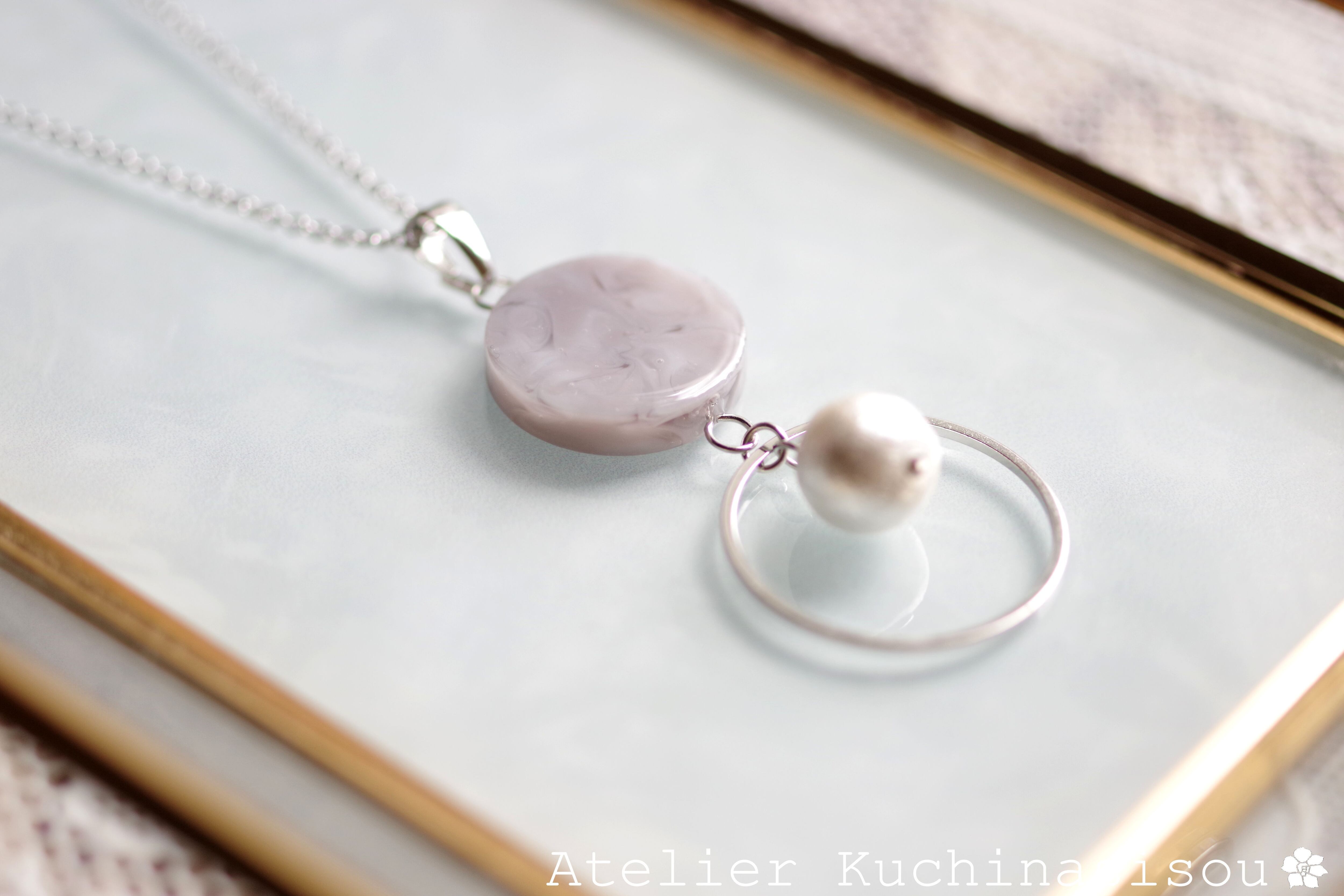 ラウンドモチーフのレジンにコットンパールとリングをあしらったペンダント。