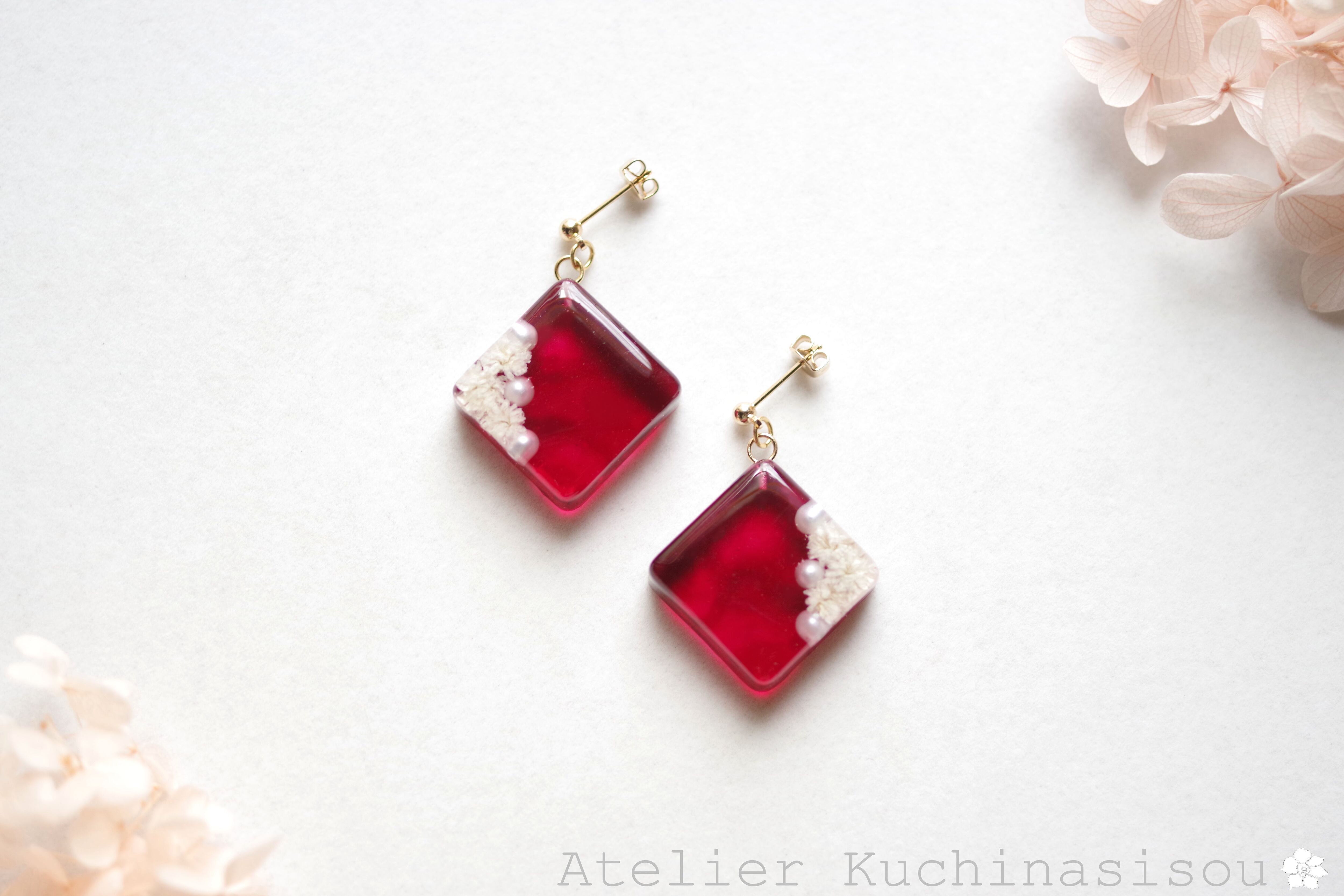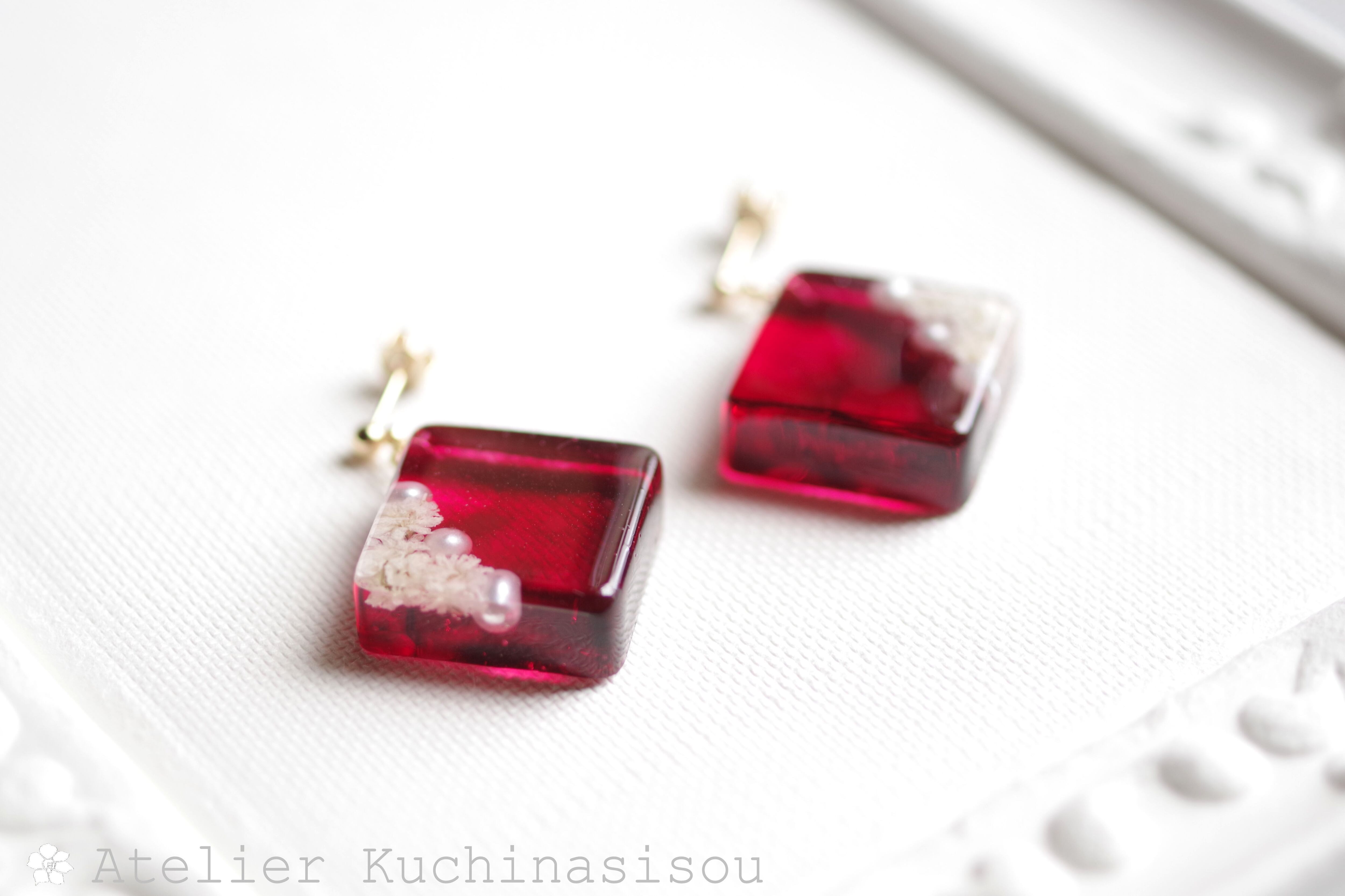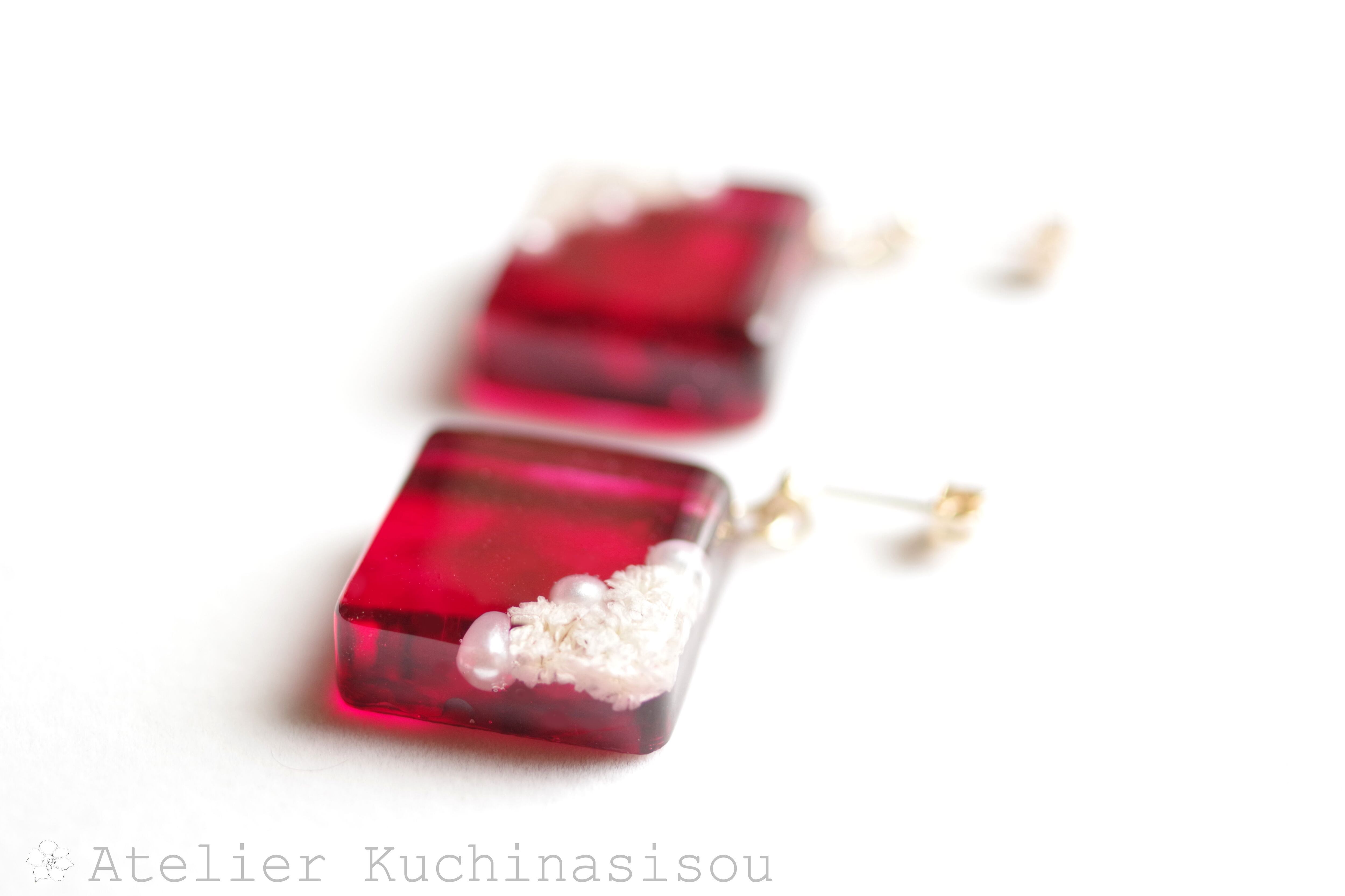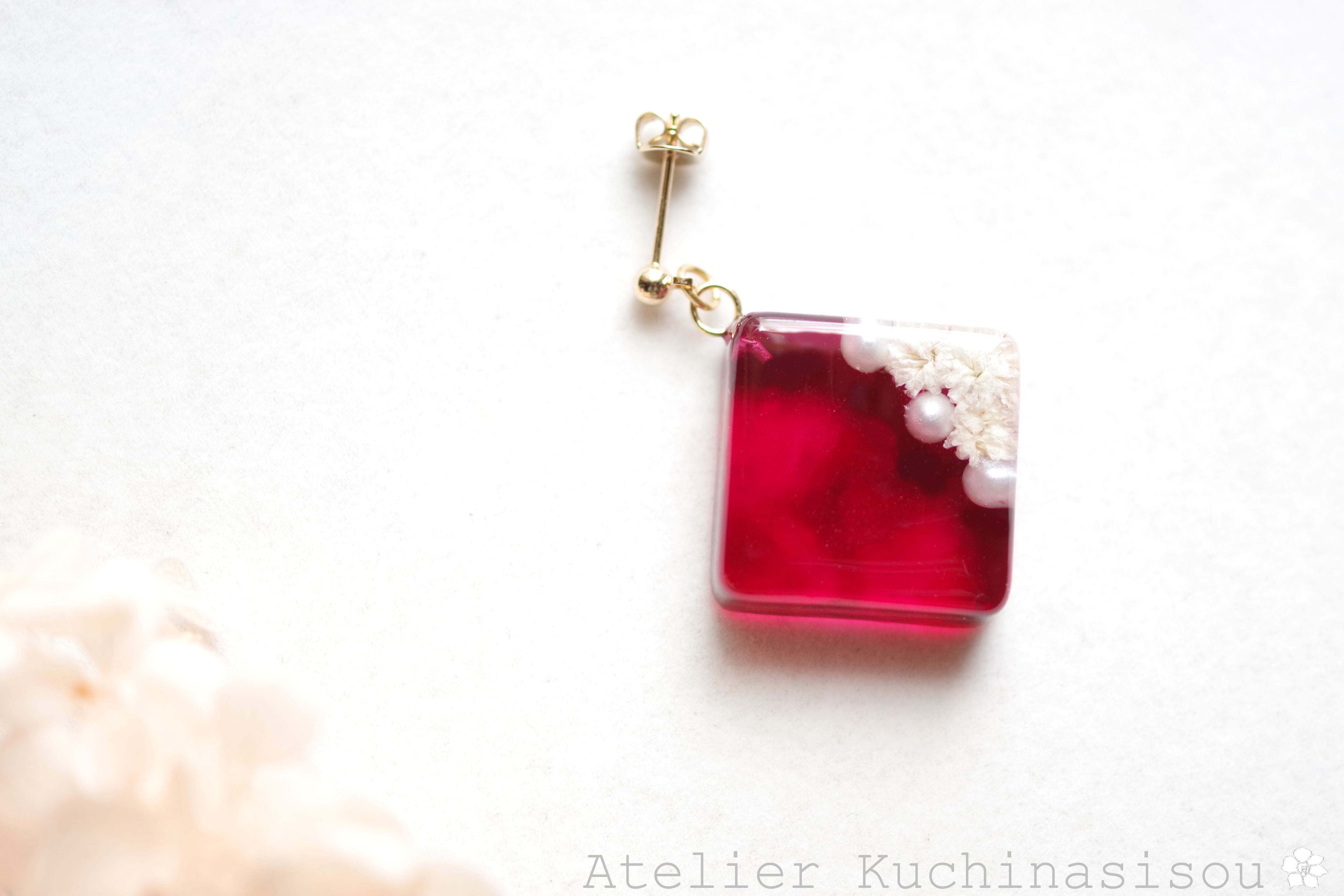パールとお花をスクエア型のレジンに封じ込め、ピンクで着色したピアス。