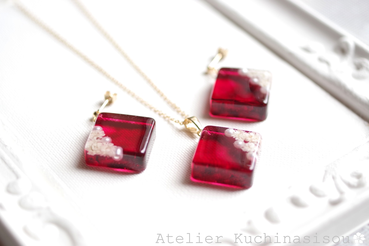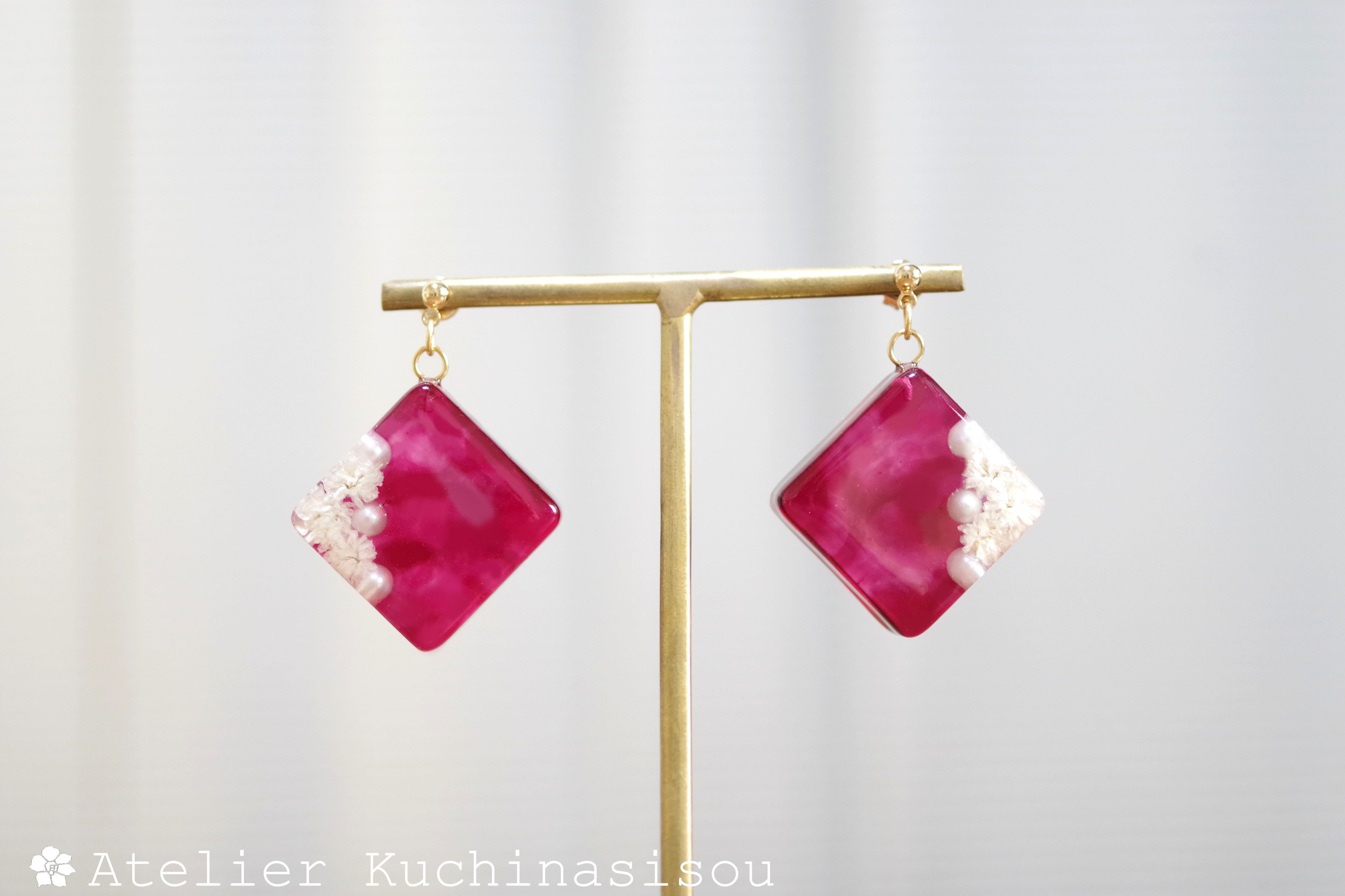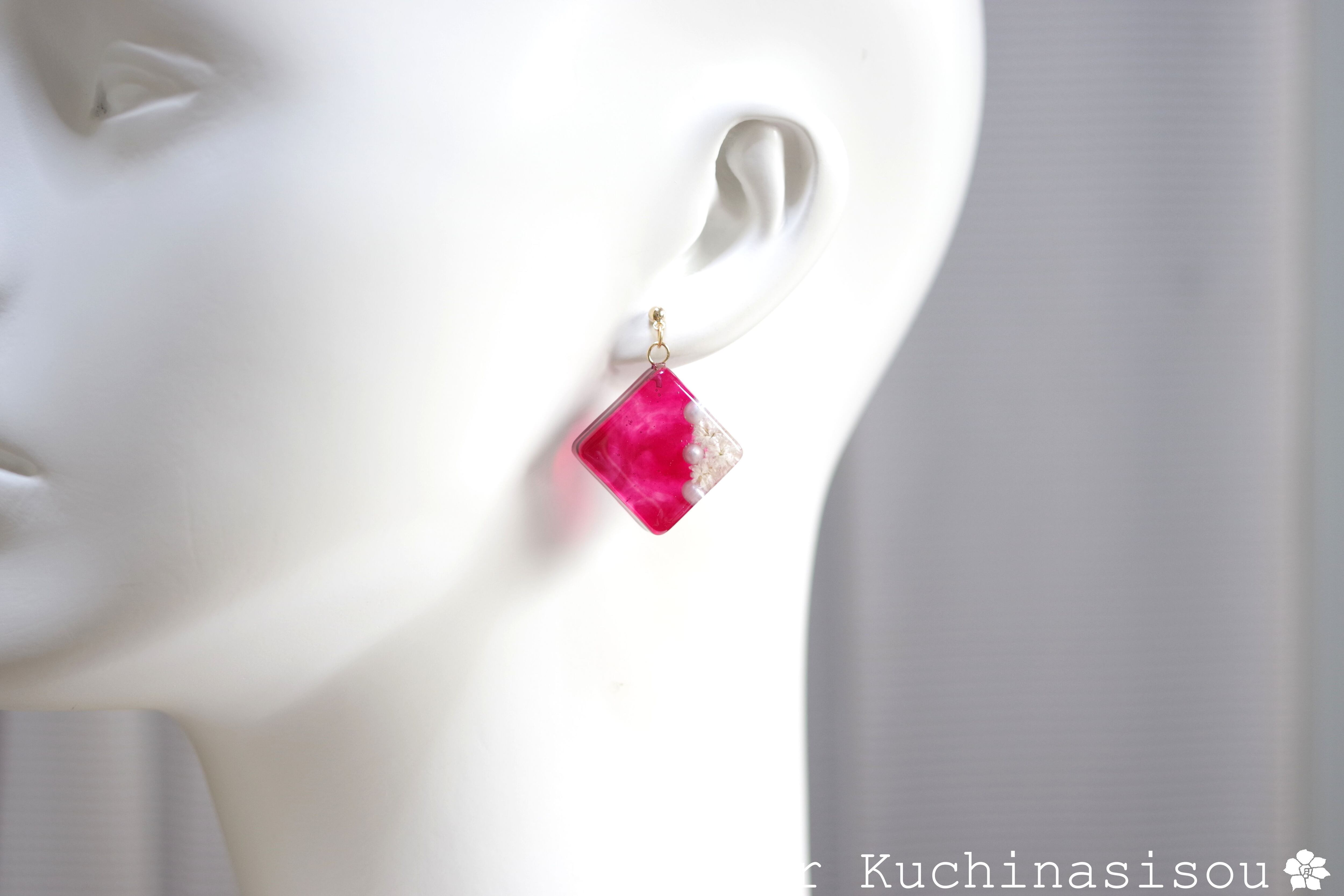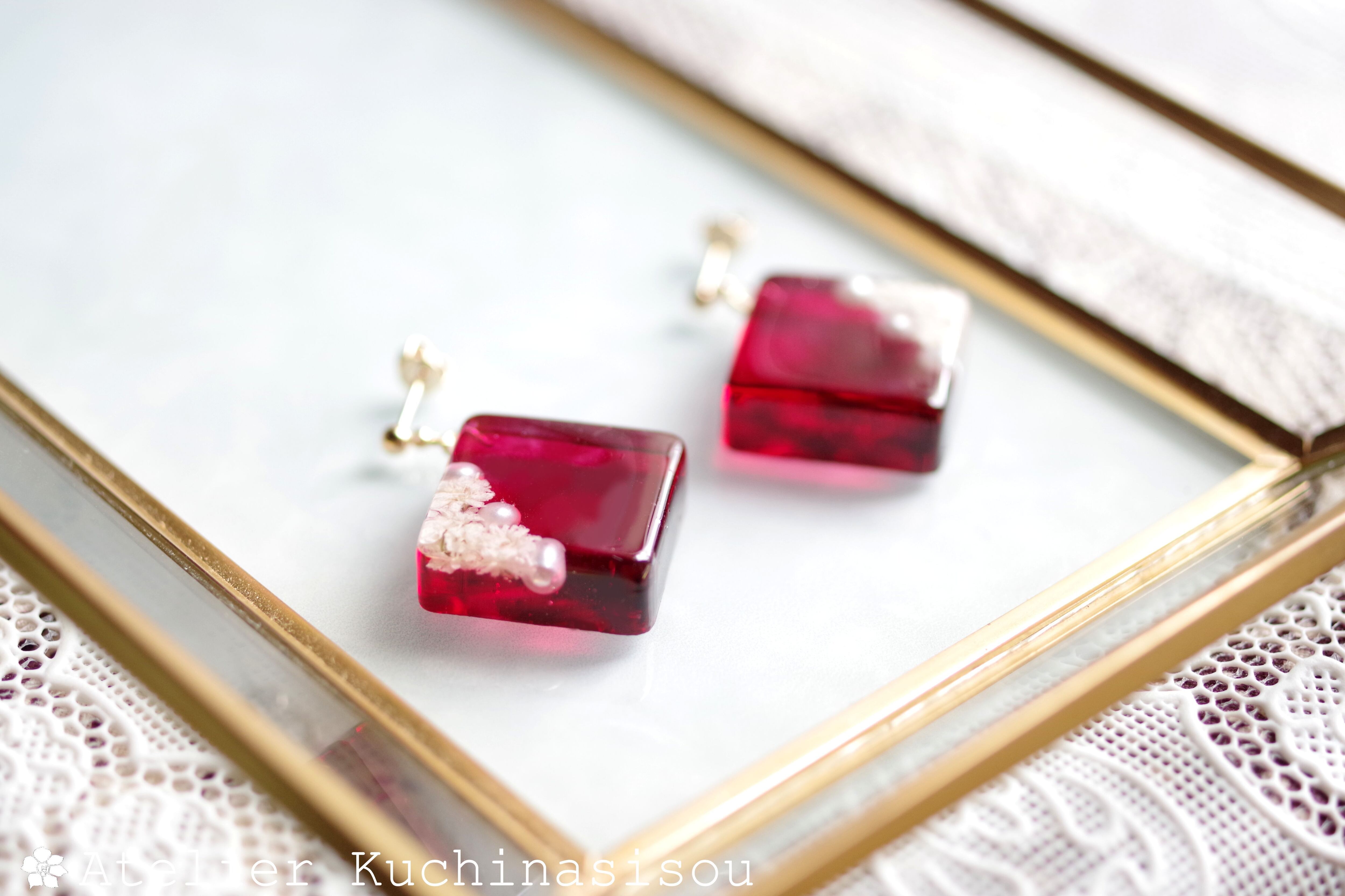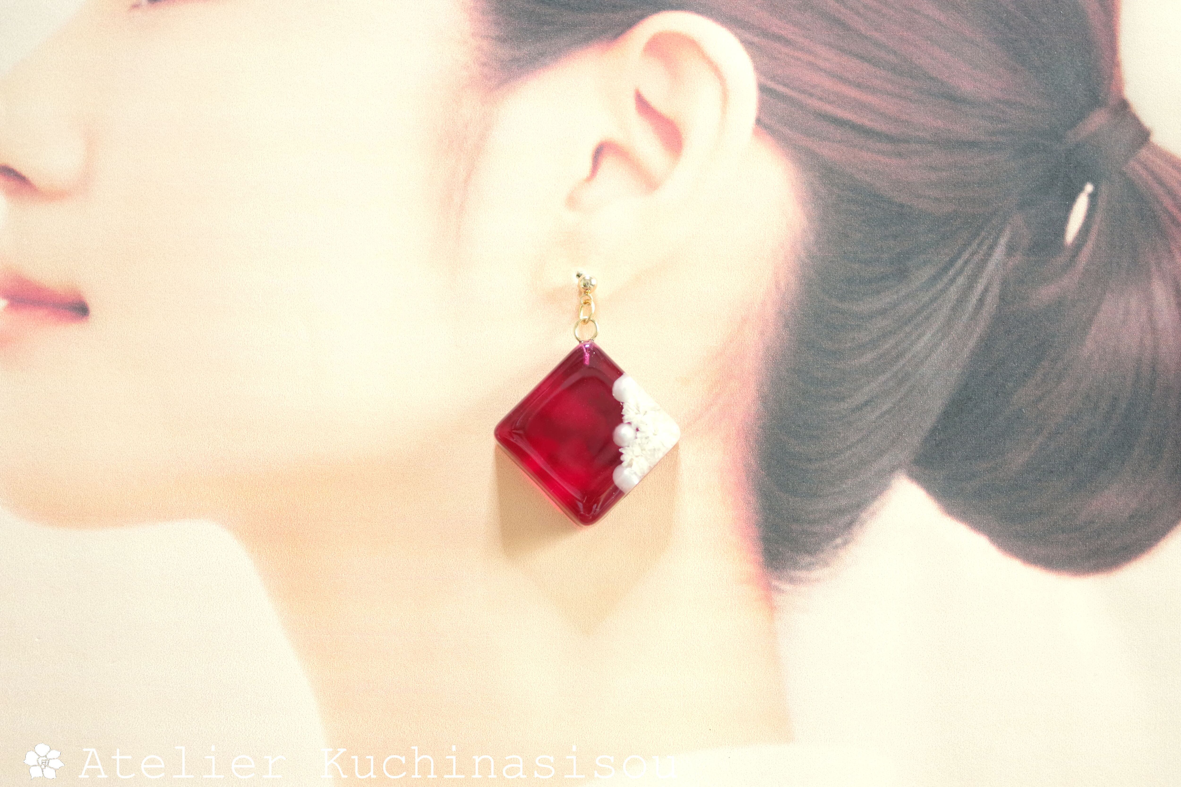 パールとお花をスクエア型のレジンに封じ込め、ピンクで着色したピアス。