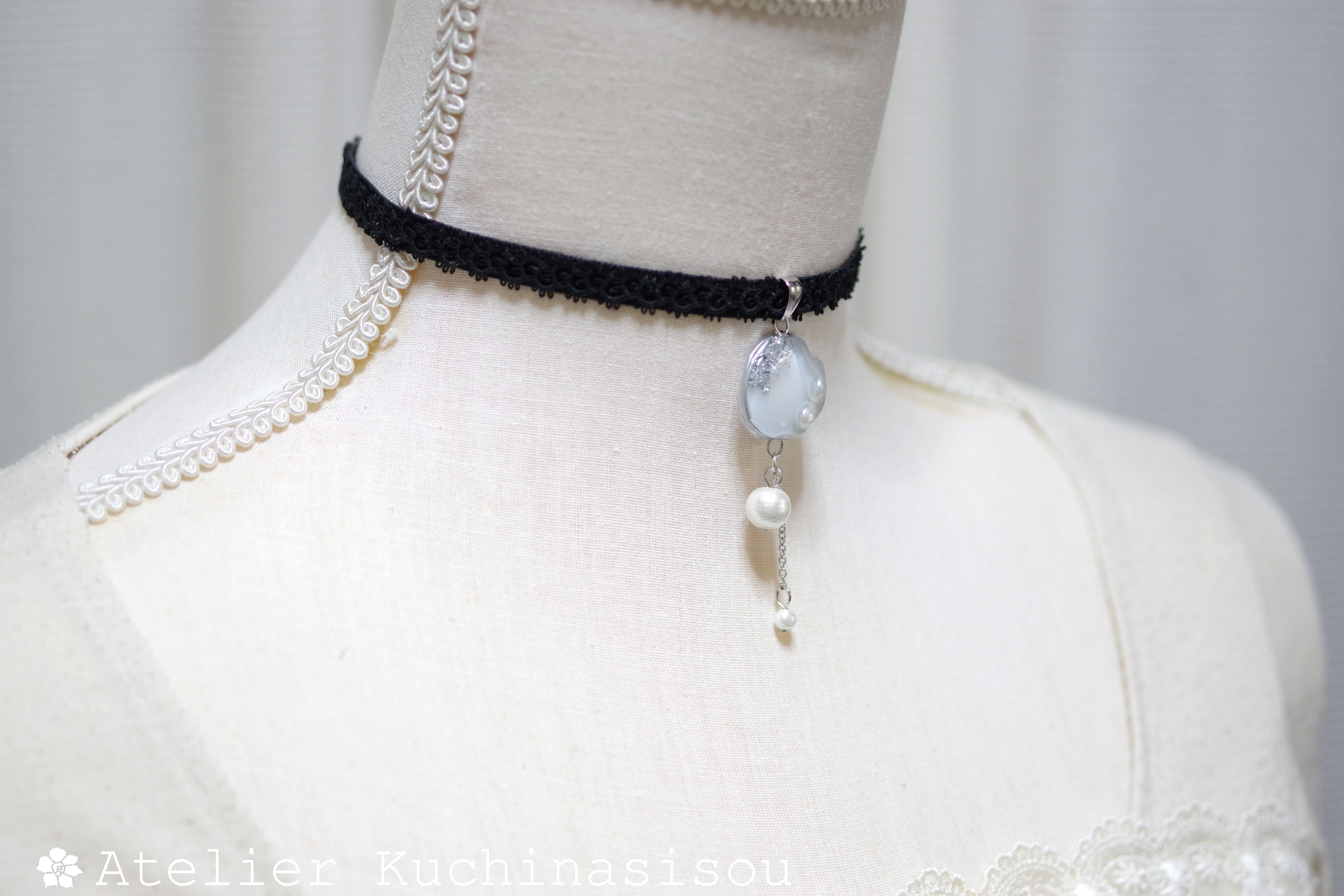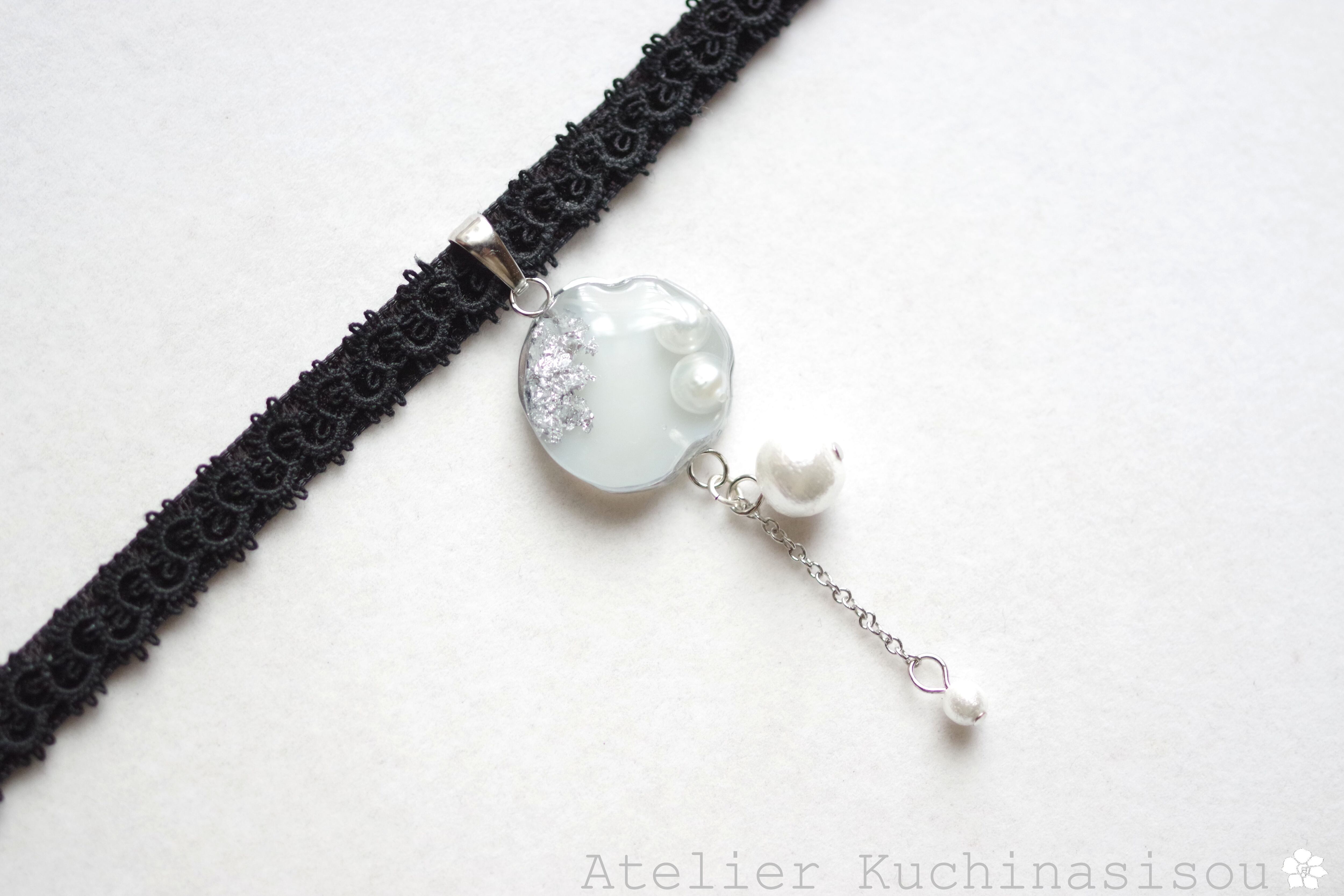 銀箔と淡水パールを沈めたスライスアゲートのようなレジンを、ベルベットリボンにタティングレースで装飾を施したチョーカーに仕上げました。