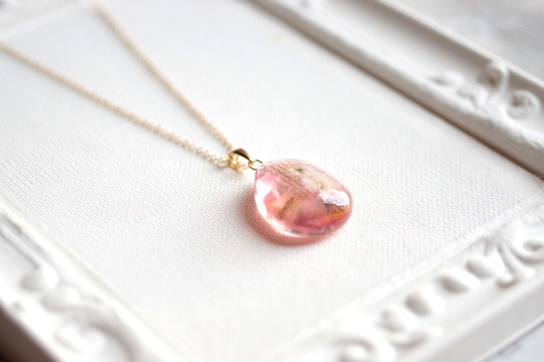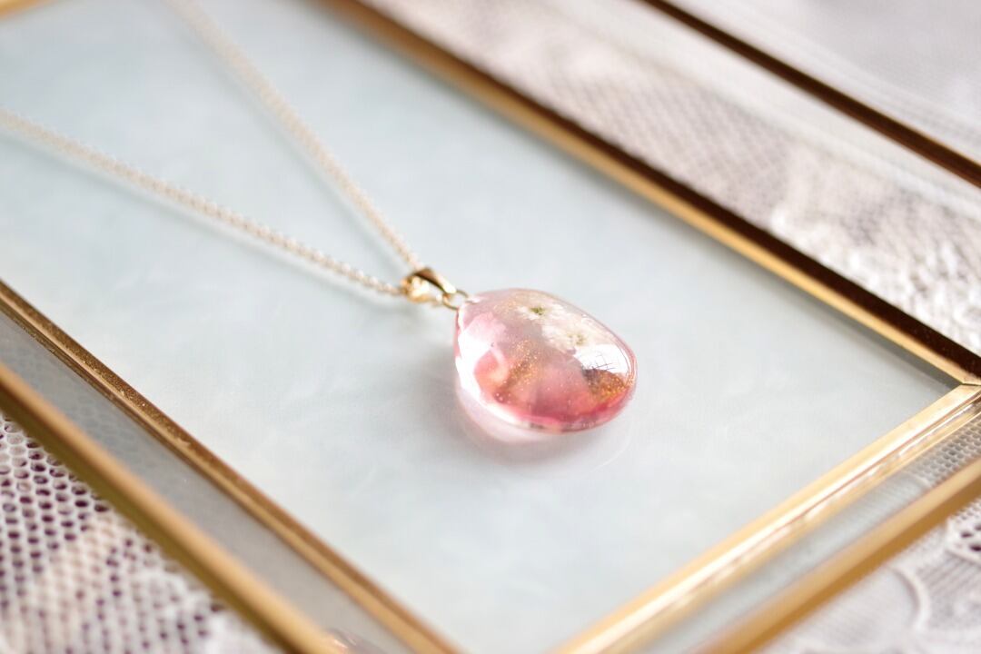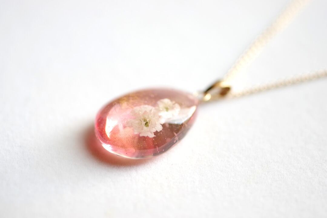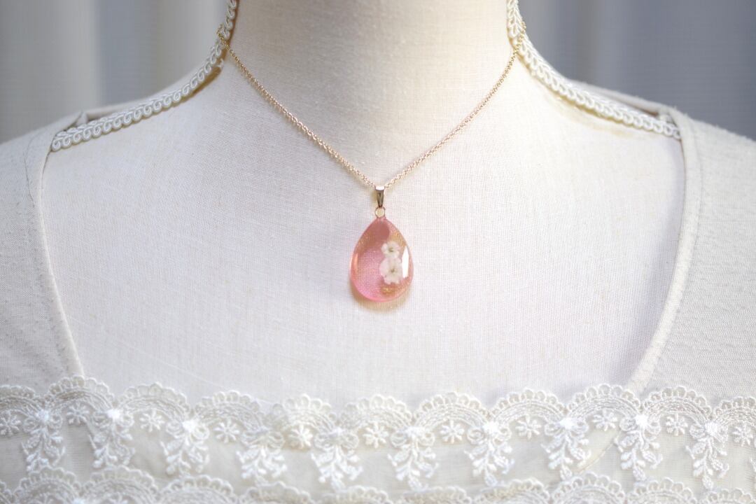 ドロップ型のレジンにお花を二輪咲かせた可憐なペンダントです。