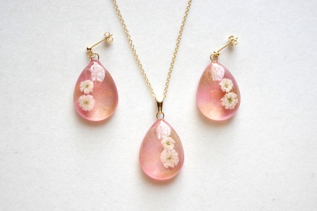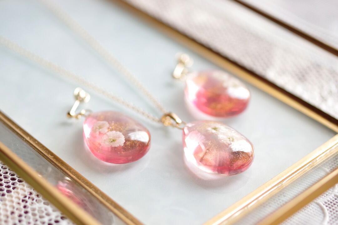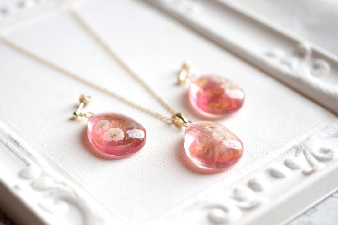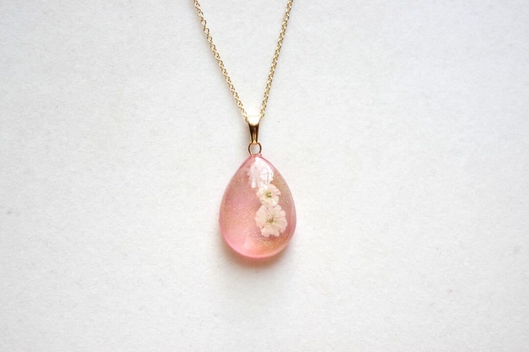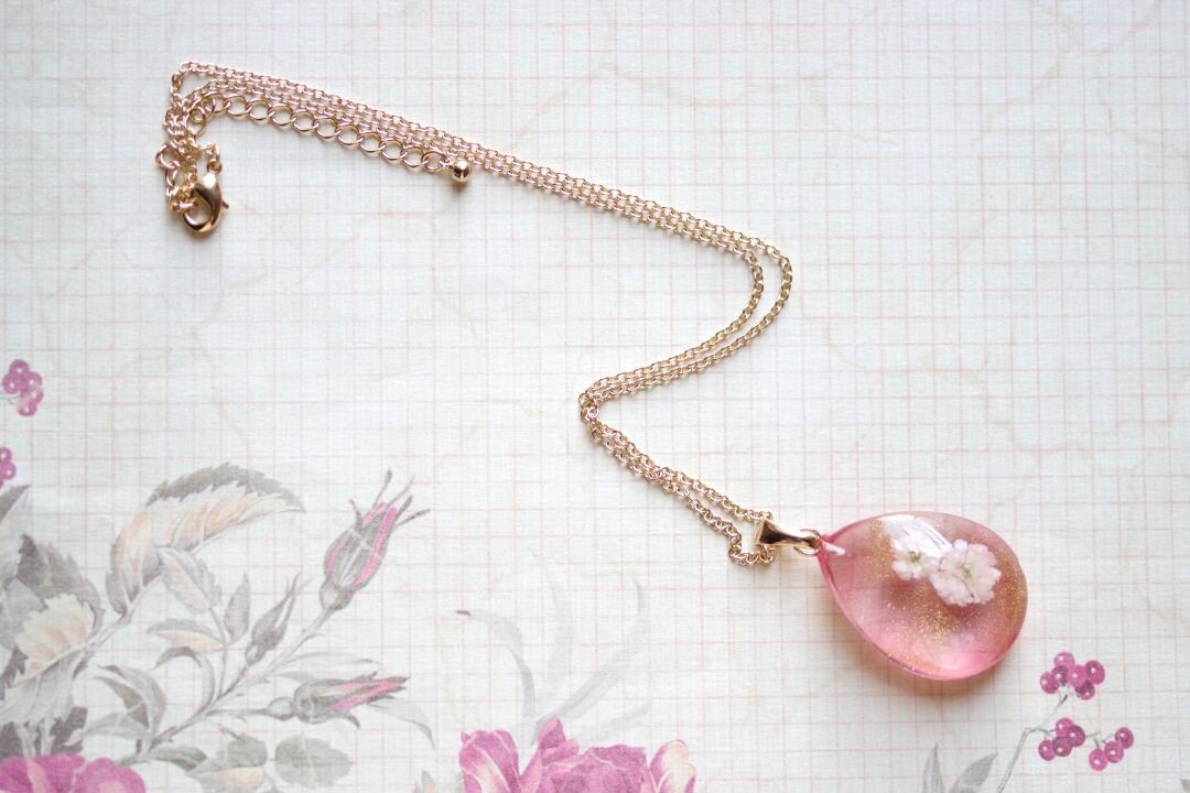 ドロップ型のレジンにお花を二輪咲かせた可憐なペンダントです。