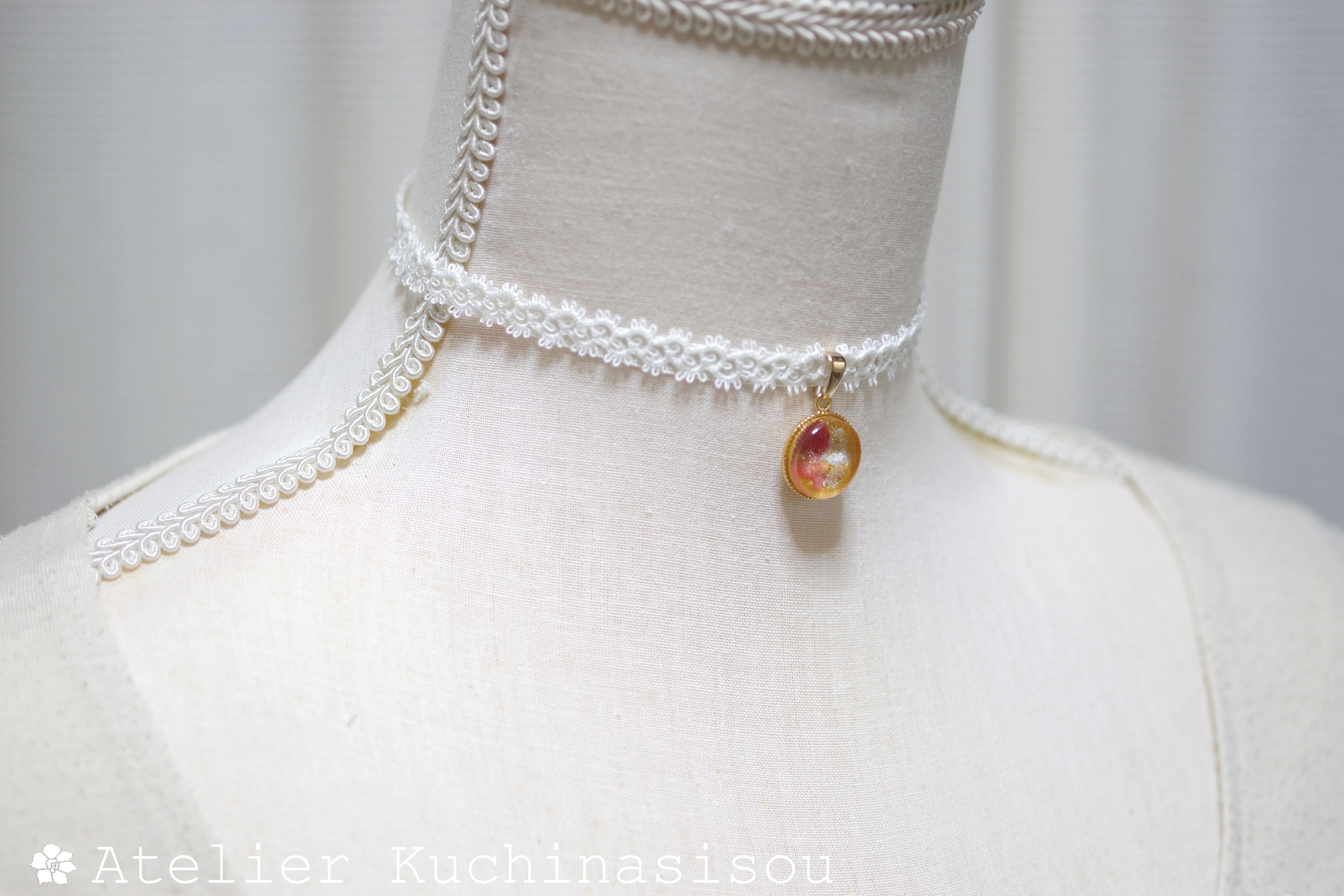 【受注製作】レジンアート ラウンドモチーフとタティングレースとサテンリボンのチョーカー〈白梅紅梅〉