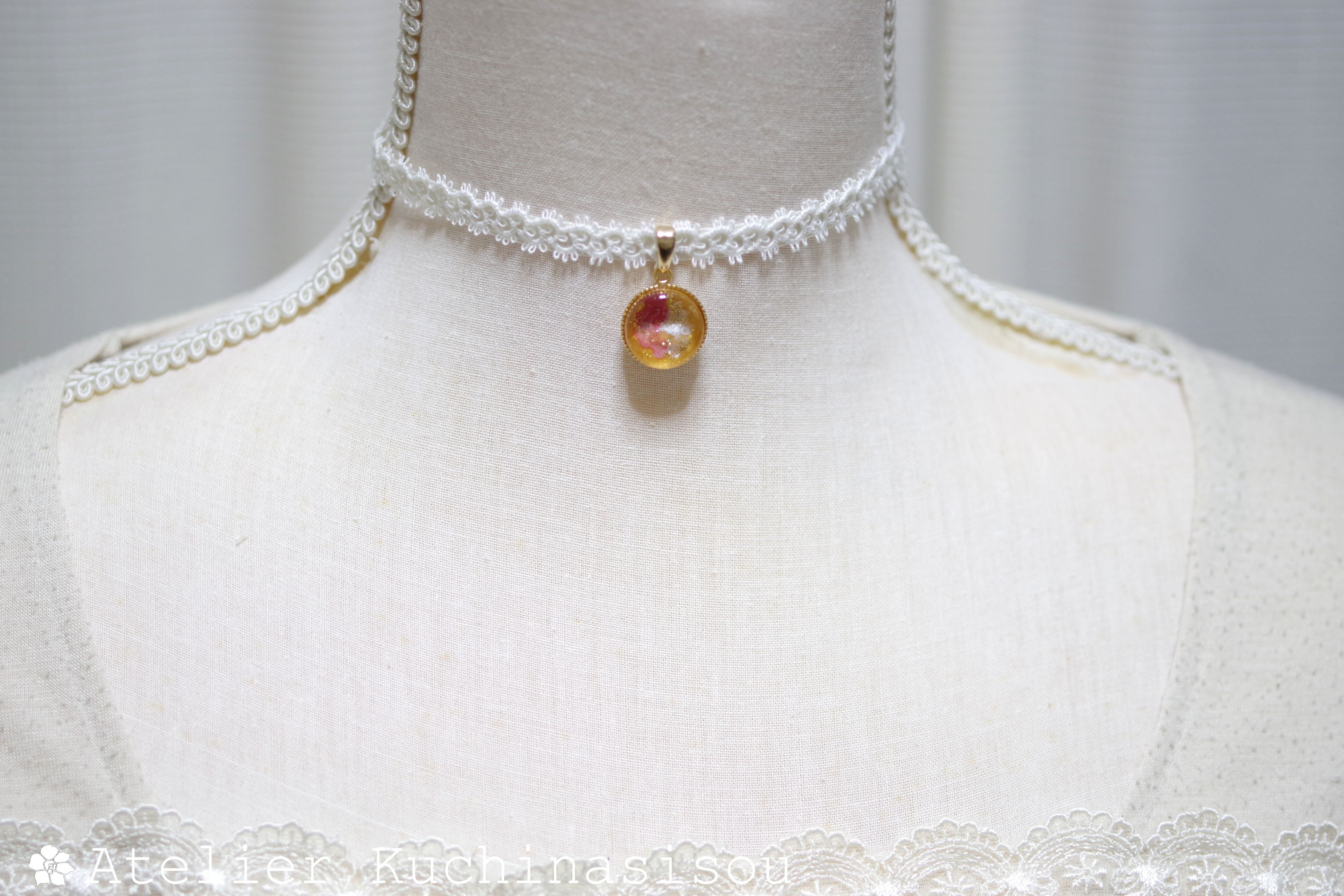 金地に赤と白で描いた模様がまるで白梅と紅梅のようなレジンを、サテンリボンにタティングレースで装飾を施したチョーカーに仕上げました。
