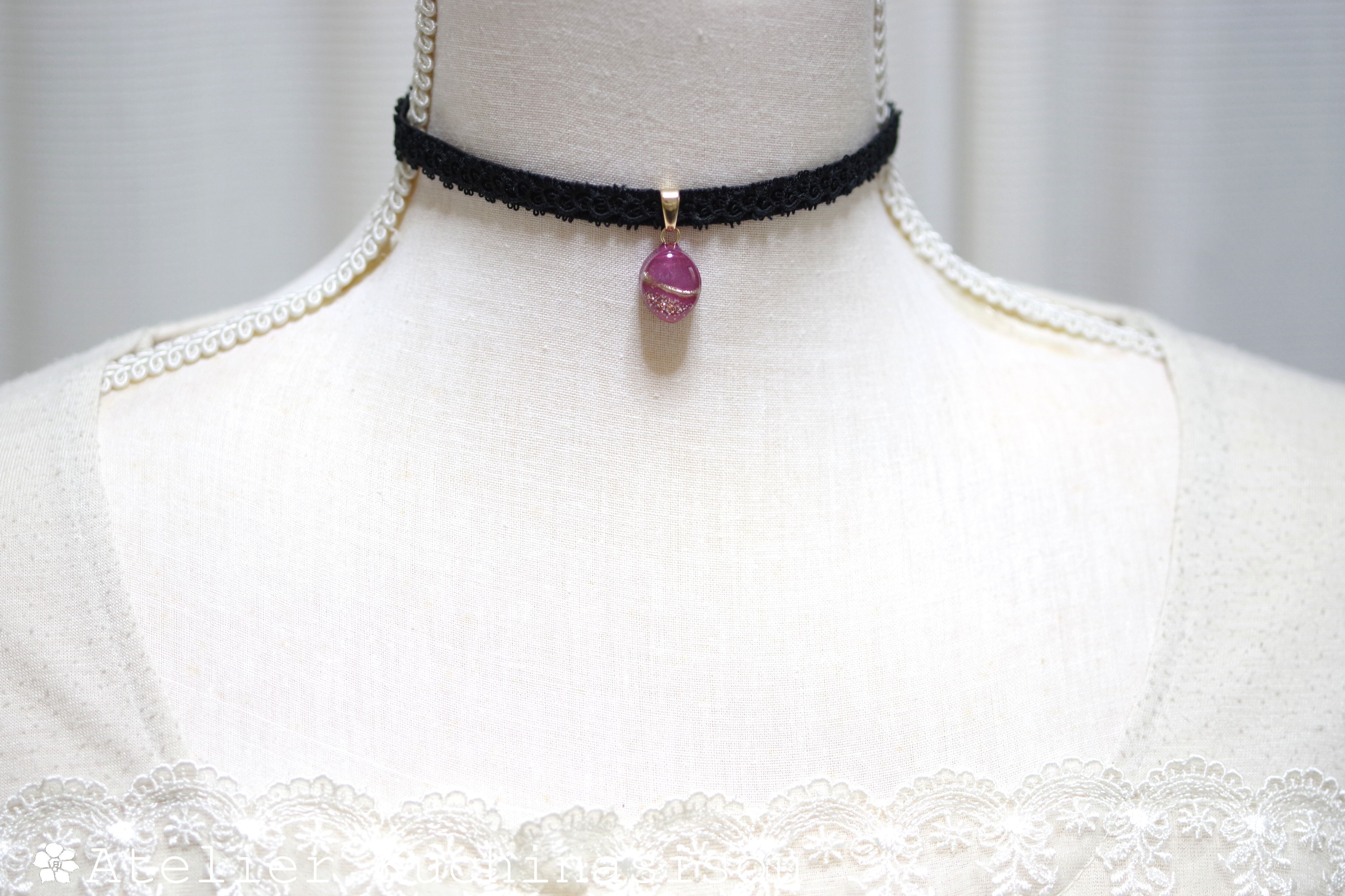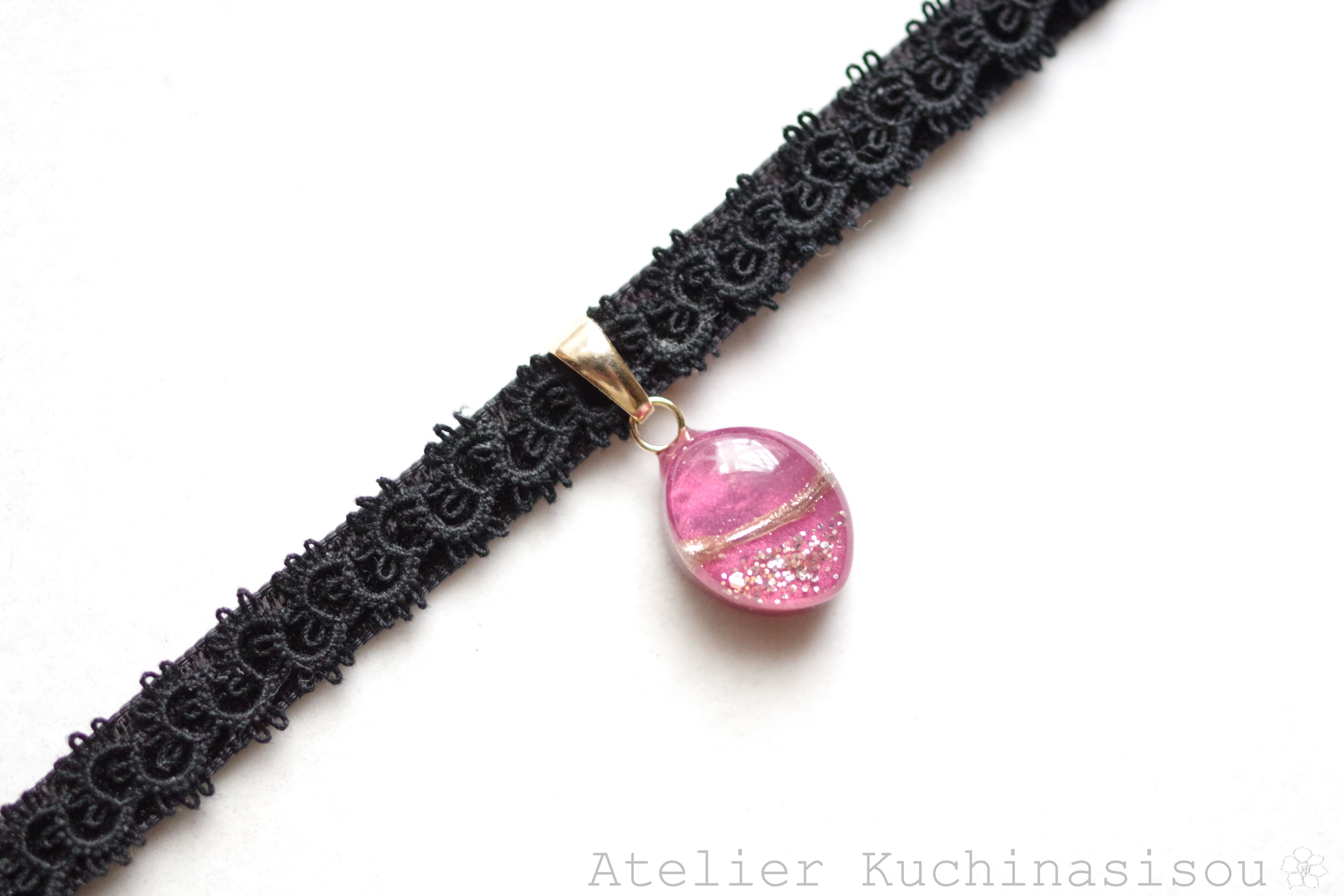 艶やかなローズピンクのマーキス型にゴールドの装飾を施したレジンを、ベルベットリボンにタティングレースで装飾を施したチョーカーに仕上げました。
