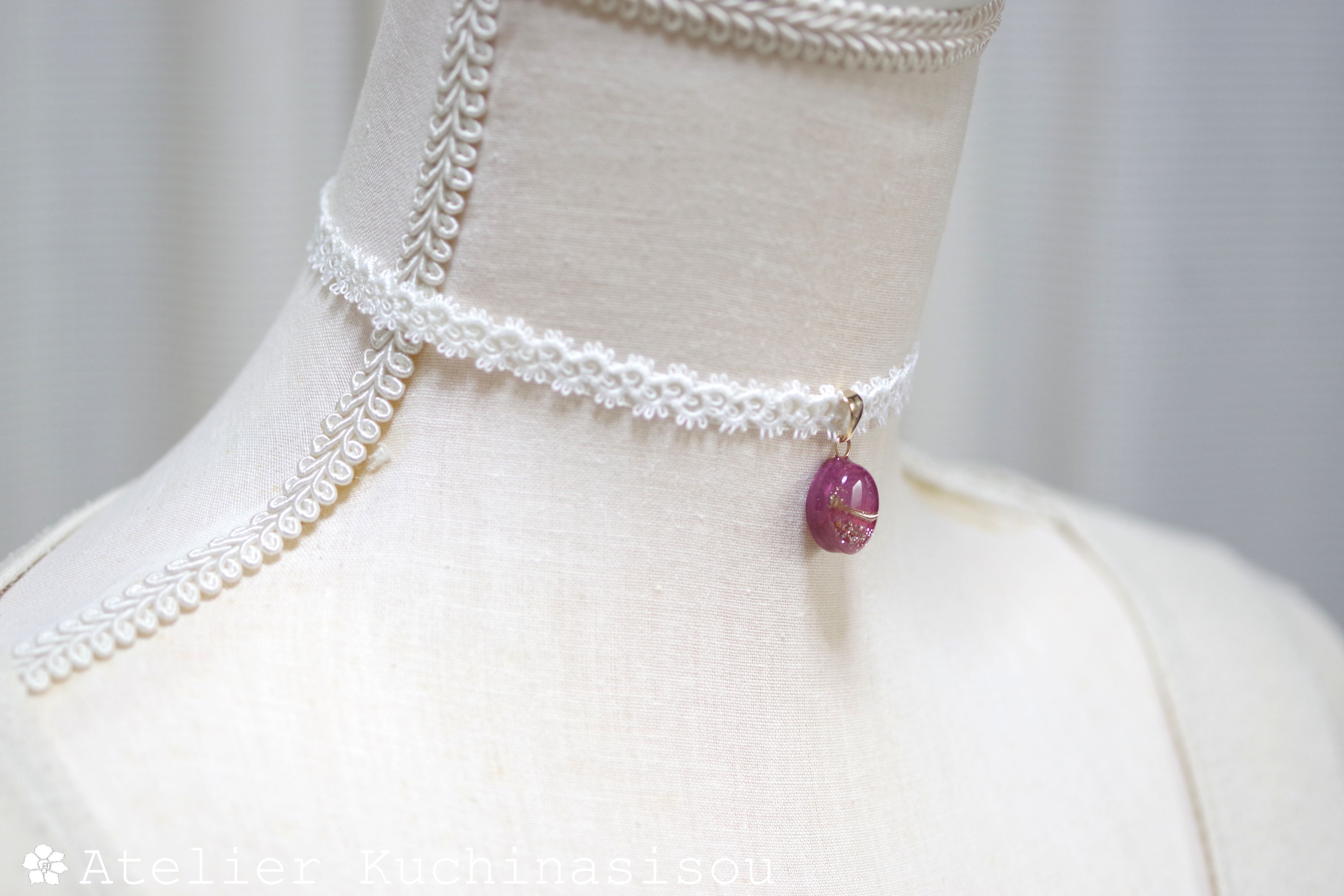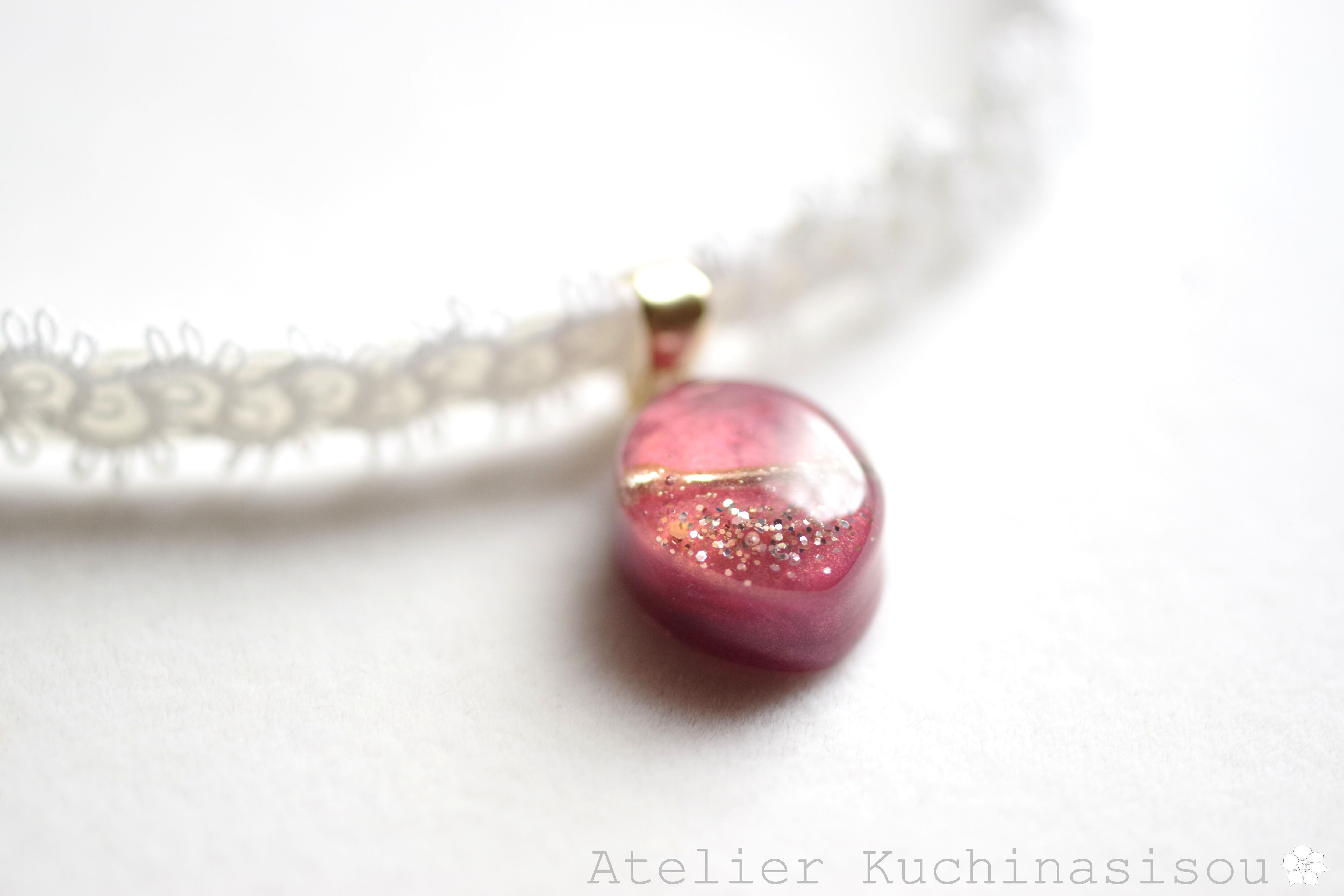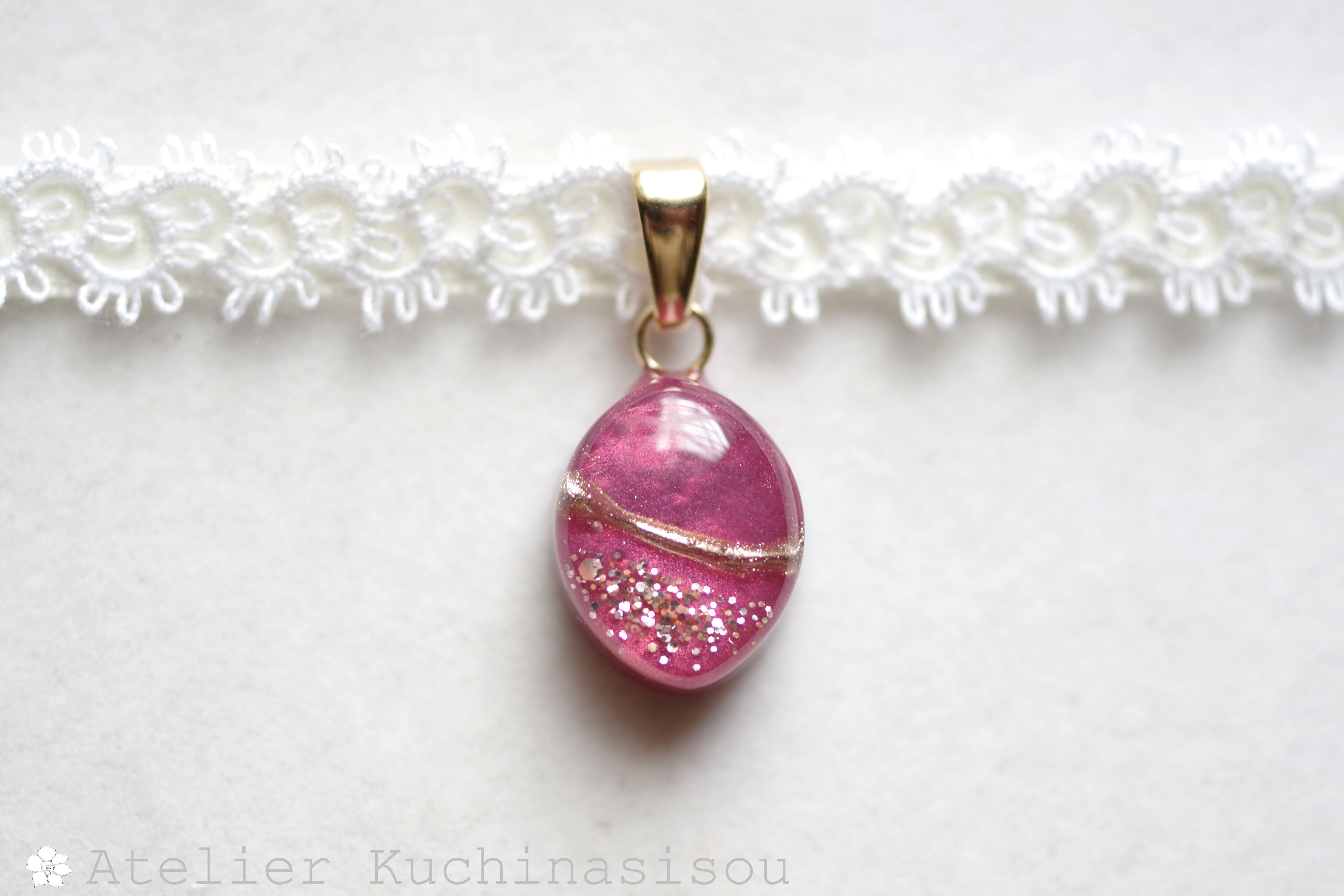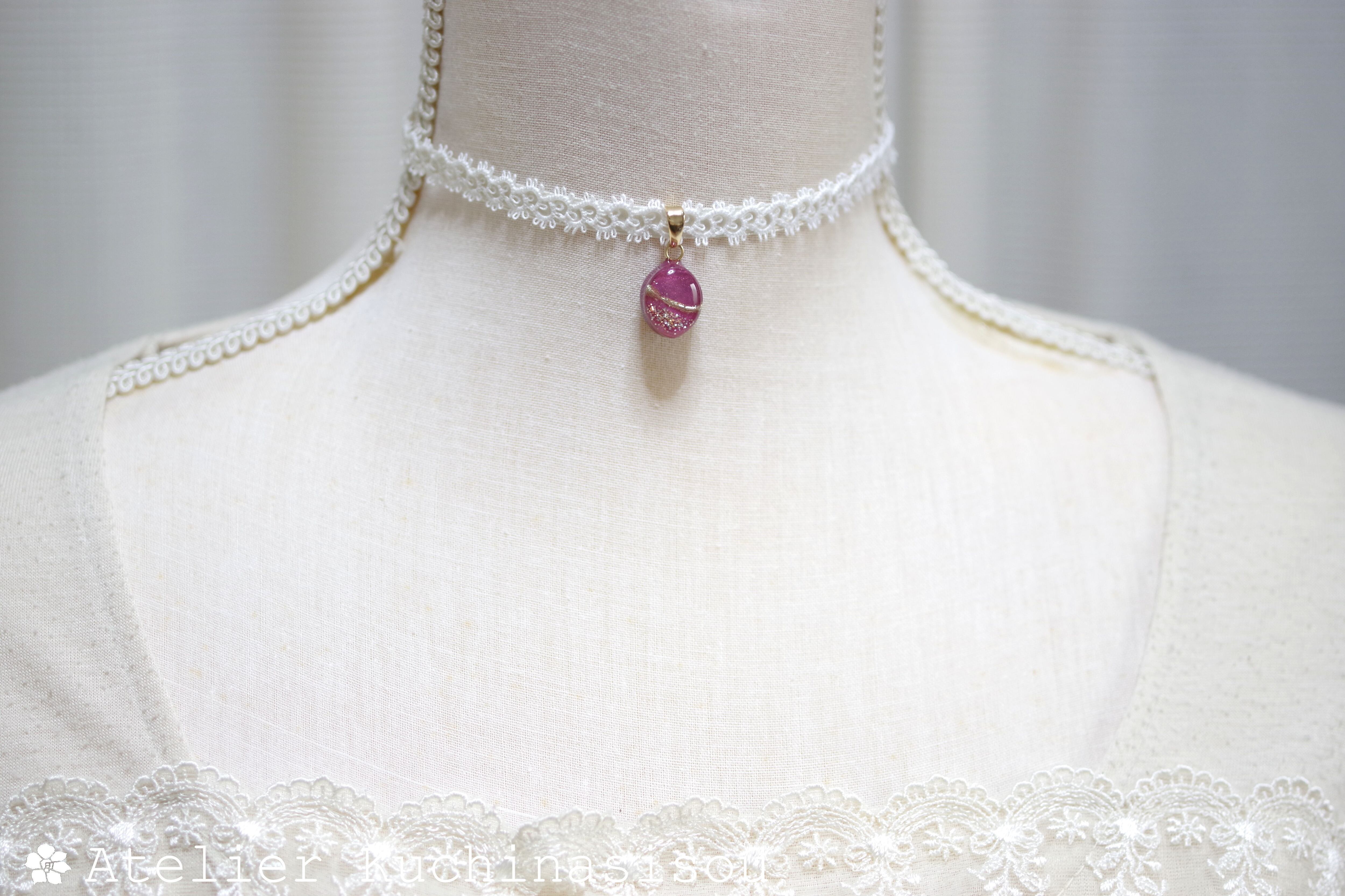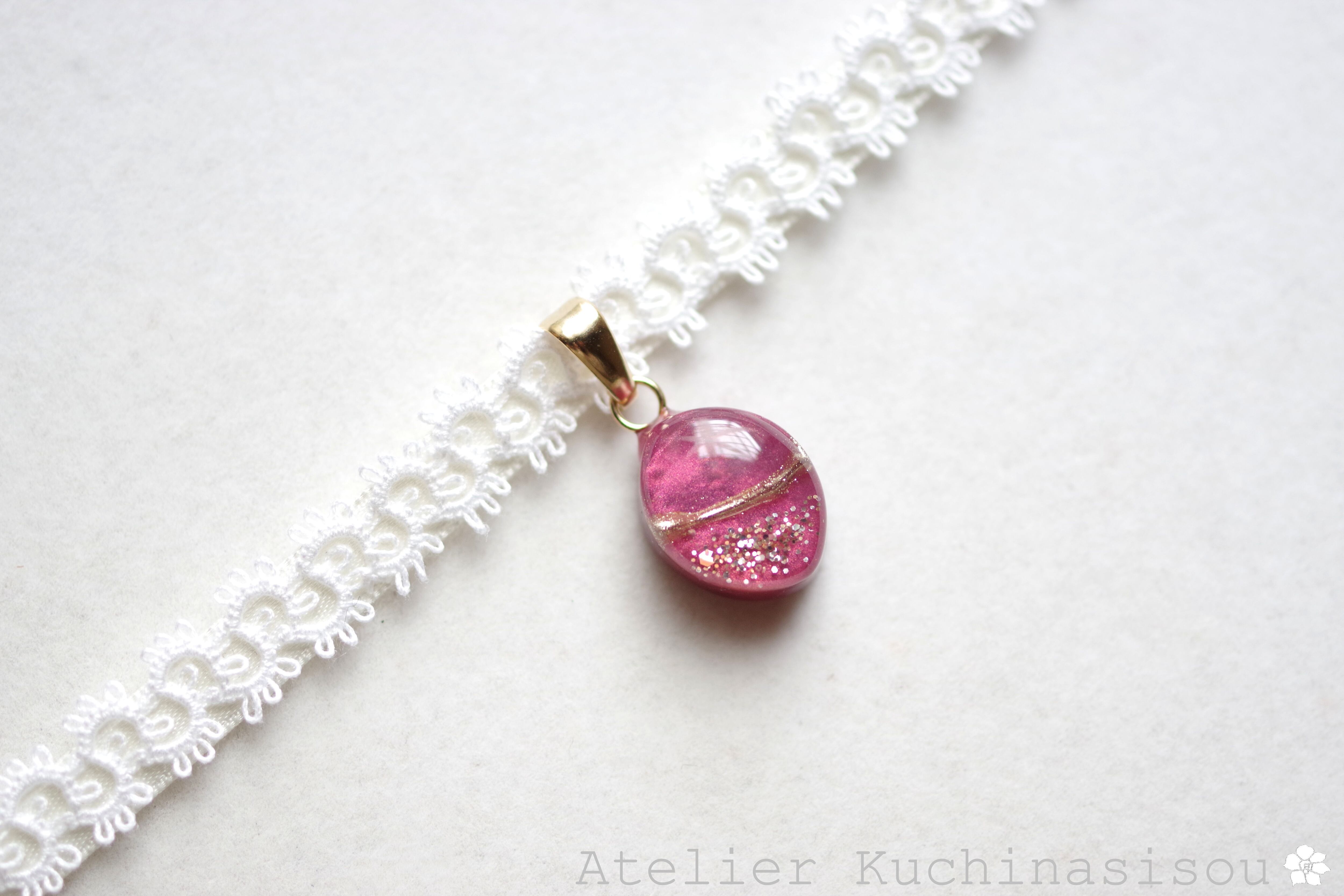 艶やかなローズピンクのマーキス型にゴールドの装飾を施したレジンを、サテンリボンにタティングレースで装飾を施したチョーカーに仕上げました。
