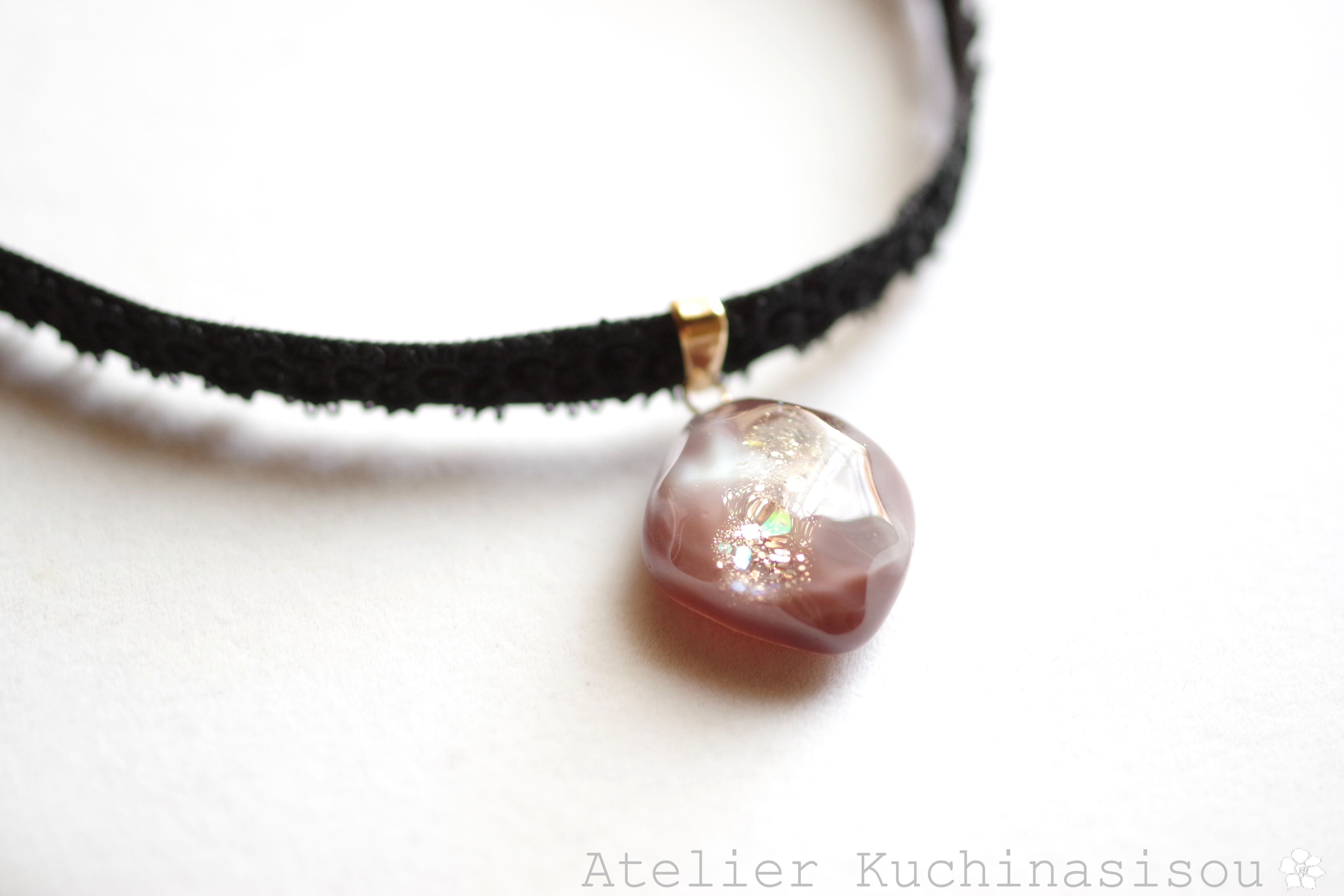 ブラウンとホワイトのマーブル模様と、きらめくラメが華やかで美しいレジンを、ベルベットリボンにタティングレースで装飾を施したチョーカーに仕上げました。