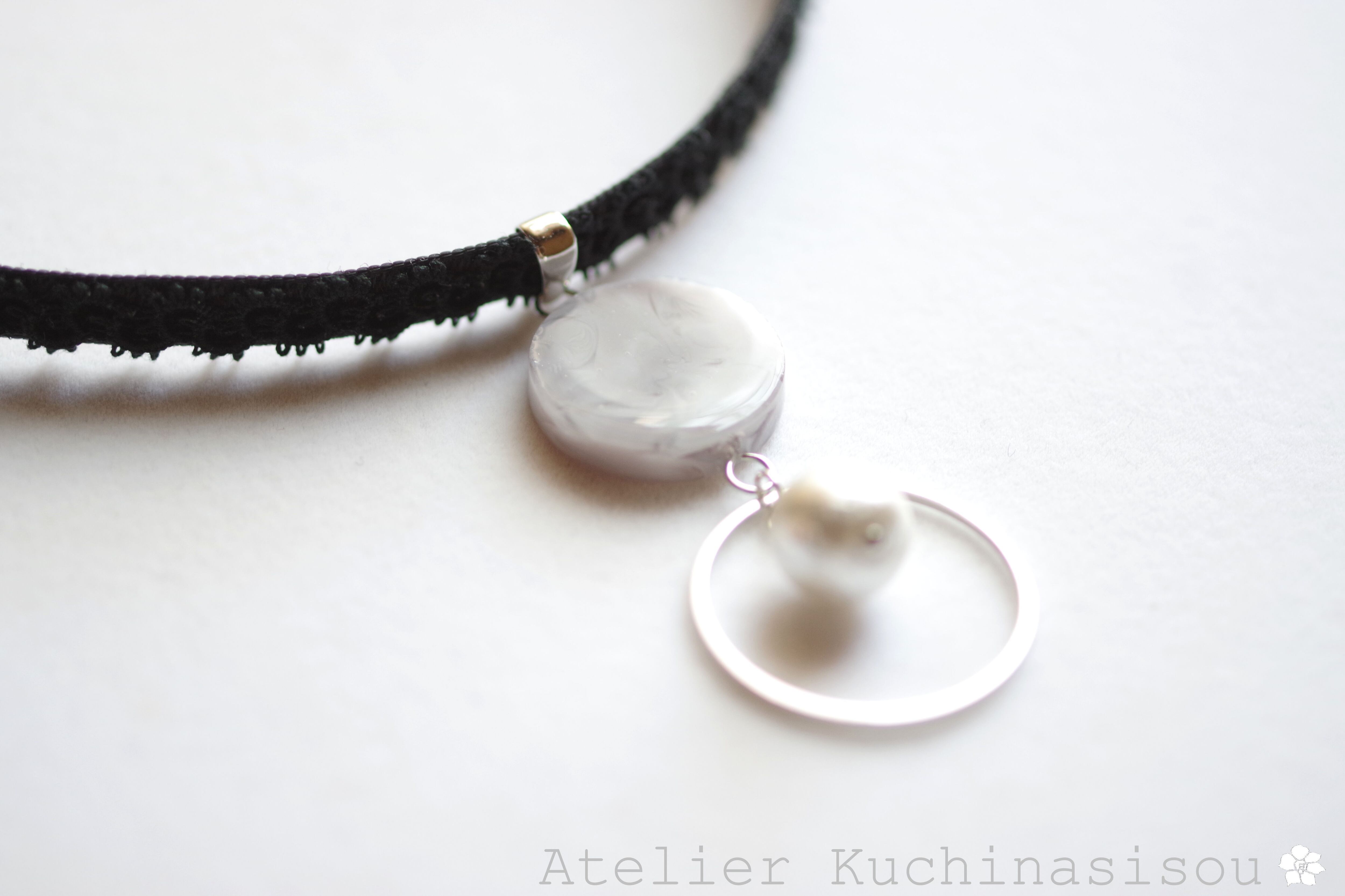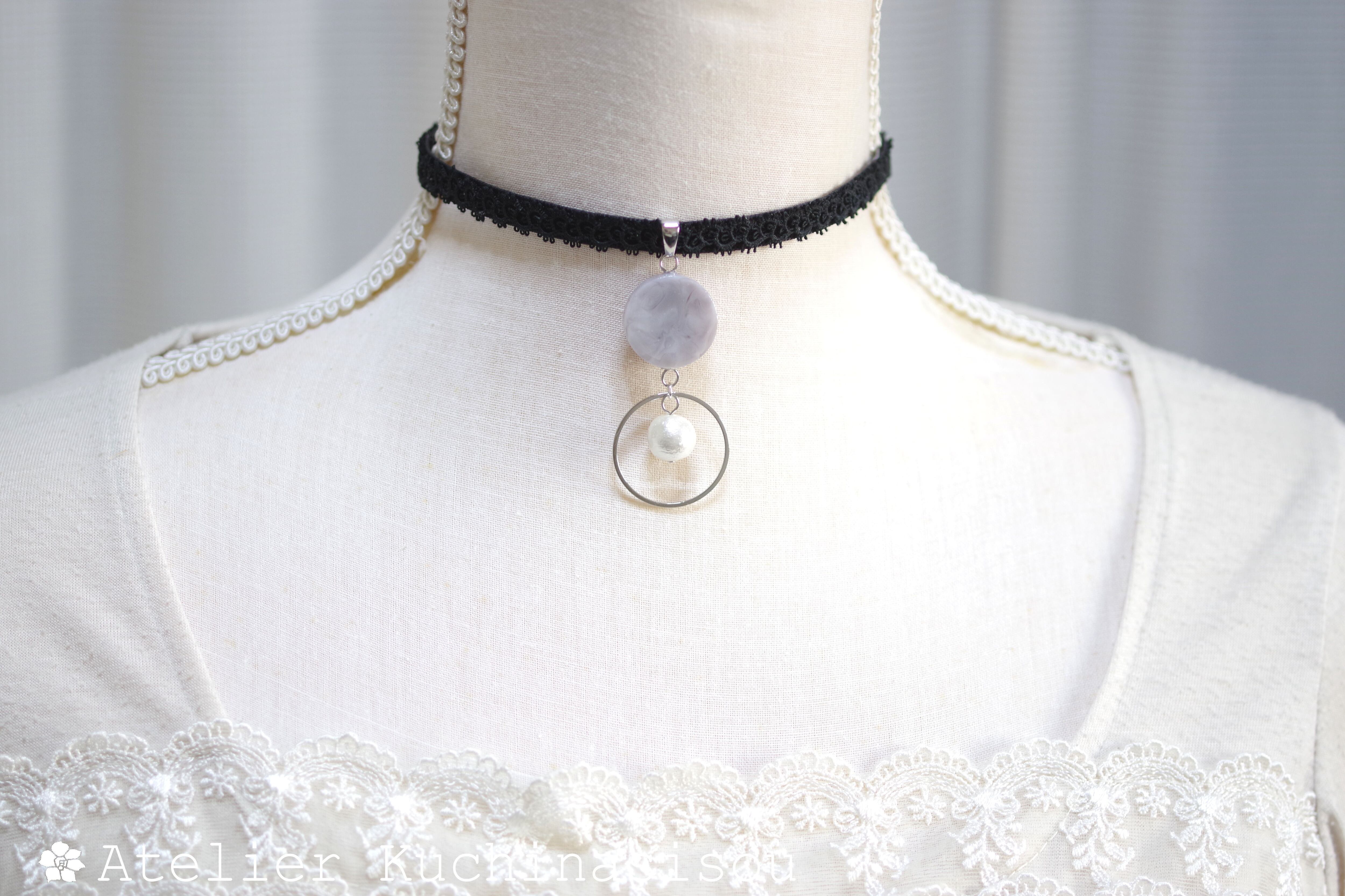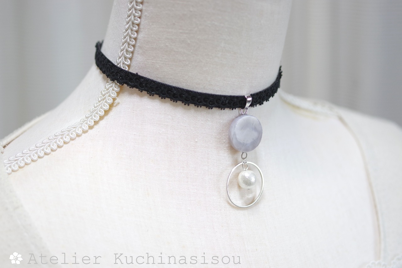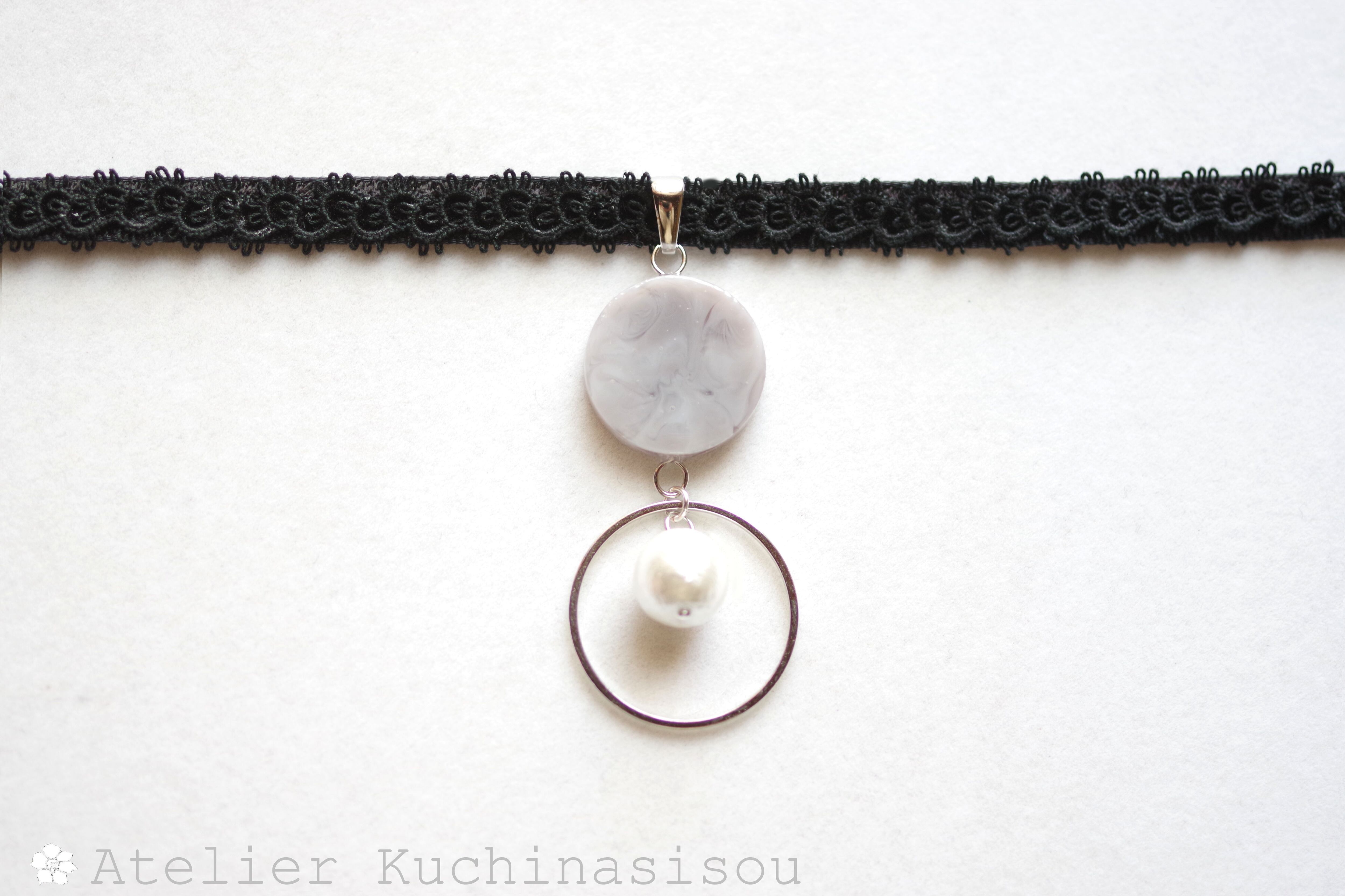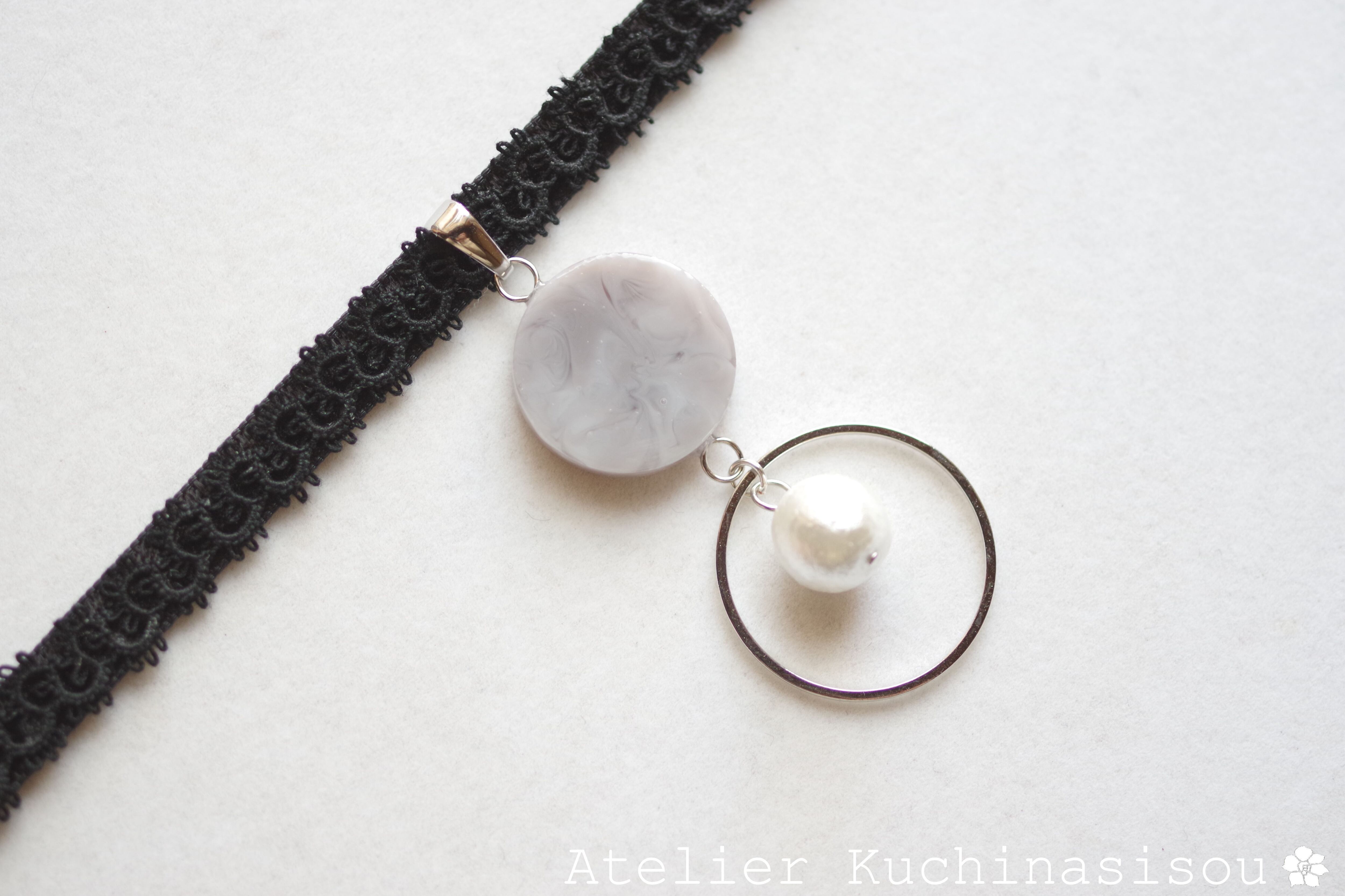 グレーのマーブル模様が美しいレジンを、ベルベットリボンにタティングレースで装飾を施したチョーカーに仕上げました。