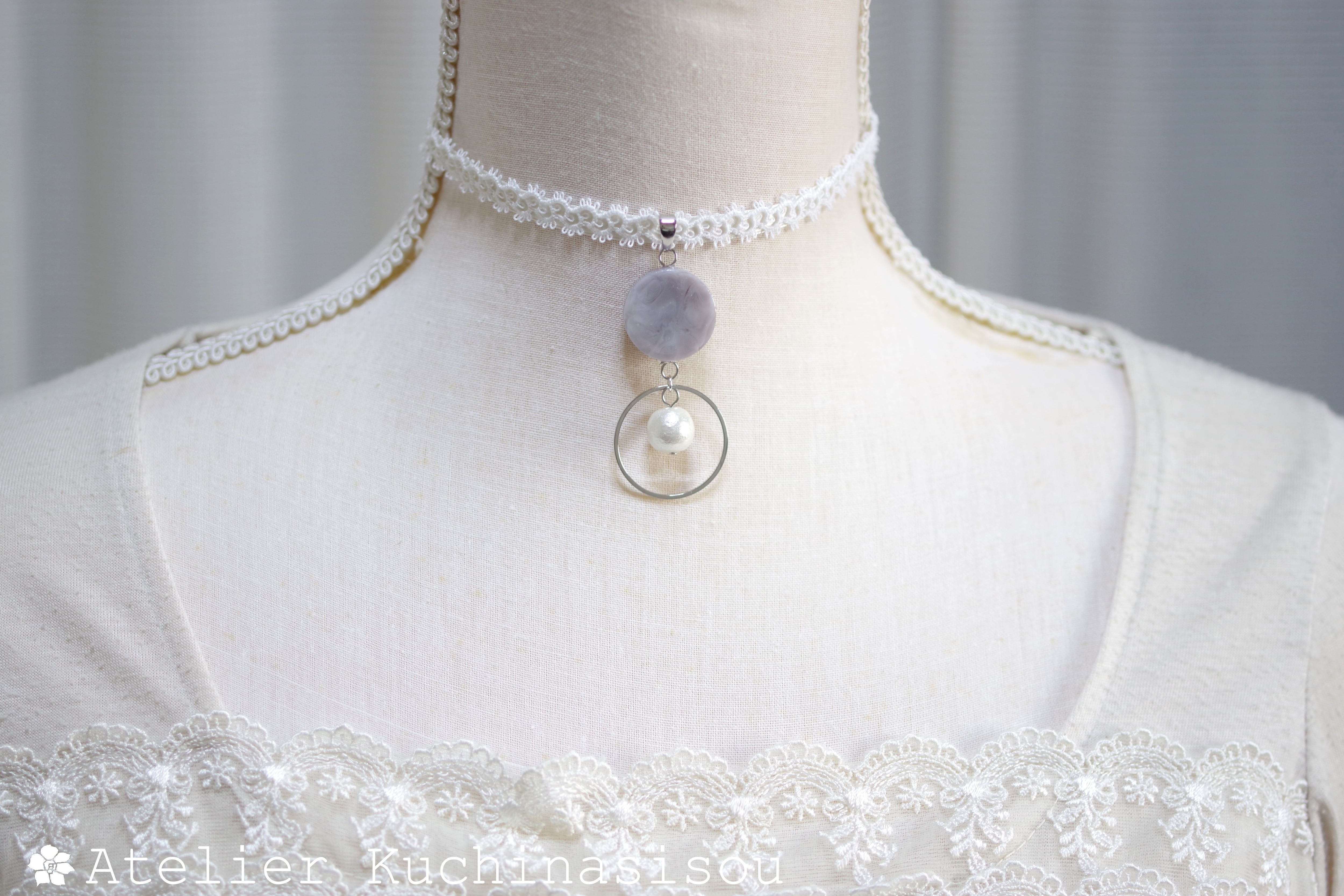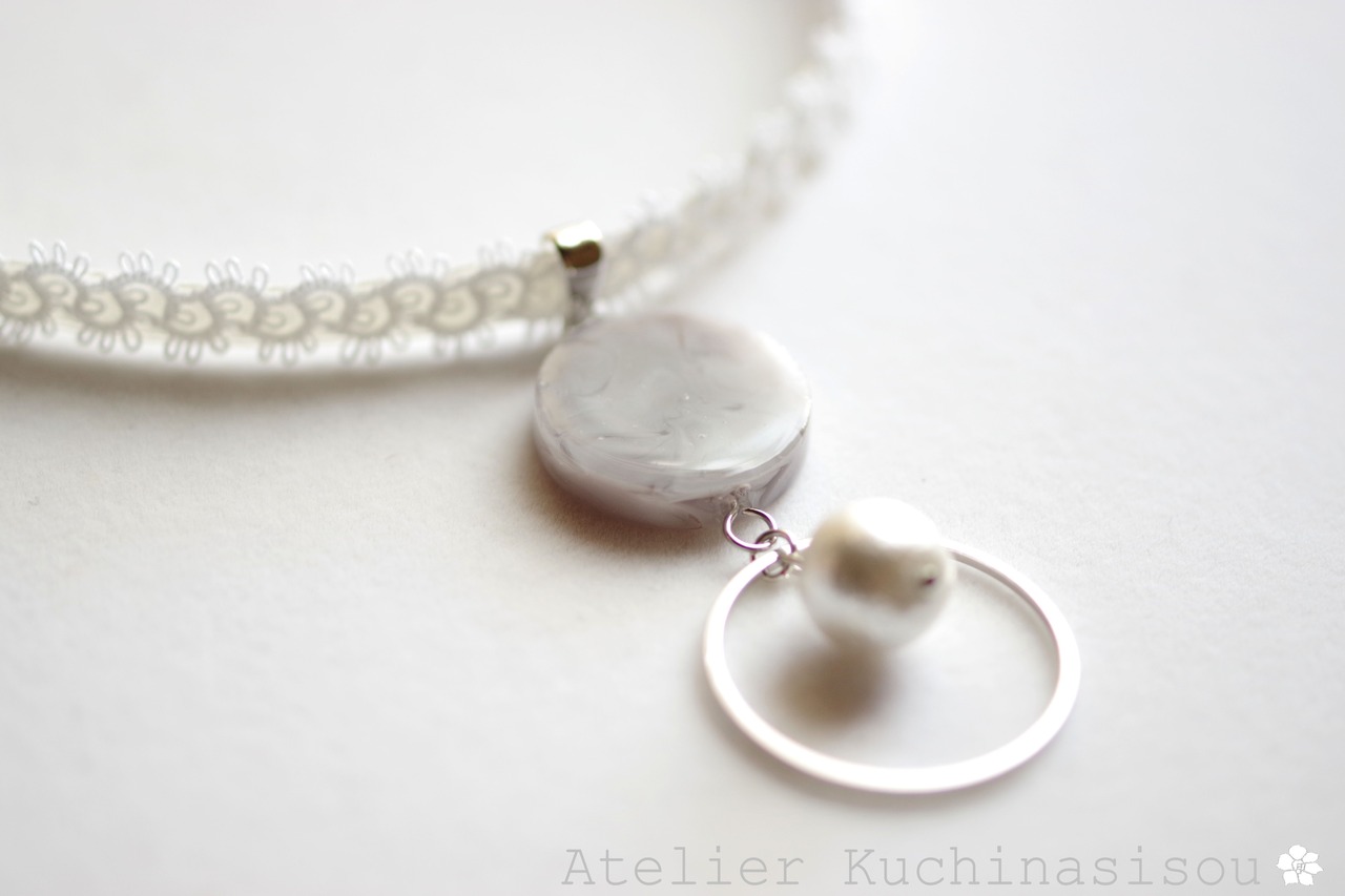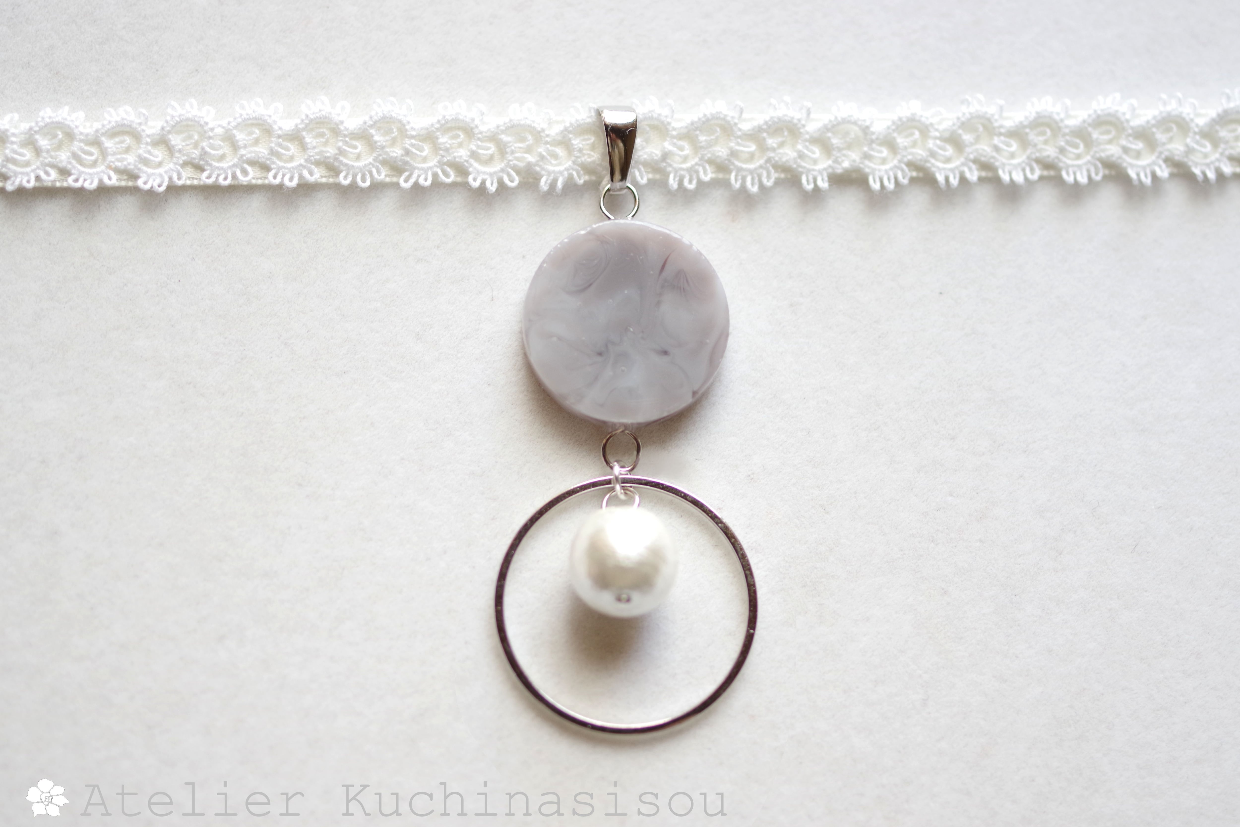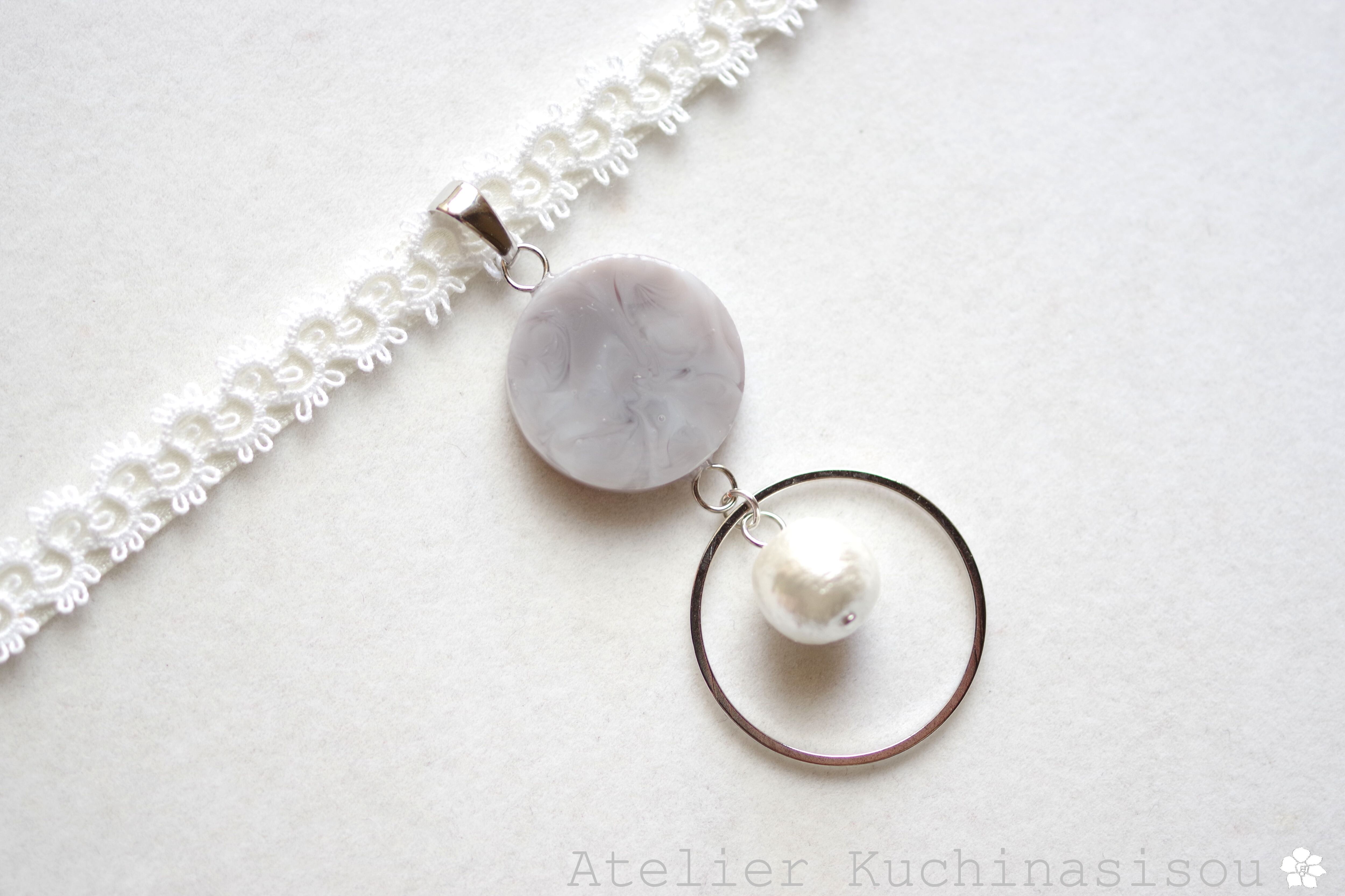 グレーのマーブル模様が美しいレジンを、サテンリボンにタティングレースで装飾を施したチョーカーに仕上げました。