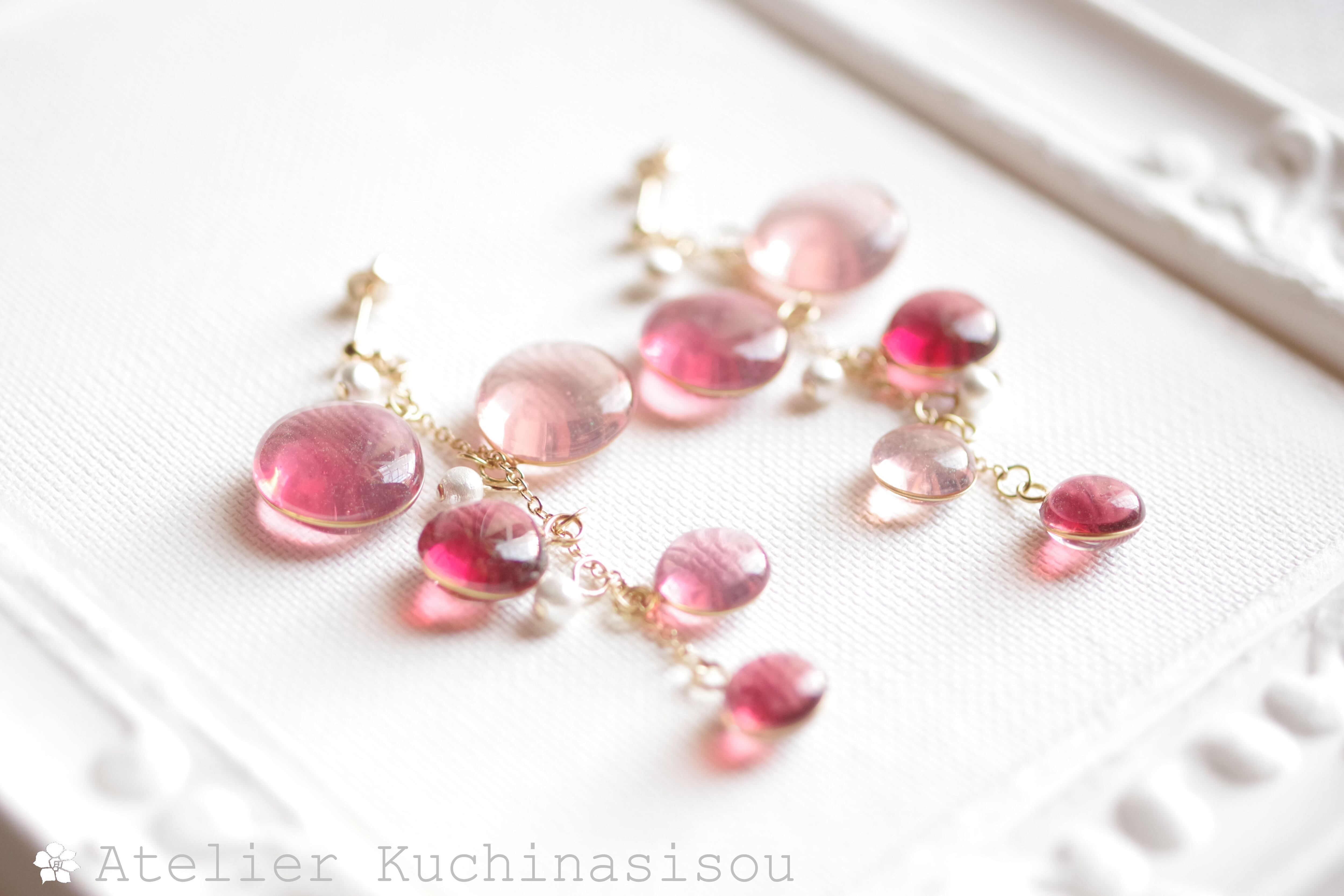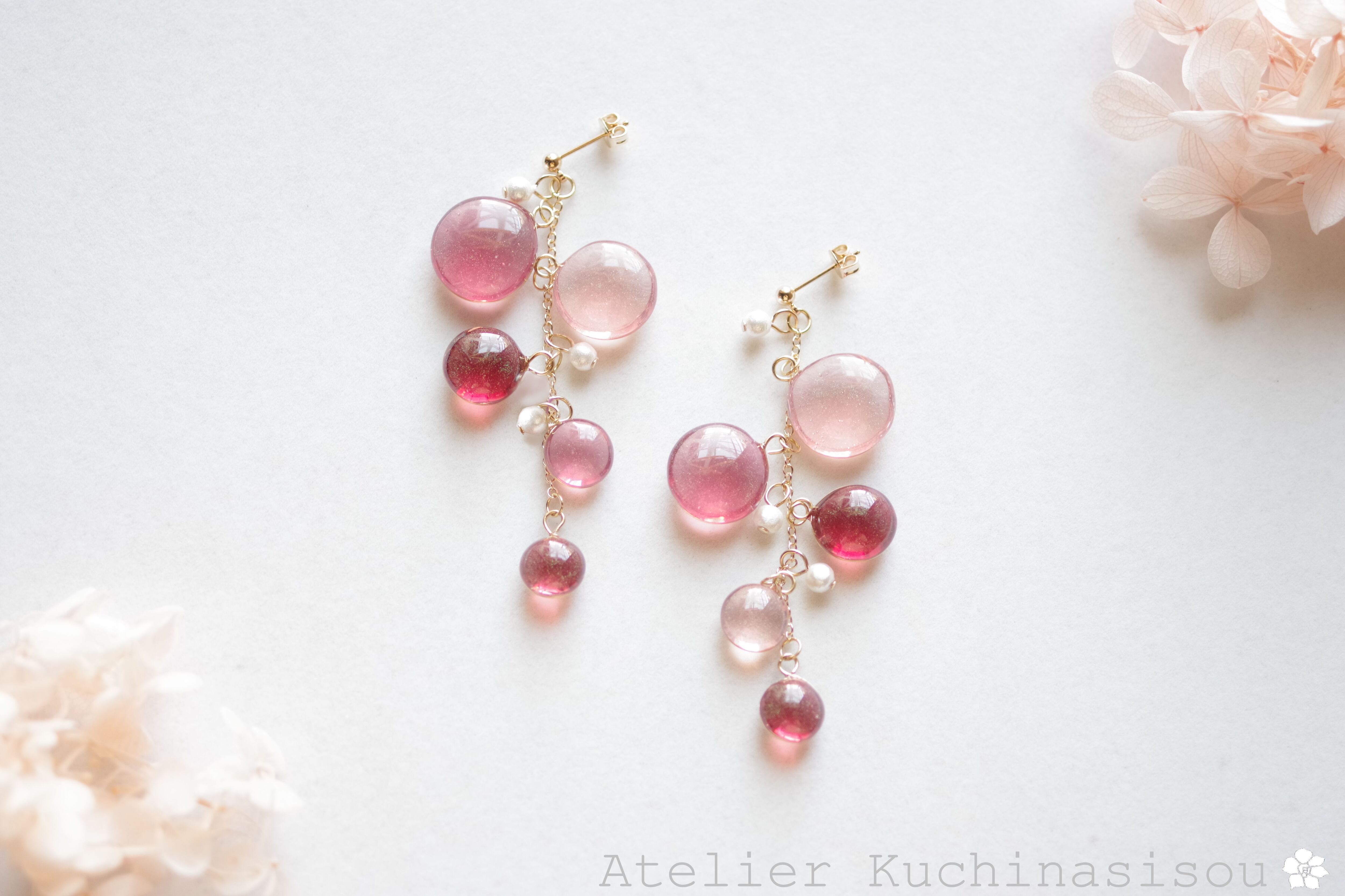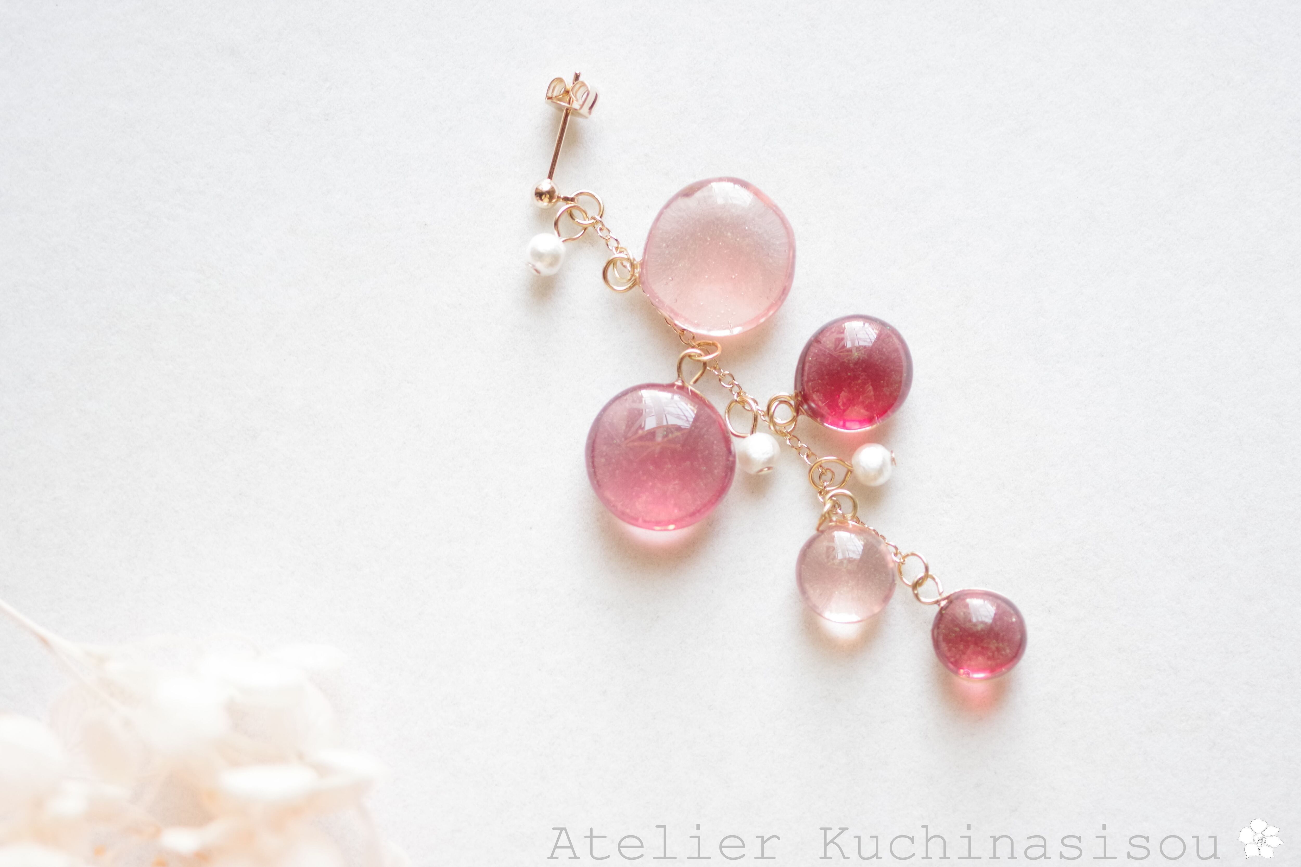 大小のレジンのラウンドモチーフがまるで転がり落ちる水滴のようで、その透明感に思わず魅入ってしまうピアス。