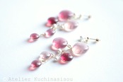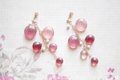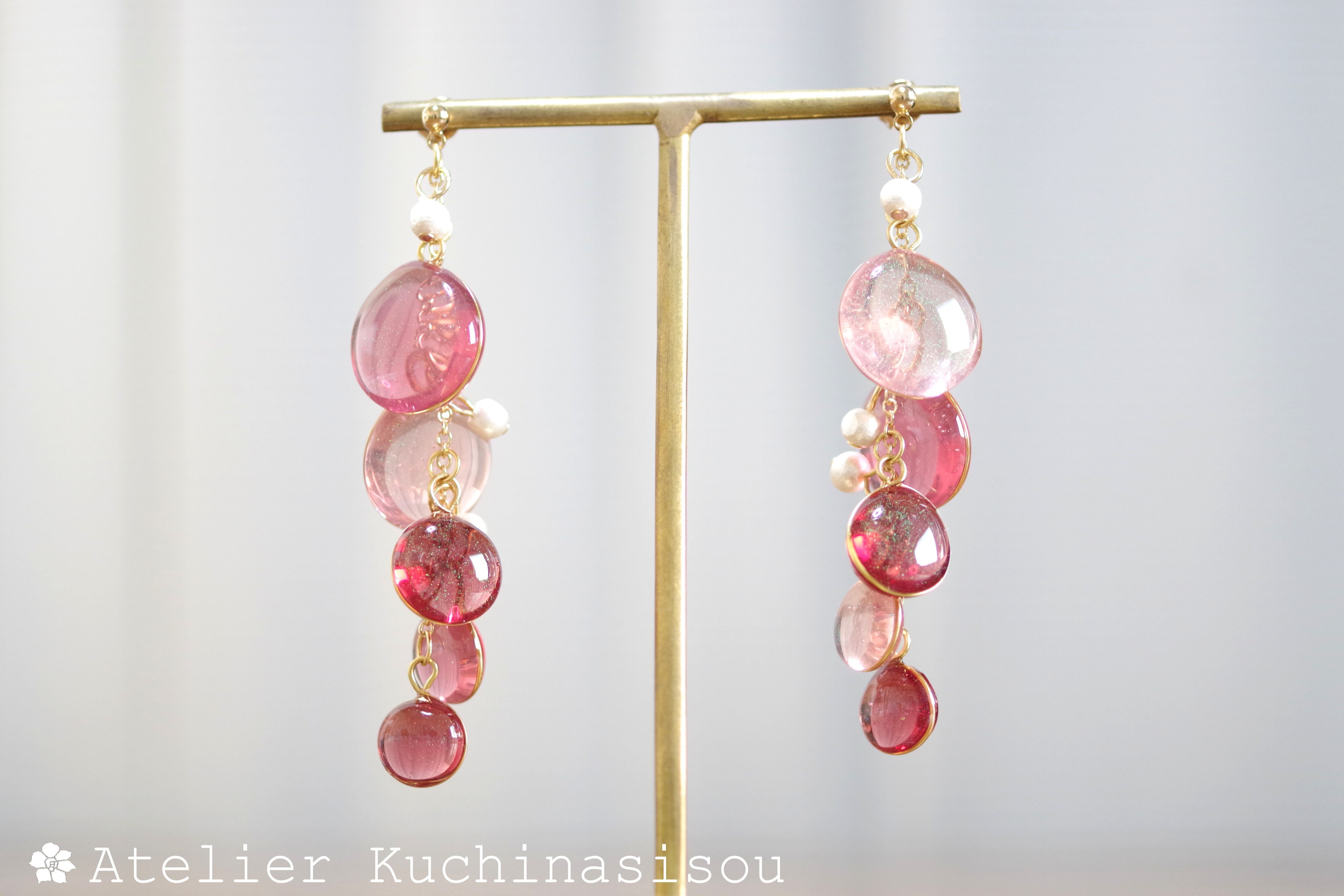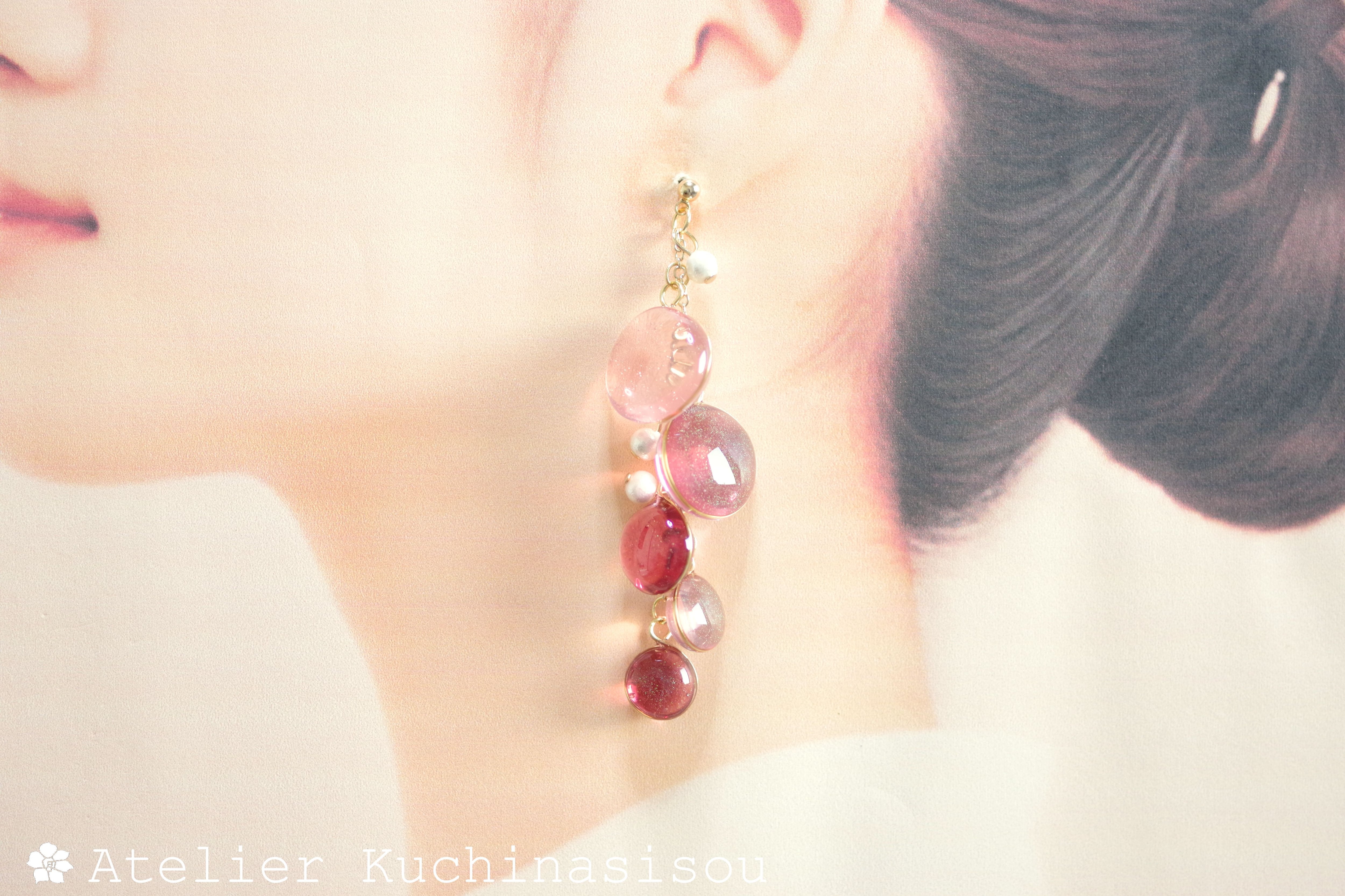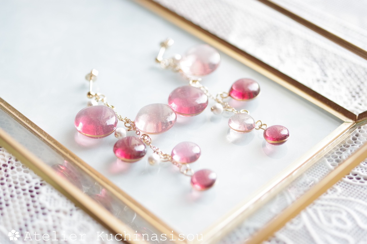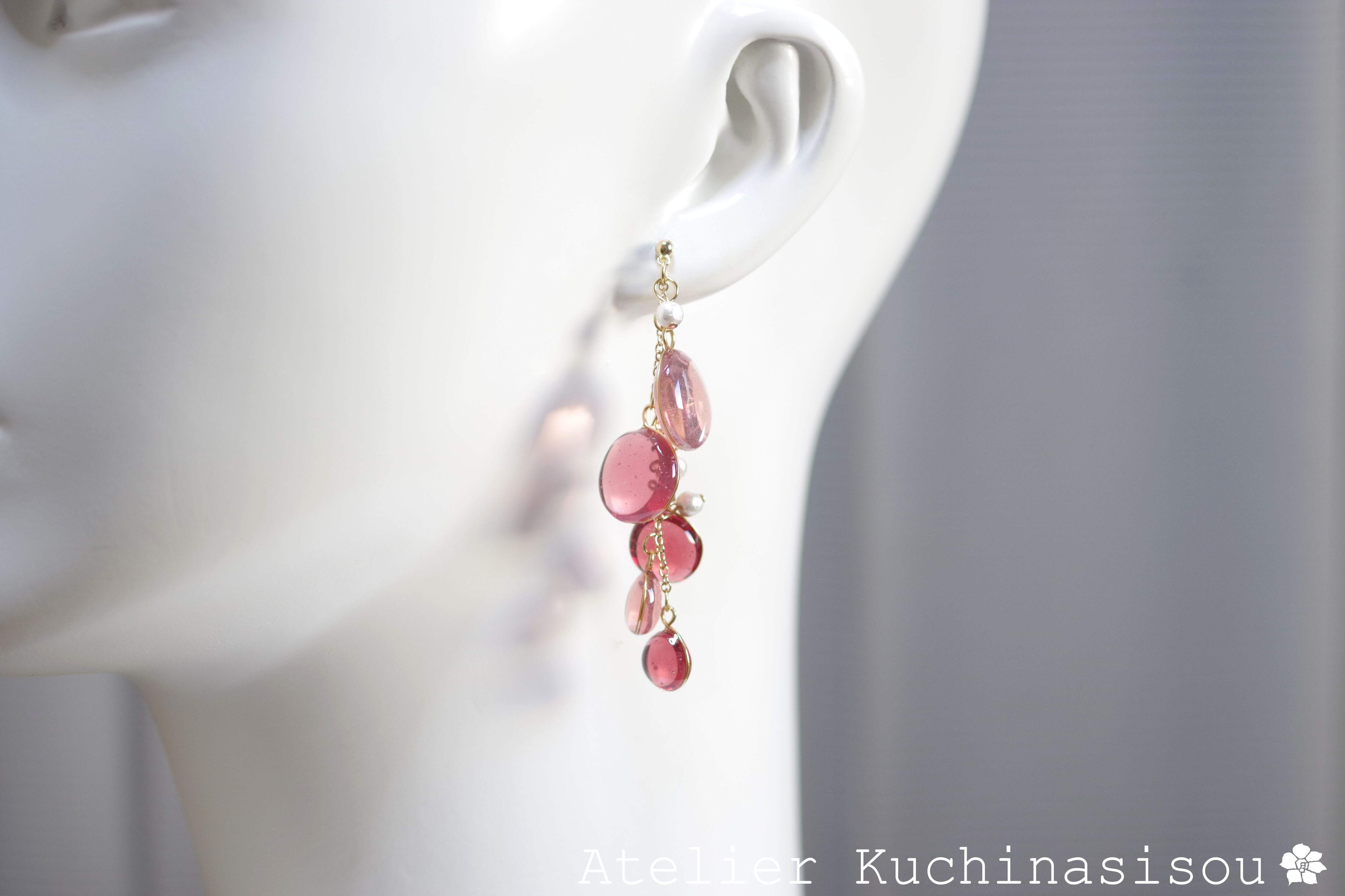 大小のレジンのラウンドモチーフがまるで転がり落ちる水滴のようで、その透明感に思わず魅入ってしまうピアス。