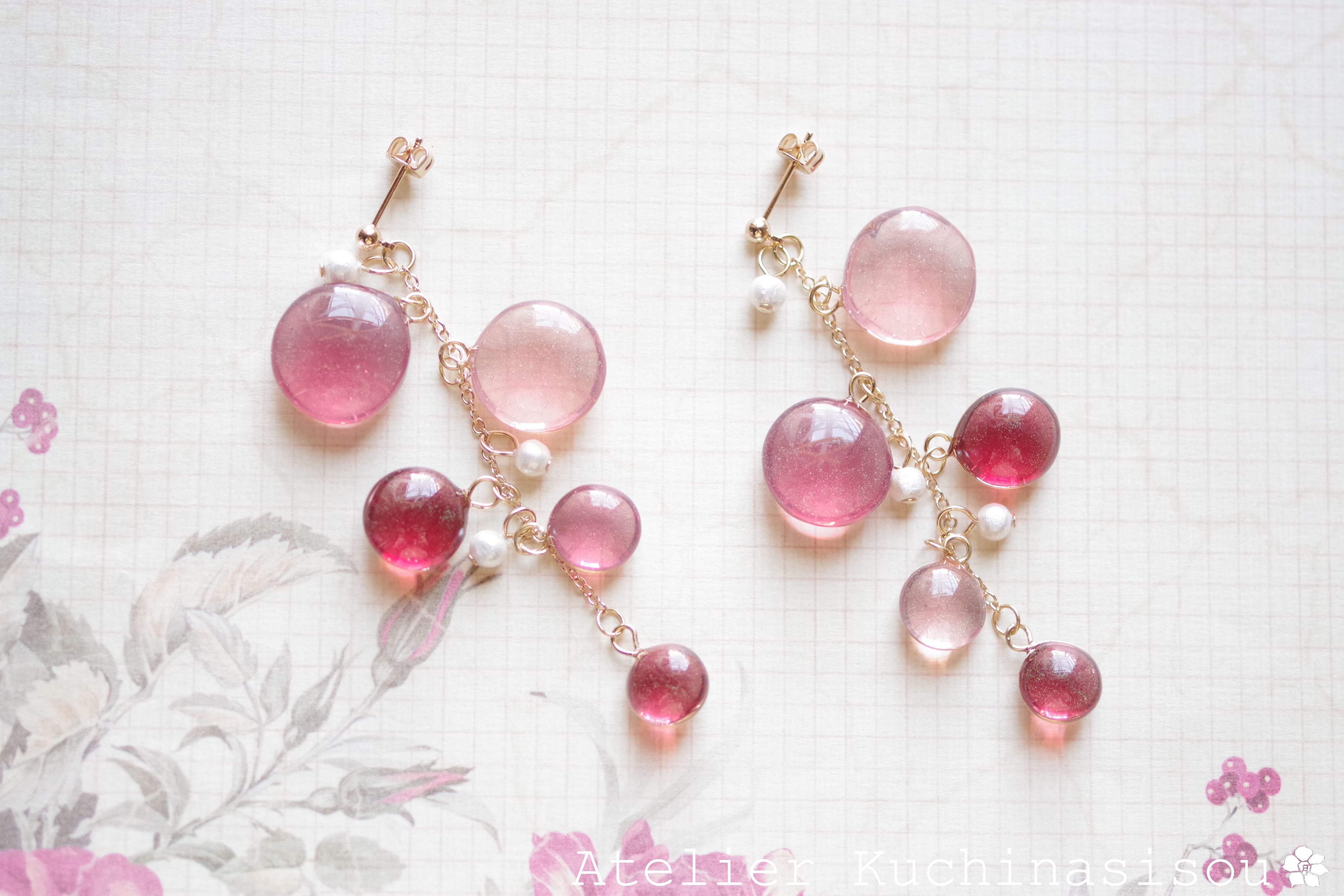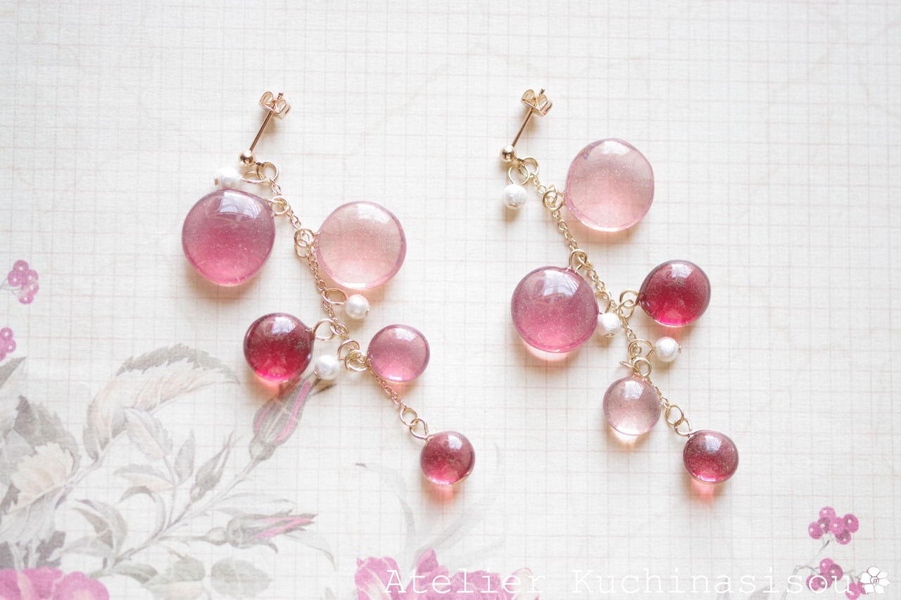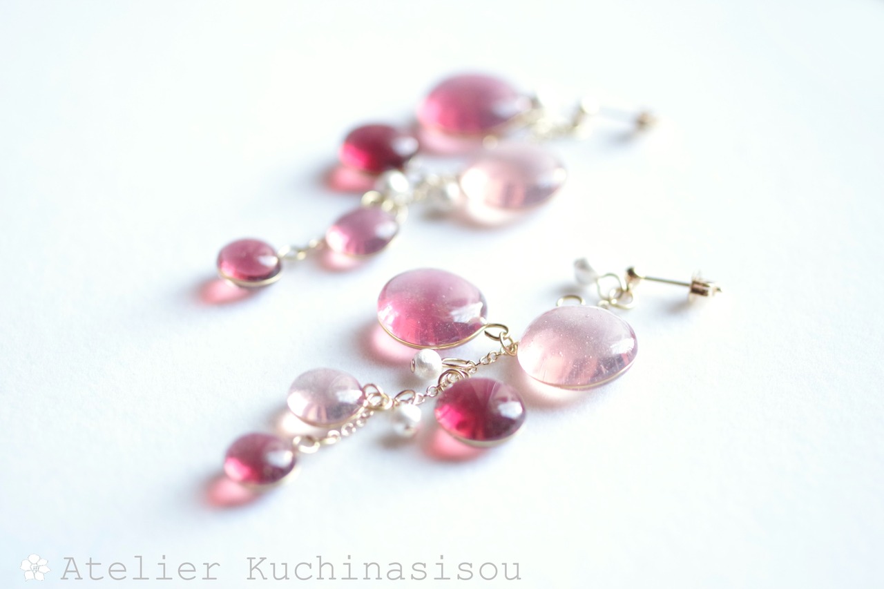 レジンで水滴のようなラウンドモチーフを連ねたピアスを作りました♪