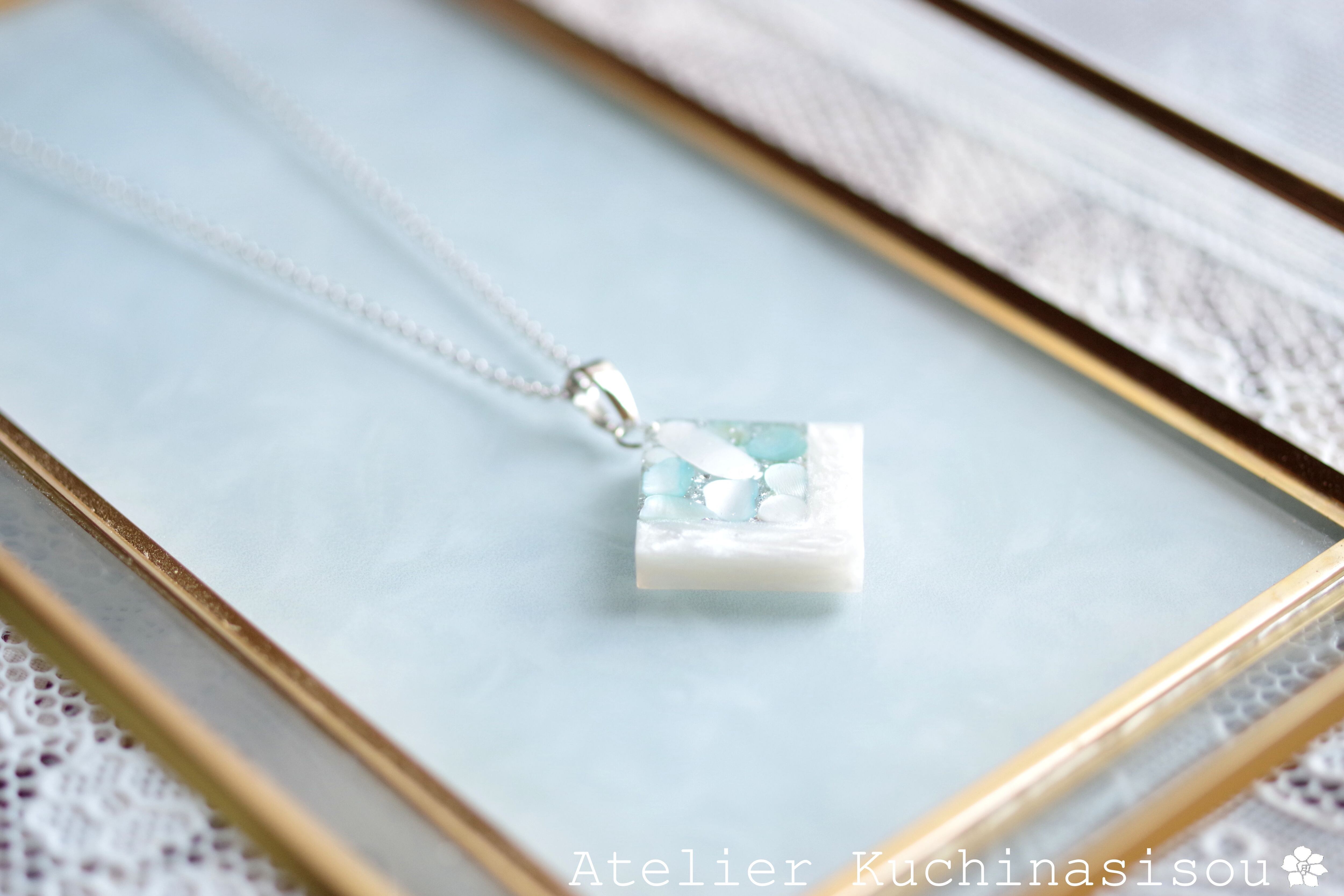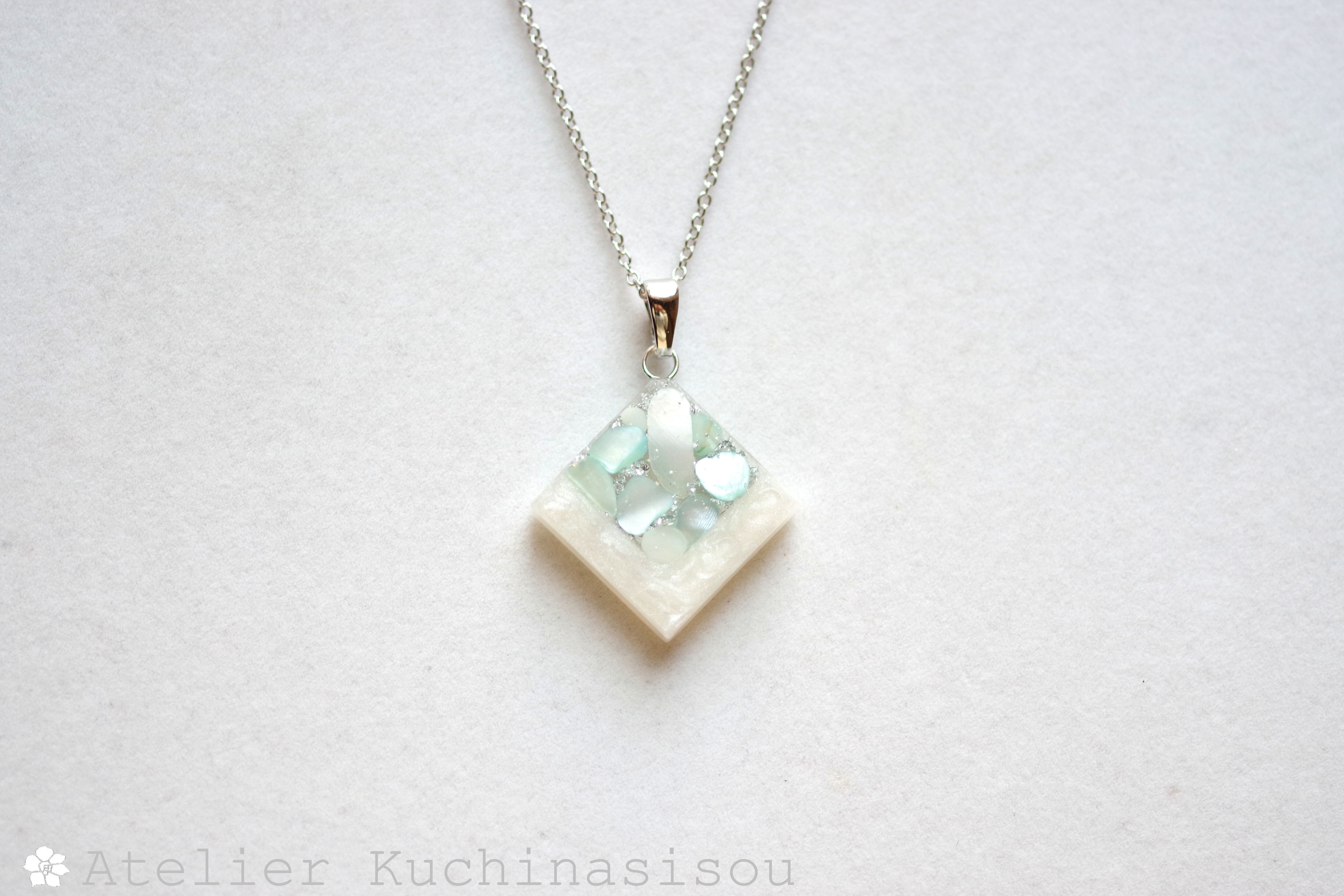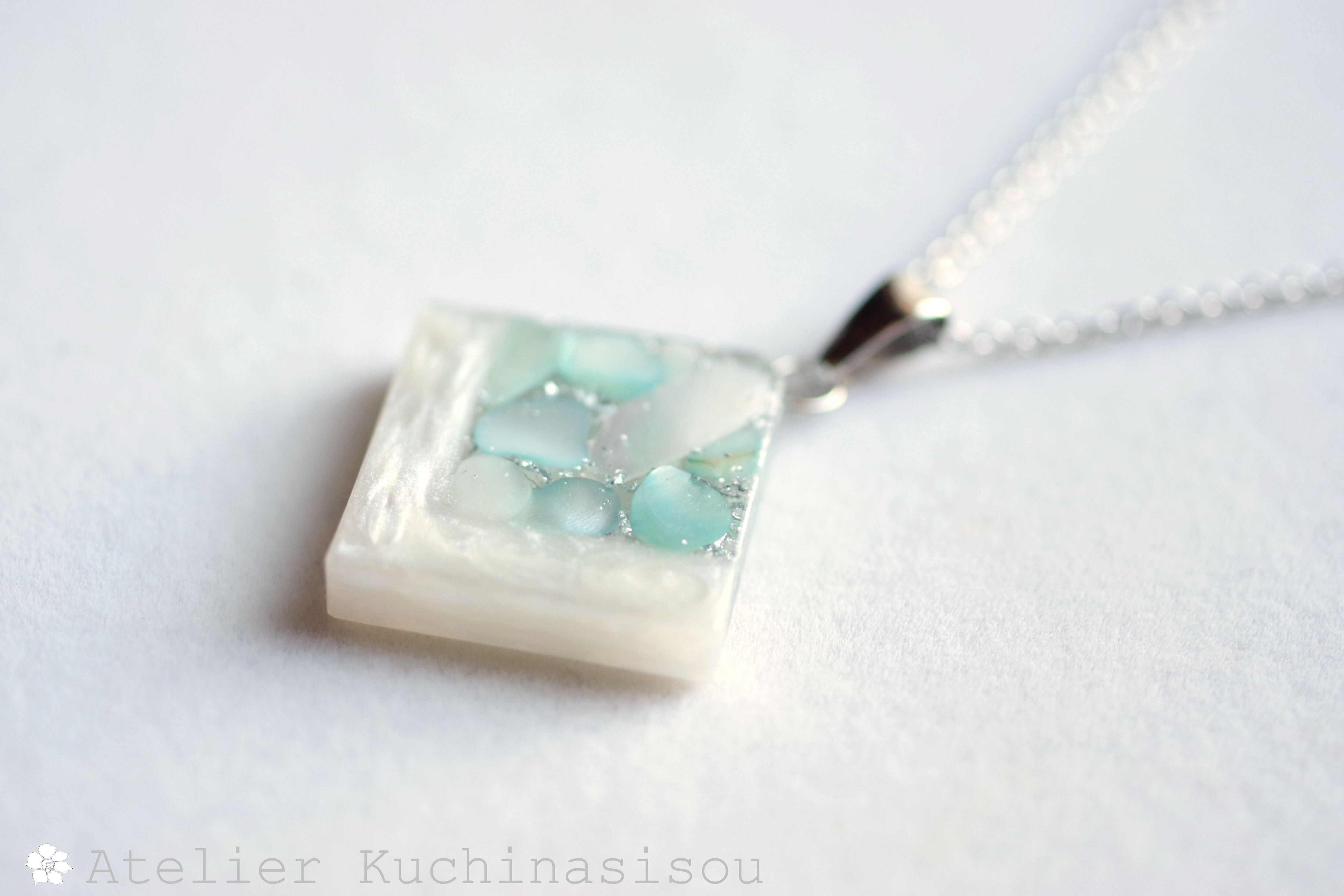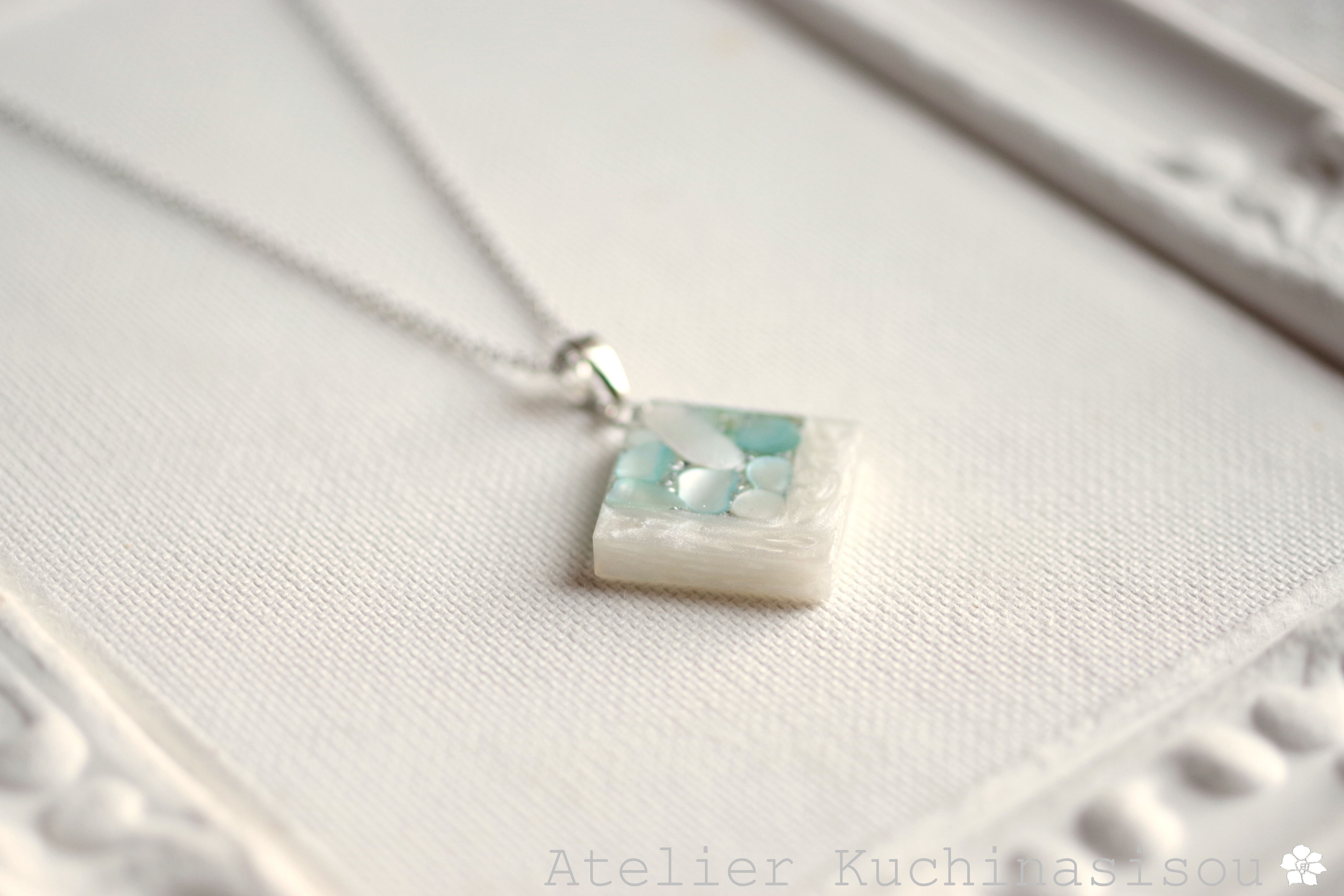 透明のレジンにホワイトシェルと静謐さを感じさせるアクアマリンに着色されたシェルを沈め、光沢のあるホワイトで囲ったペンダント。