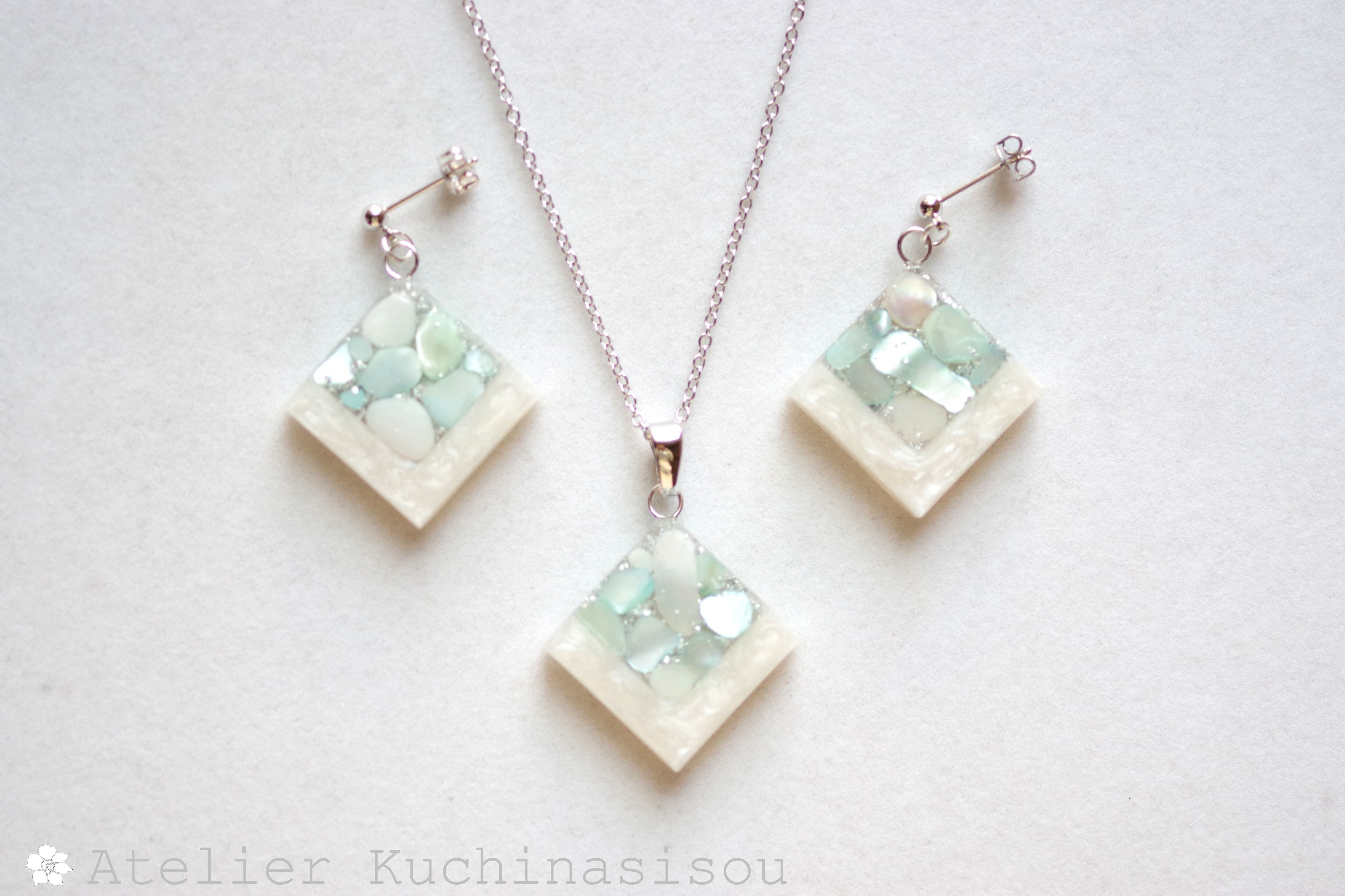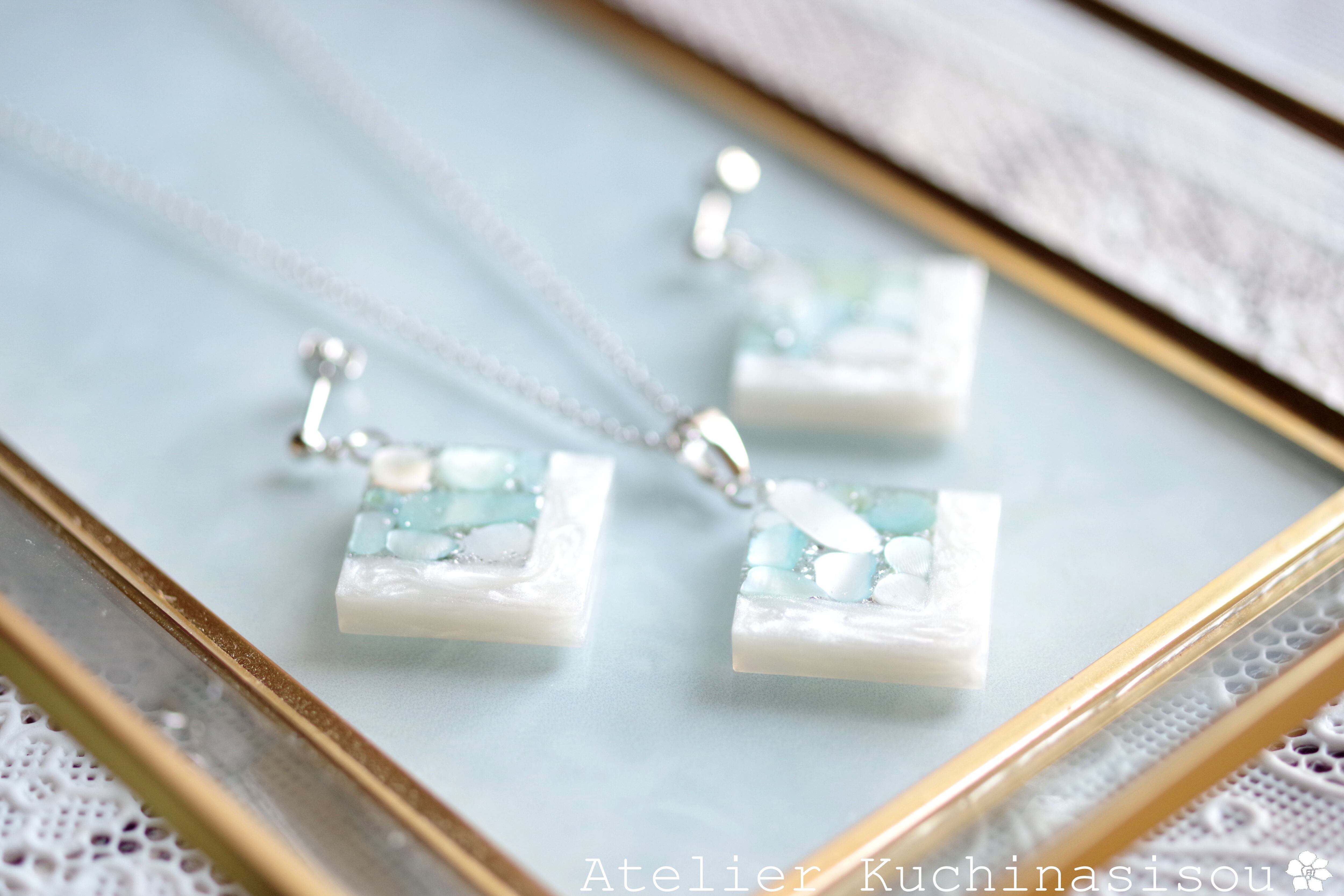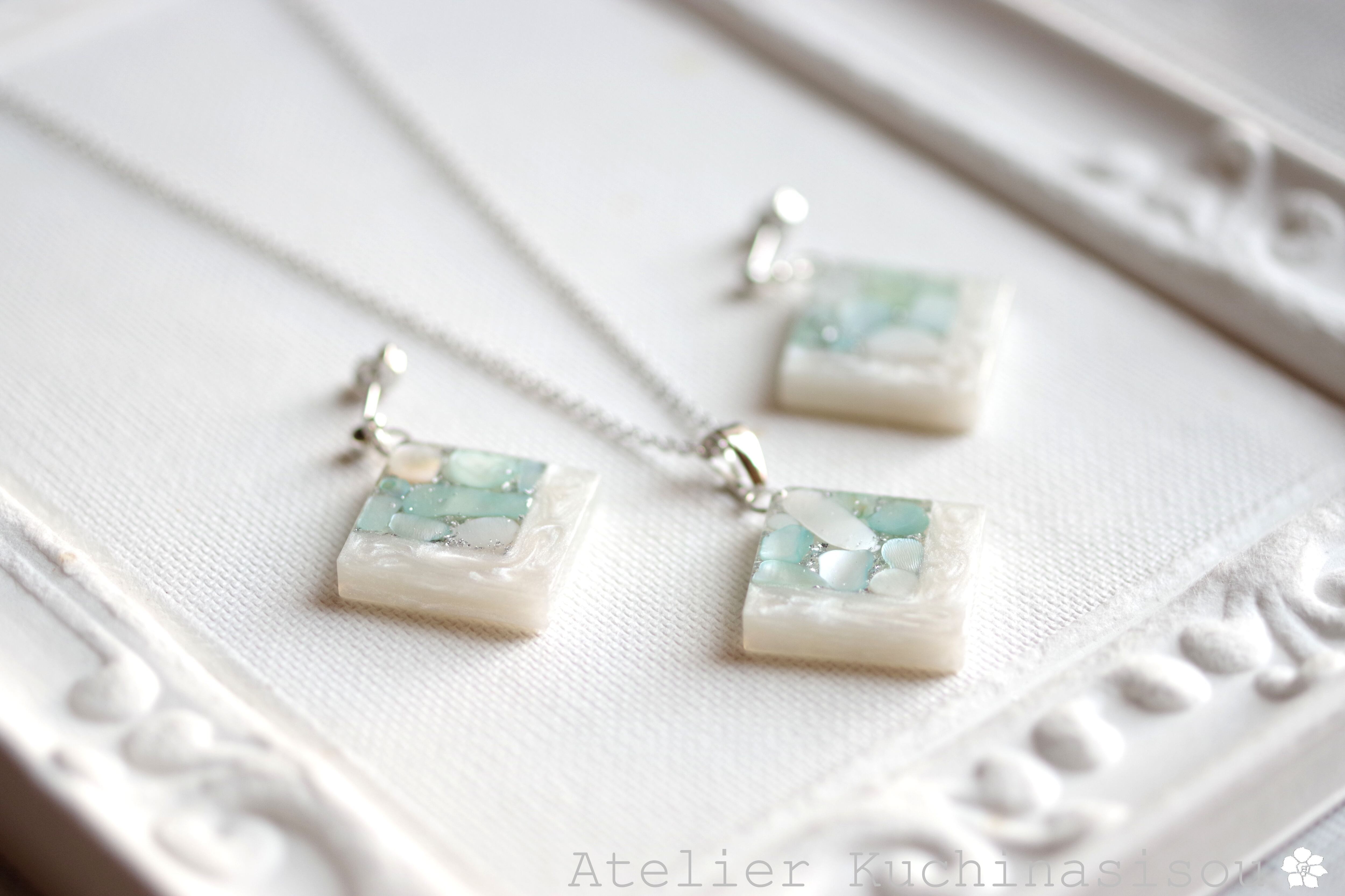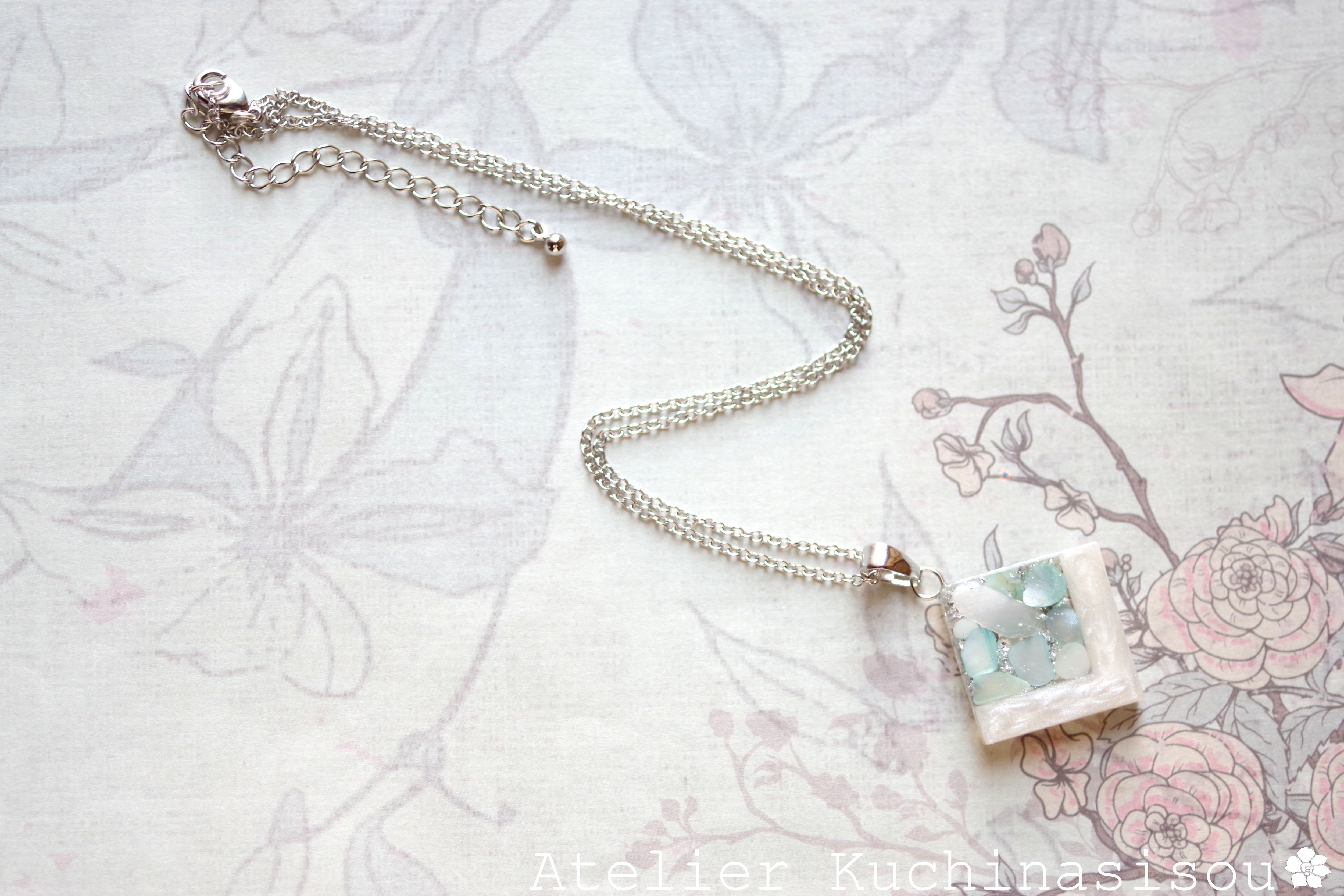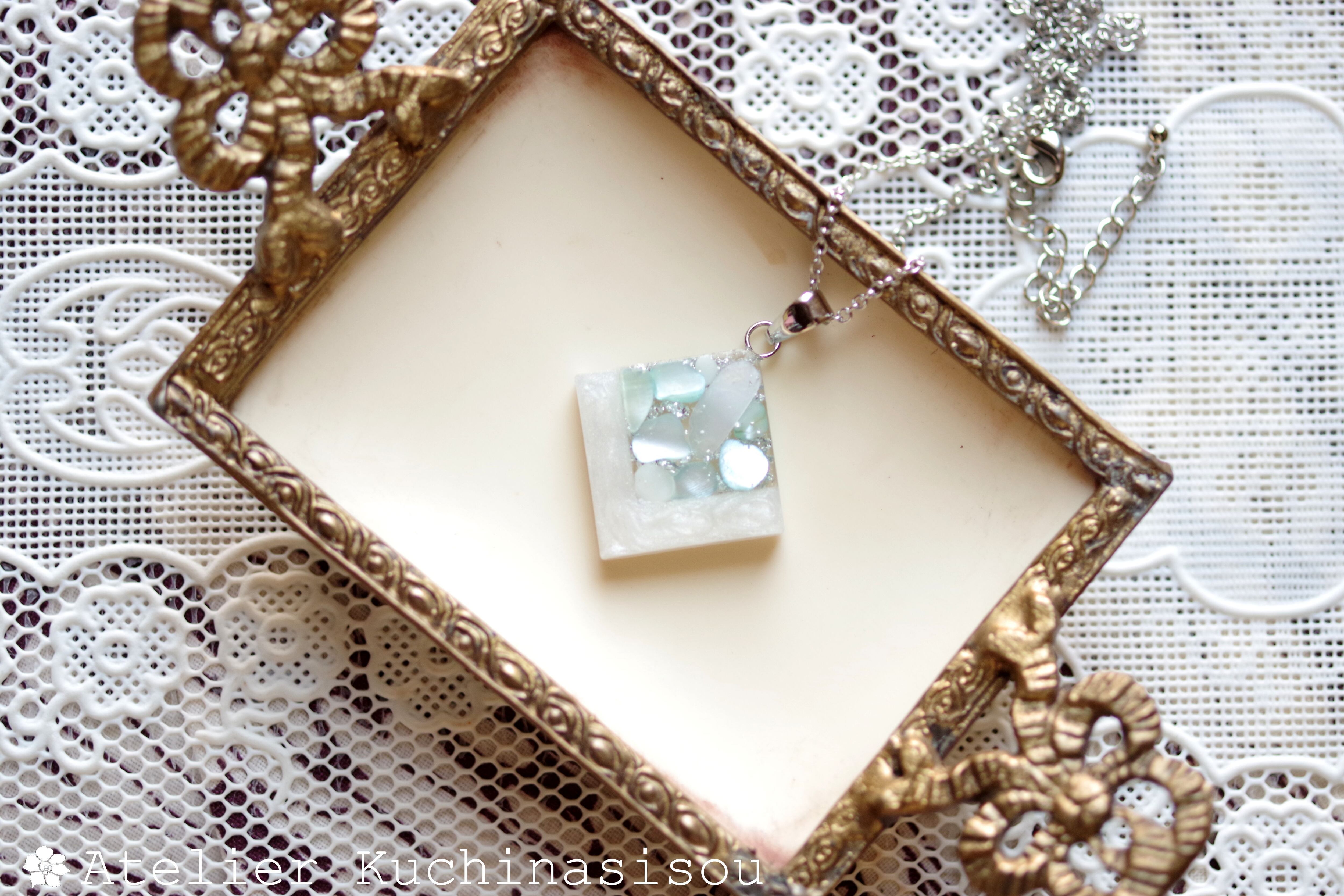 透明のレジンにホワイトシェルと静謐さを感じさせるアクアマリンに着色されたシェルを沈め、光沢のあるホワイトで囲ったペンダント。