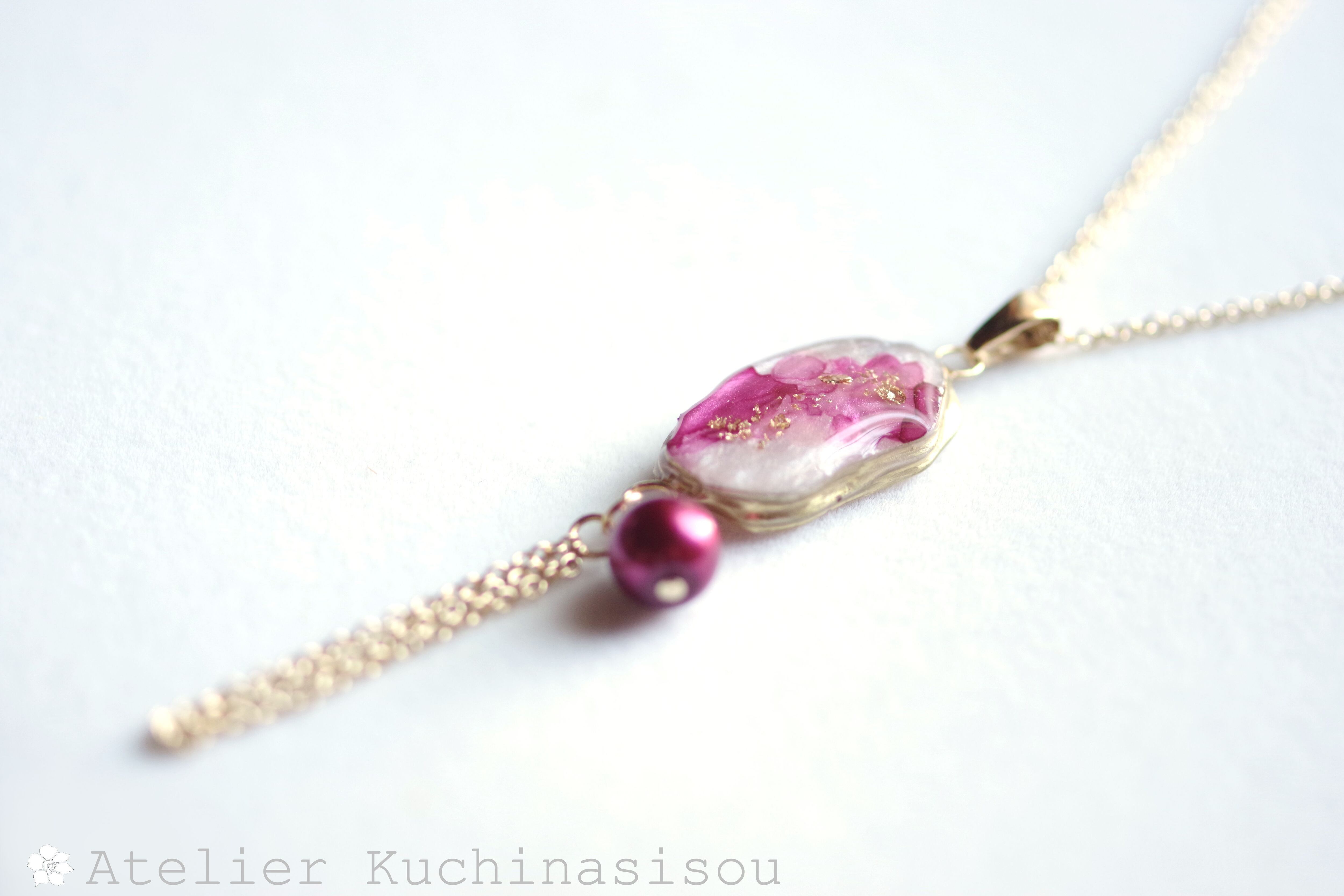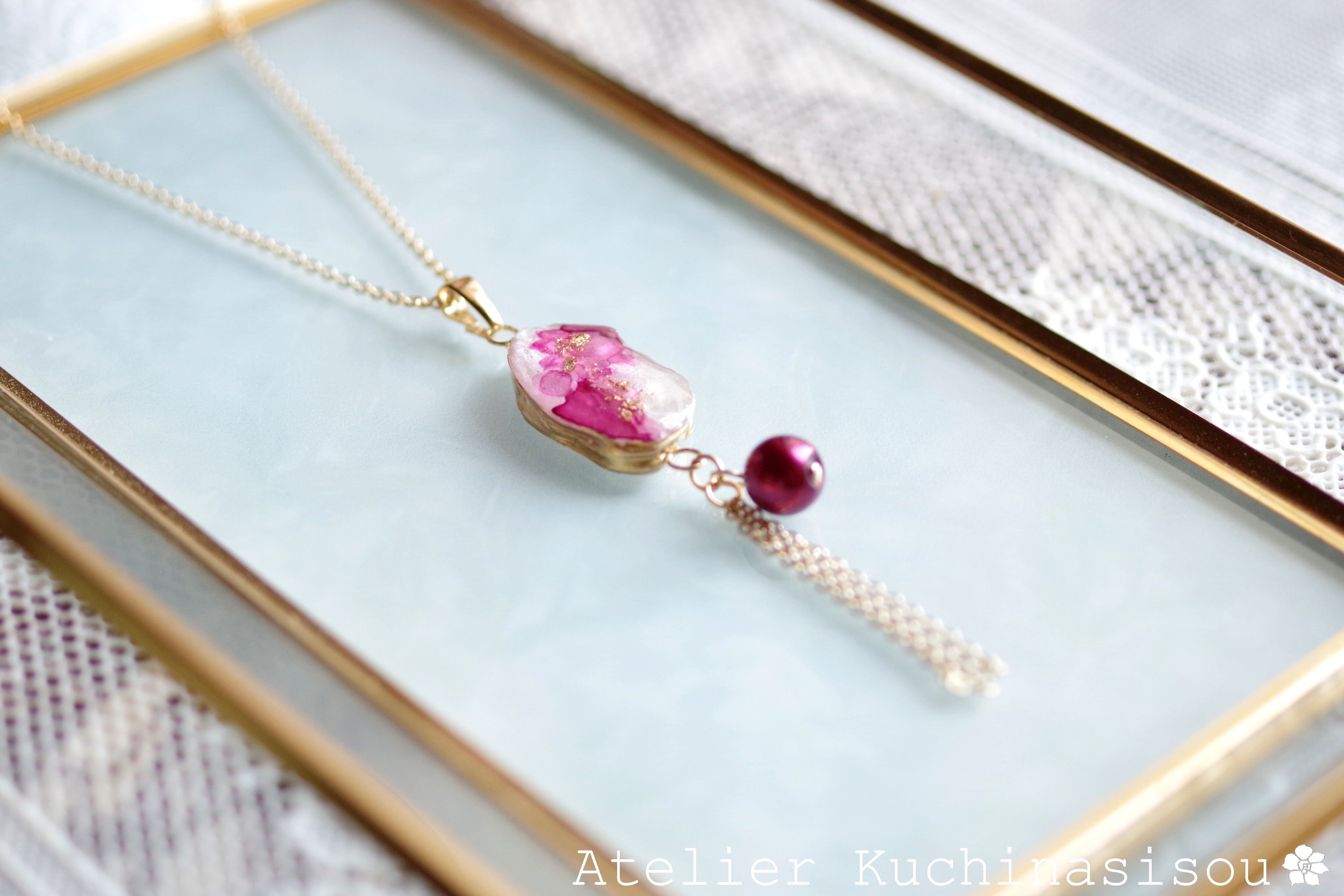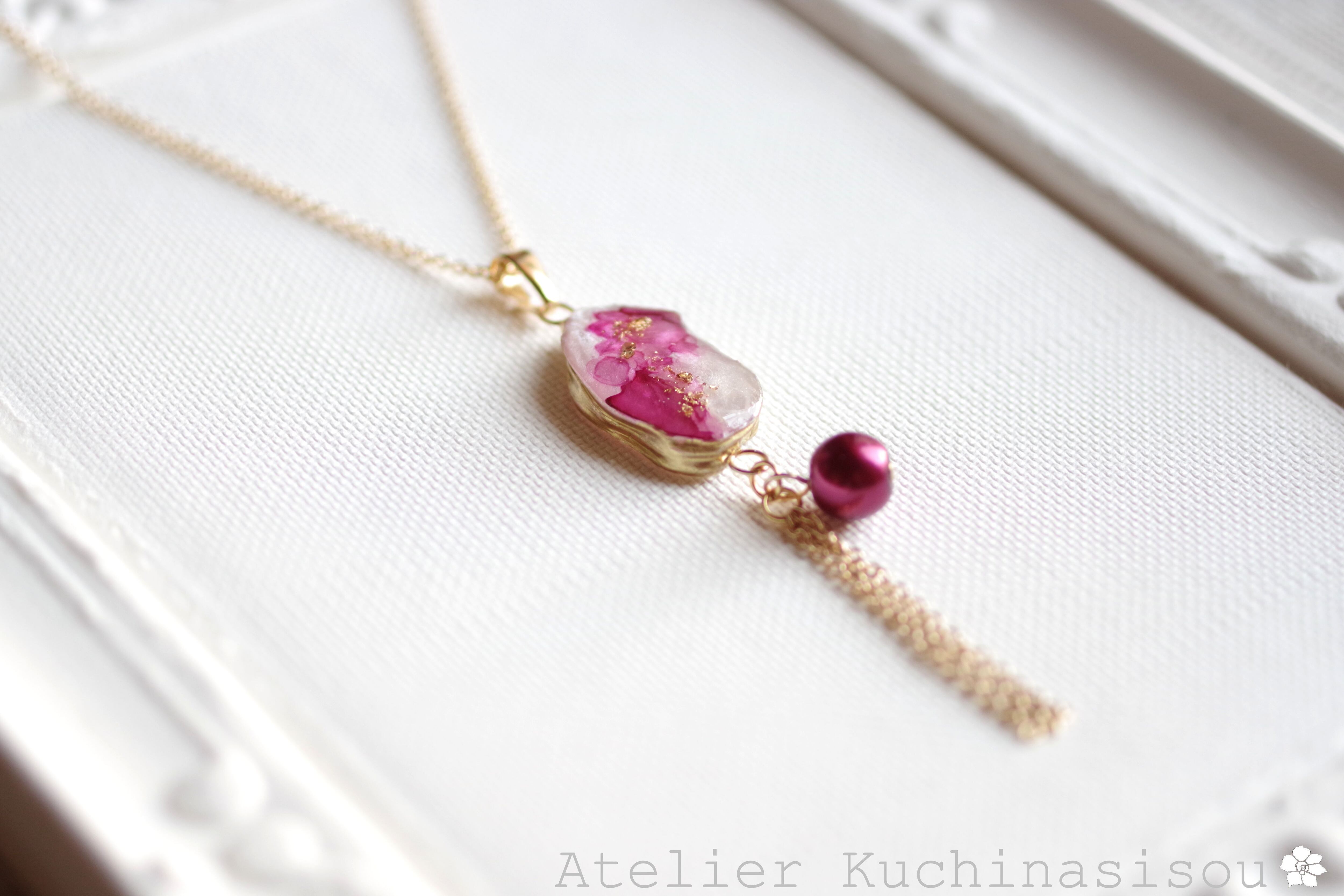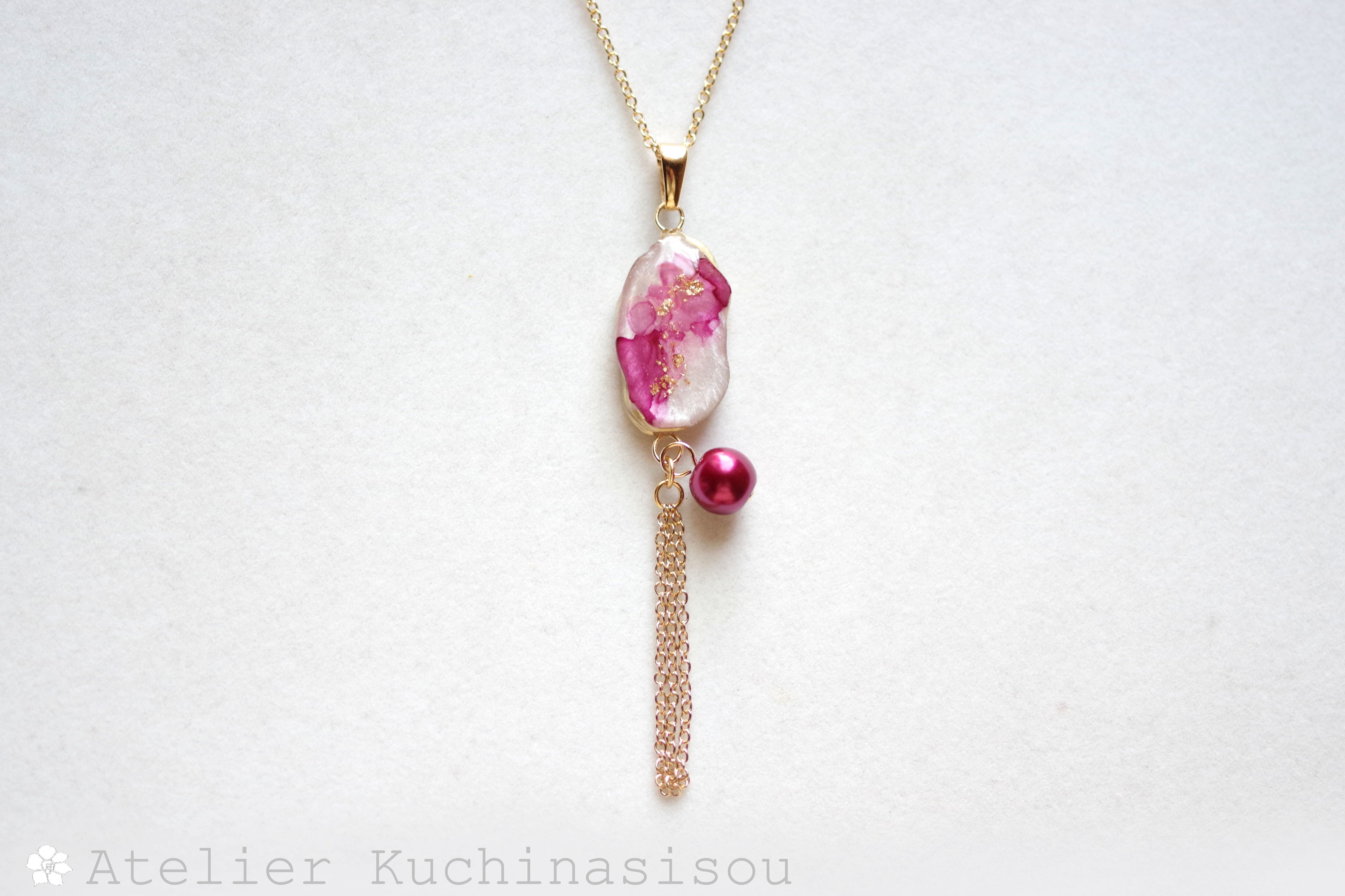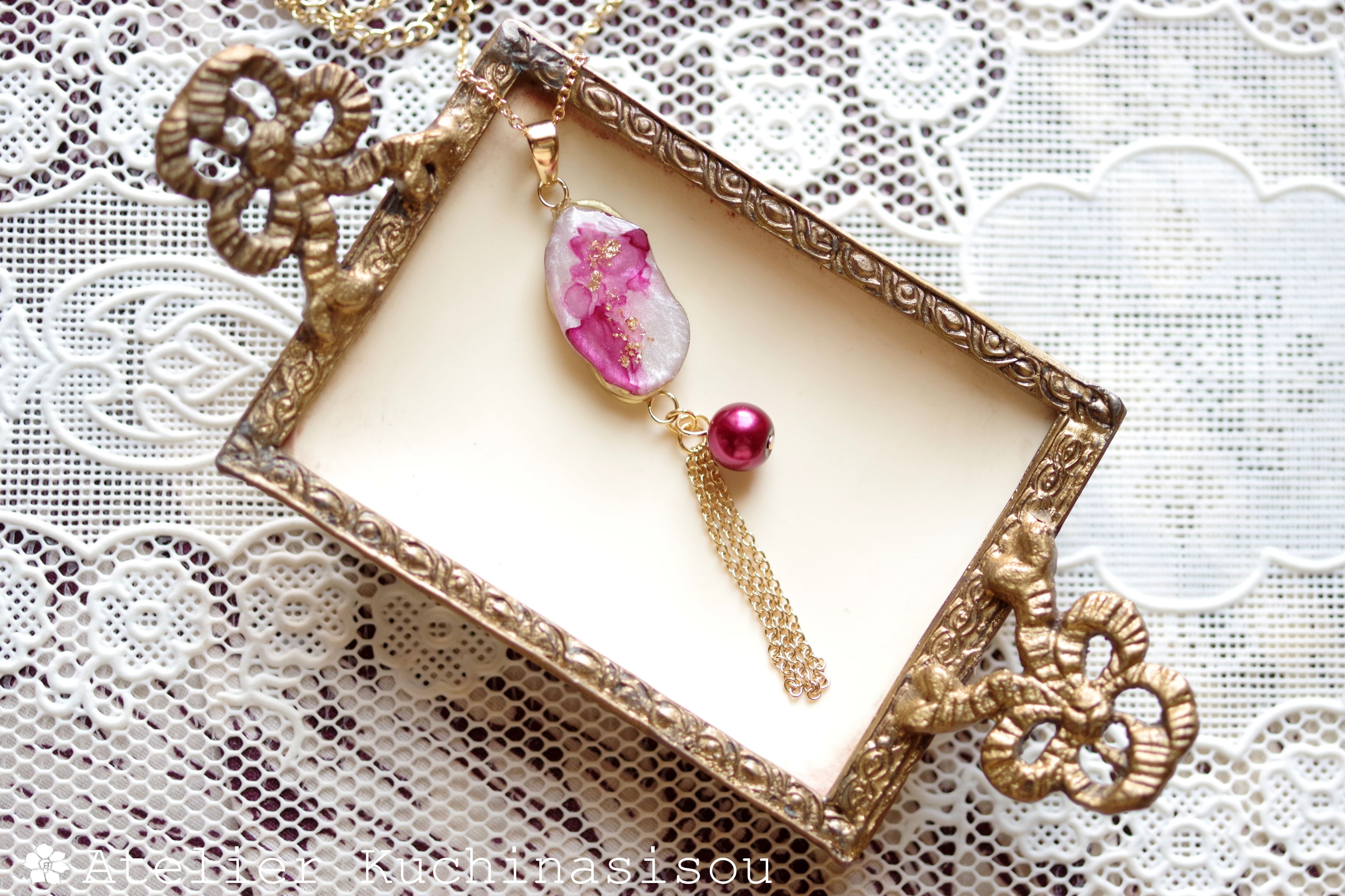 スライスアゲートのような光沢のある白いレジンにピンクの模様を描き、ガラスパールとフリンジを添えたペンダント。