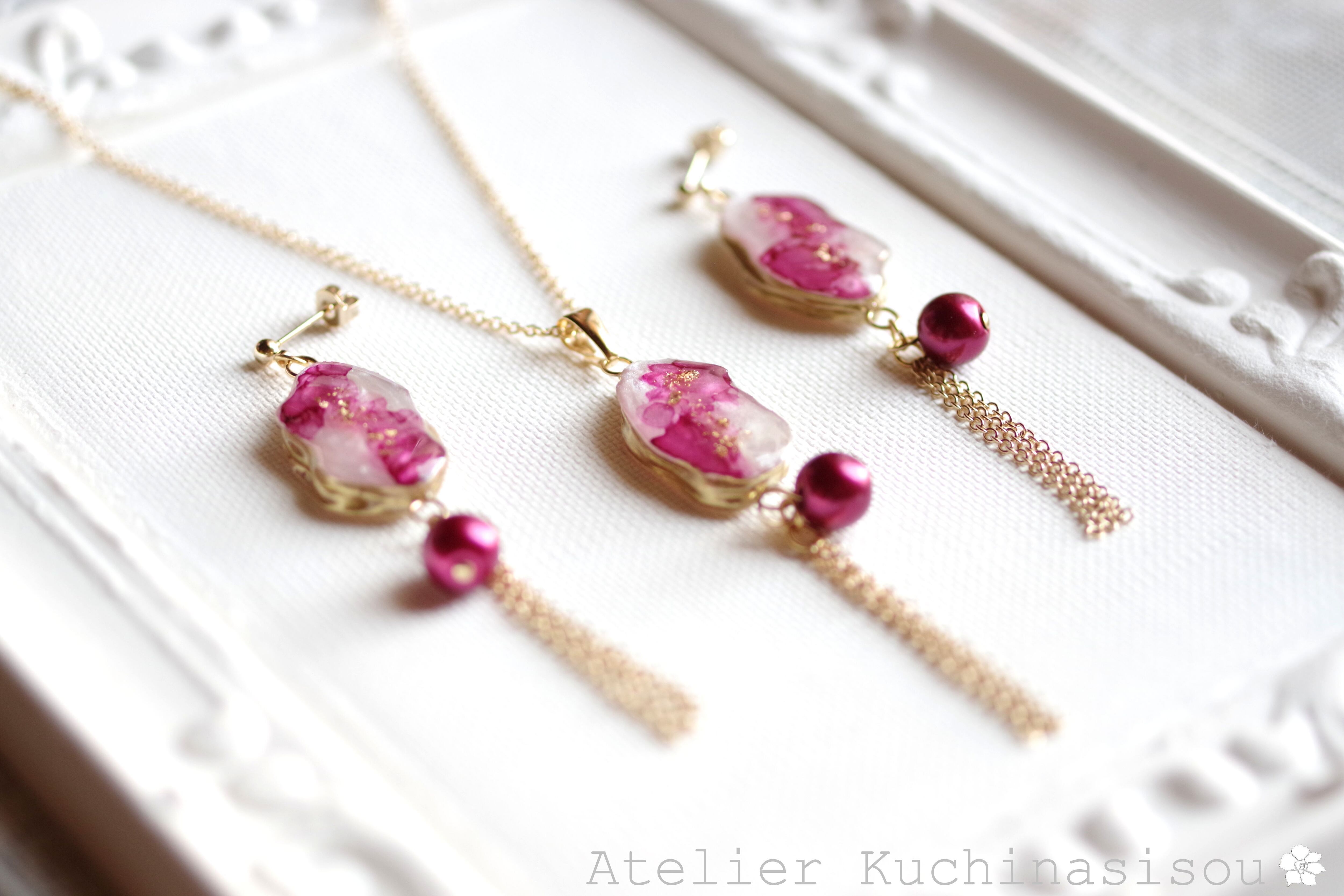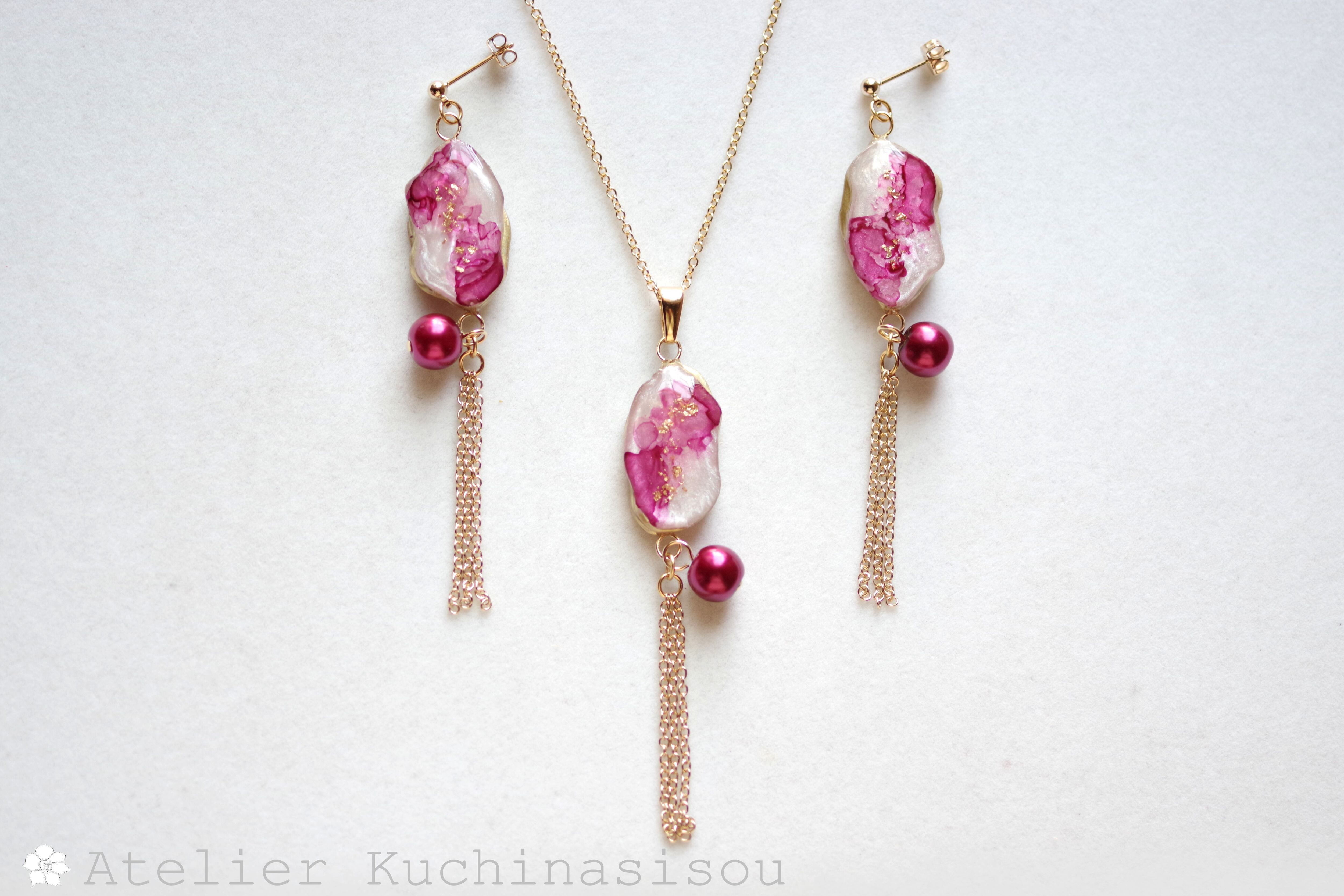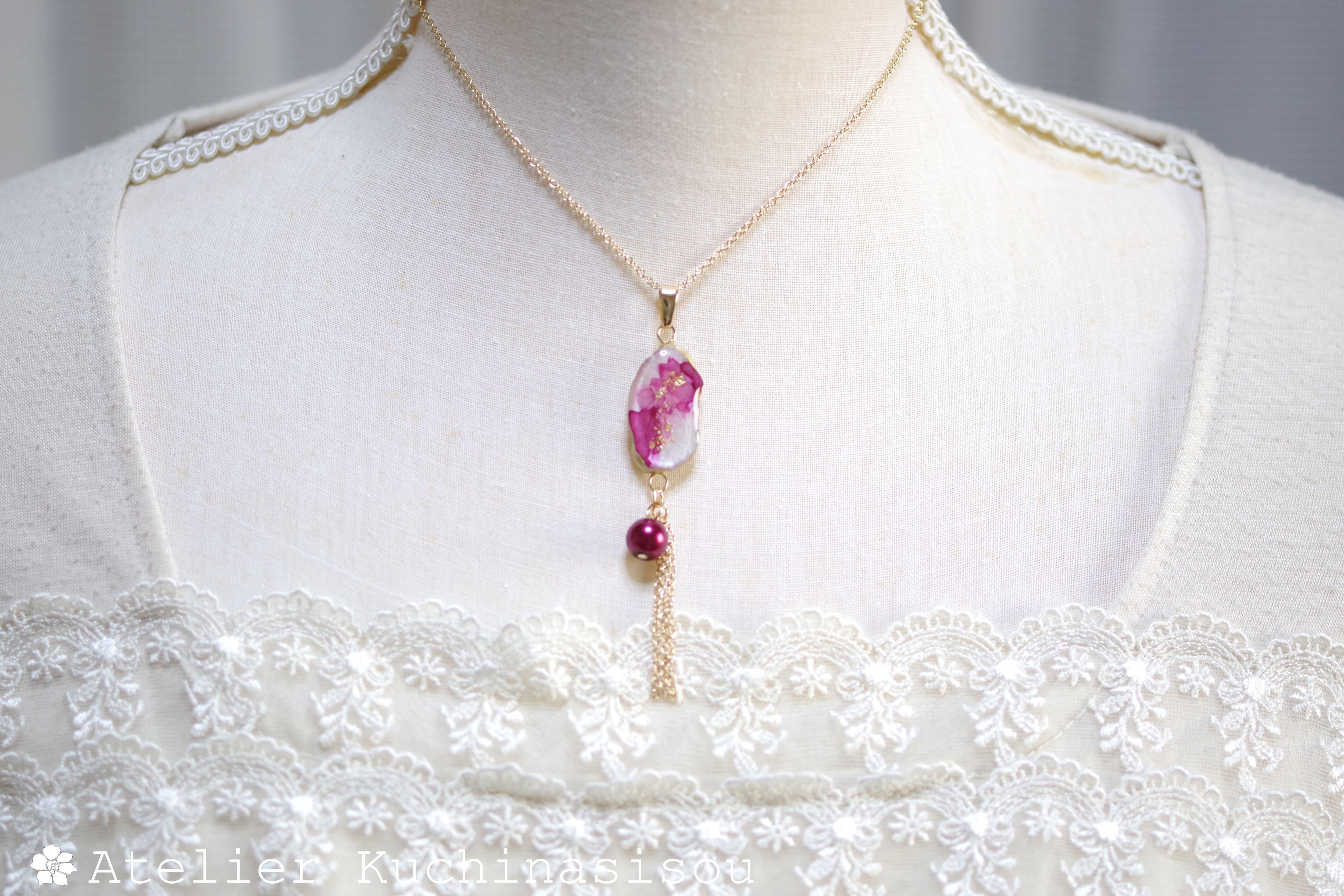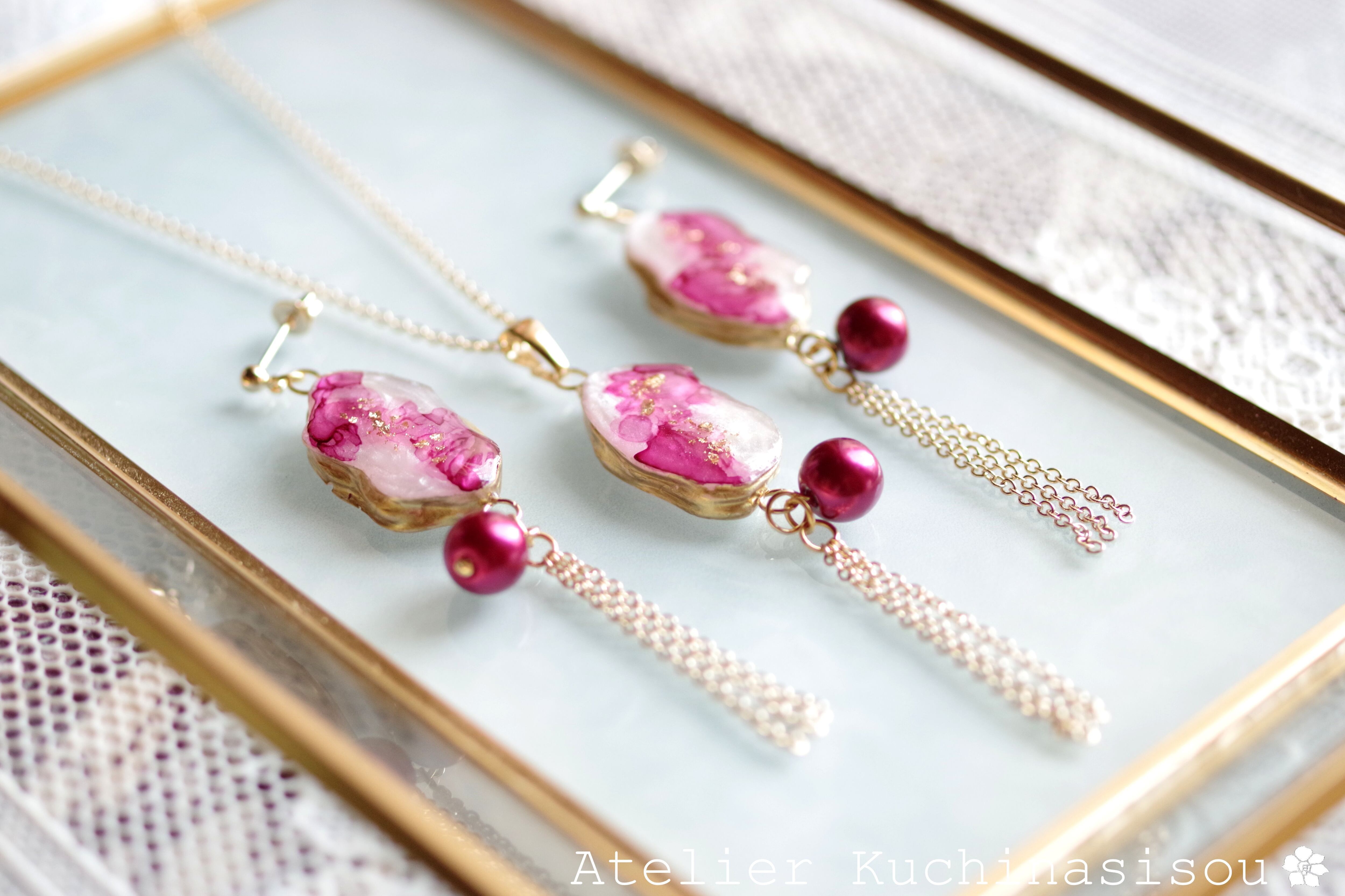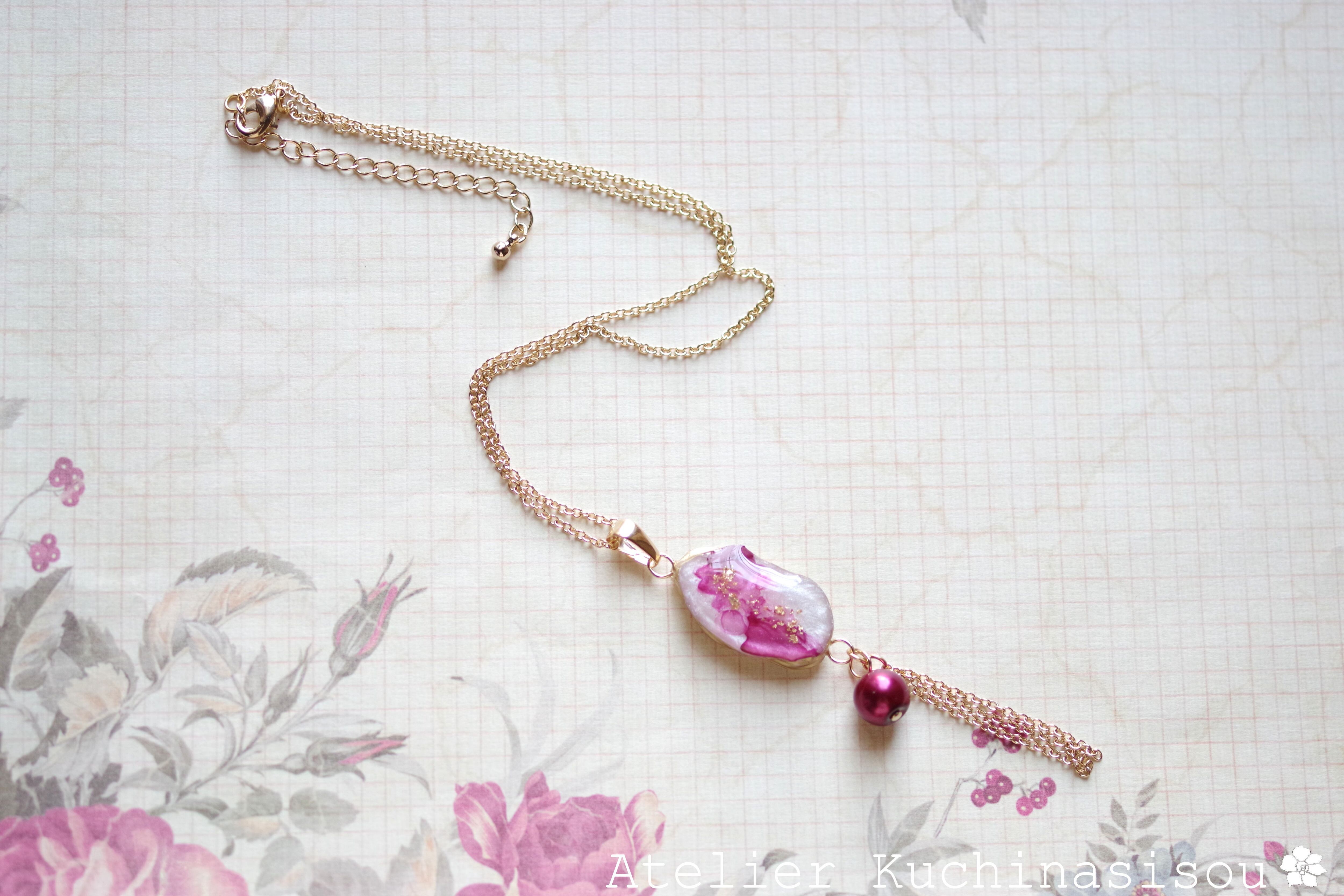 スライスアゲートのような光沢のある白いレジンにピンクの模様を描き、ガラスパールとフリンジを添えたペンダント。