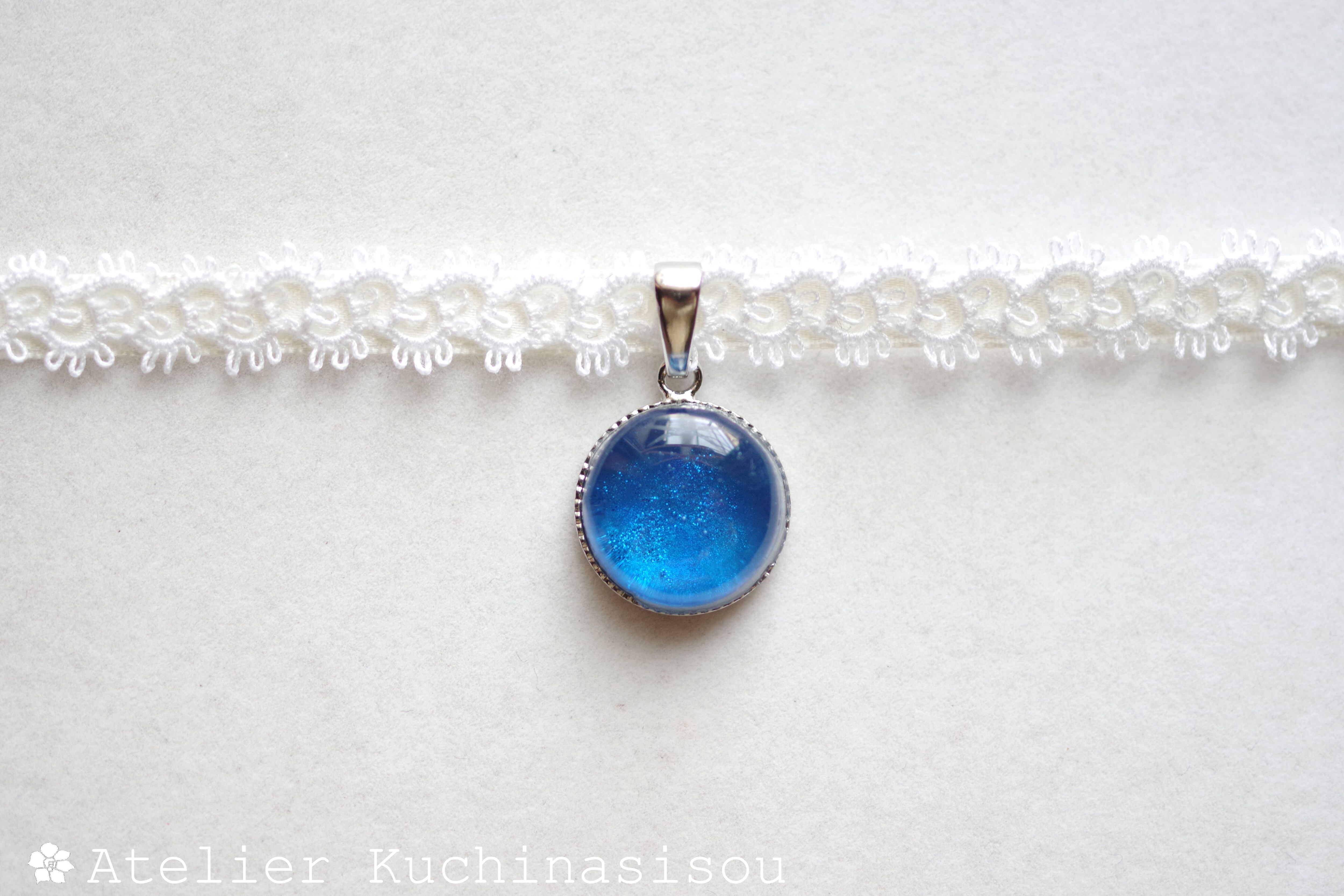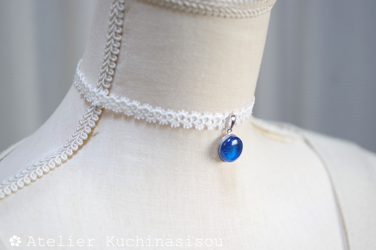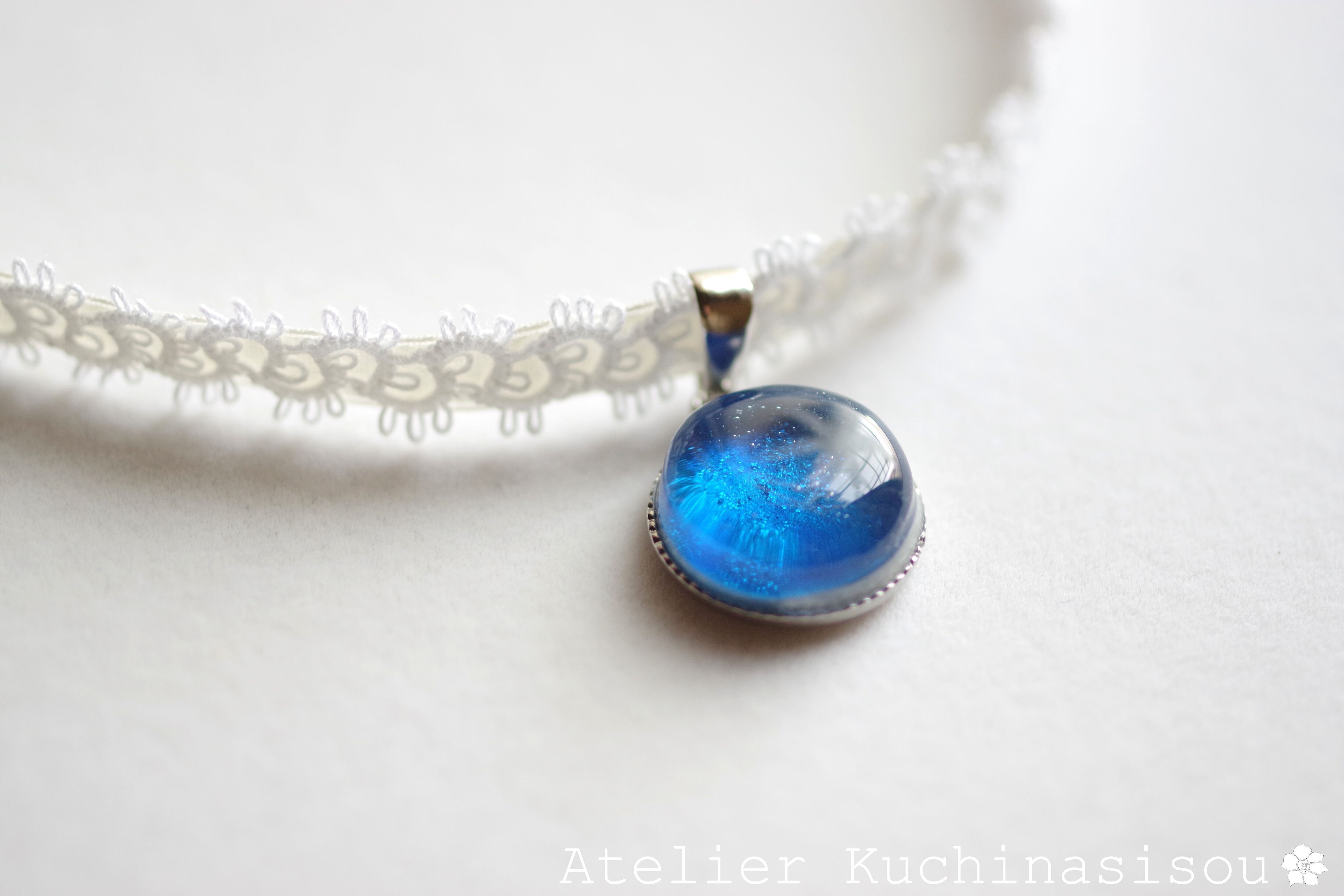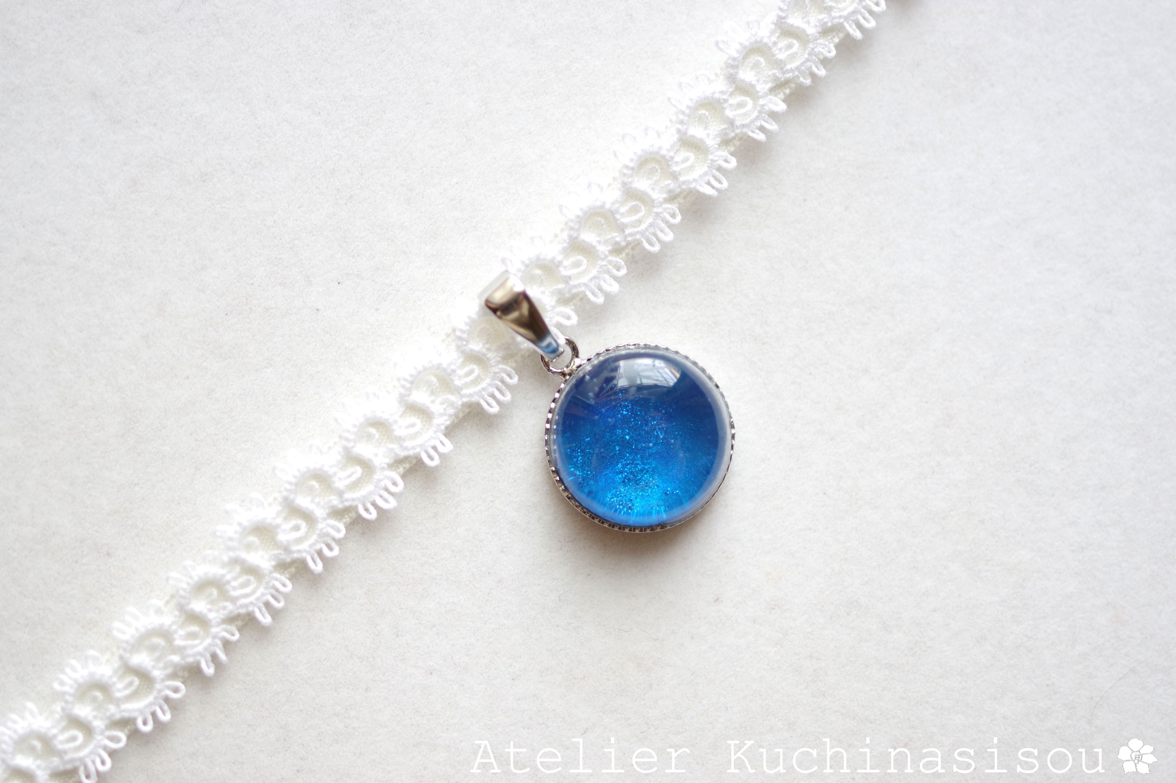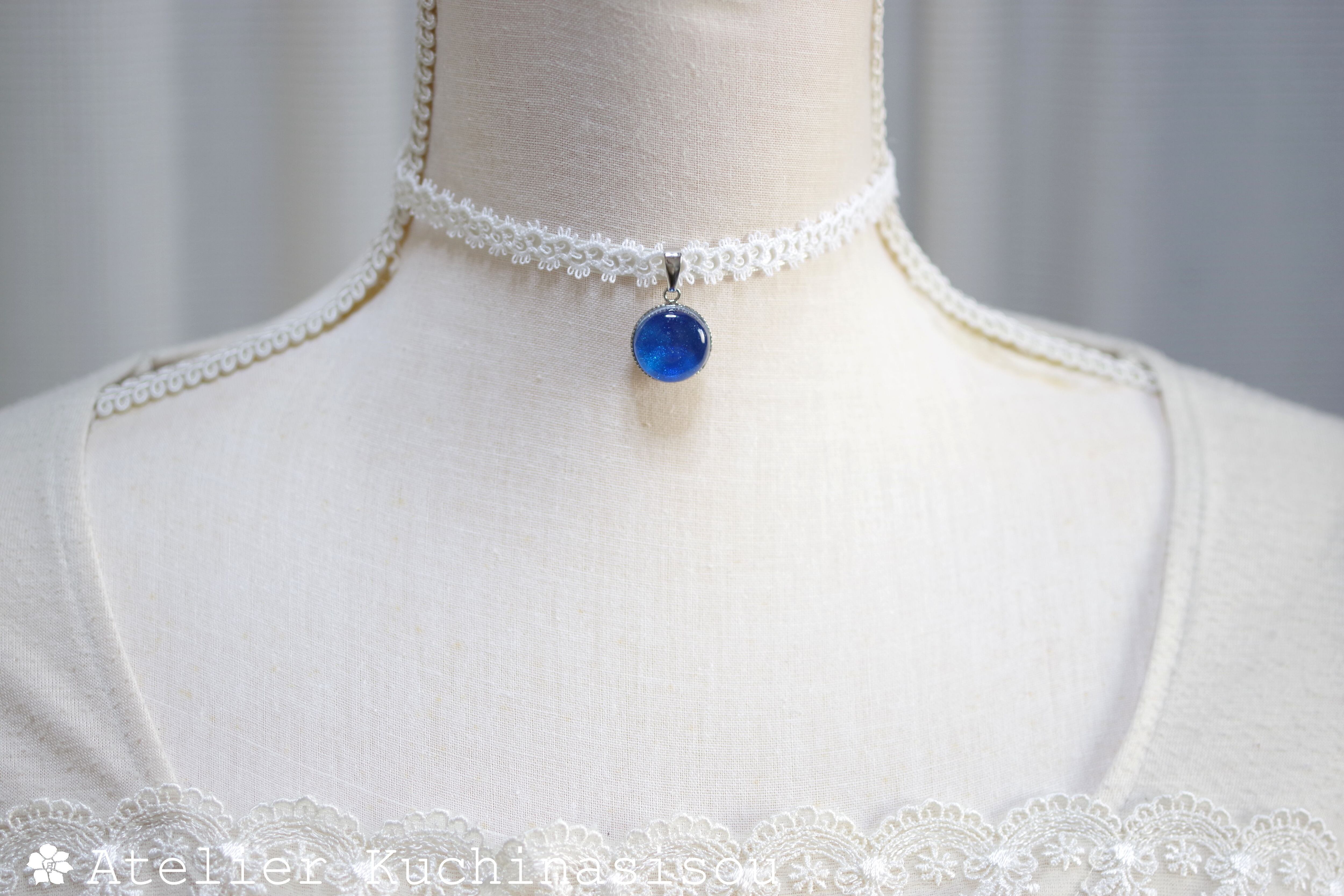 真冬の夜空を思わせる深く鮮やかなブルーと、煌めく星のようなラメの輝きが美しいレジンを、サテンリボンにタティングレースで装飾を施したチョーカーに仕上げました。