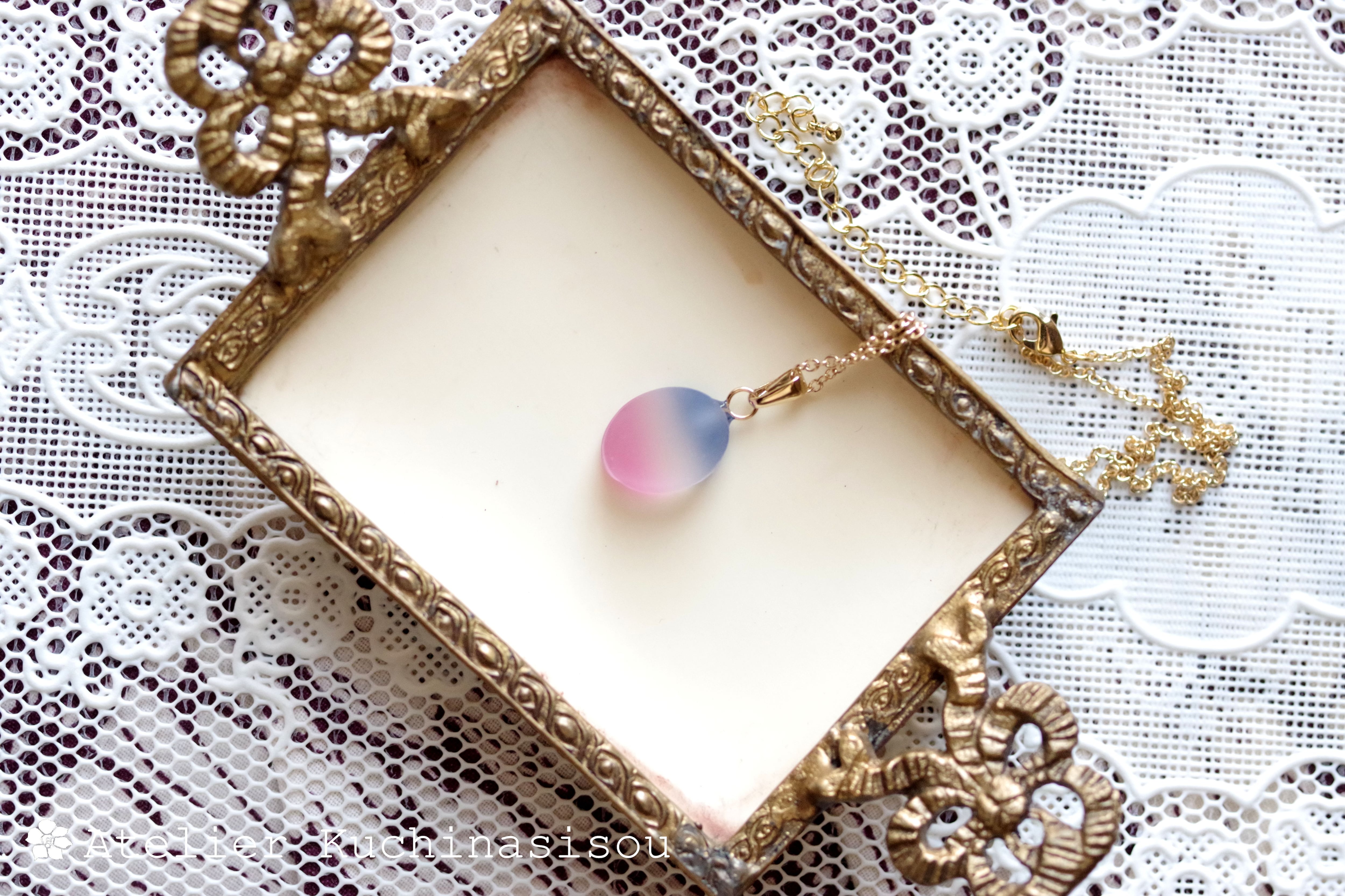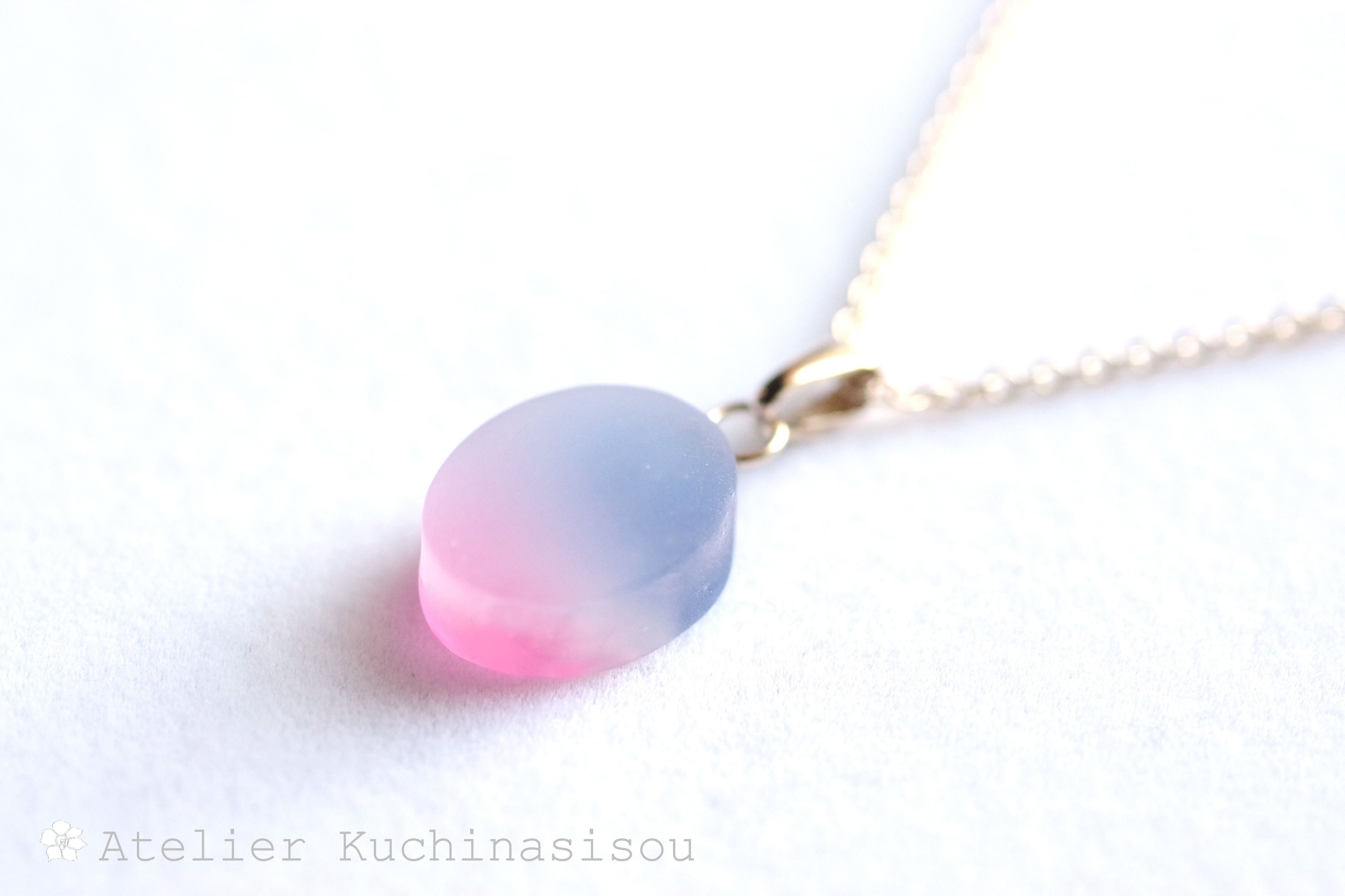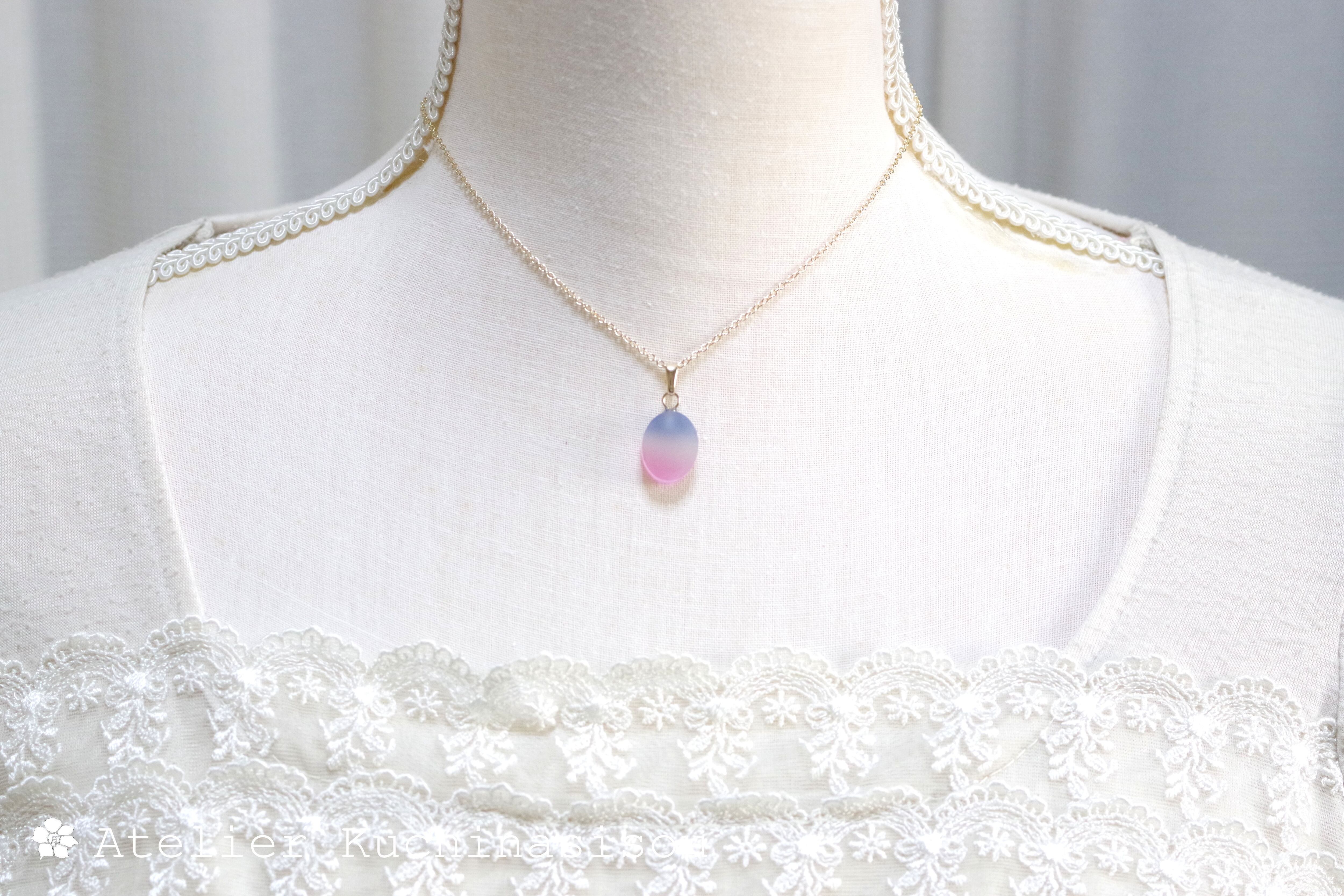 すりガラスのような柔らかな風合いと、そこからほのかに覗く鮮やかな青とピンクが美しいペンダント。