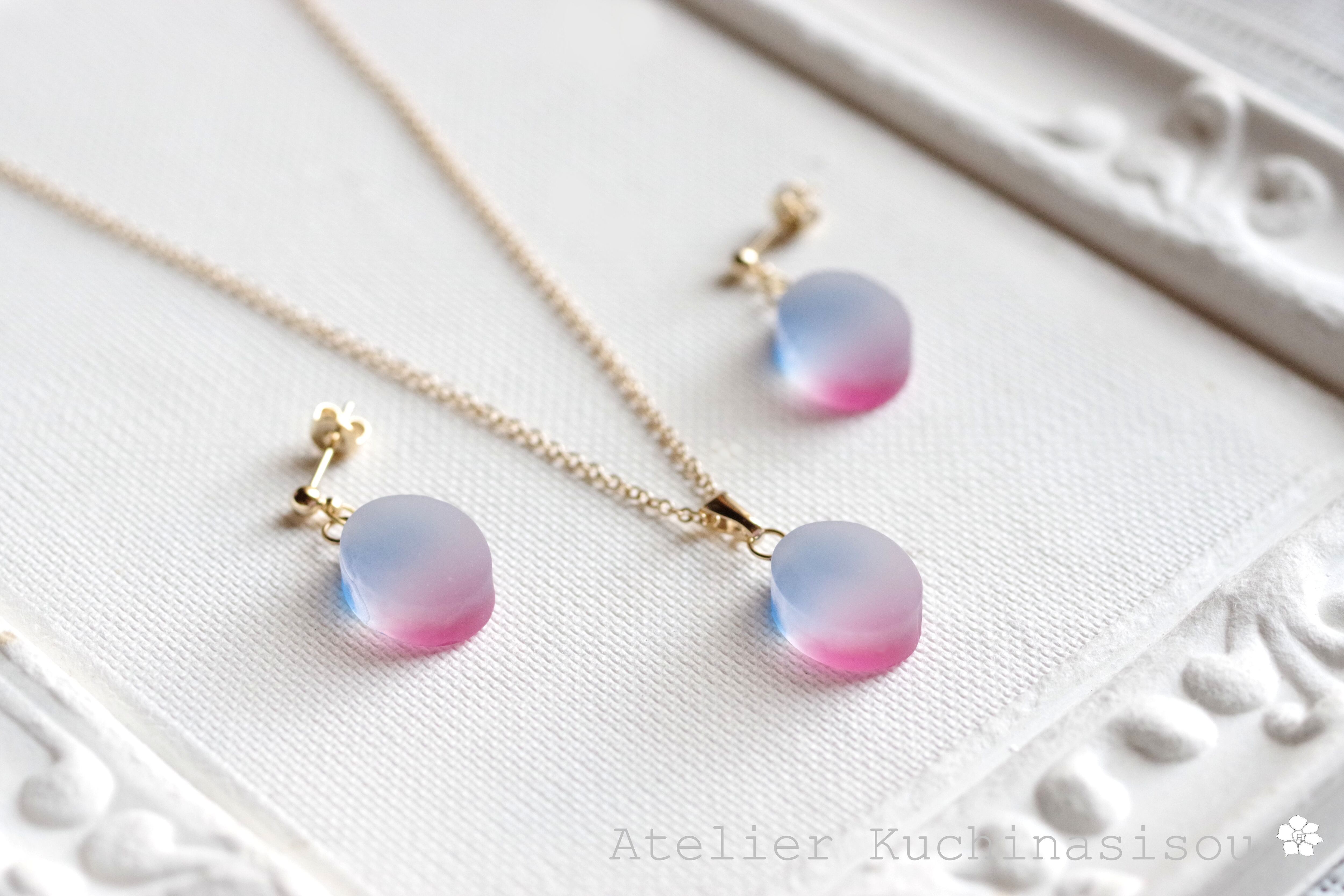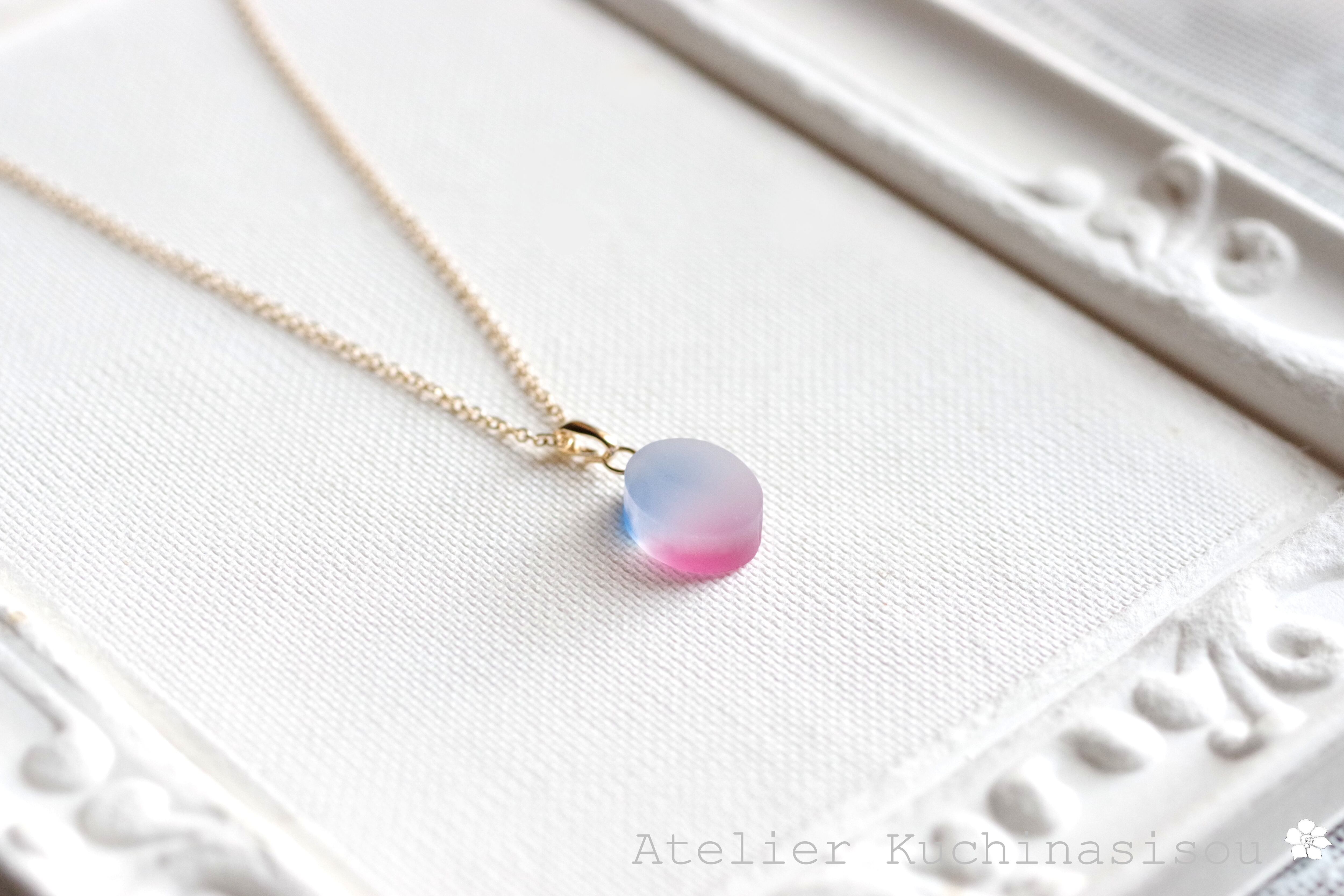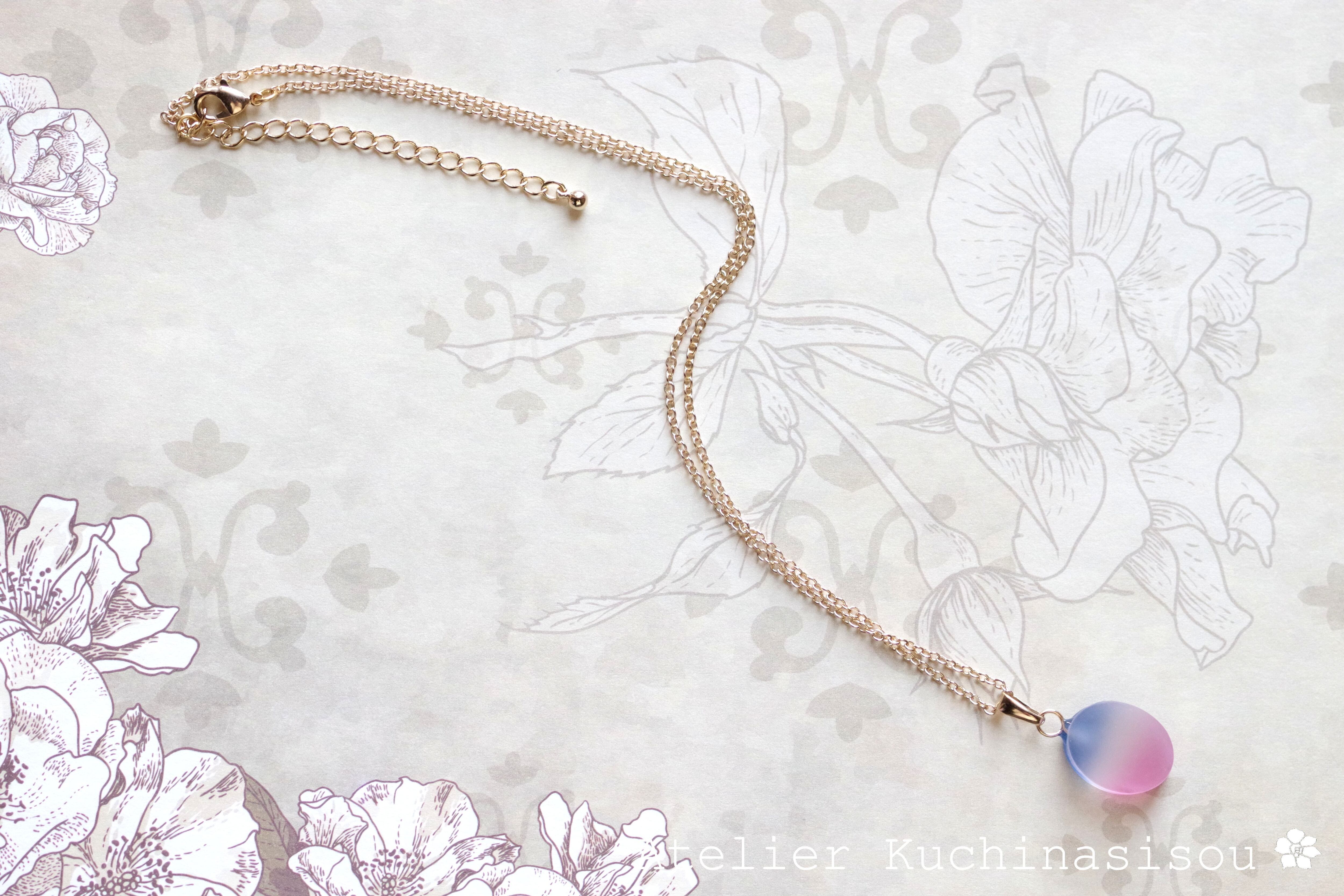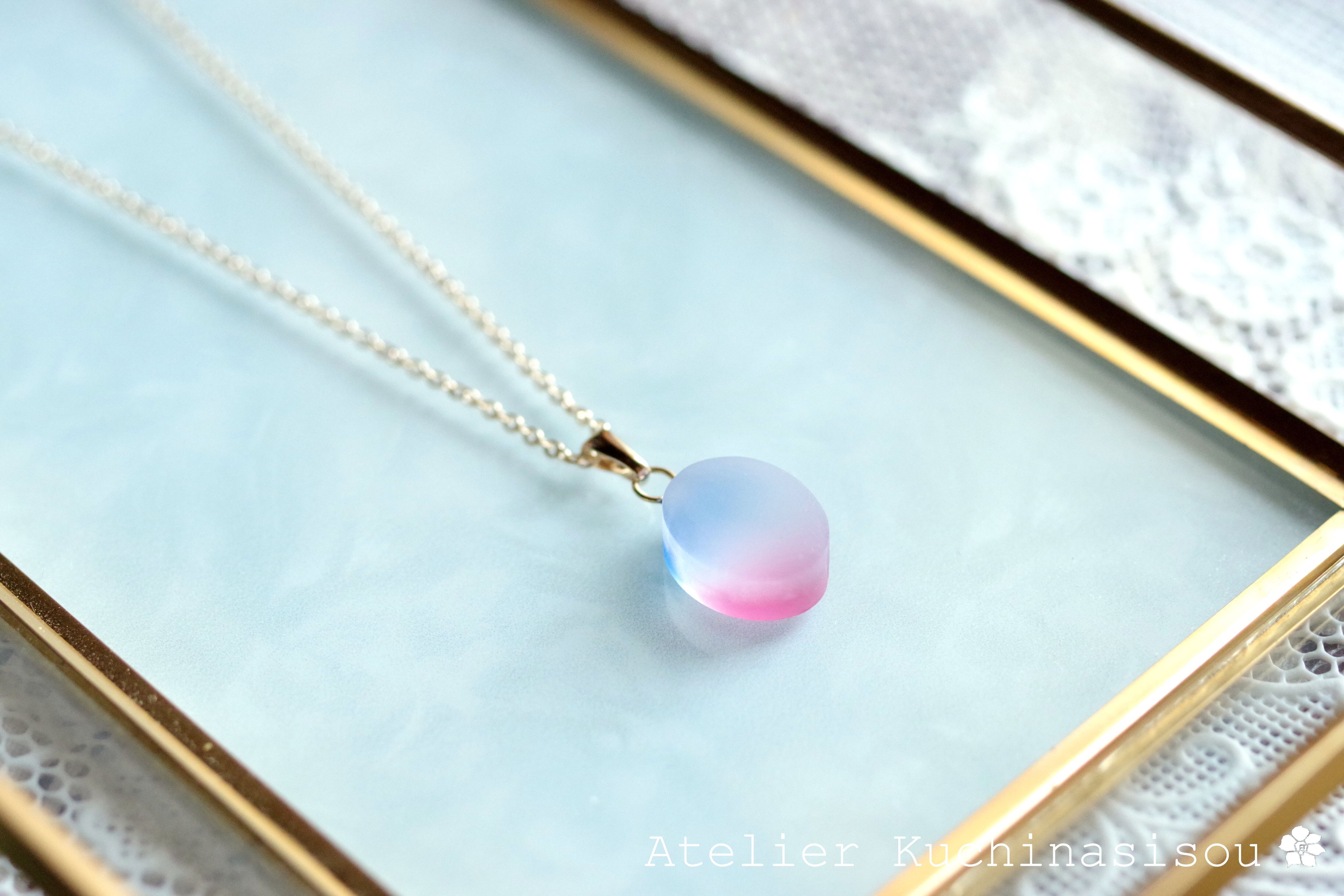 すりガラスのような柔らかな風合いと、そこからほのかに覗く鮮やかな青とピンクが美しいペンダント。