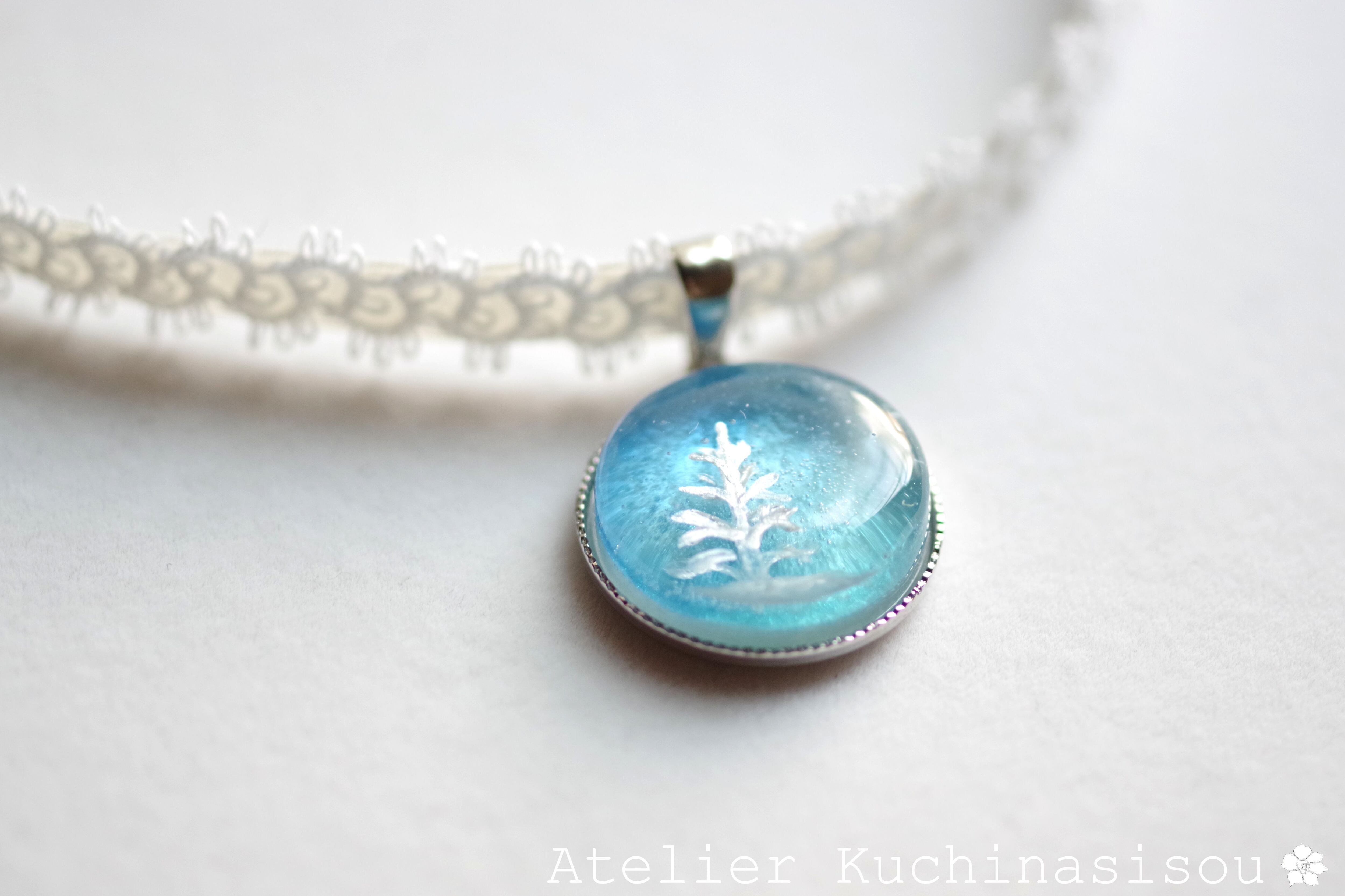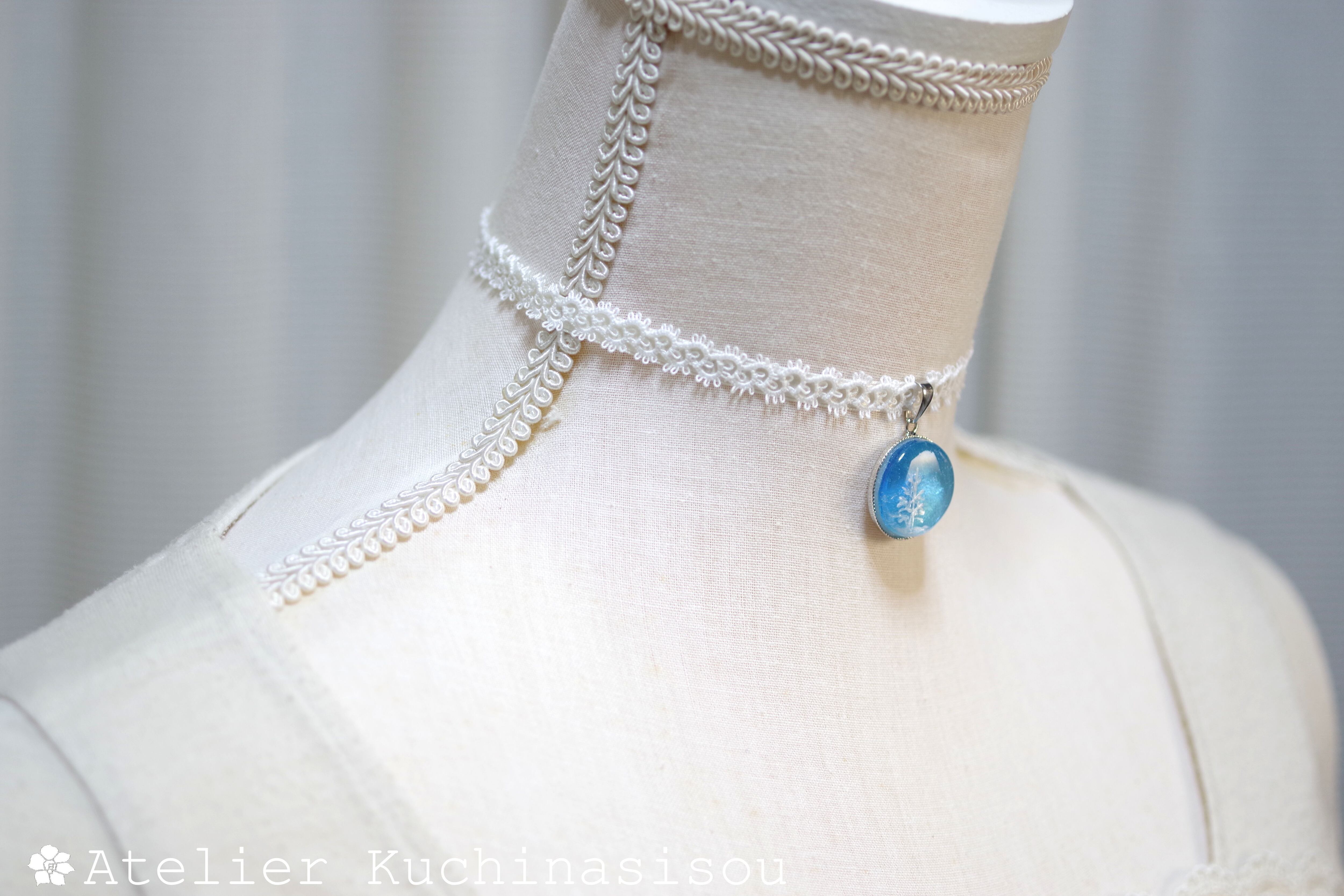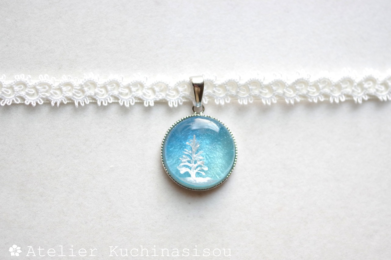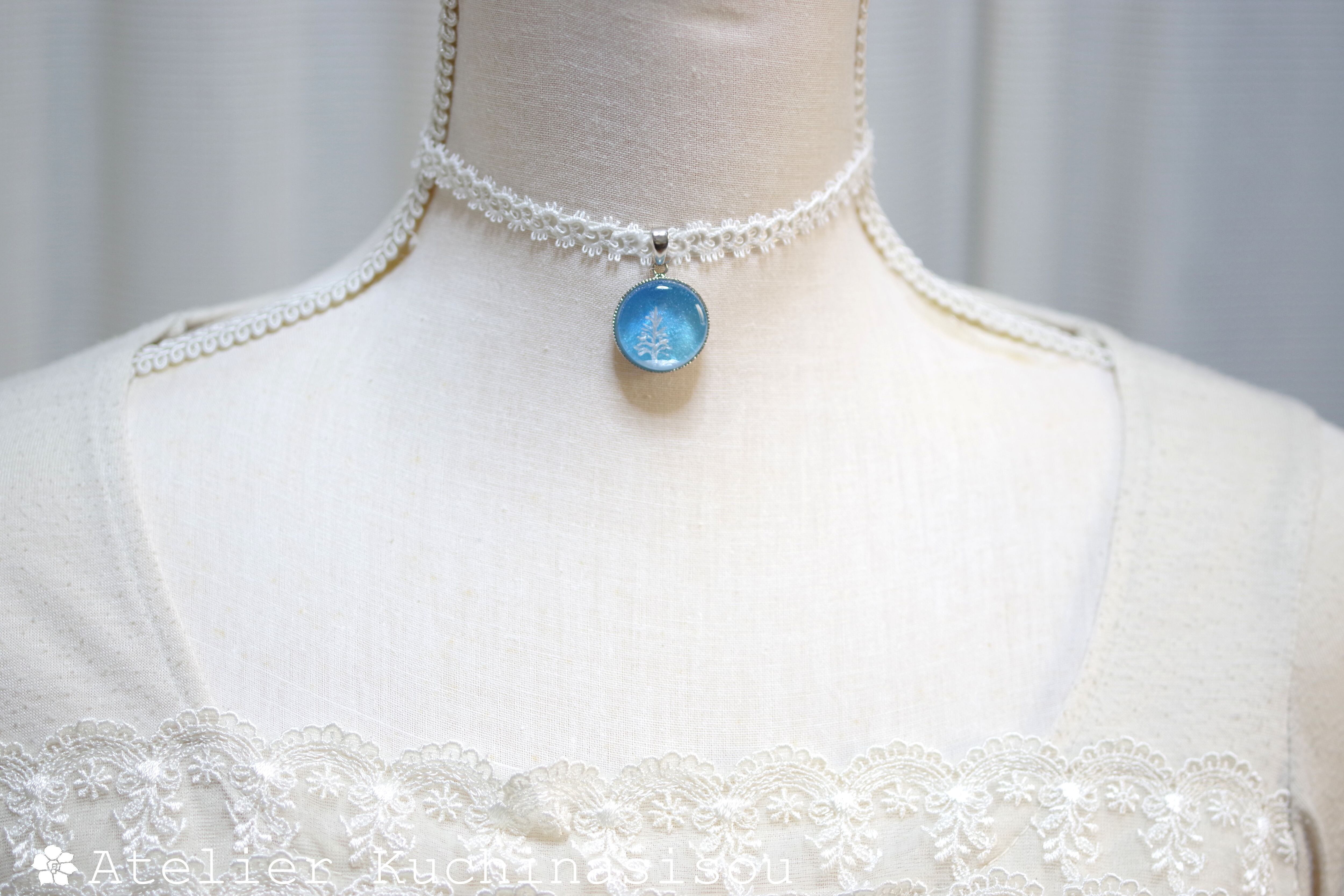 青空を思わせるブルーのグラデーション、それを背景にすっくと立つもみの木がアクセントになっているレジンを、サテンリボンにタティングレースで装飾を施したチョーカーに仕上げました。
