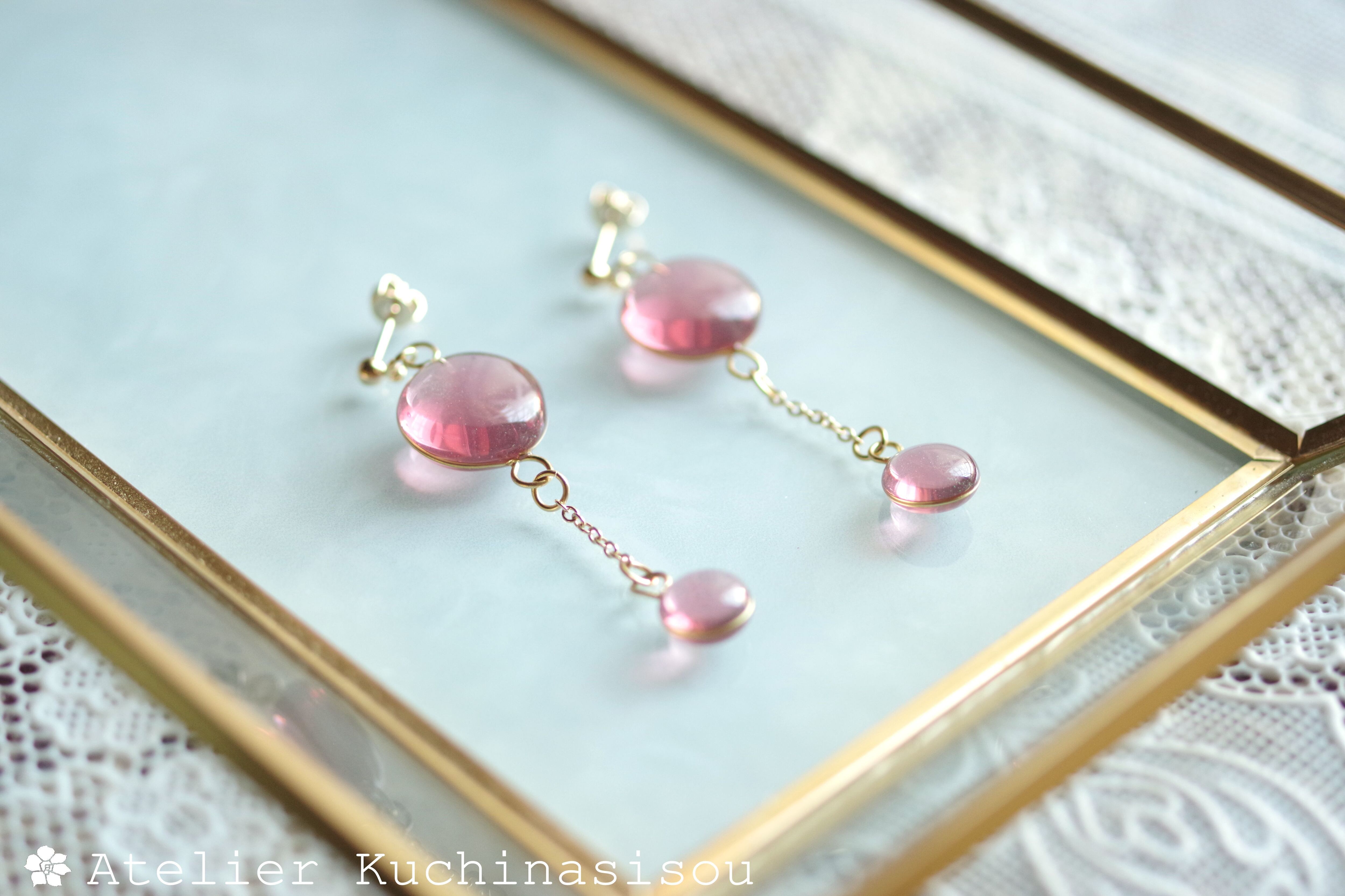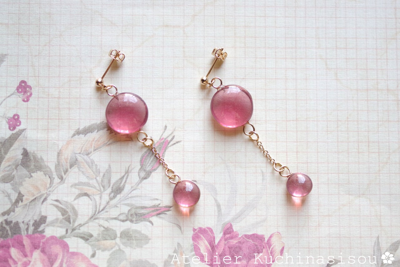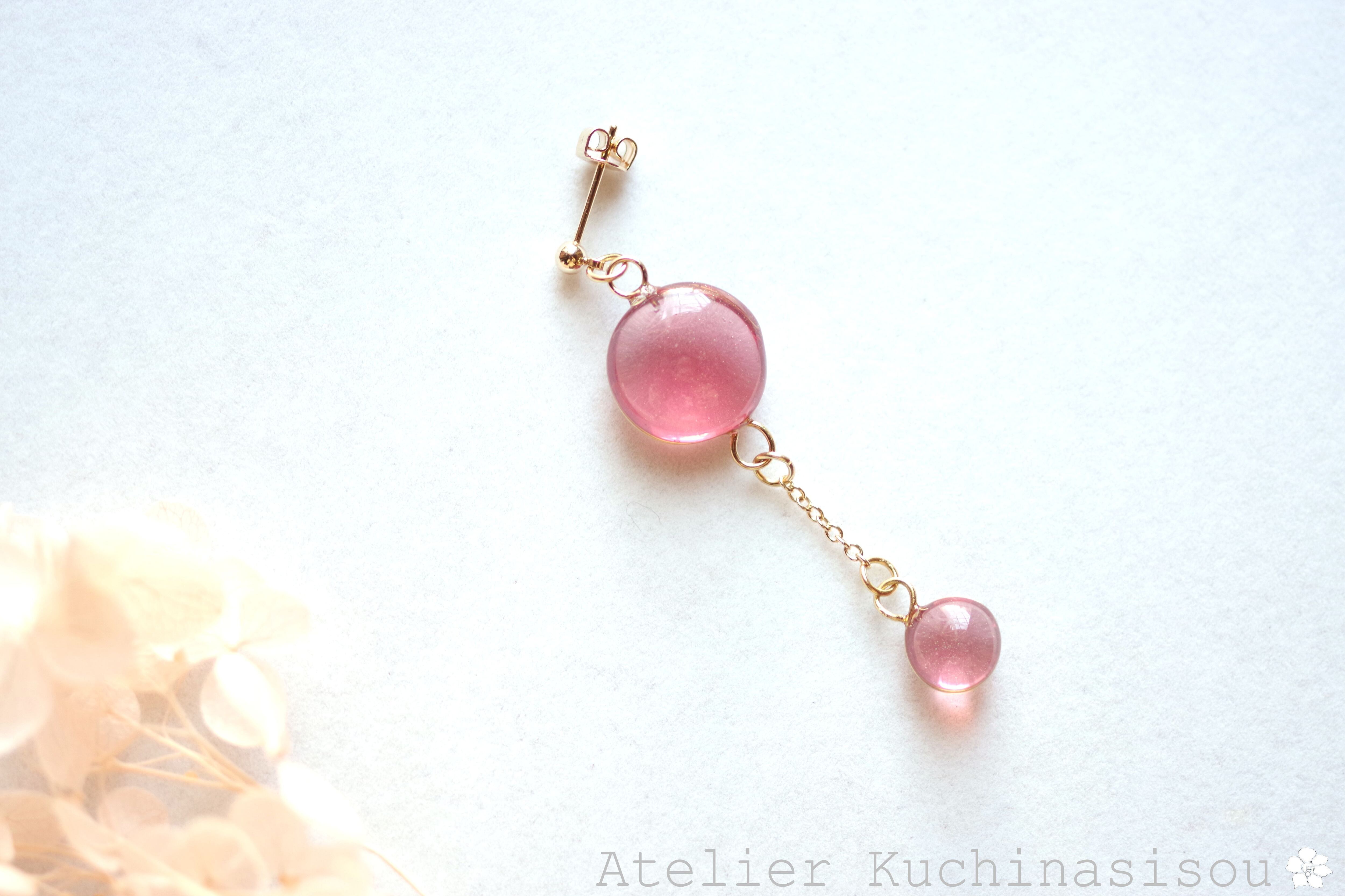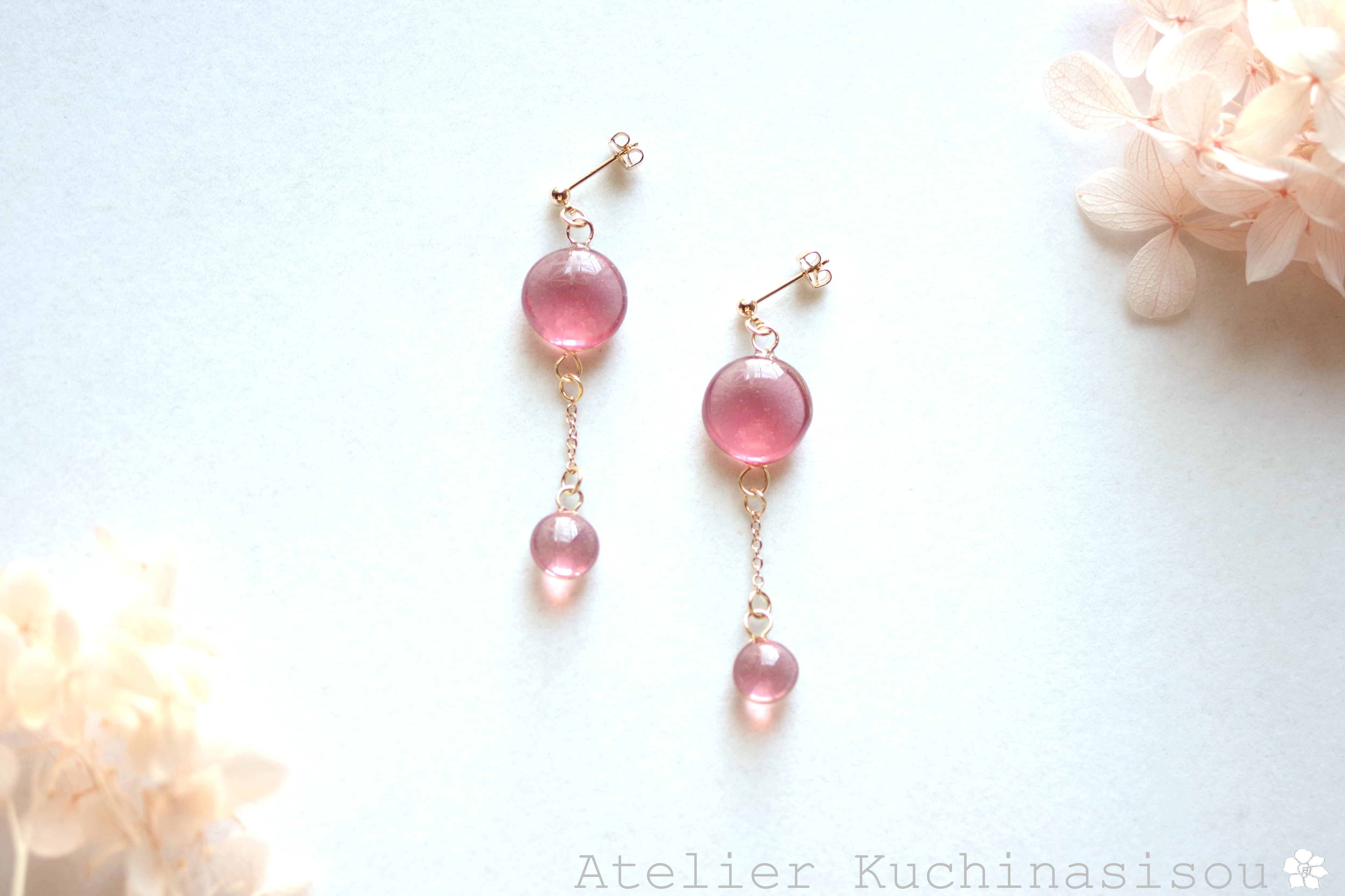 ぷっくり張りつめた大小の水滴のようなレジンの透明感に魅入ってしまうピアス。