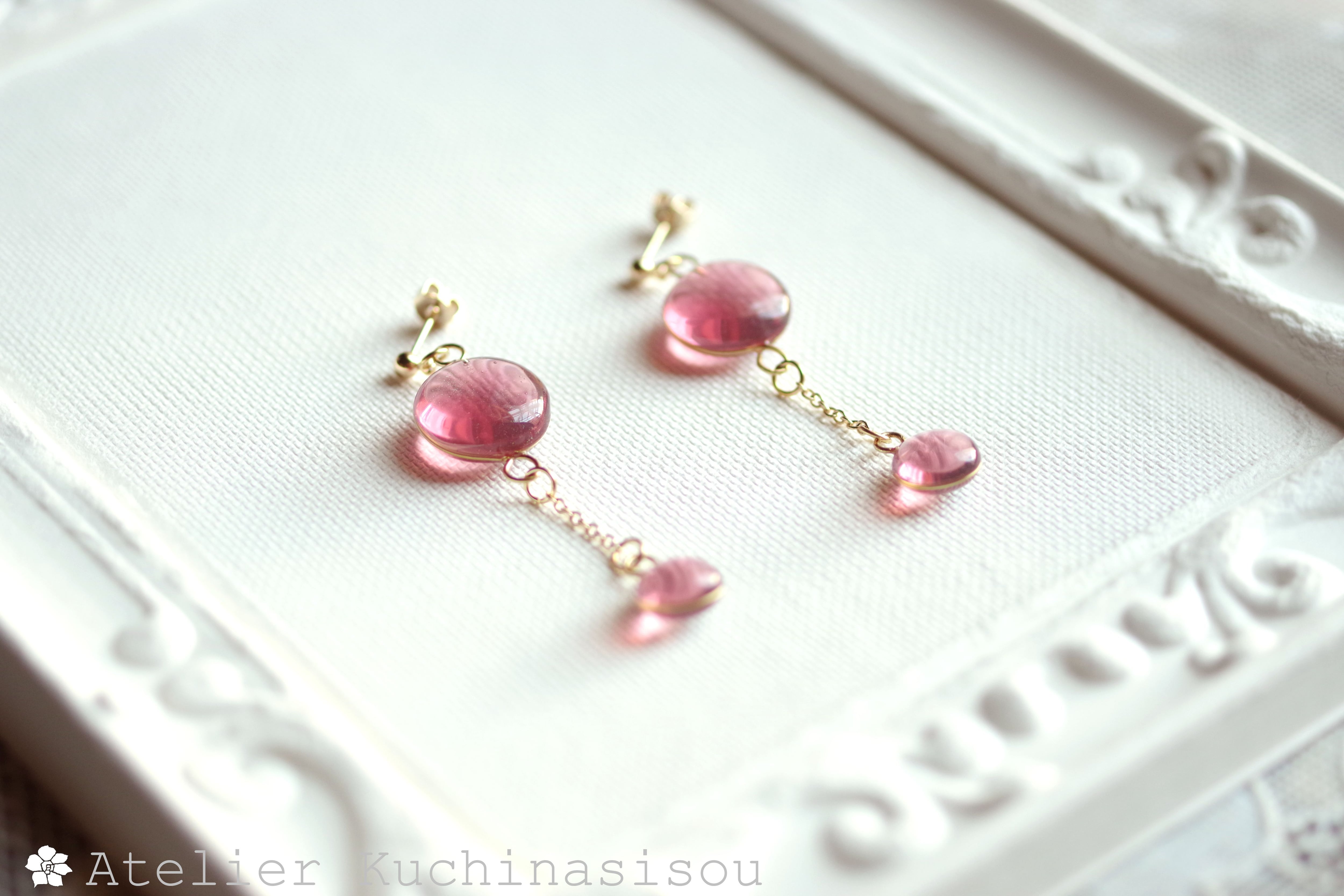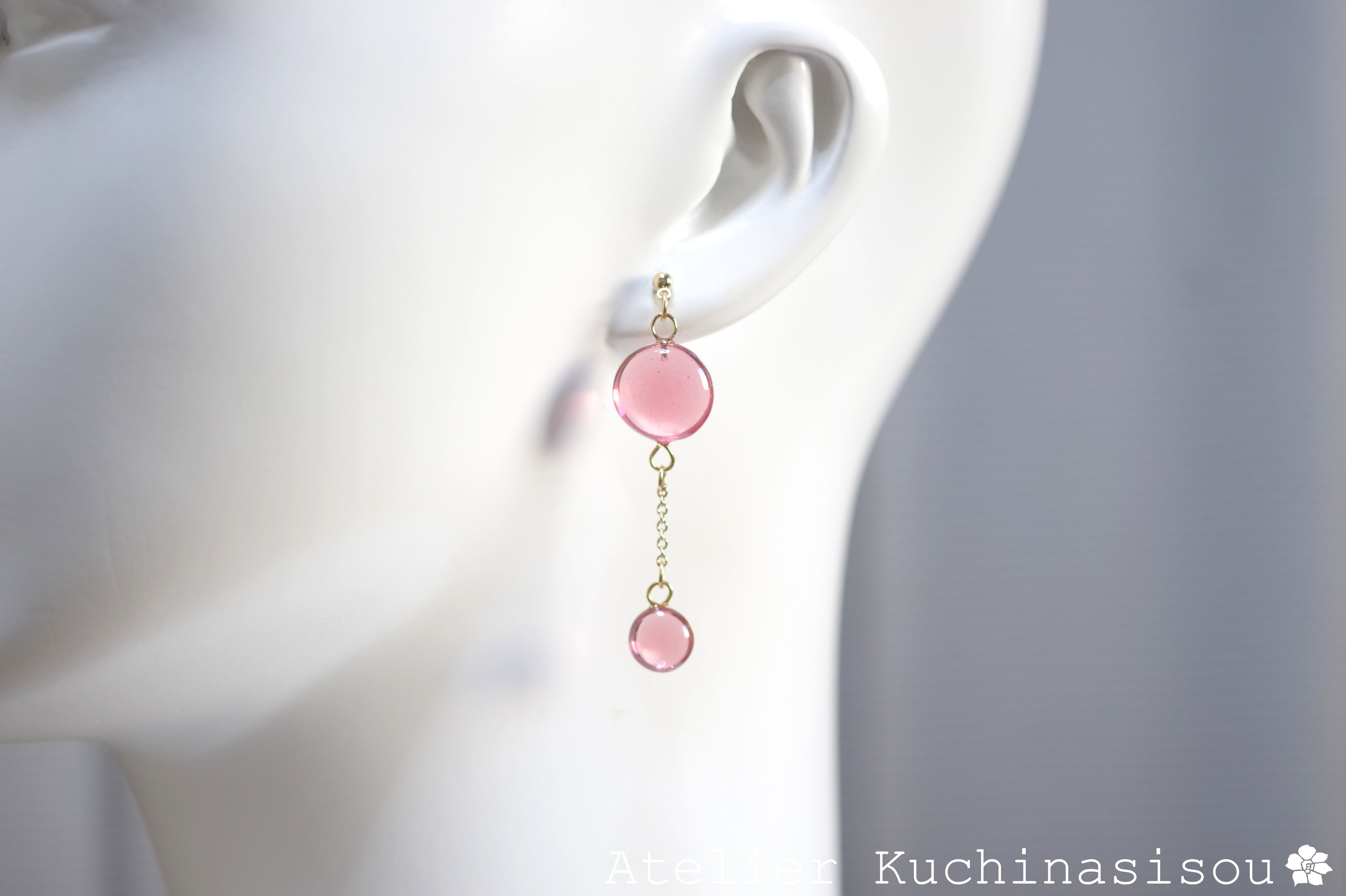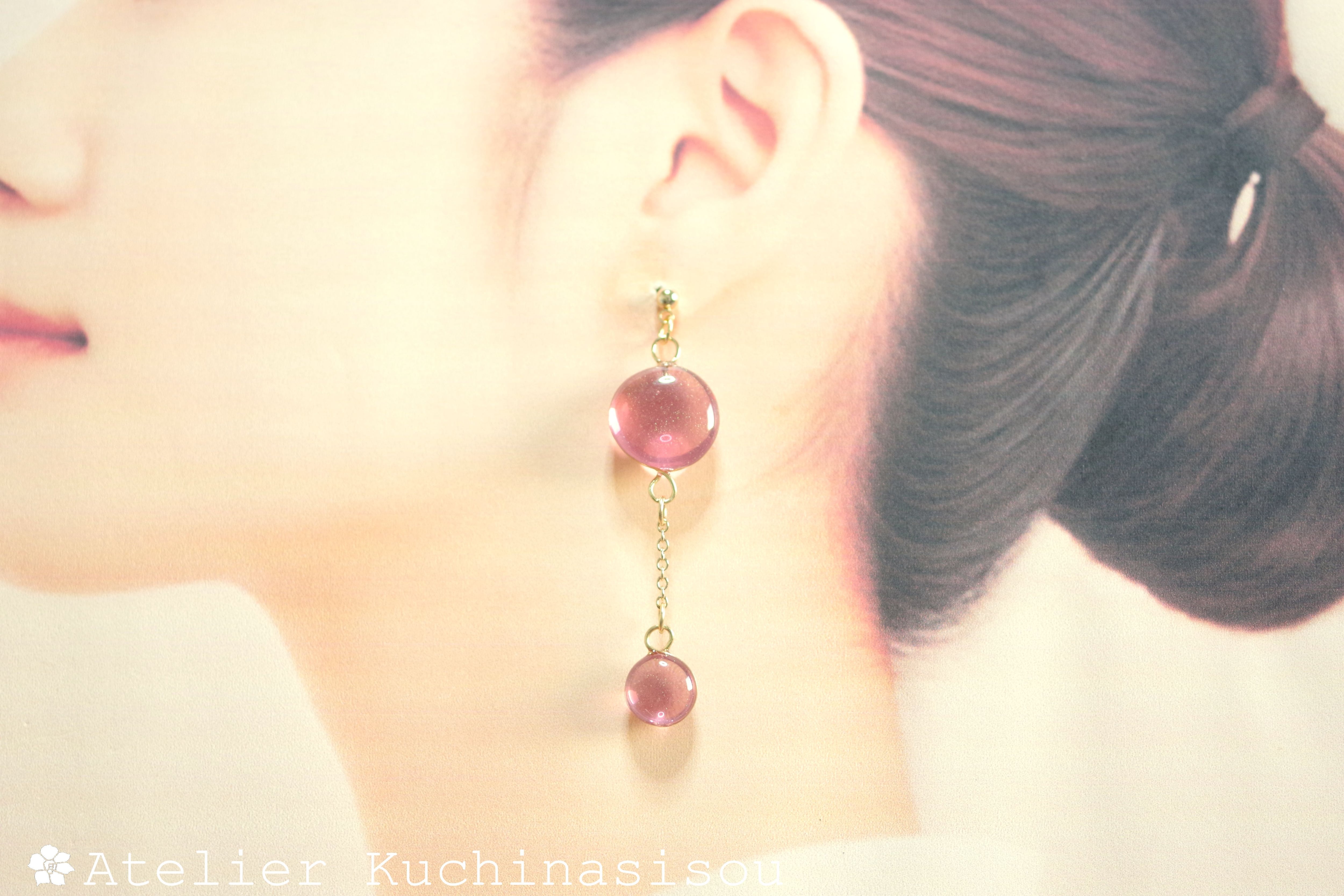 ぷっくり張りつめた大小の水滴のようなレジンの透明感に魅入ってしまうピアス。