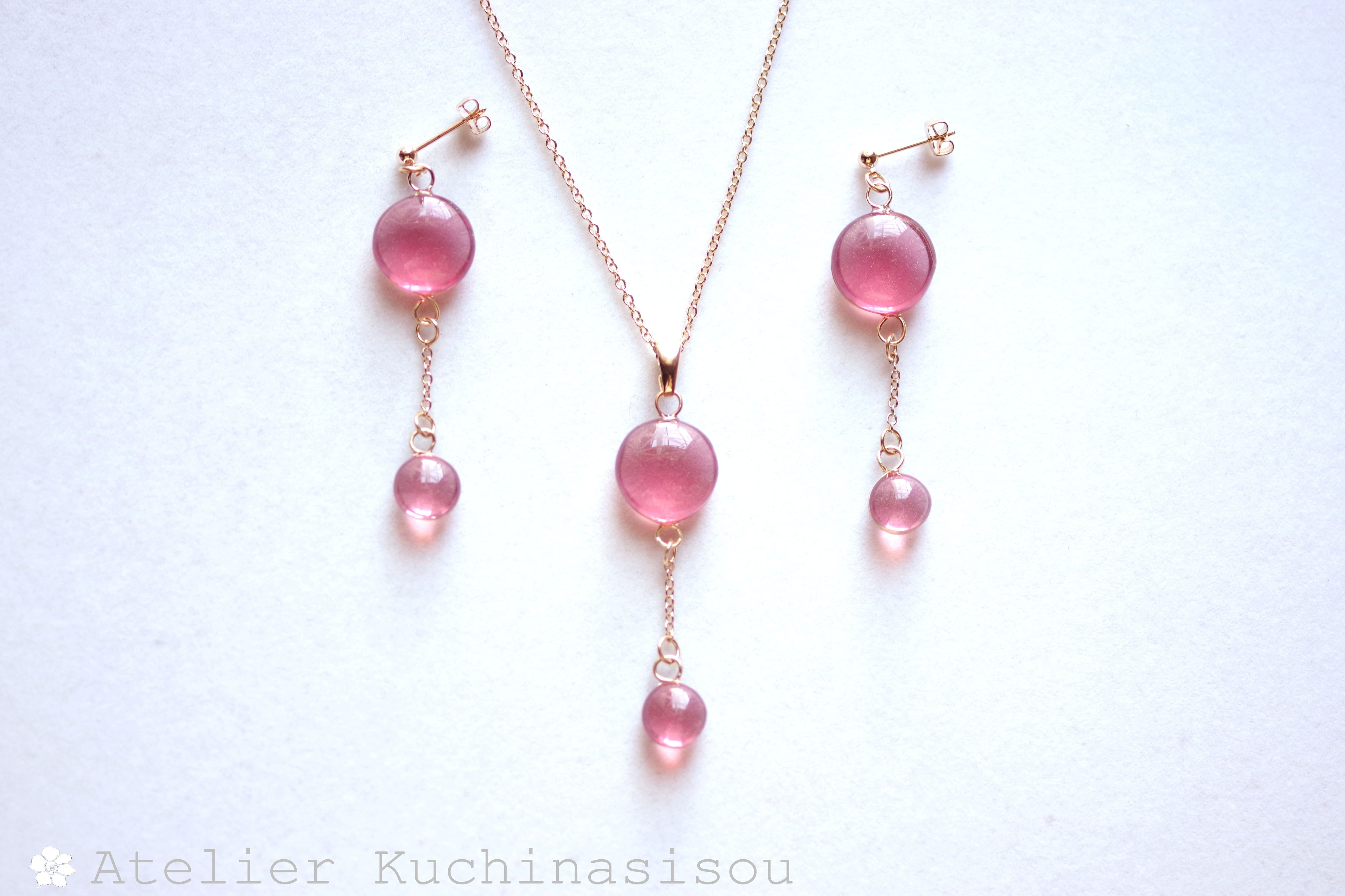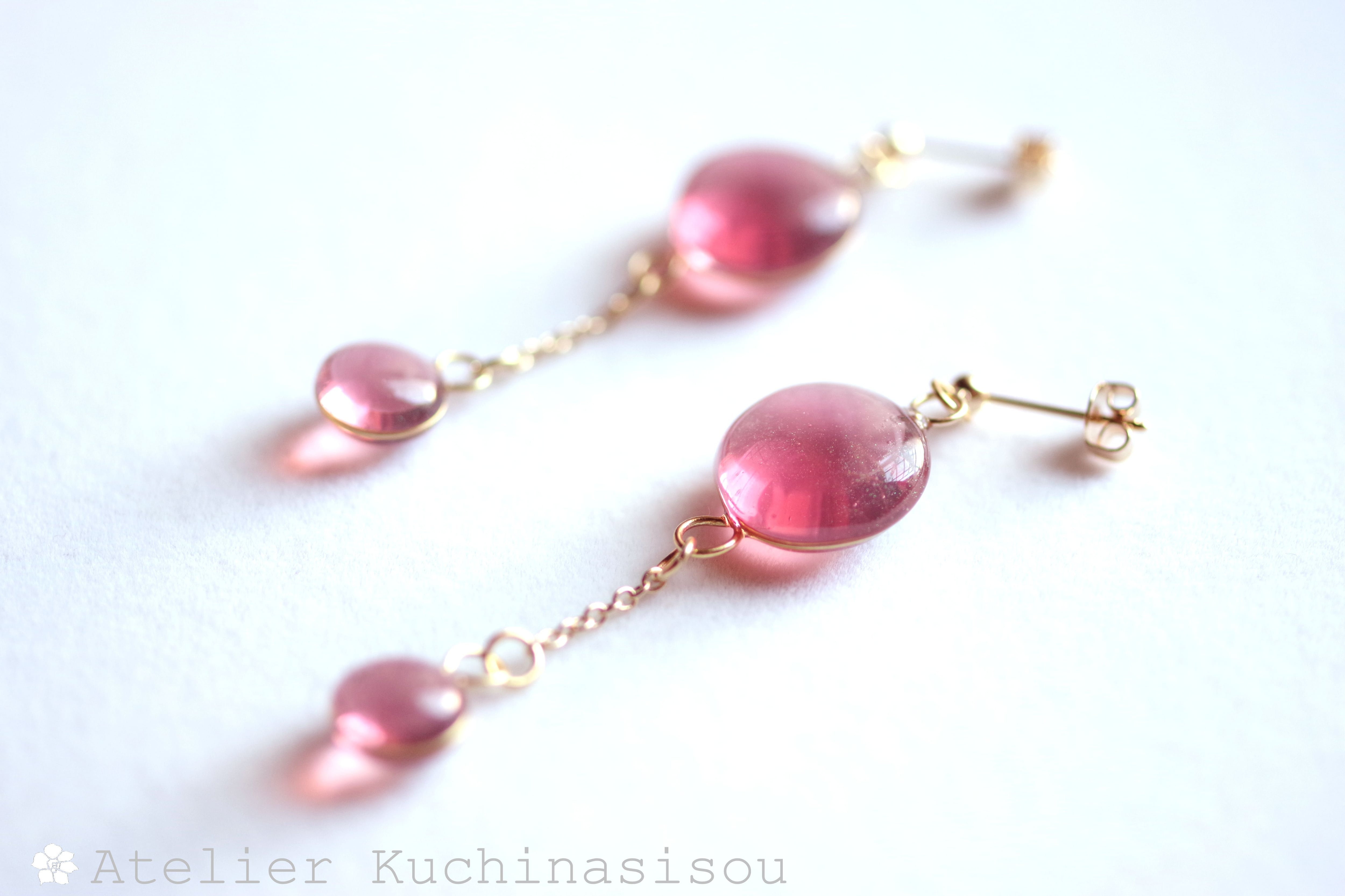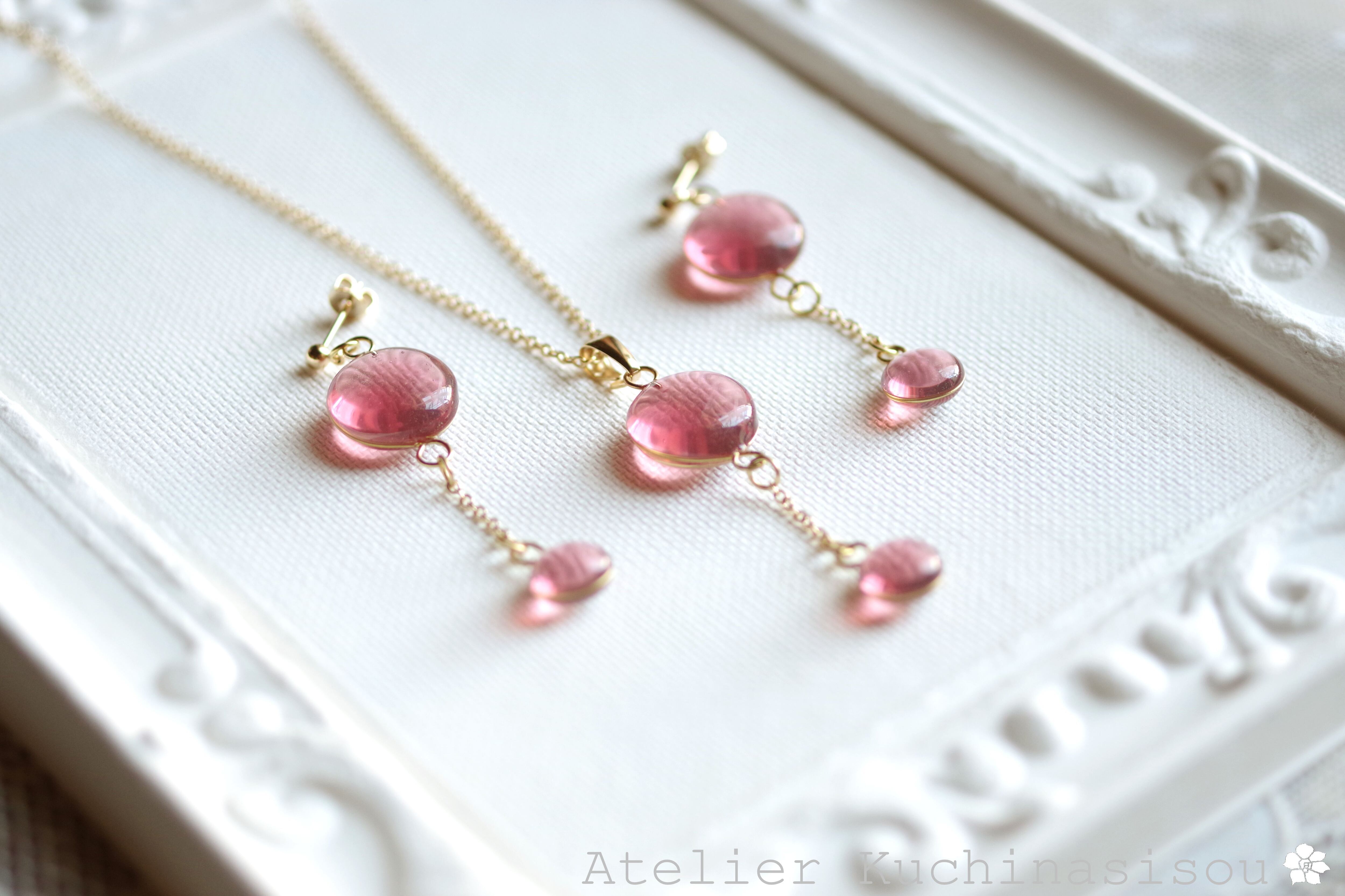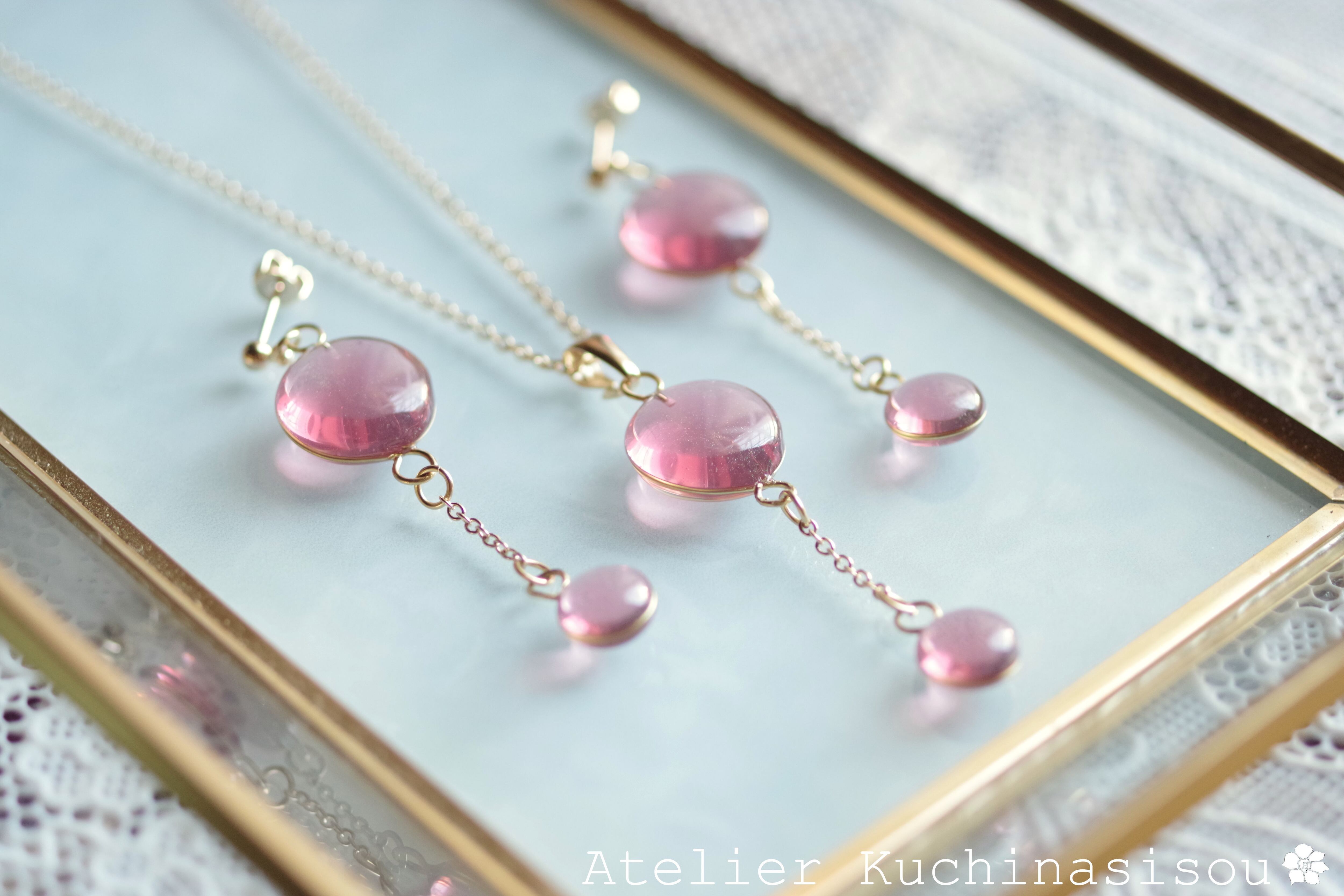 ぷっくり張りつめた大小の水滴のようなレジンの透明感に魅入ってしまうピアス。